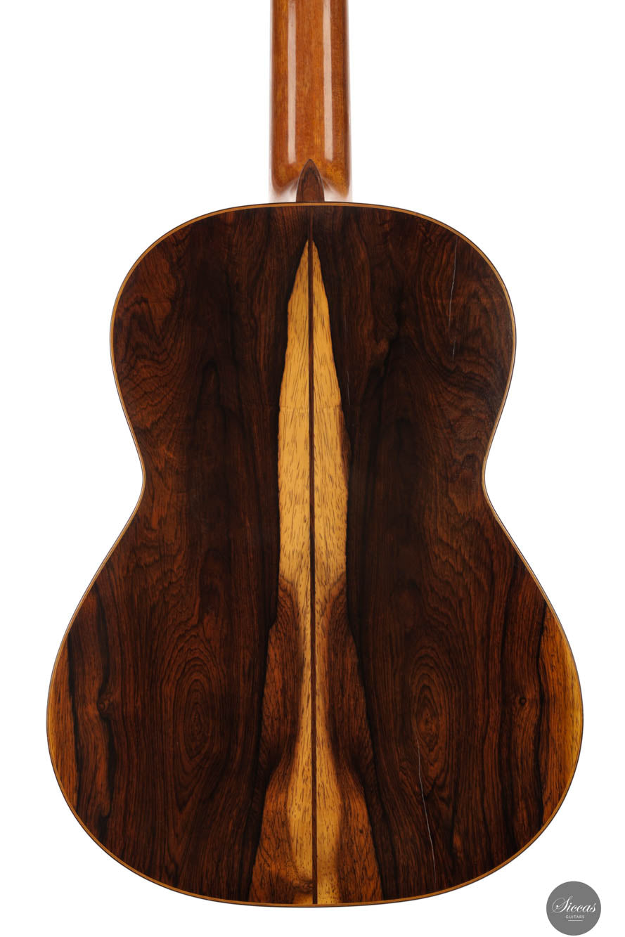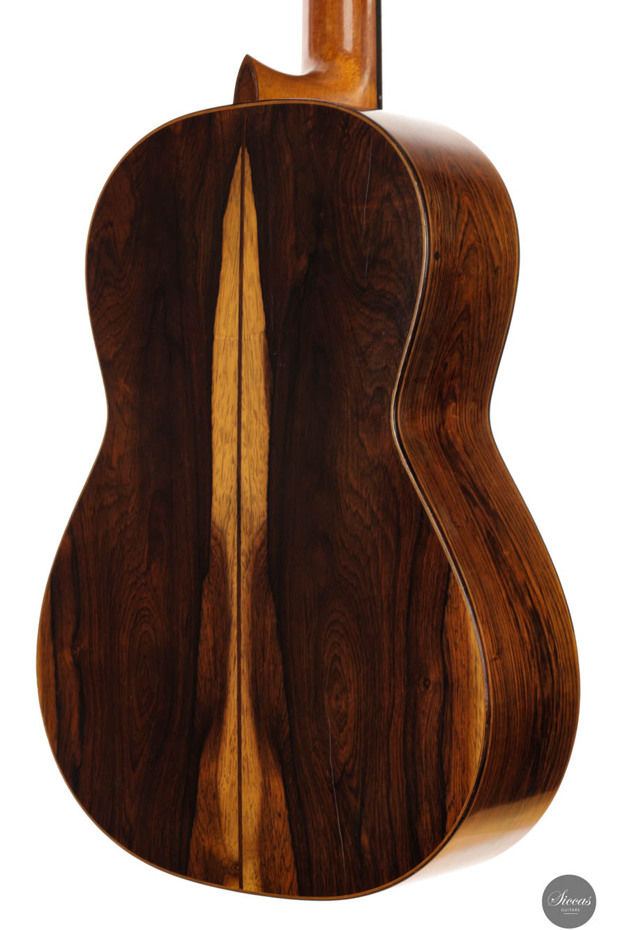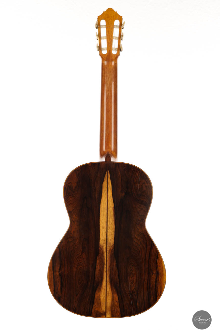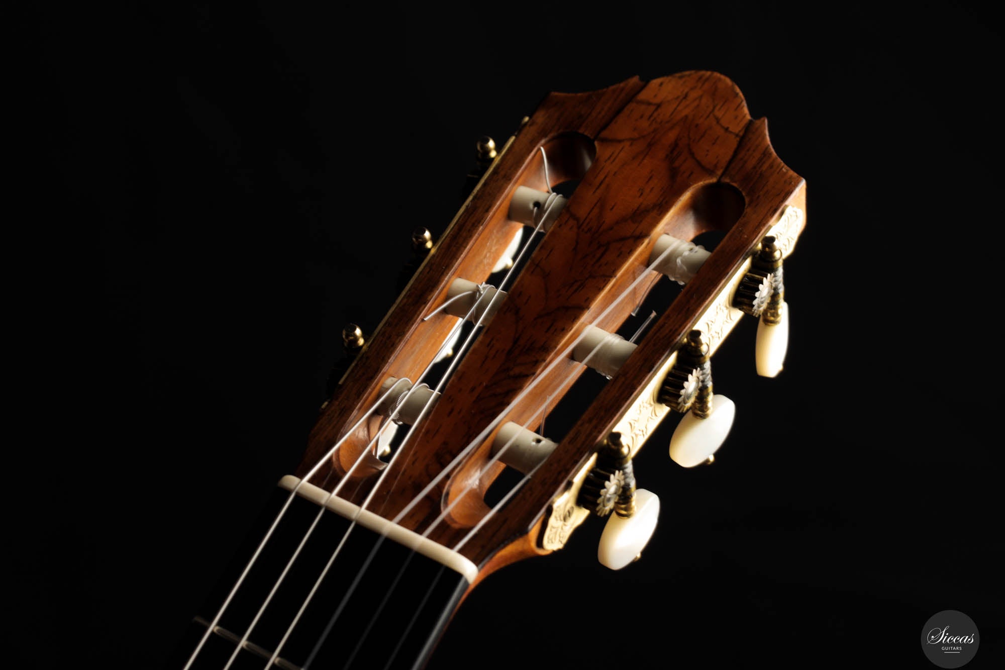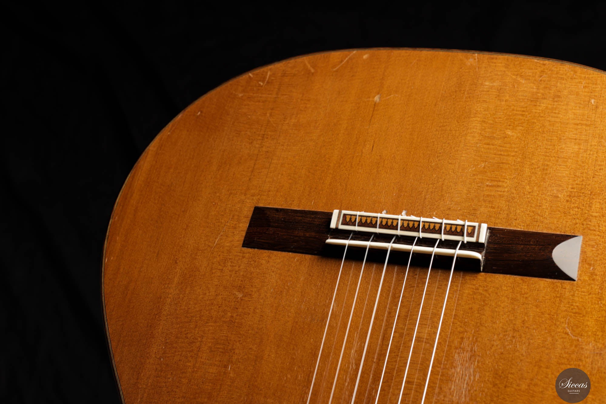 Matthias Dammann is an extraordinary German luthier, precursor, and pioneer of double-top guitars. He always led a lot of research, studying the sound of guitars from the past, such as Antonio de Torres’ ones, and patenting his innovations. He brought many positive changes in the guitar conception of the end of the twentieth century. His wooden “sandwich double-tops” and later his Nomex double-tops are incredibly light. They give the guitar an immediate response, outstanding volume, and blissful playability. The guitarists’ reaction to Matthias Dammann’s guitars was immediate, and performers such as David Russell, Manuel Barrueco, the Beijin Guitar Duo, etc., have been playing and recording on them for a long time.The 1992 Matthias Dammann Solid Top guitar exemplifies the exquisite craftsmanship and attention to detail that have made Matthias Dammann a revered name in the world of luthiery. Known primarily for his revolutionary advancements in double-top guitar construction, Dammann’s earlier works, such as this solid-top model, are equally commendable and showcase his profound mastery over traditional guitar-making techniques. This particular guitar, with its cedar solid top, is a masterpiece that stands as a tribute to Dammann’s meticulous and passionate approach to guitar building. It offers even tonality, enchanting charm, and impressive volume, which, combined with its outstanding playability, makes it an exceptional instrument. The soundboard, a crucial element in defining the guitar’s voice, has been expertly tuned, demonstrating Dammann’s deep understanding of acoustic science and his commitment to achieving the perfect sound.