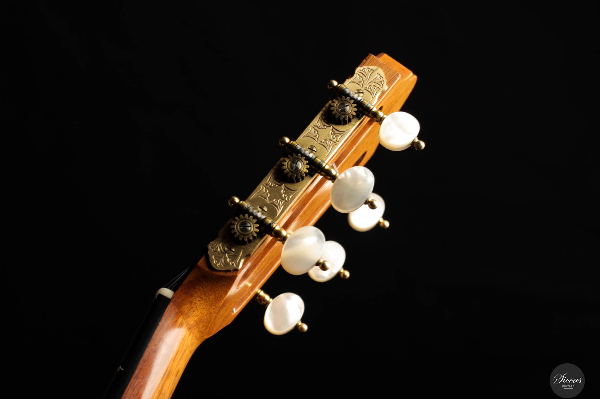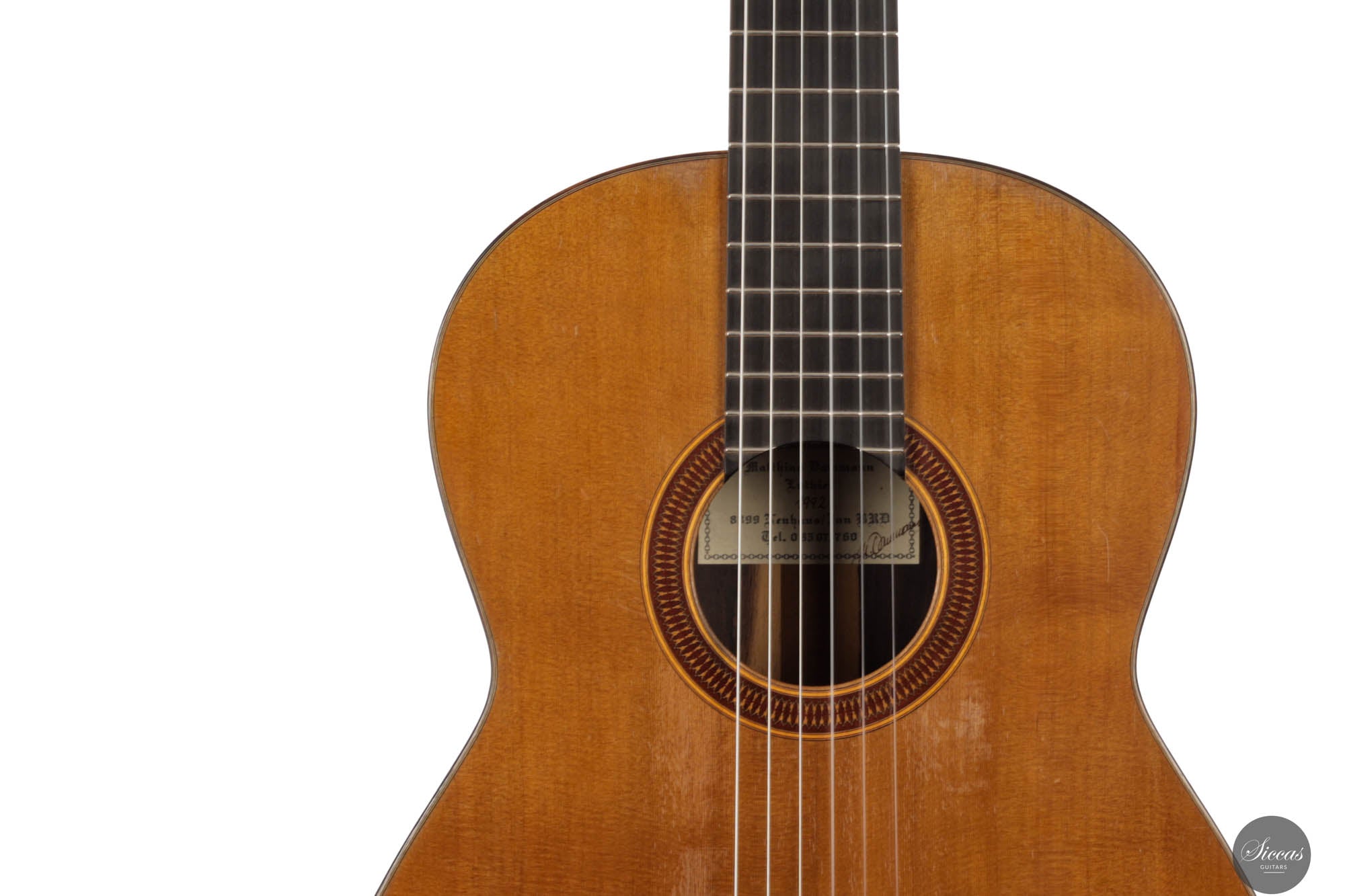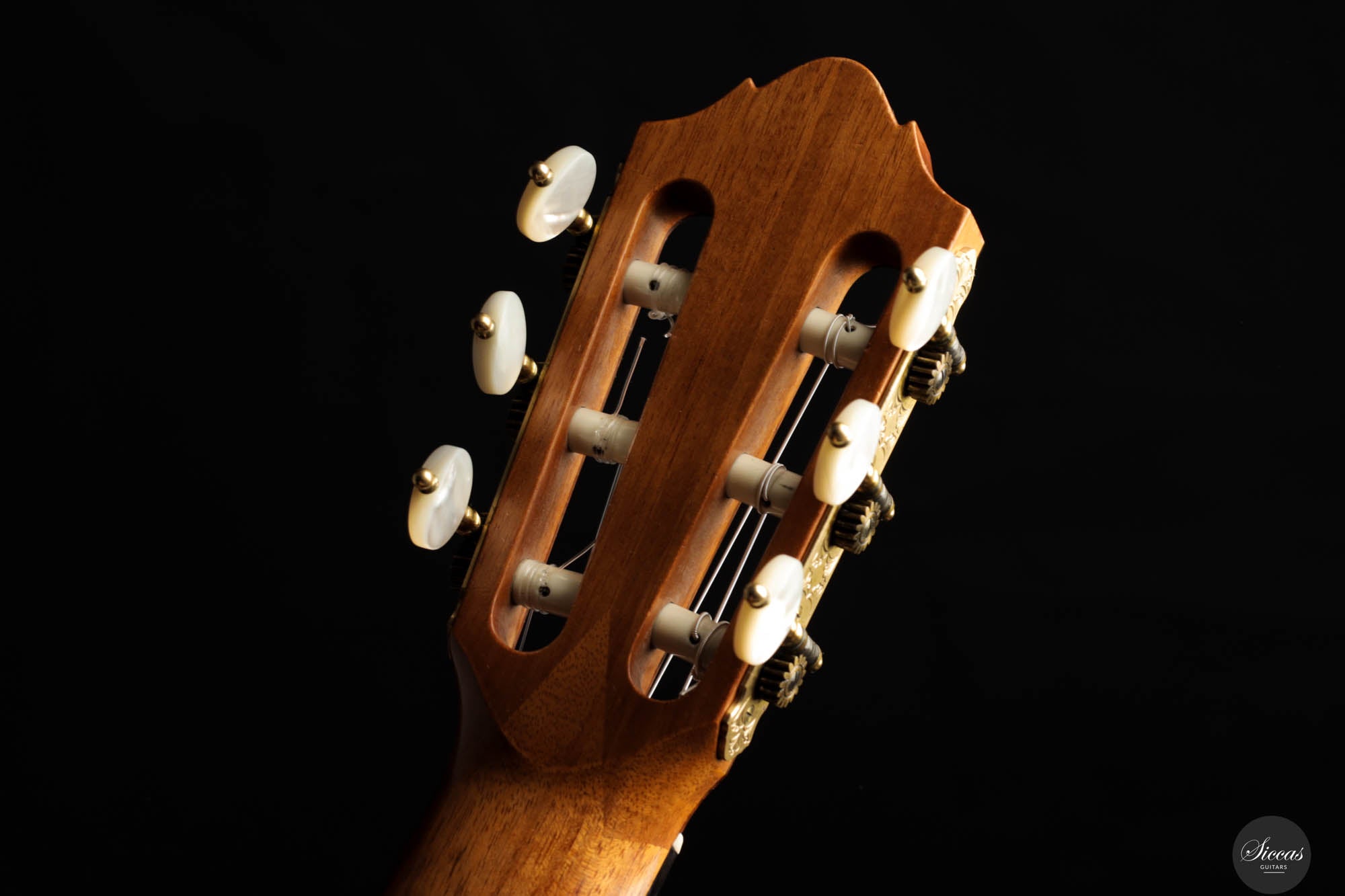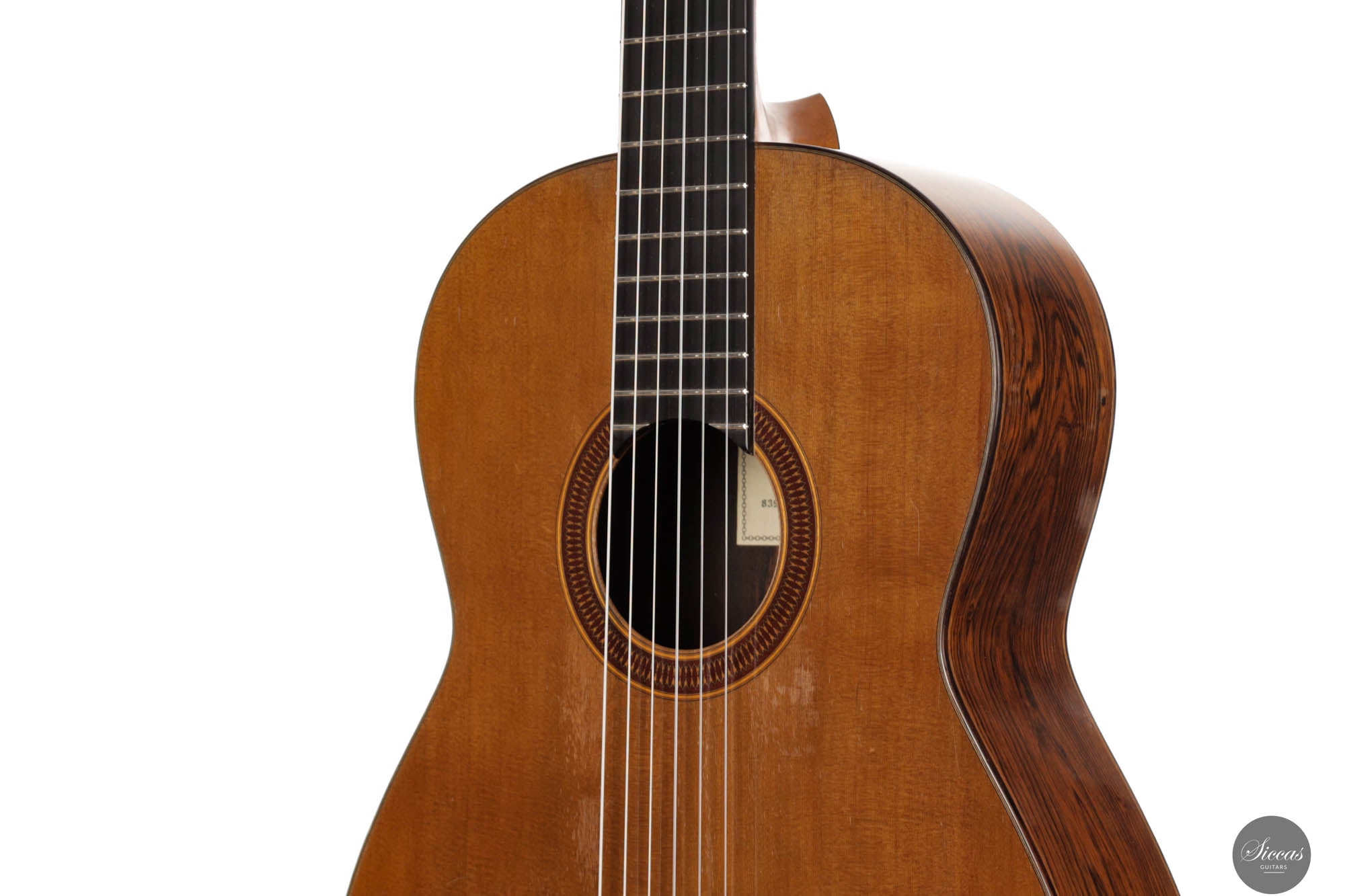 Matthias Dammann is an extraordinary German luthier, precursor, and pioneer of double-top guitars. He always led a lot of research, studying the sound of guitars from the past, such as Antonio de Torres’ ones, and patenting his innovations. He brought many positive changes in the guitar conception of the end of the twentieth century. His wooden “sandwich double-tops” and later his Nomex double-tops are incredibly light. They give the guitar an immediate response, outstanding volume, and blissful playability. The guitarists’ reaction to Matthias Dammann’s guitars was immediate, and performers such as David Russell, Manuel Barrueco, the Beijin Guitar Duo, etc., have been playing and recording on them for a long time.The 1992 Matthias Dammann Solid Top guitar exemplifies the exquisite craftsmanship and attention to detail that have made Matthias Dammann a revered name in the world of luthiery. Known primarily for his revolutionary advancements in double-top guitar construction, Dammann’s earlier works, such as this solid-top model, are equally commendable and showcase his profound mastery over traditional guitar-making techniques. This particular guitar, with its cedar solid top, is a masterpiece that stands as a tribute to Dammann’s meticulous and passionate approach to guitar building. It offers even tonality, enchanting charm, and impressive volume, which, combined with its outstanding playability, makes it an exceptional instrument. The soundboard, a crucial element in defining the guitar’s voice, has been expertly tuned, demonstrating Dammann’s deep understanding of acoustic science and his commitment to achieving the perfect sound.