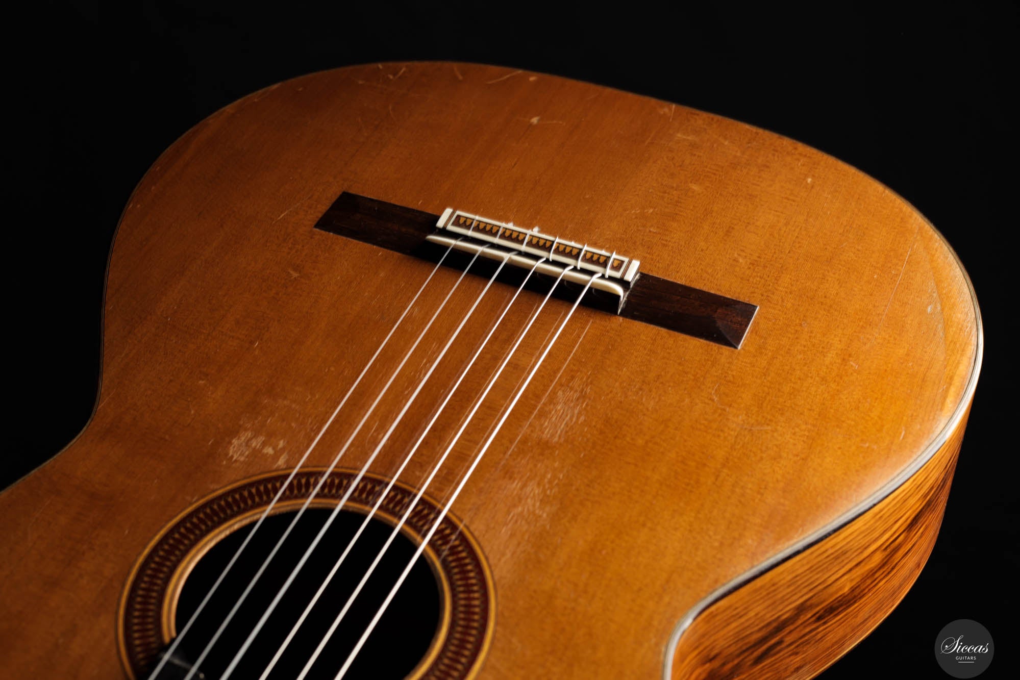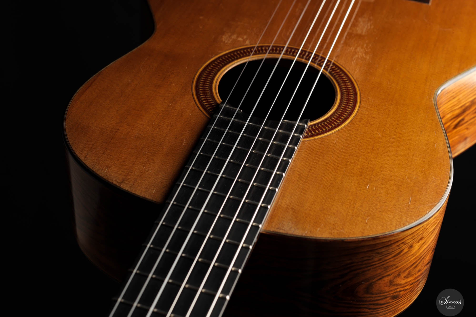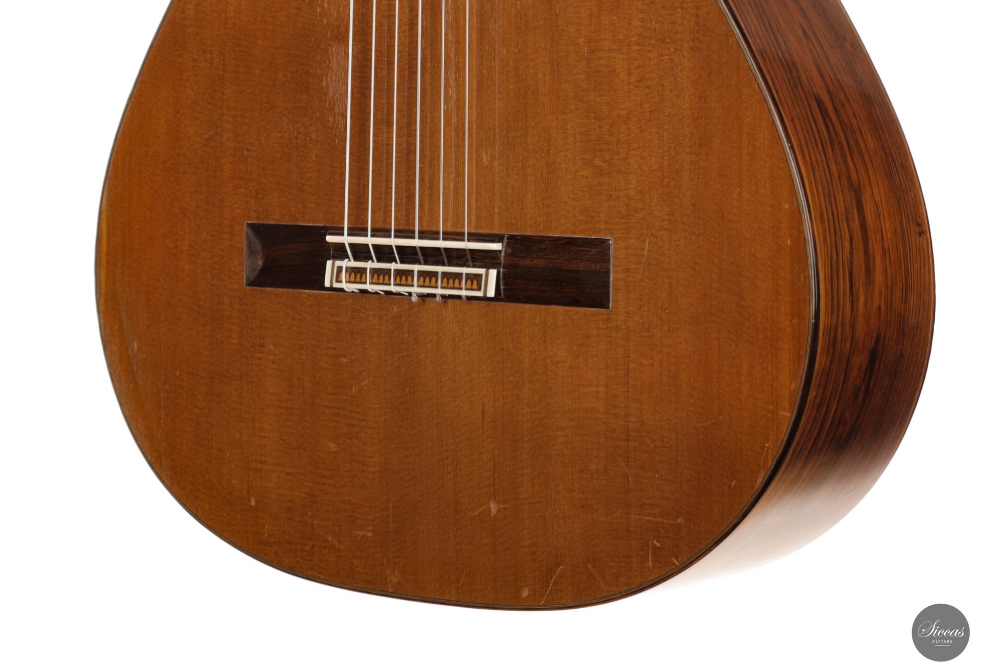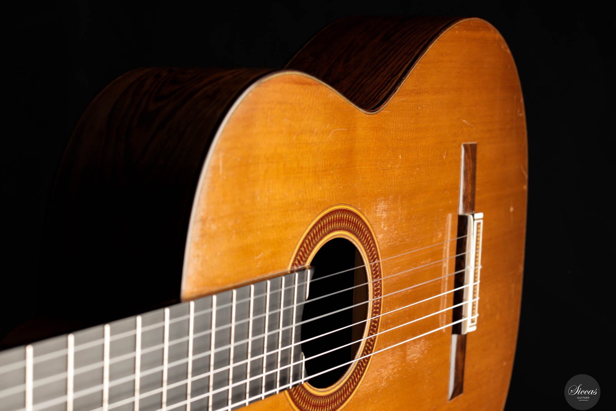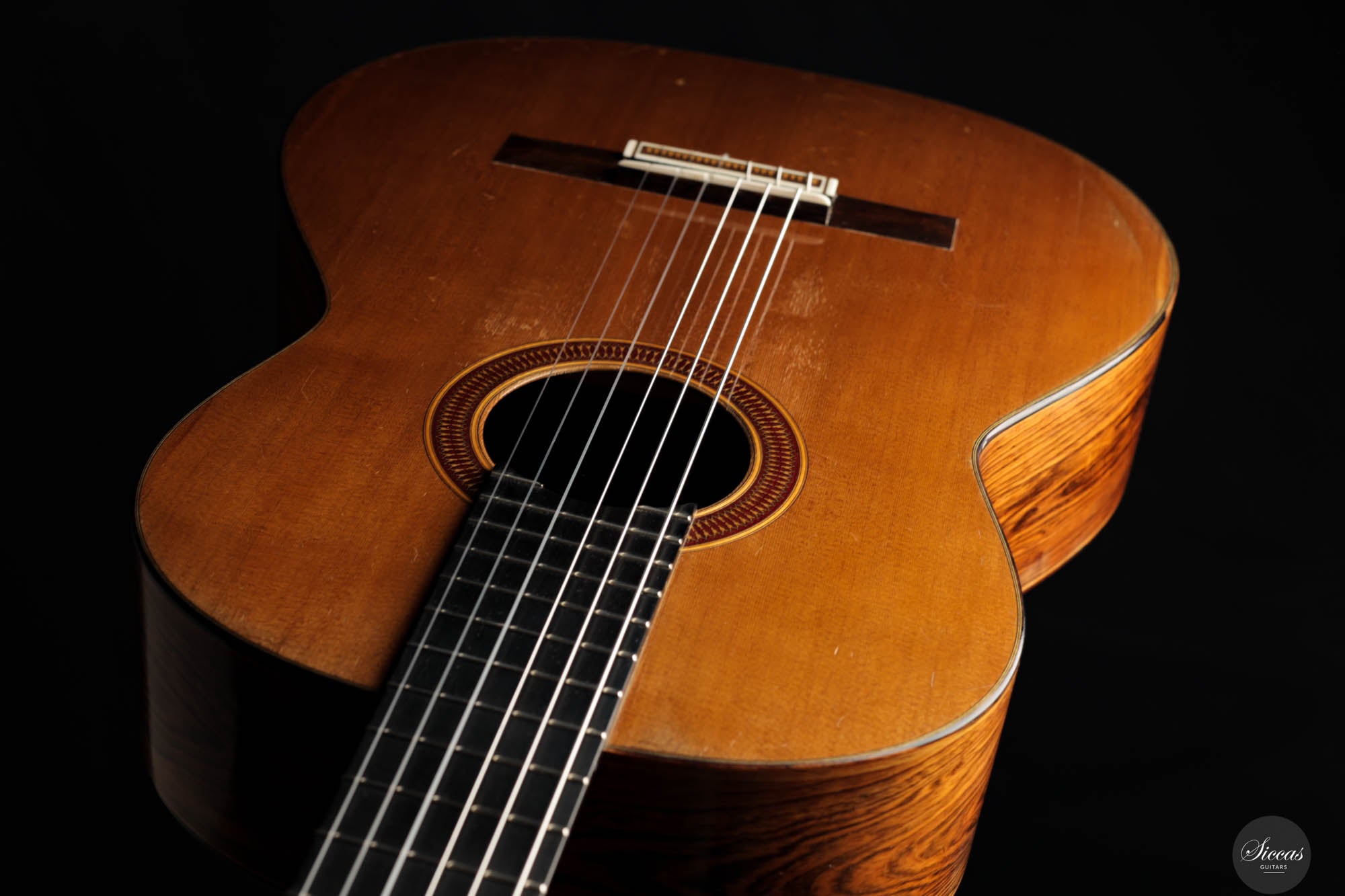 Matthias Dammann is an extraordinary German luthier, precursor, and pioneer of double-top guitars. He always led a lot of research, studying the sound of guitars from the past, such as Antonio de Torres’ ones, and patenting his innovations. He brought many positive changes in the guitar conception of the end of the twentieth century. His wooden “sandwich double-tops” and later his Nomex double-tops are incredibly light. They give the guitar an immediate response, outstanding volume, and blissful playability. The guitarists’ reaction to Matthias Dammann’s guitars was immediate, and performers such as David Russell, Manuel Barrueco, the Beijin Guitar Duo, etc., have been playing and recording on them for a long time.The 1992 Matthias Dammann Solid Top guitar exemplifies the exquisite craftsmanship and attention to detail that have made Matthias Dammann a revered name in the world of luthiery. Known primarily for his revolutionary advancements in double-top guitar construction, Dammann’s earlier works, such as this solid-top model, are equally commendable and showcase his profound mastery over traditional guitar-making techniques. This particular guitar, with its cedar solid top, is a masterpiece that stands as a tribute to Dammann’s meticulous and passionate approach to guitar building. It offers even tonality, enchanting charm, and impressive volume, which, combined with its outstanding playability, makes it an exceptional instrument. The soundboard, a crucial element in defining the guitar’s voice, has been expertly tuned, demonstrating Dammann’s deep understanding of acoustic science and his commitment to achieving the perfect sound.
