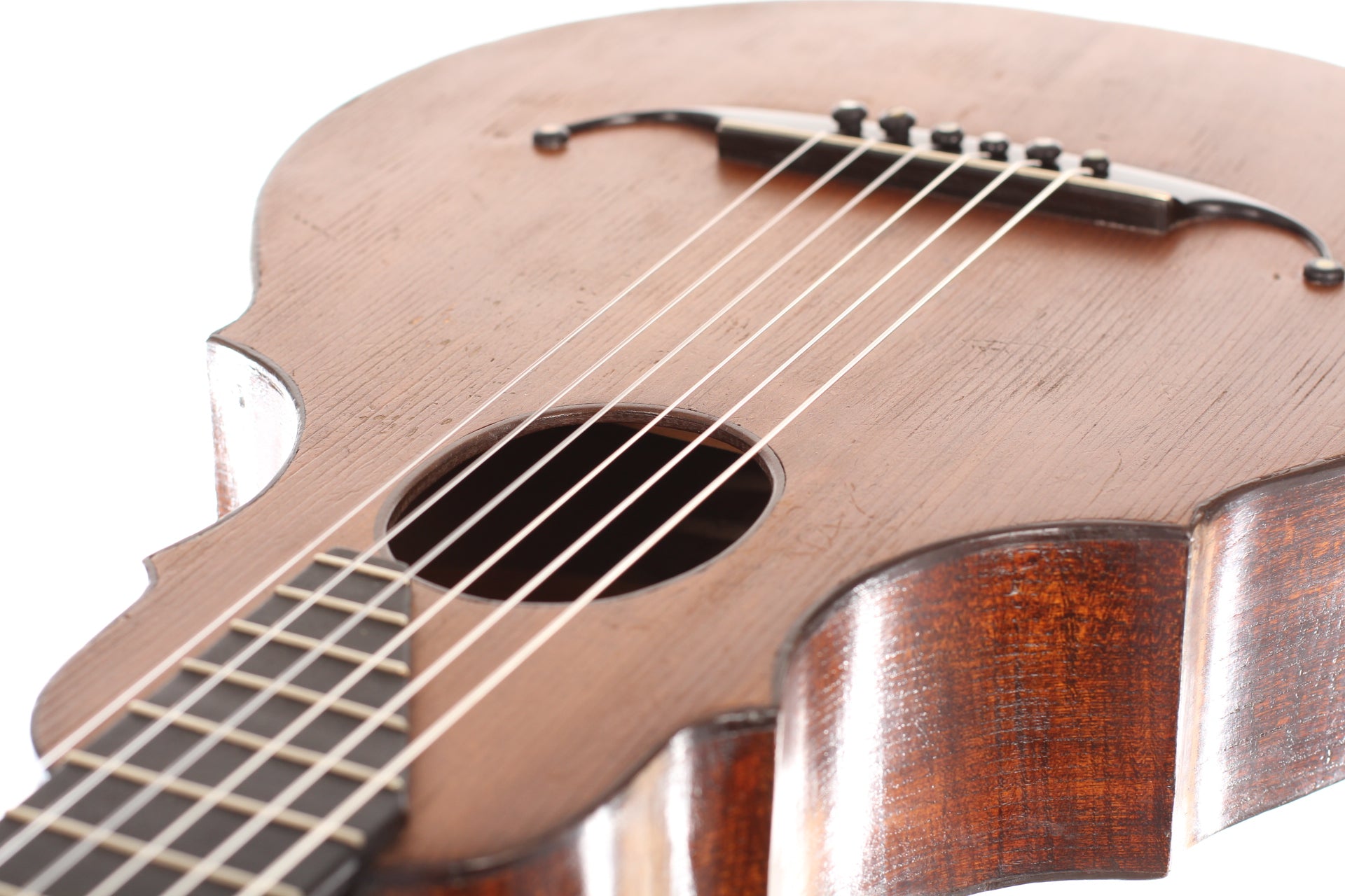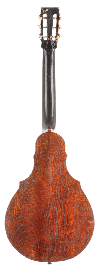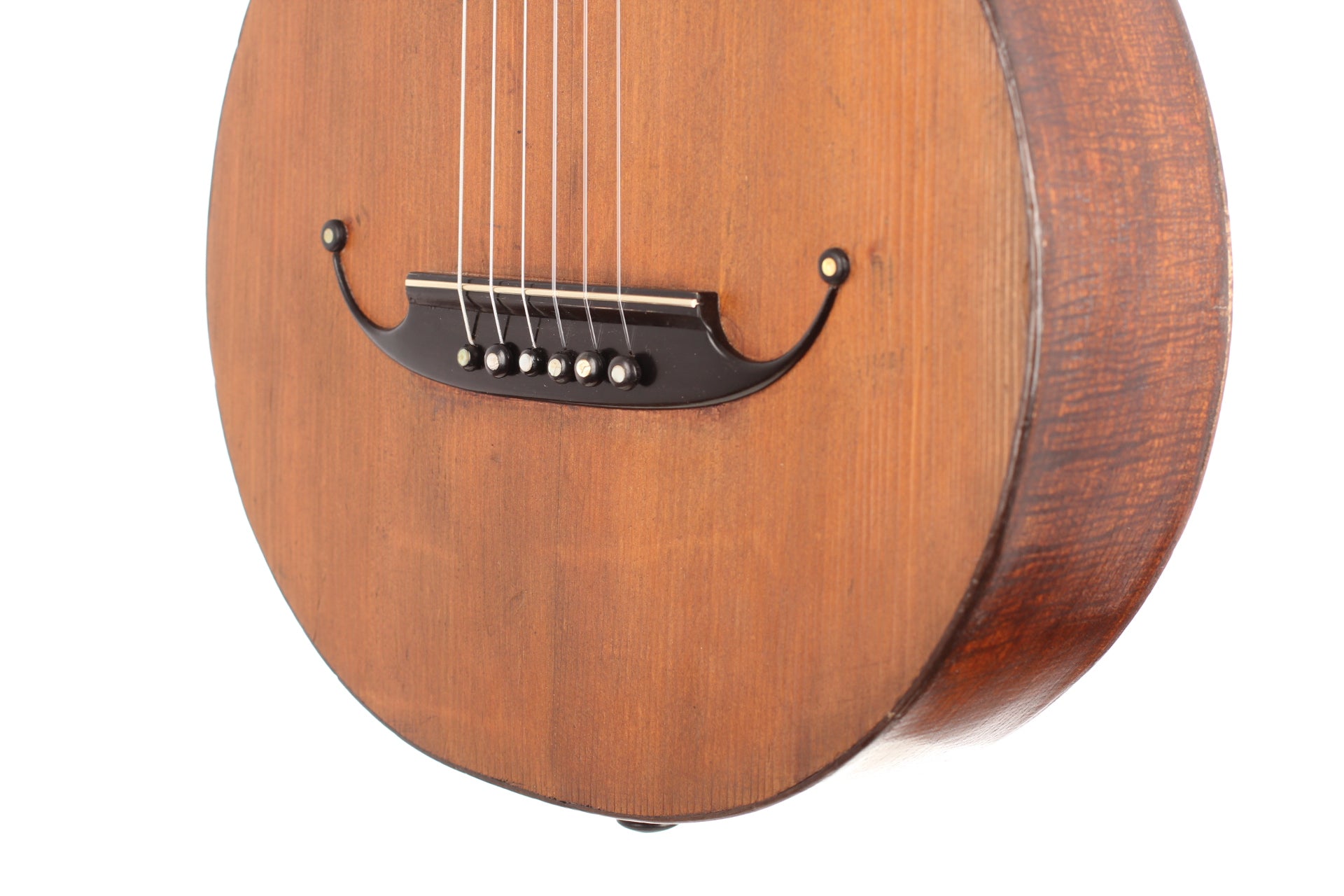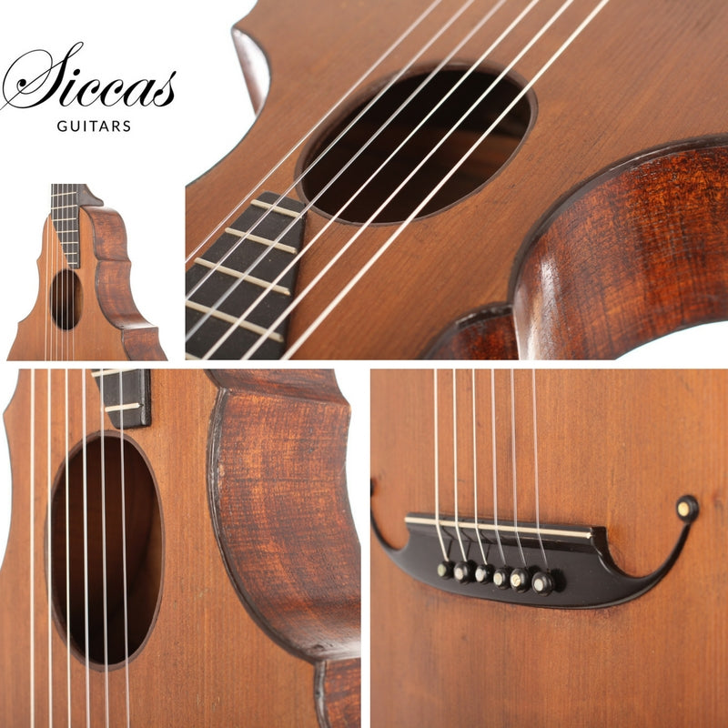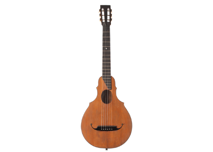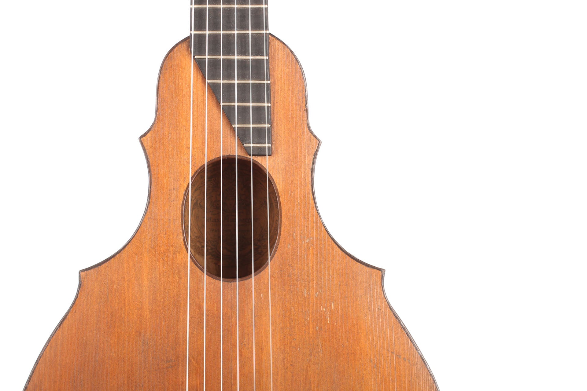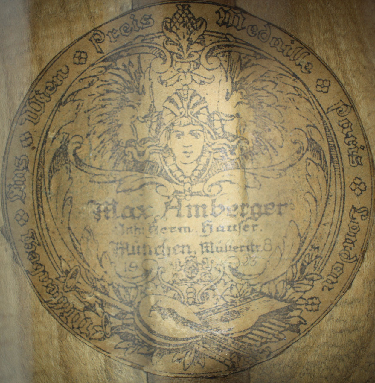 This guitar comes from the Max Amberger workshop and was manufactured in 1923. Max Amberger himself had lived from 1838 until 1889 and was a Munich instrument maker. His company, which was founded around 1860, concentrated mainly on the construction of violins, guitars and zithers. After his death his son, Henry Amberger, took charge of his father’s company and later, when the son died as well, H. Amberger’s widow continued to operate the business. In the year 1921 the company was taken over by Hermann Hauser ® I. The top of this wappen guitar is made of German spruce wood. The bridge is not original. The two-piece back and the sides are made of beech wood. A hardshell case is included.