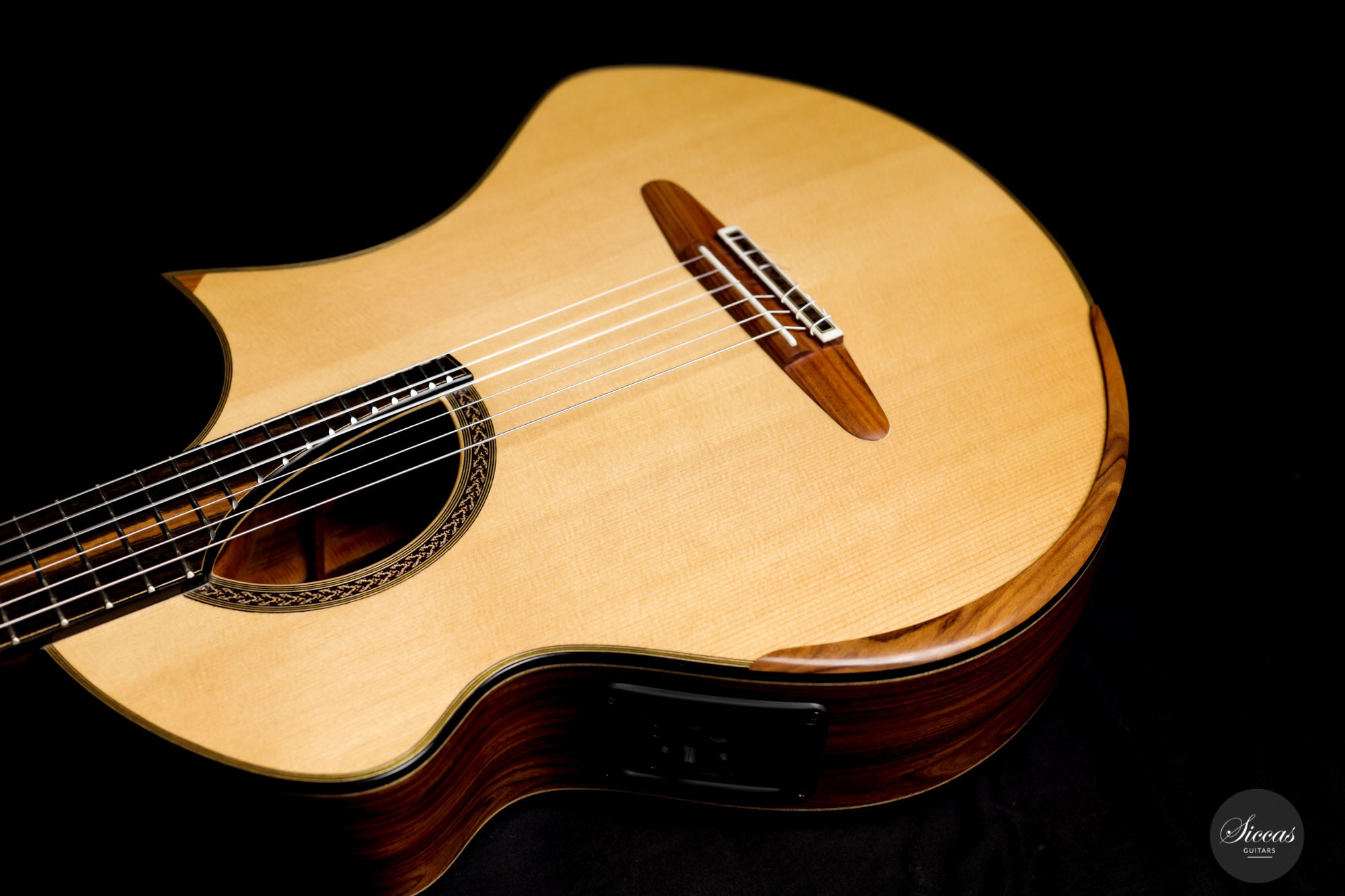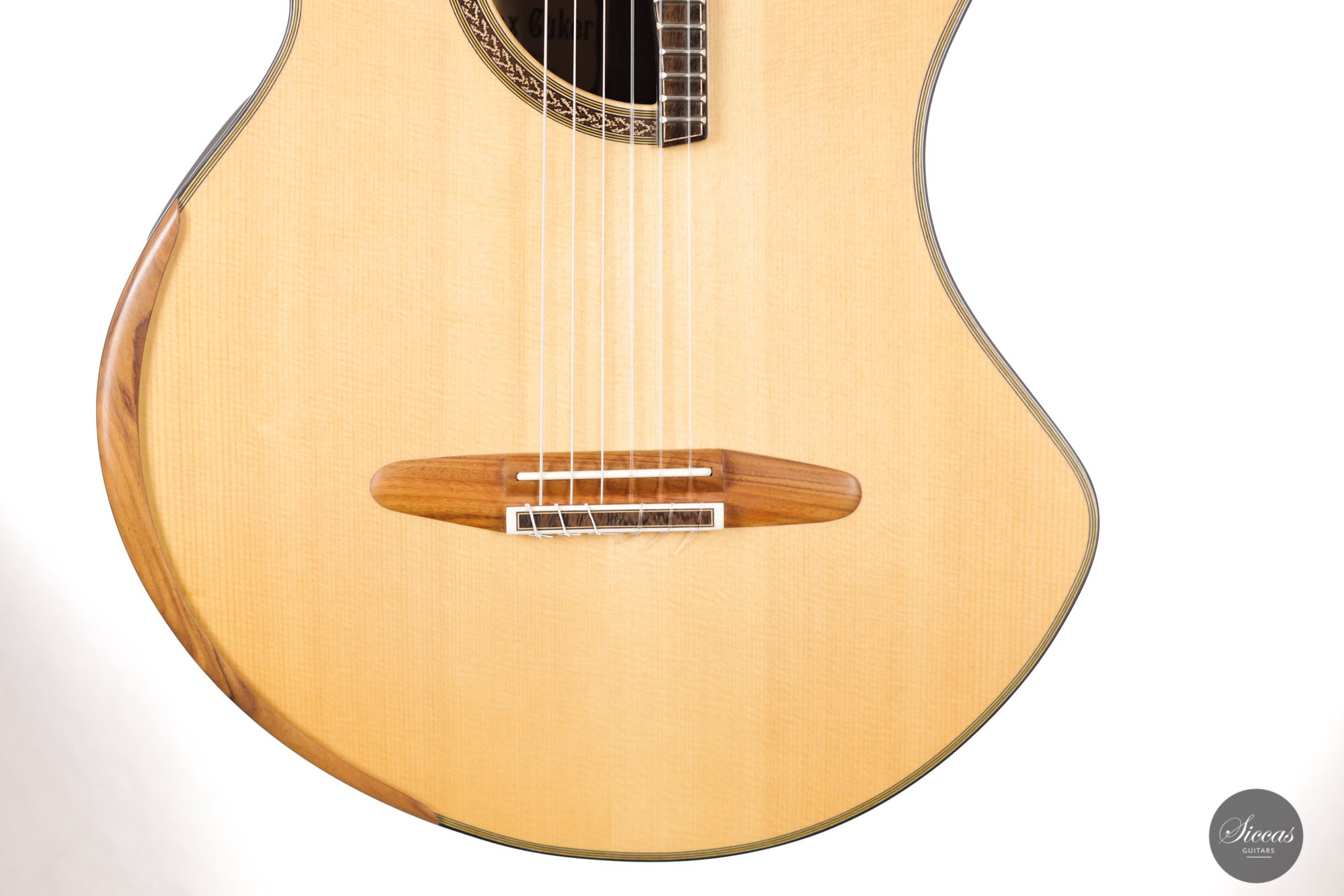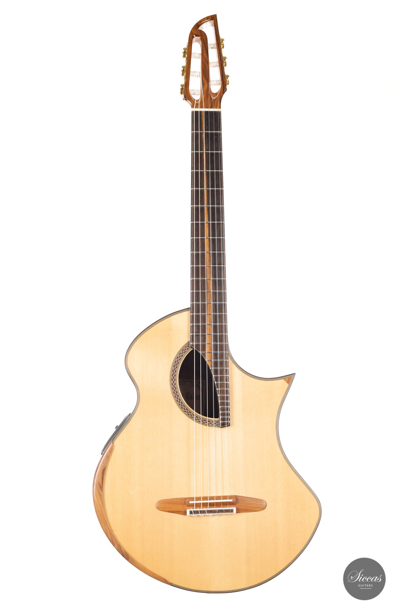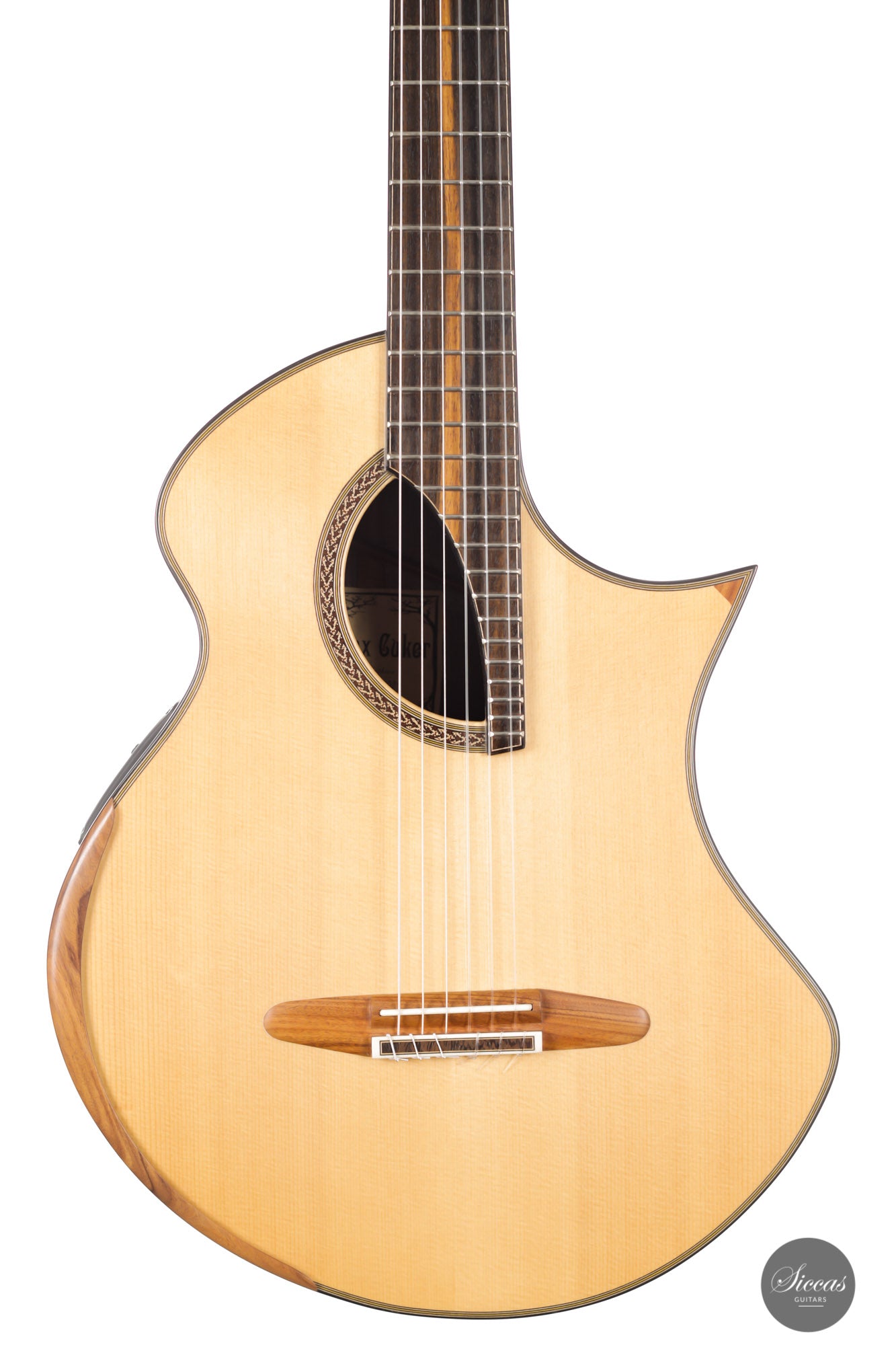 This Fusion model called "Birute", freshly out of Max Cuker's workshop, is designed for the stage. Thanks to the L.R.Baggs Stagepro Anthem pickup system with piezo and specially designed condenser microphone, it is also excellent for amplified performances. The unique design of the body also makes this guitar particularly ergonomic and, due to the generous cutaway, very accessible in the upper positions. Overall, this guitar has a clear, rich tone with plenty of sustain and a distinct presence. Fusion guitars of this quality are not easy to find and all the more we are pleased to offer this interesting Max Cuker.