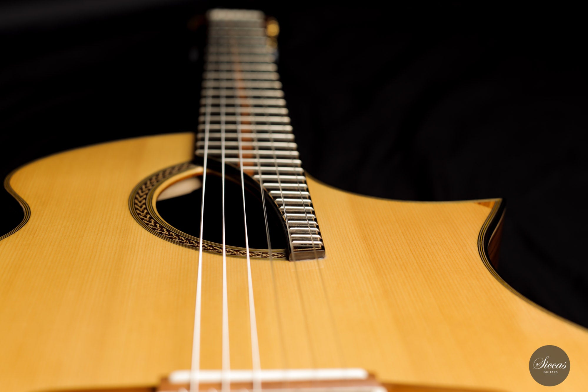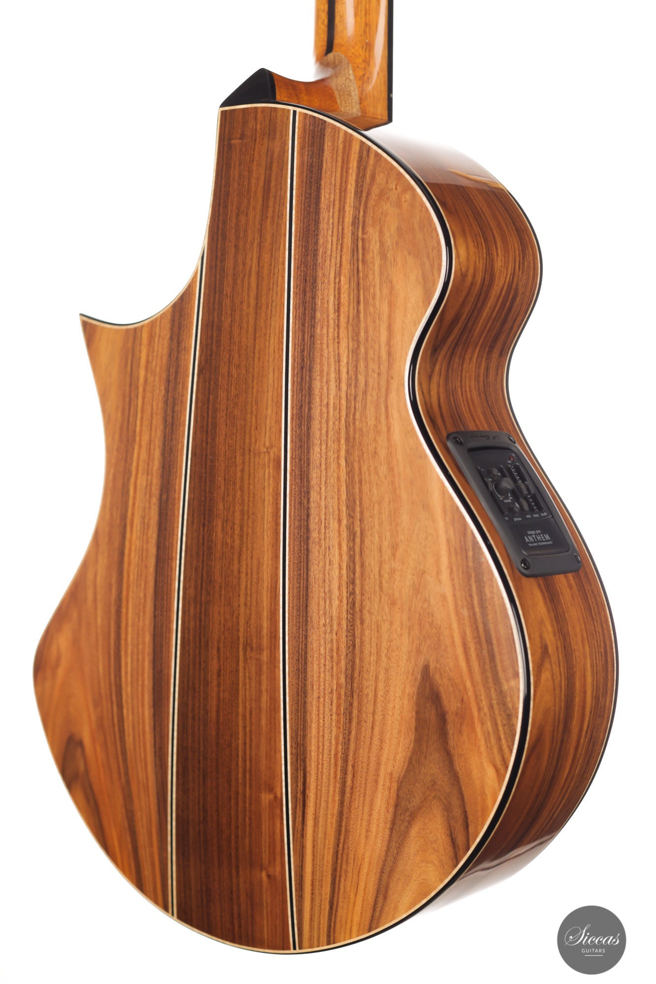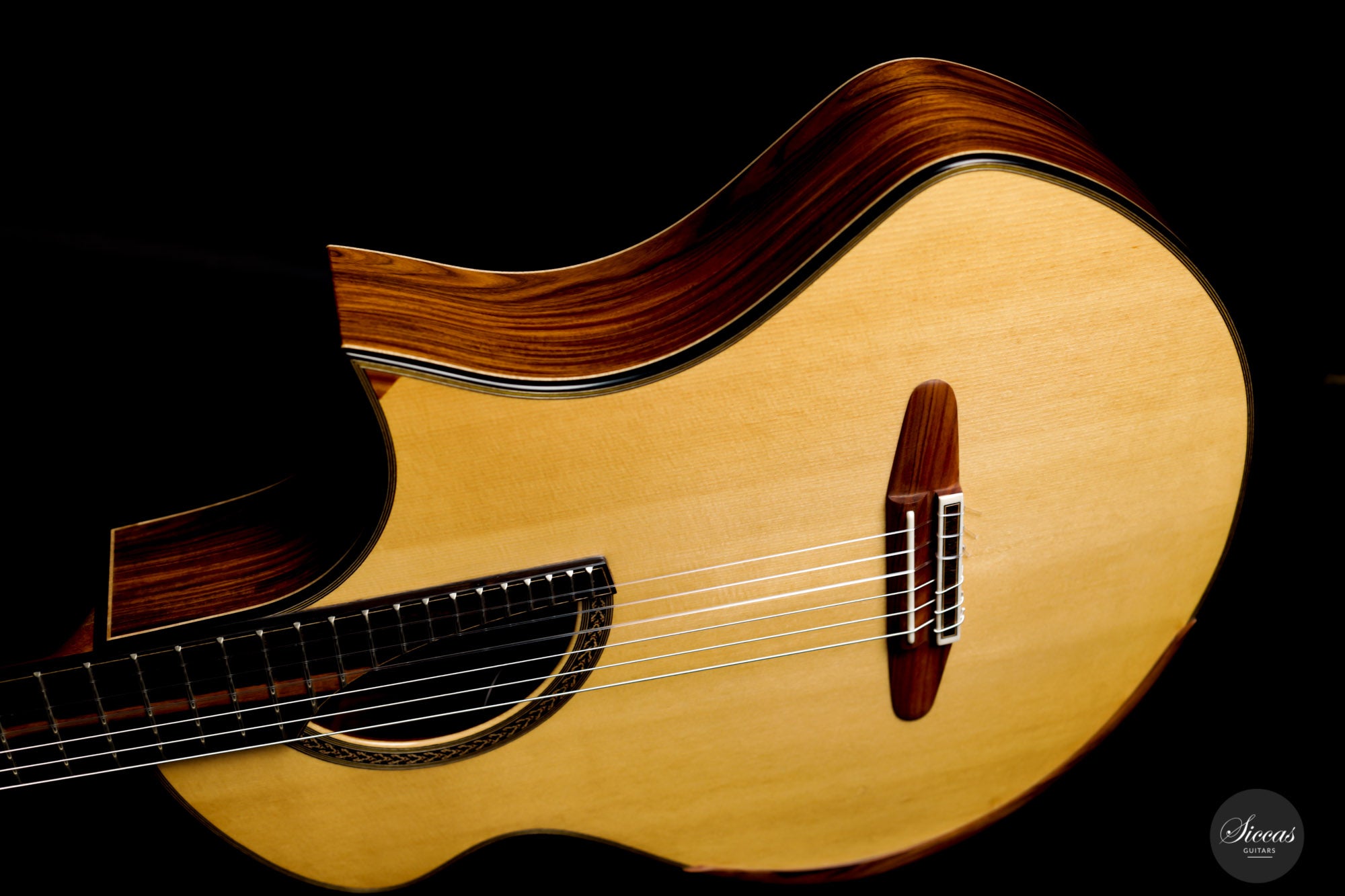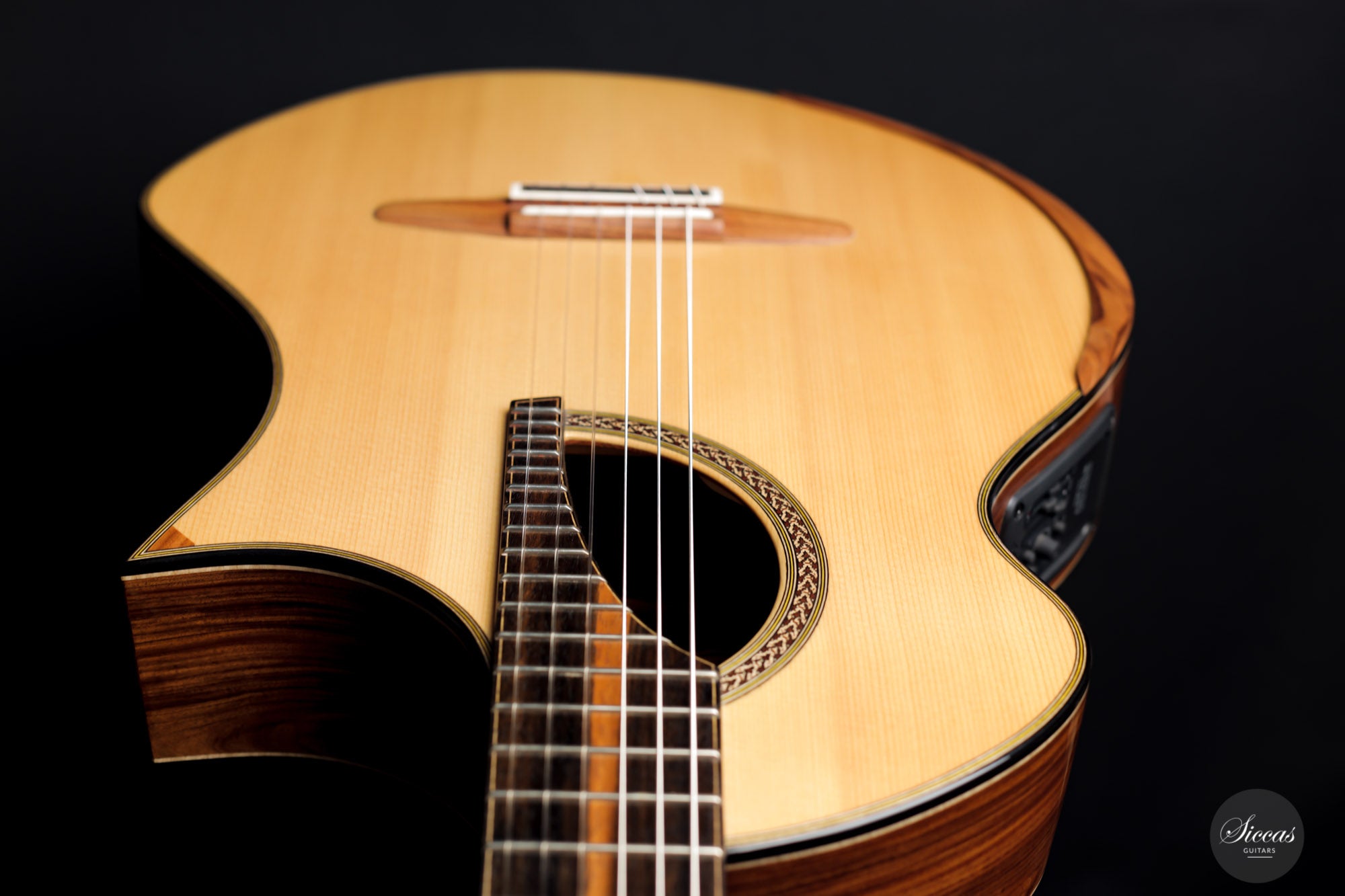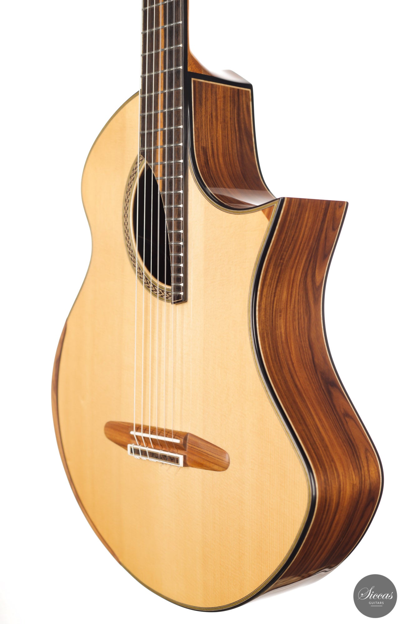 This Fusion model called "Birute", freshly out of Max Cuker's workshop, is designed for the stage. Thanks to the L.R.Baggs Stagepro Anthem pickup system with piezo and specially designed condenser microphone, it is also excellent for amplified performances. The unique design of the body also makes this guitar particularly ergonomic and, due to the generous cutaway, very accessible in the upper positions. Overall, this guitar has a clear, rich tone with plenty of sustain and a distinct presence. Fusion guitars of this quality are not easy to find and all the more we are pleased to offer this interesting Max Cuker.
