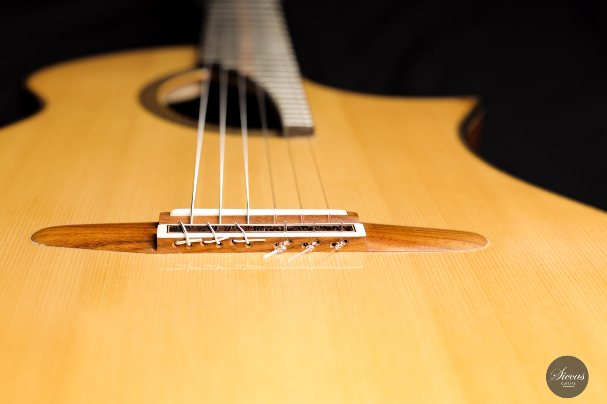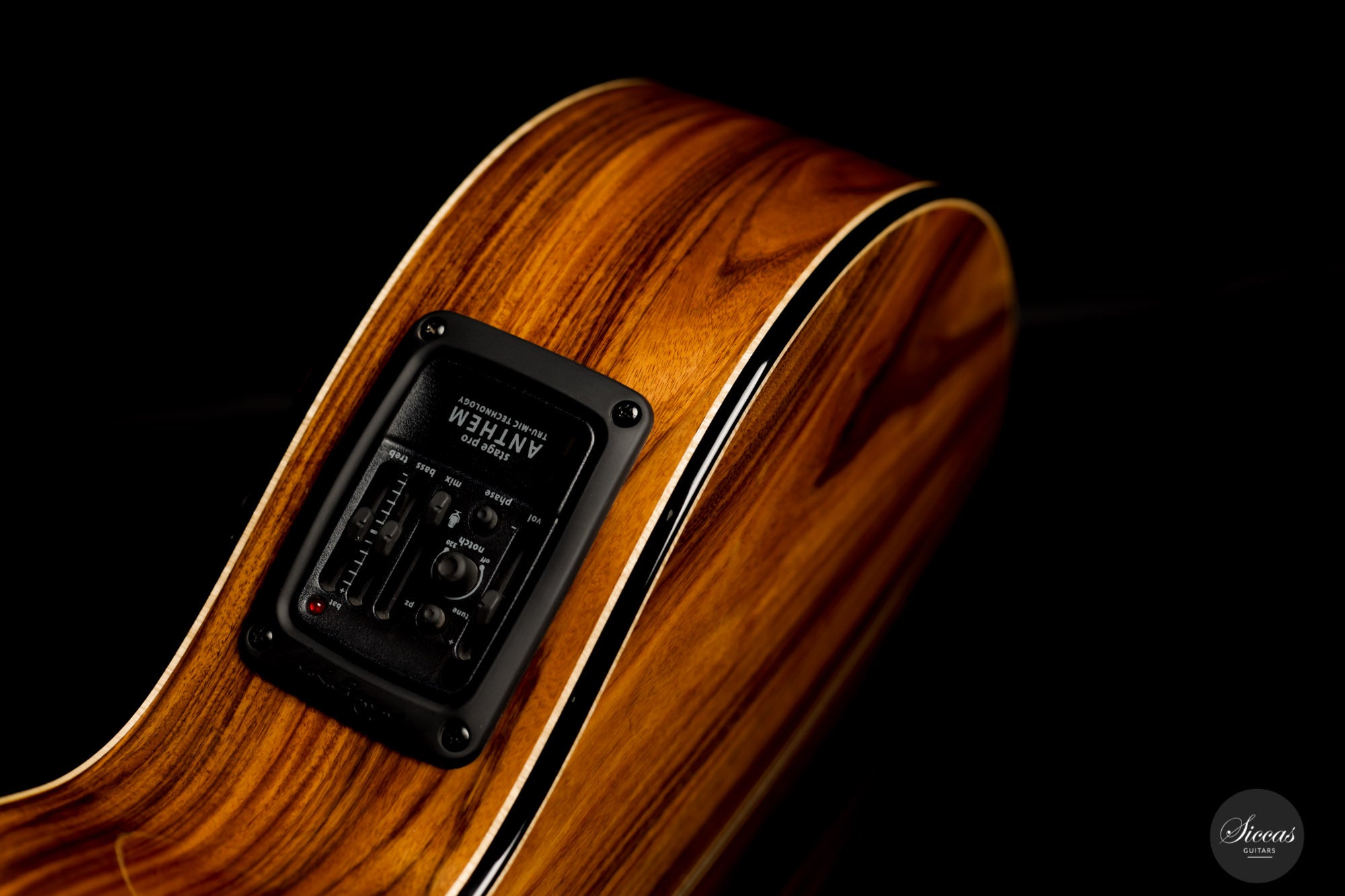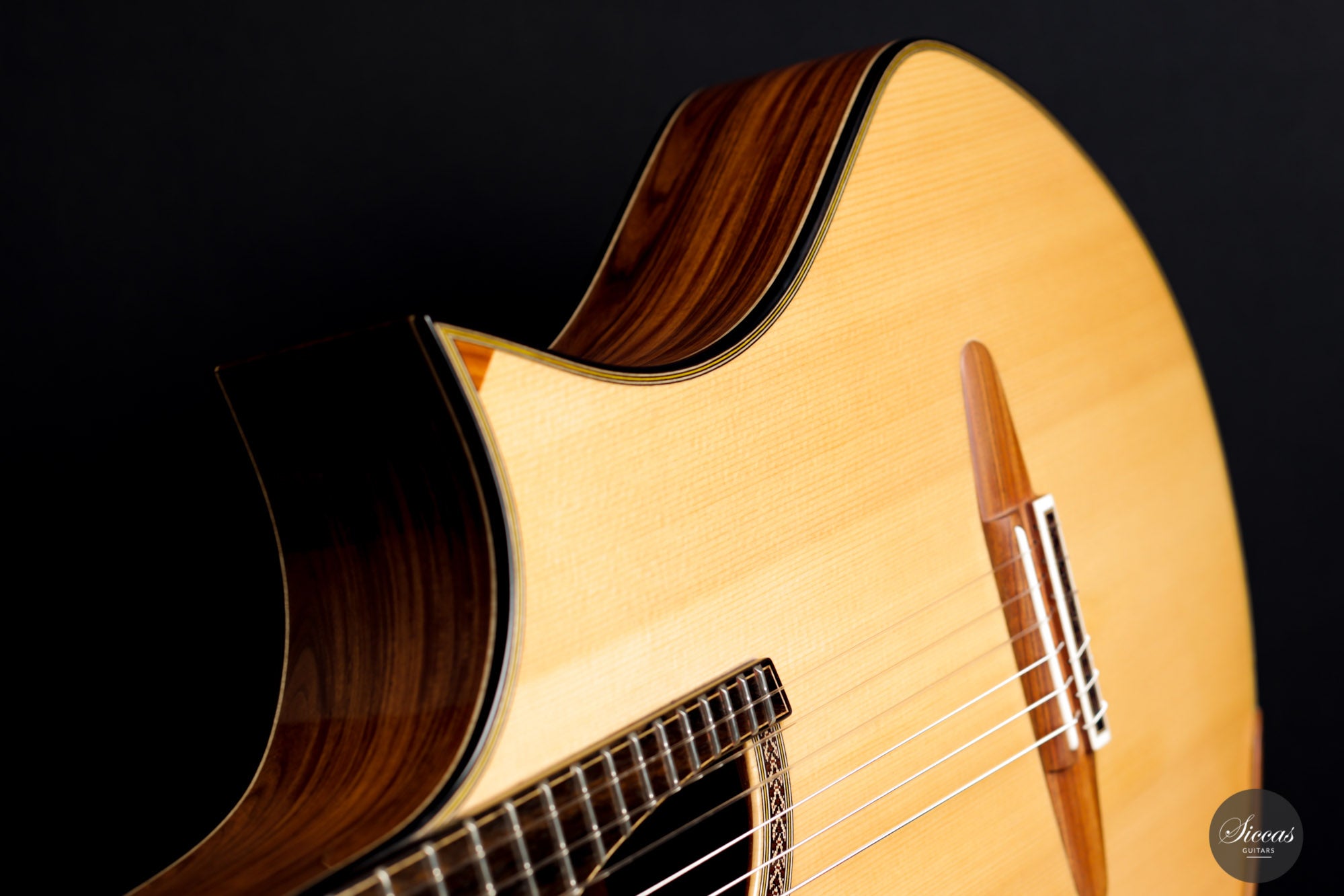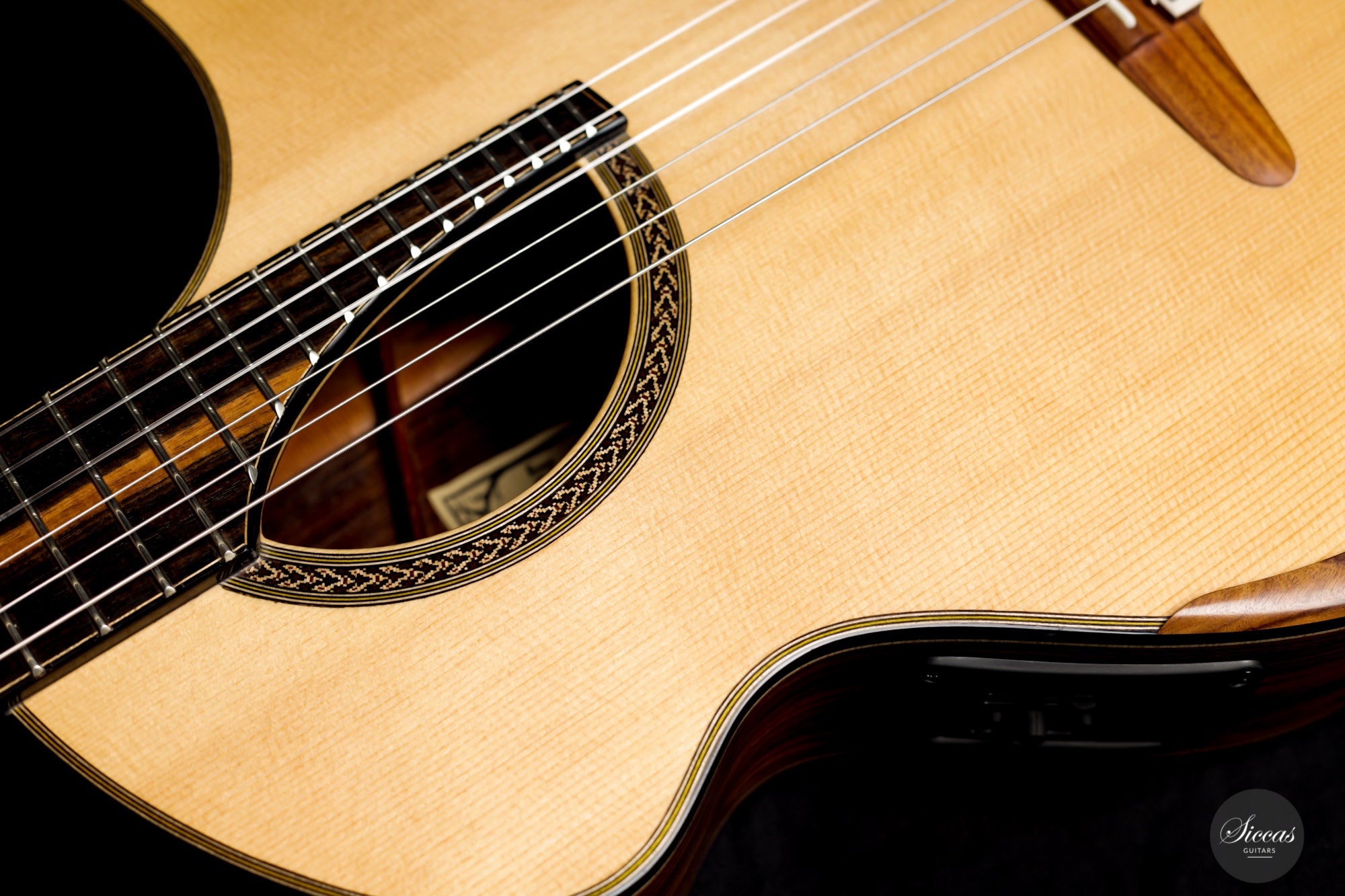 This Fusion model called "Birute", freshly out of Max Cuker's workshop, is designed for the stage. Thanks to the L.R.Baggs Stagepro Anthem pickup system with piezo and specially designed condenser microphone, it is also excellent for amplified performances. The unique design of the body also makes this guitar particularly ergonomic and, due to the generous cutaway, very accessible in the upper positions. Overall, this guitar has a clear, rich tone with plenty of sustain and a distinct presence. Fusion guitars of this quality are not easy to find and all the more we are pleased to offer this interesting Max Cuker.