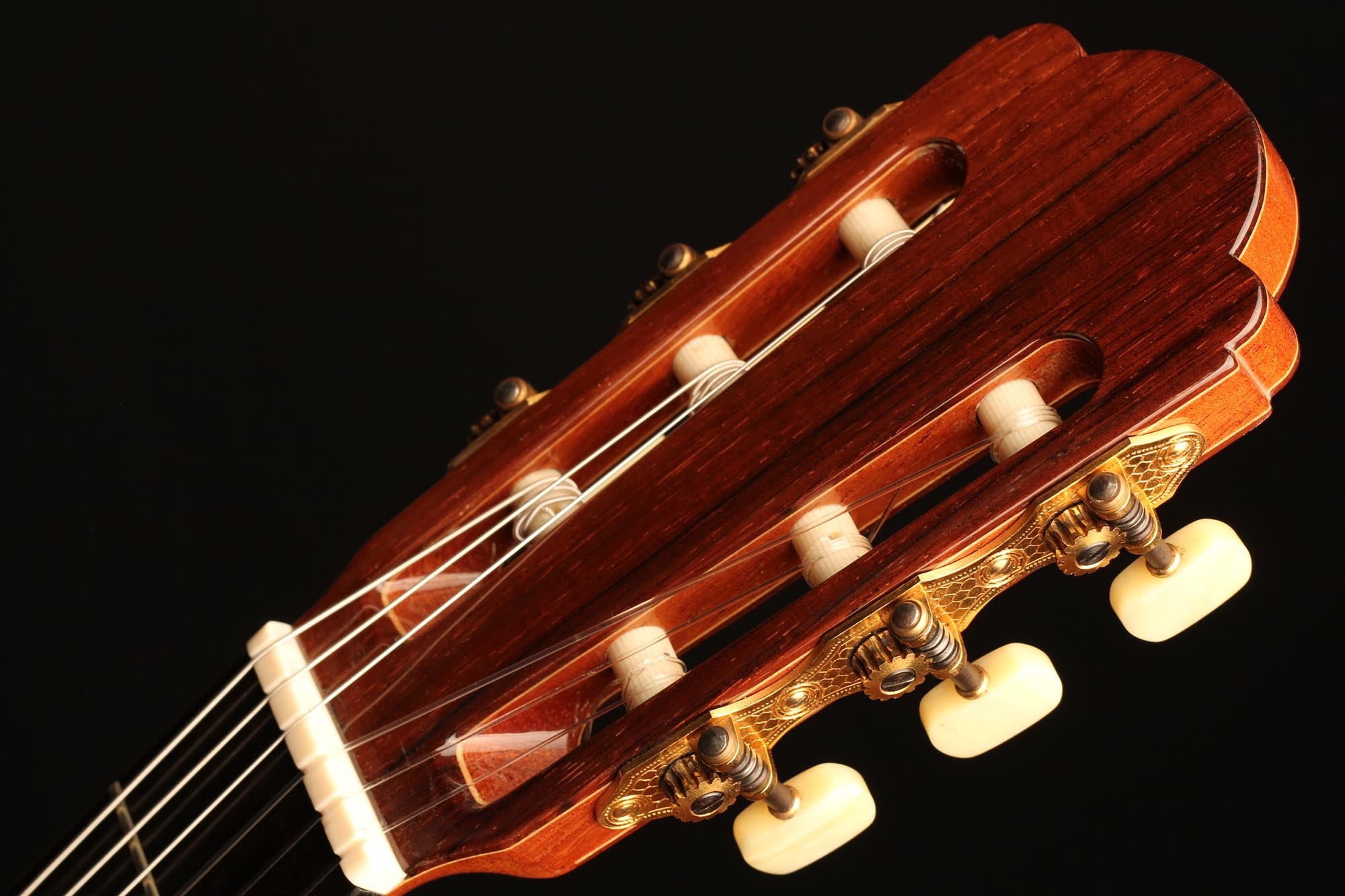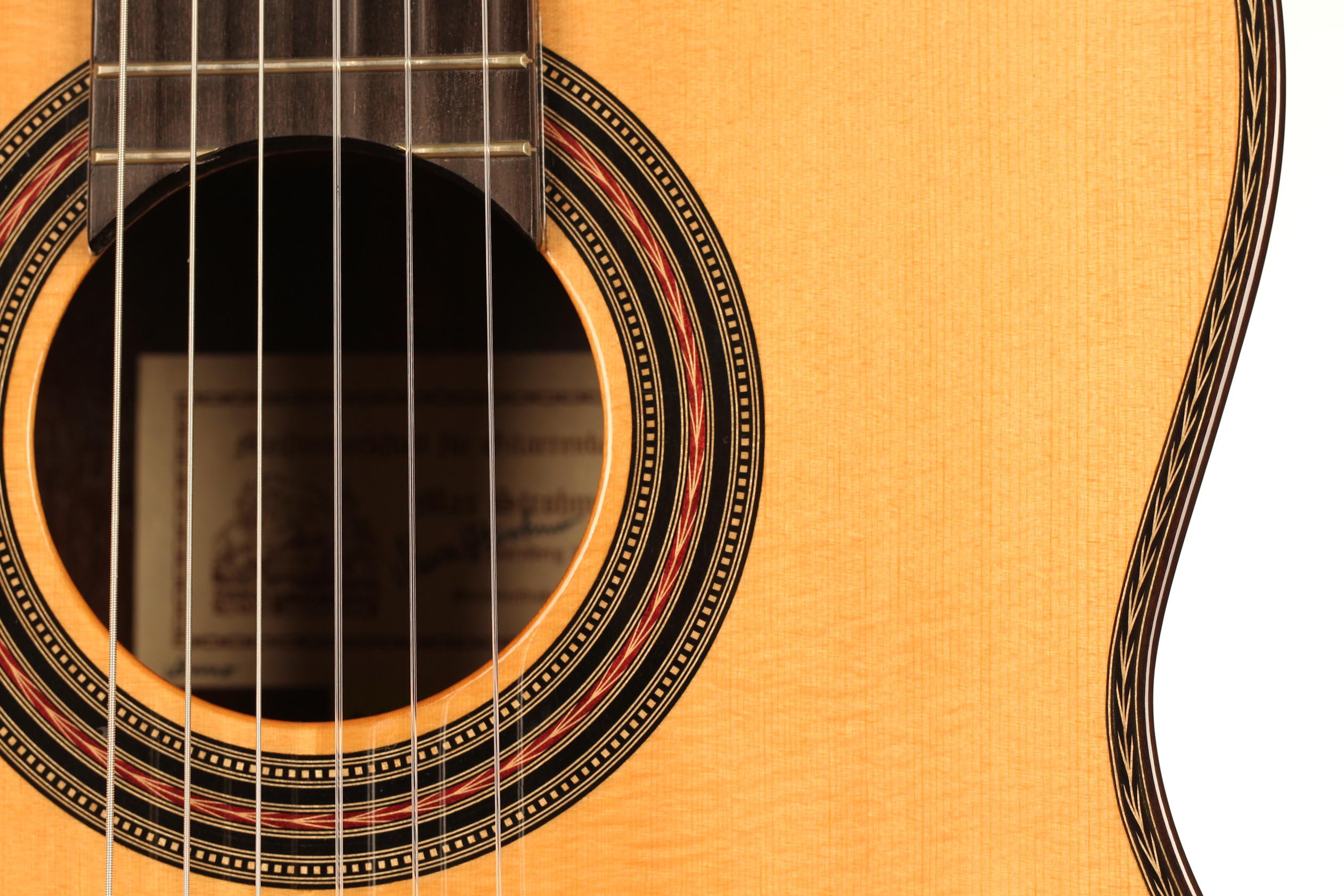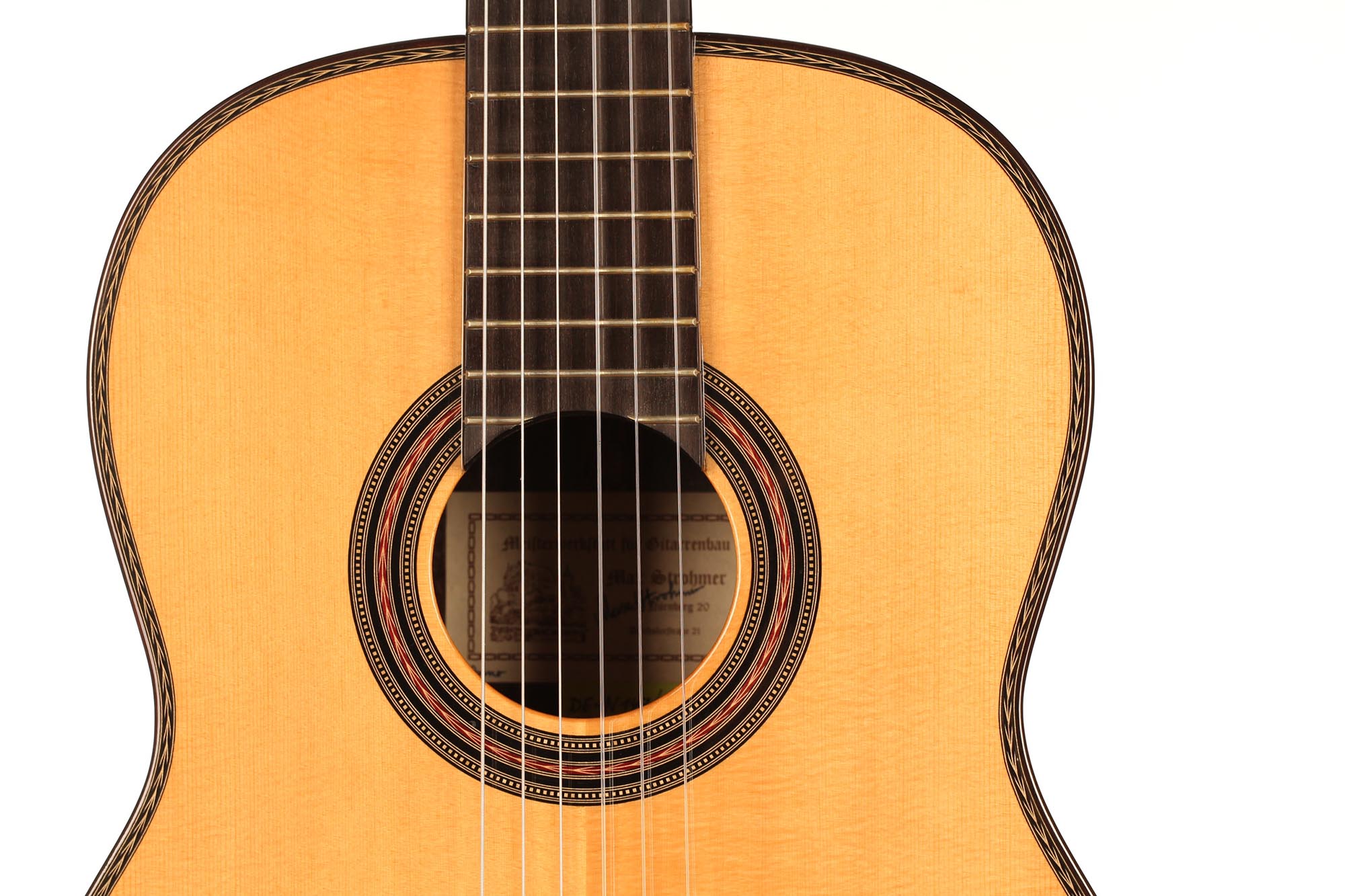 Max Strohmer is a German guitar maker from Nürnberg. The Strohmer family has been building music instruments since 1908 and Max Strohmer took over the one-century-old family workshop in 1990. This guitar is a fine Torres model built in 2012. Back and sides are made of beautiful Brazilian rosewood (CITES certified) and high quality gold-plated Landstorfer tuners insure a very fine tuning. This guitar has a very sweet tone with strong open trebles and an orchestral polyphonic voice. The overall rich sound and great playability make it a very good value for money.