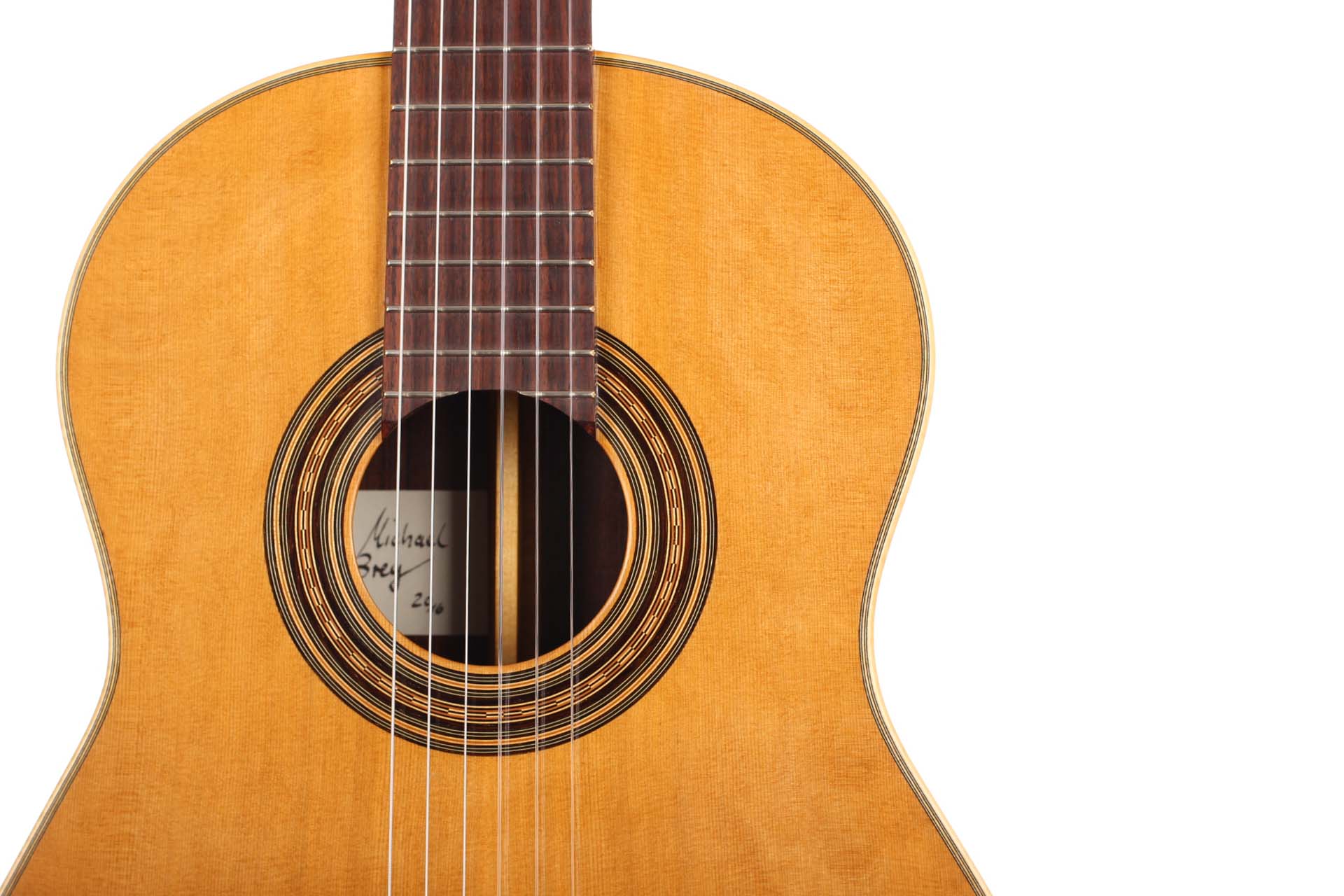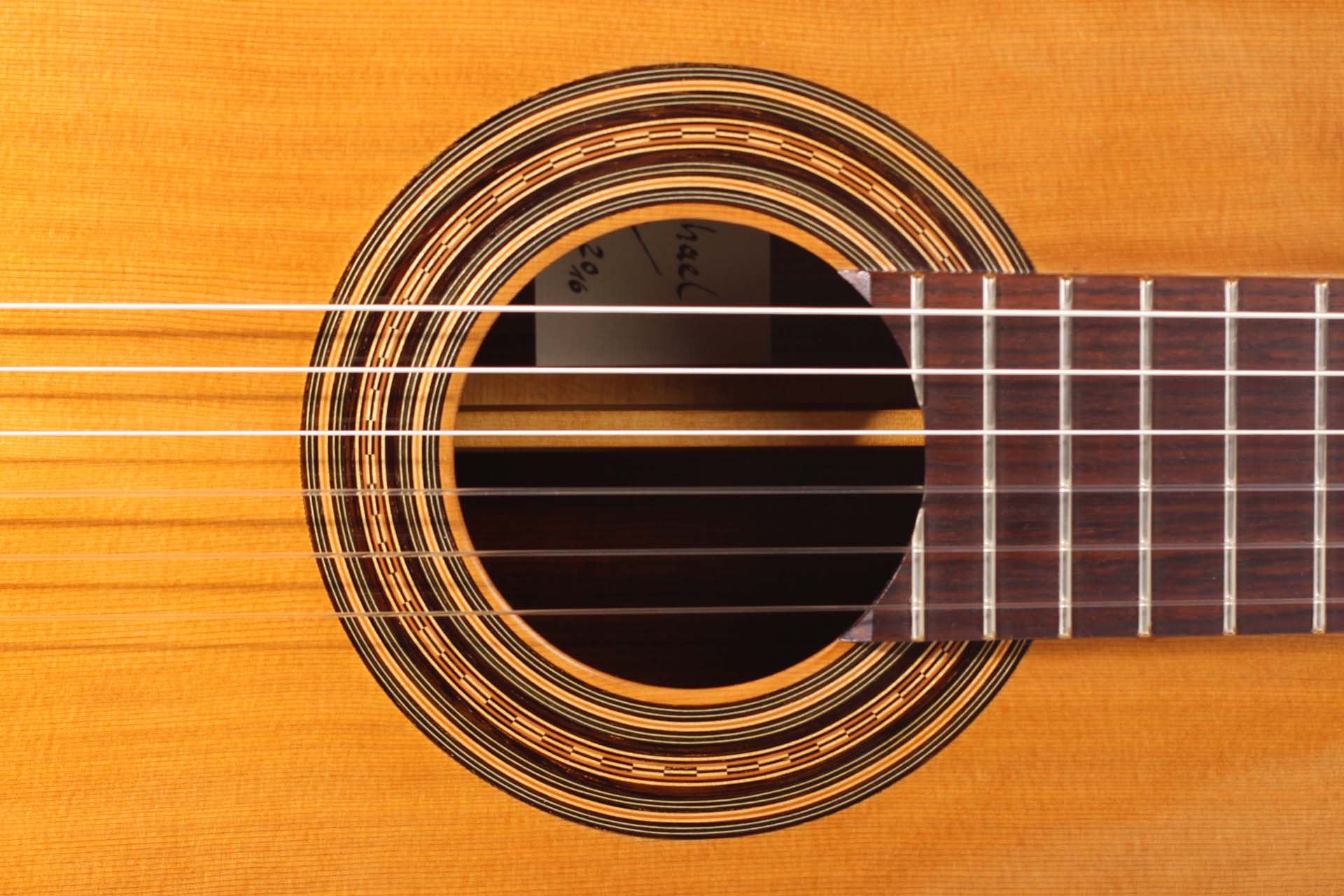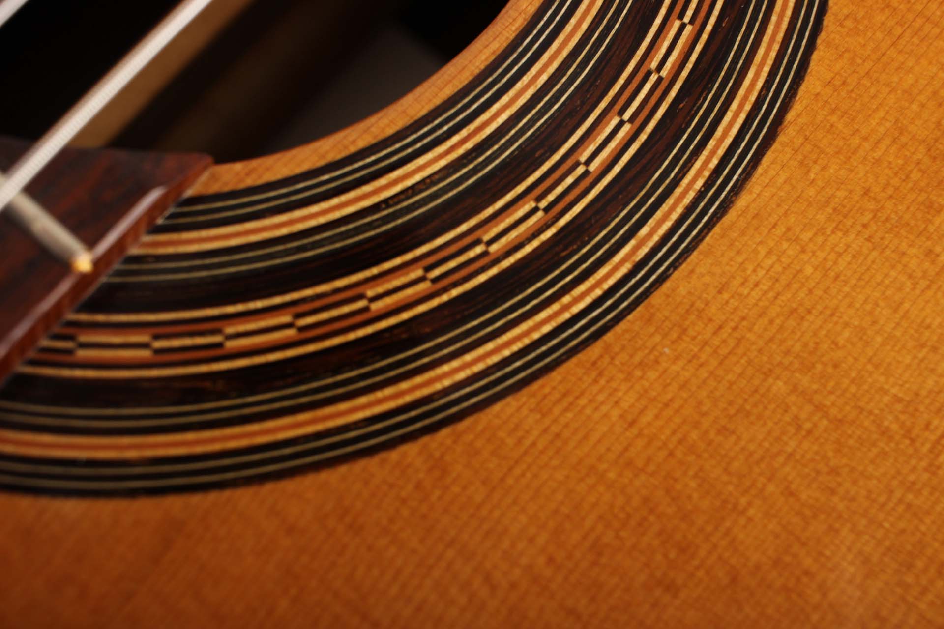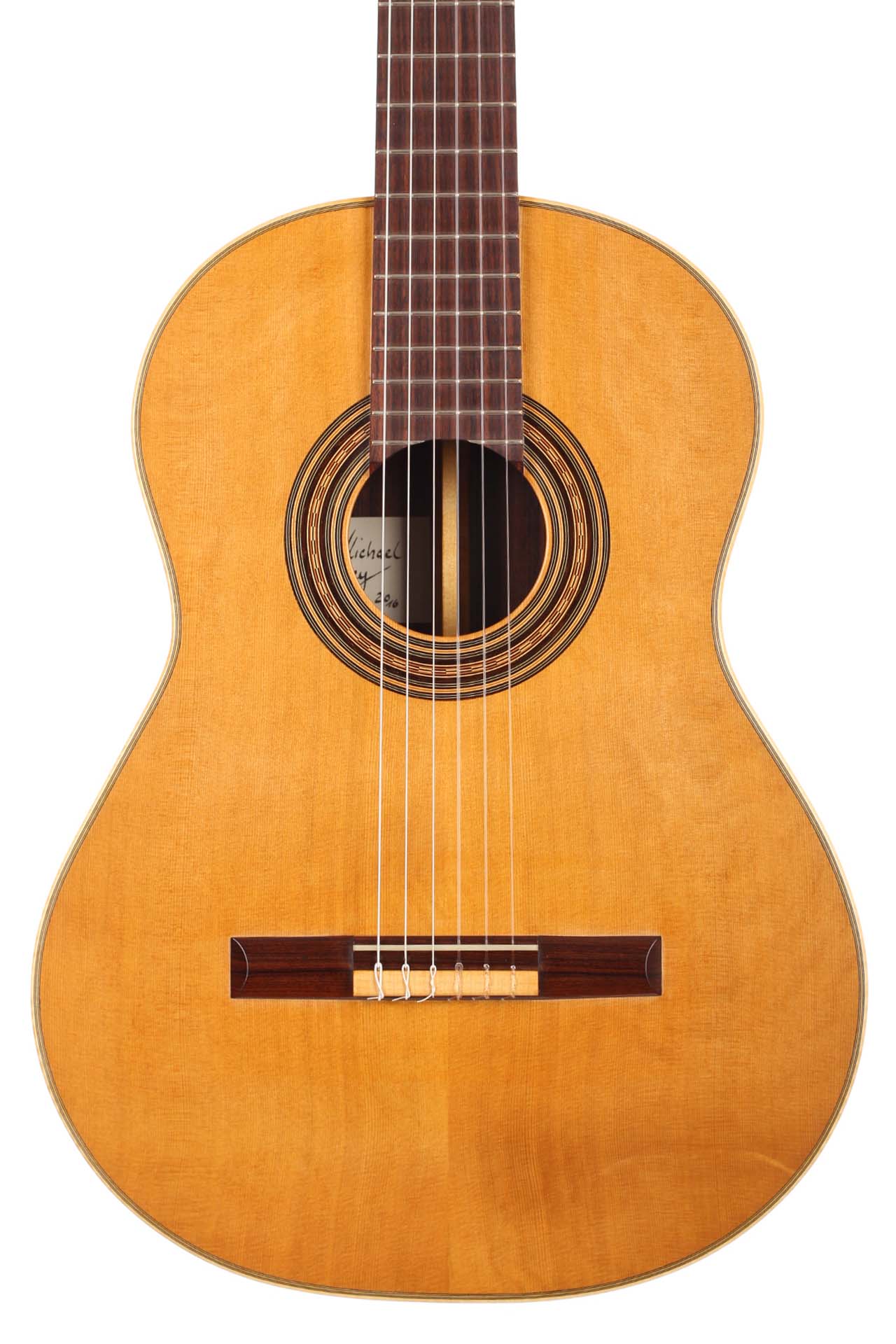 Michael Brey, born in 1966, initially learned his craft from Peter Barton in England during the years from 1994 to 1996. In the following years, he worked for a repair shop, a guitar dealer and a violin maker in Munich. In 2007 he opened his own workshop in Munich. In the beginning, besides doing repair and restoration work, he built classical as well as archtop guitars. Nowadays he has completely dedicated himself to the traditional Spanish guitar in the style of Antonio de Torres, without just copying them however. A distinctive feature of his guitars is a stabilizing strut between the foot of the neck and the end block which reduces the tension in the top and back plates in order to enhance the sustain. For the fretboard, Michael Brey prefers to use Indian Rosewood, for a slightly warmer tone and a light weight, well balanced instrument. His guitars are completely handmade and finished with a high quality, shellac based French-polish. This guitar is built out of close grained cedar and a beautiful set of Pao Ferro, both 30 years old. The binding is figured maple. The body resonance is F# and the guitar has a full bodied, warm tone and good volume. The tuners are made by Klaus Scheller. A Hiscox Pro II case is included.