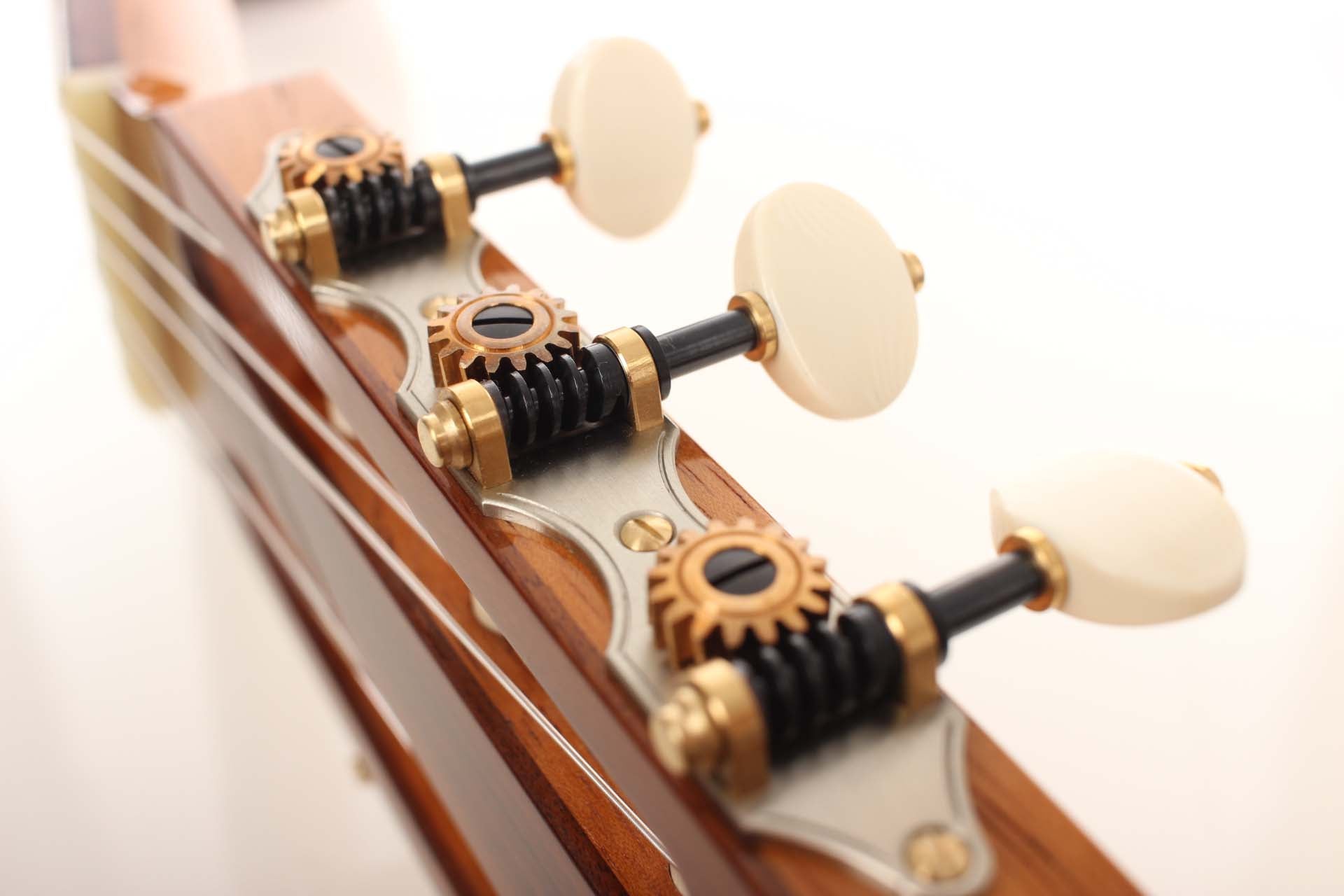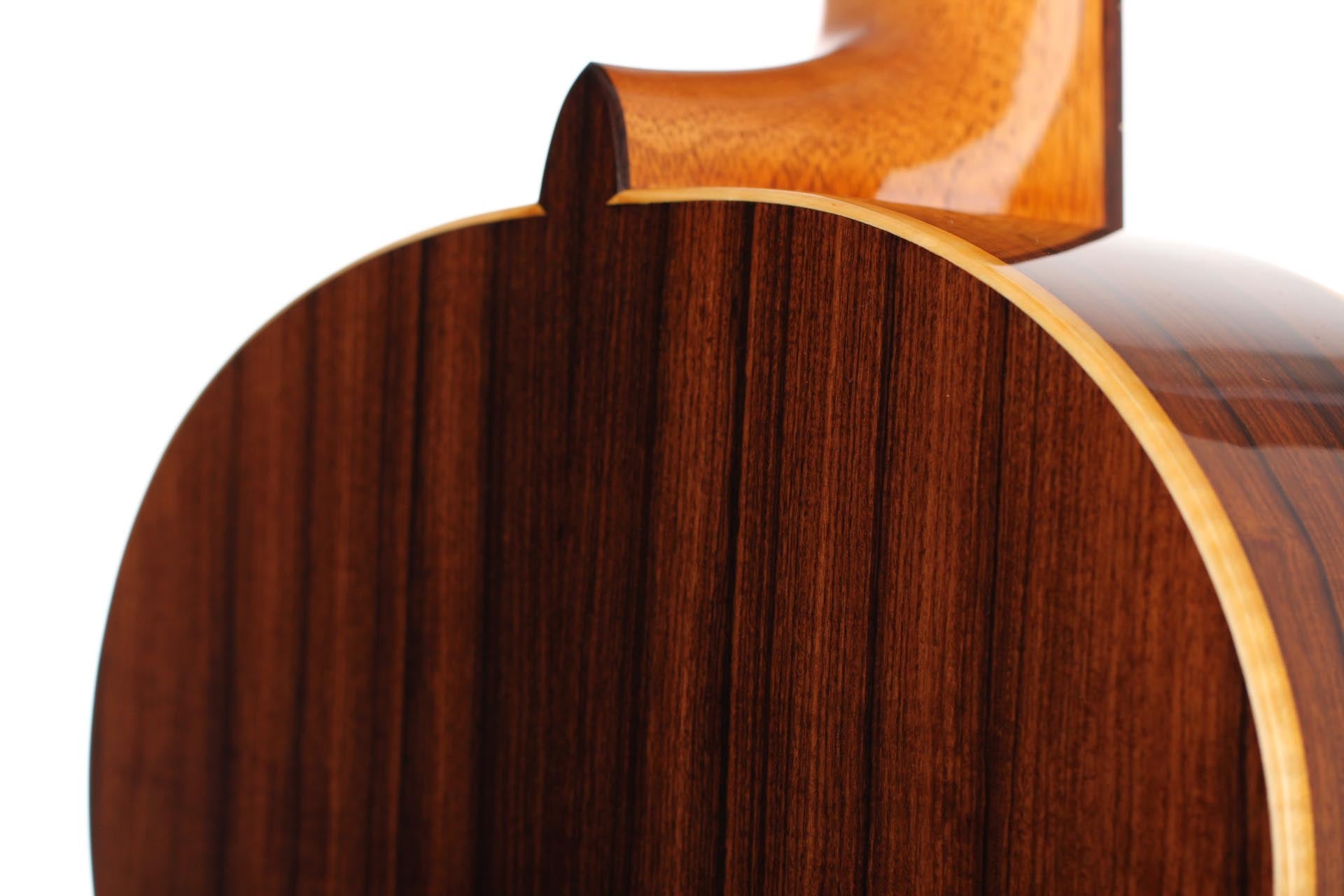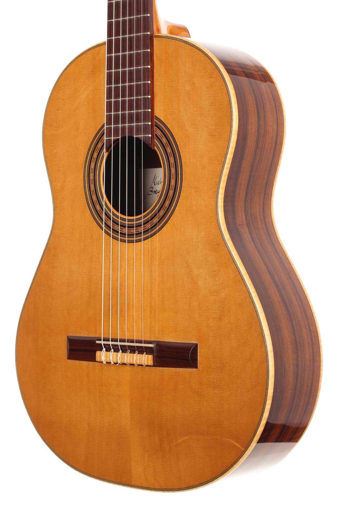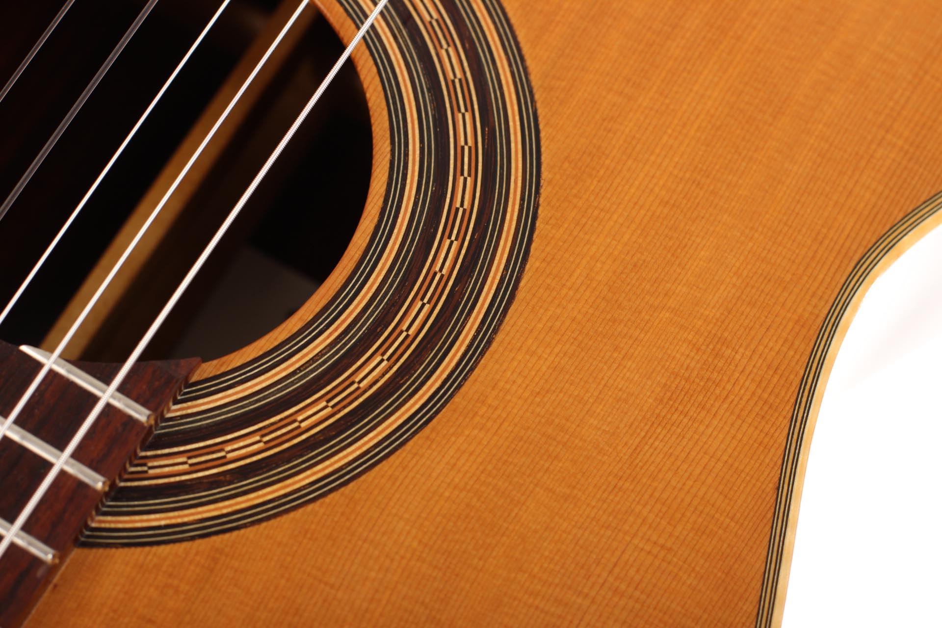 Michael Brey, born in 1966, initially learned his craft from Peter Barton in England during the years from 1994 to 1996. In the following years, he worked for a repair shop, a guitar dealer and a violin maker in Munich. In 2007 he opened his own workshop in Munich. In the beginning, besides doing repair and restoration work, he built classical as well as archtop guitars. Nowadays he has completely dedicated himself to the traditional Spanish guitar in the style of Antonio de Torres, without just copying them however. A distinctive feature of his guitars is a stabilizing strut between the foot of the neck and the end block which reduces the tension in the top and back plates in order to enhance the sustain. For the fretboard, Michael Brey prefers to use Indian Rosewood, for a slightly warmer tone and a light weight, well balanced instrument. His guitars are completely handmade and finished with a high quality, shellac based French-polish. This guitar is built out of close grained cedar and a beautiful set of Pao Ferro, both 30 years old. The binding is figured maple. The body resonance is F# and the guitar has a full bodied, warm tone and good volume. The tuners are made by Klaus Scheller. A Hiscox Pro II case is included.
