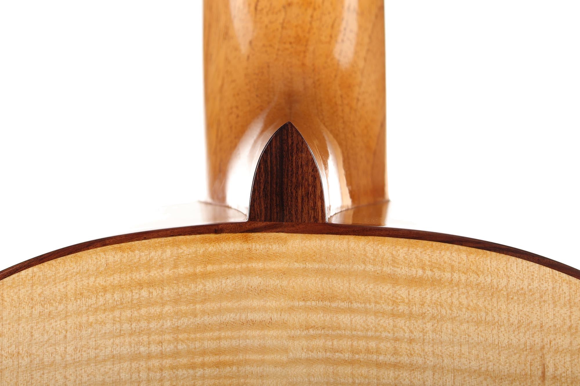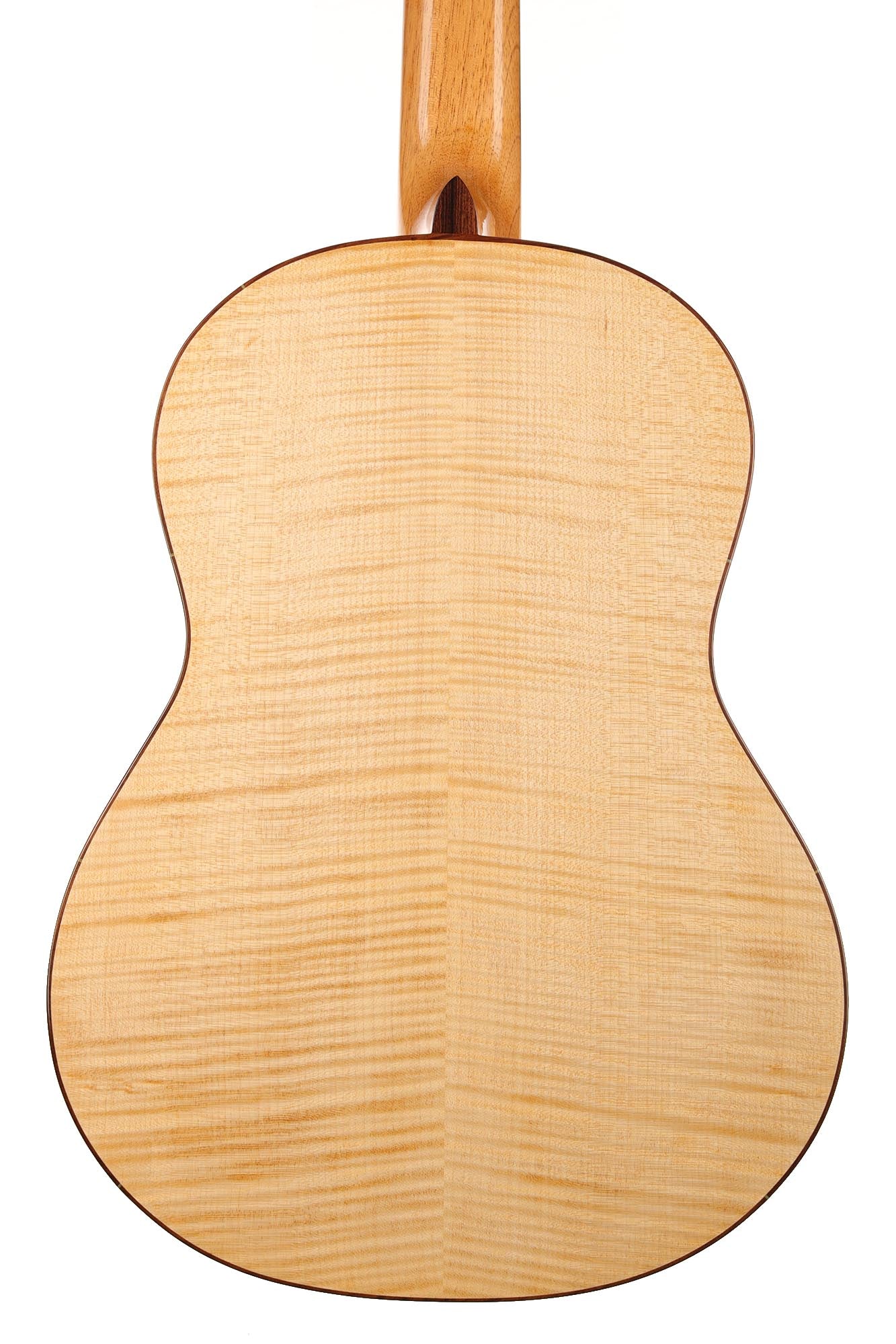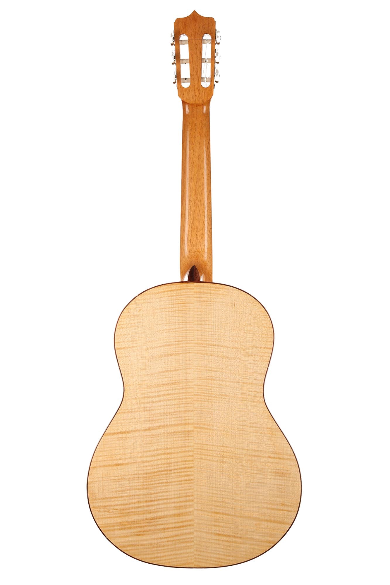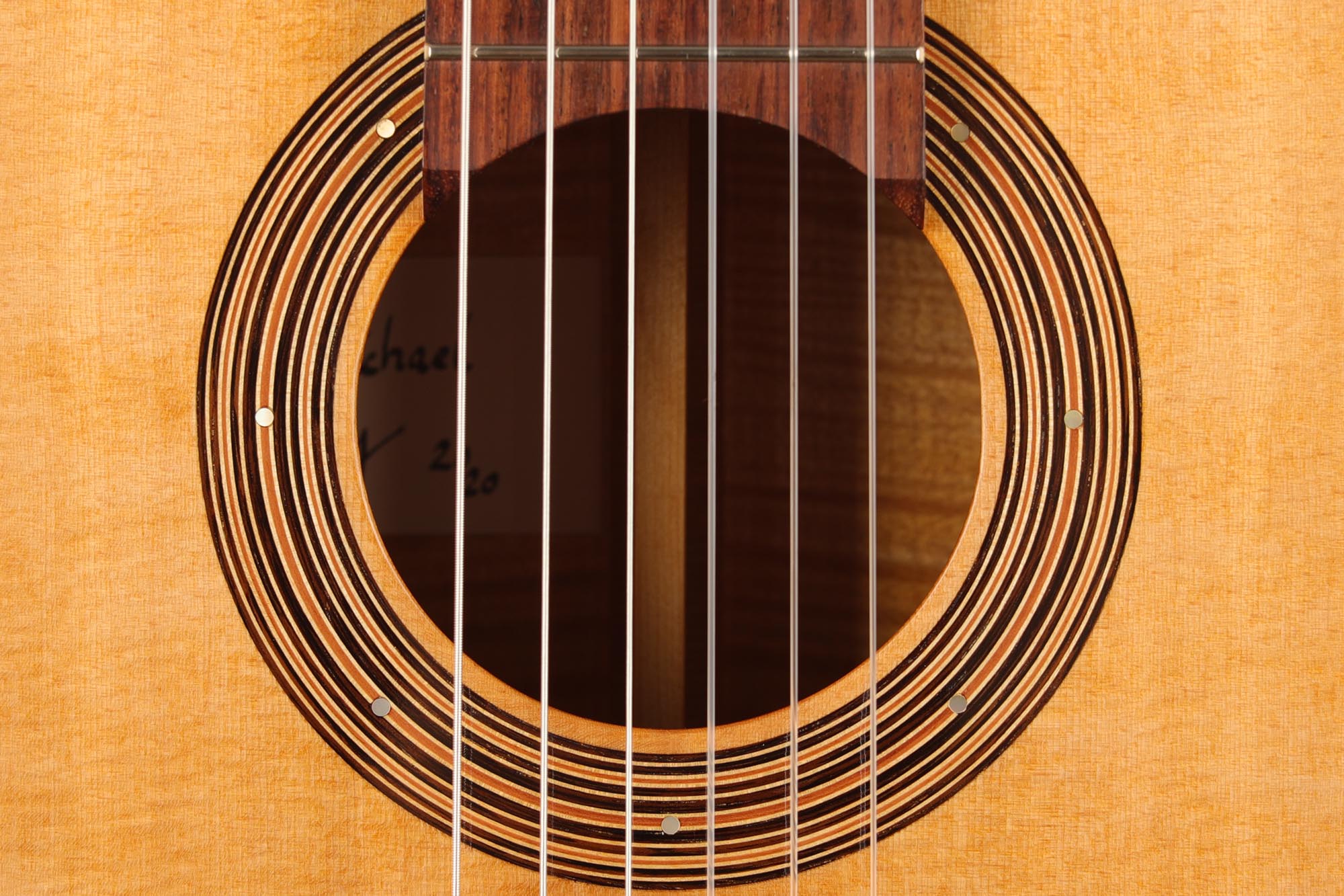 This beautiful guitar built-in 2020 comes straight from Michael Brey's workshop. It has a very charming design with an alpine spruce top and a maple back and sides. This instrument shows abundant small marquetry details that make it a really charming guitar. The rosette, for example, is a subtle combination of wood fillets in contrasting colors and fine inlays. The guitar has a very appealing warm sound, with clear trebles and well-supporting basses. Thanks to the 64.4 cm scale length and the slightly narrower saddle, this instrument is very easy to play and is both dynamic and sensitive. It is surprisingly powerful in sound and the somewhat small shape of this guitar gives a real feeling of control over the instrument. Due to the easy to find voice colors this Michael Brey guitar offers a wide range of possibilities. Thus it is altogether a comfortable and very versatile classical guitar.