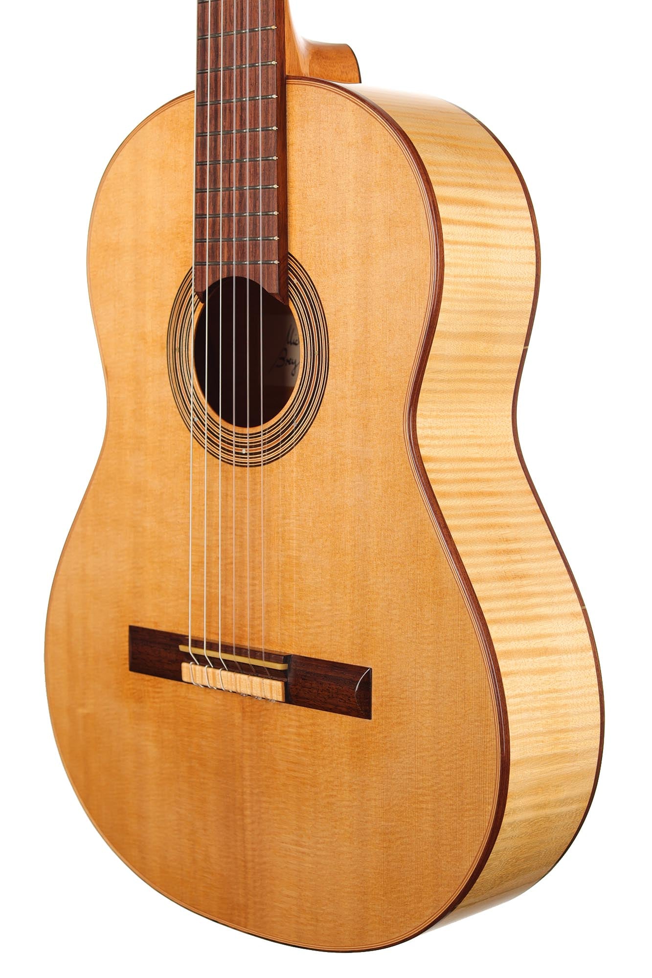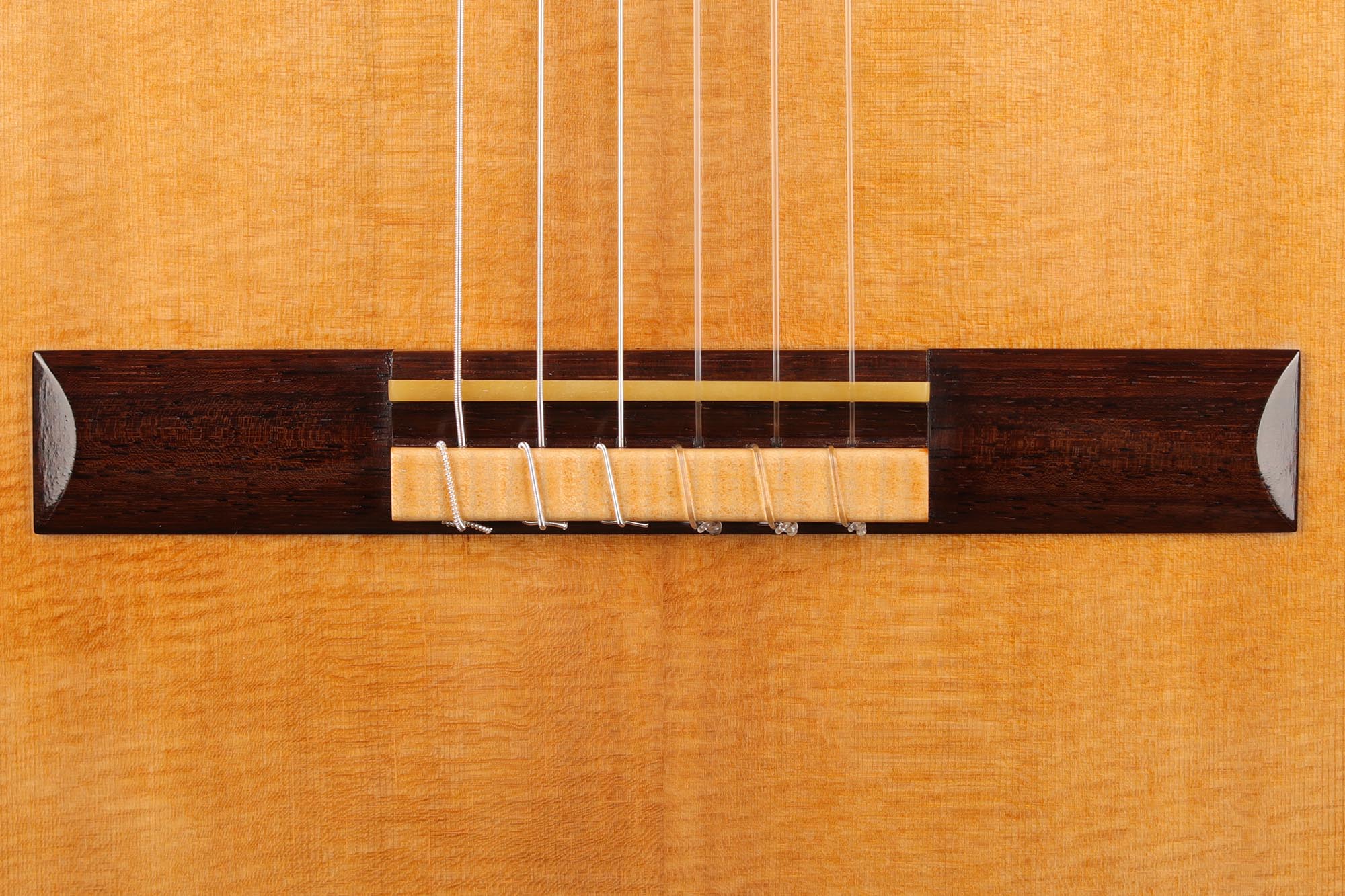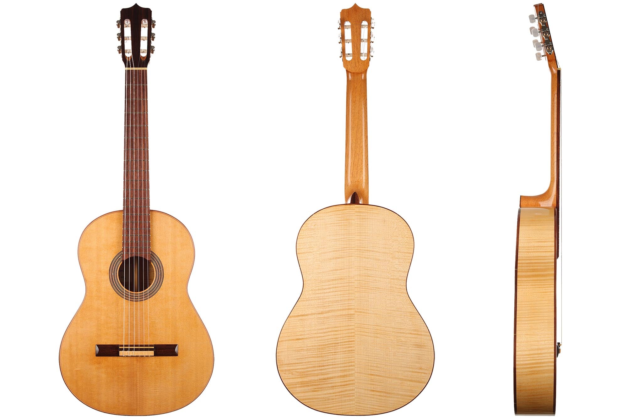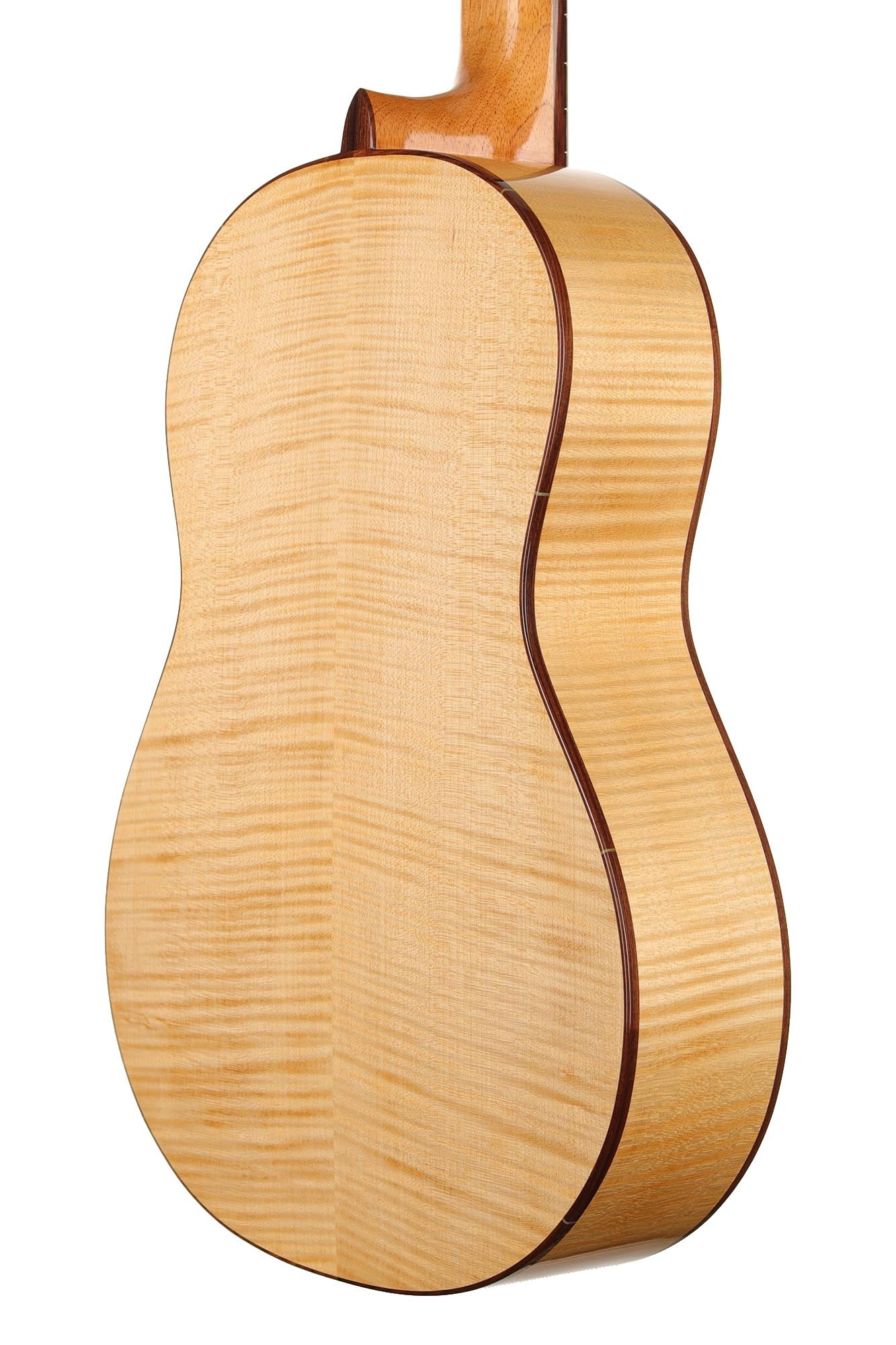 This beautiful guitar built-in 2020 comes straight from Michael Brey's workshop. It has a very charming design with an alpine spruce top and a maple back and sides. This instrument shows abundant small marquetry details that make it a really charming guitar. The rosette, for example, is a subtle combination of wood fillets in contrasting colors and fine inlays. The guitar has a very appealing warm sound, with clear trebles and well-supporting basses. Thanks to the 64.4 cm scale length and the slightly narrower saddle, this instrument is very easy to play and is both dynamic and sensitive. It is surprisingly powerful in sound and the somewhat small shape of this guitar gives a real feeling of control over the instrument. Due to the easy to find voice colors this Michael Brey guitar offers a wide range of possibilities. Thus it is altogether a comfortable and very versatile classical guitar.