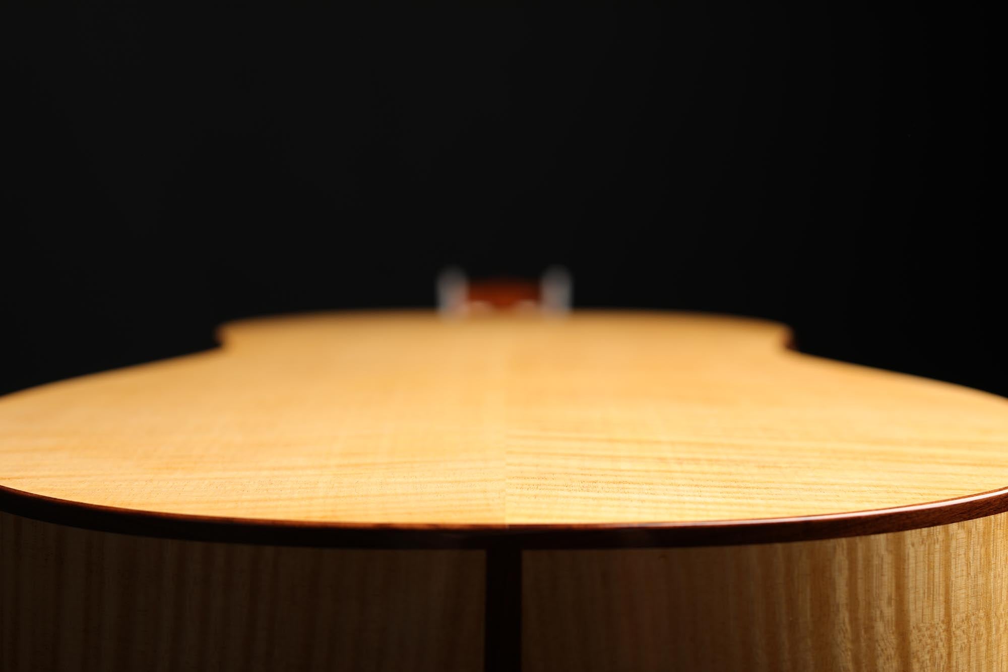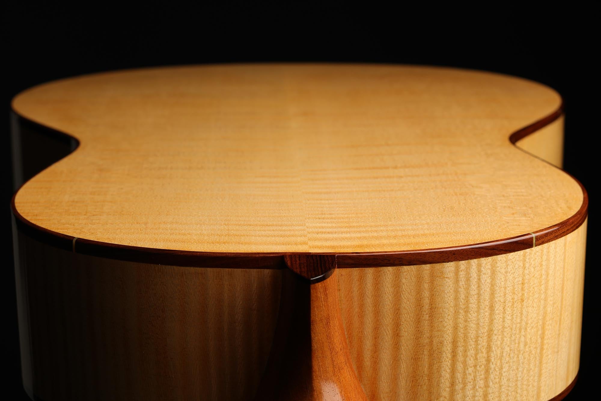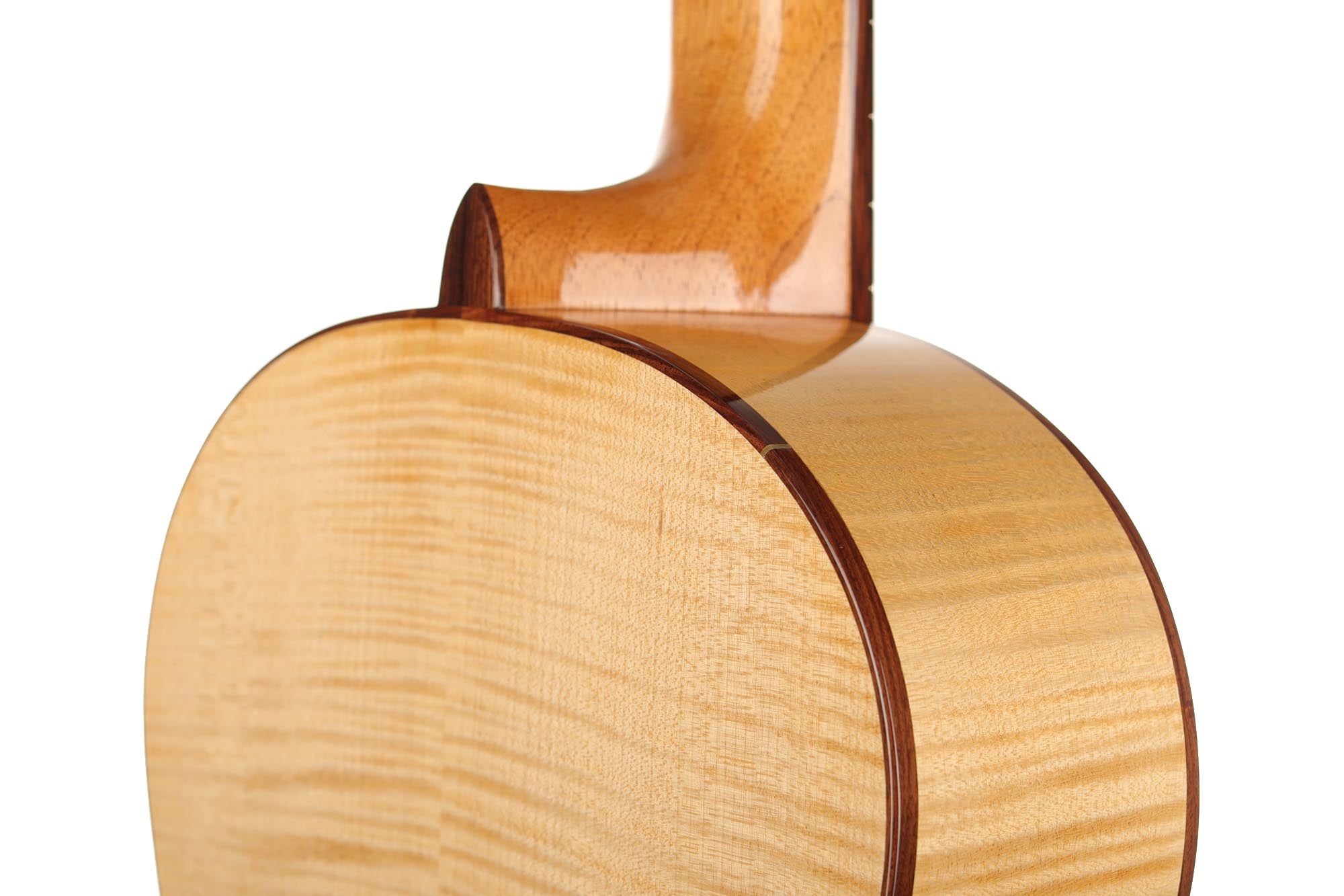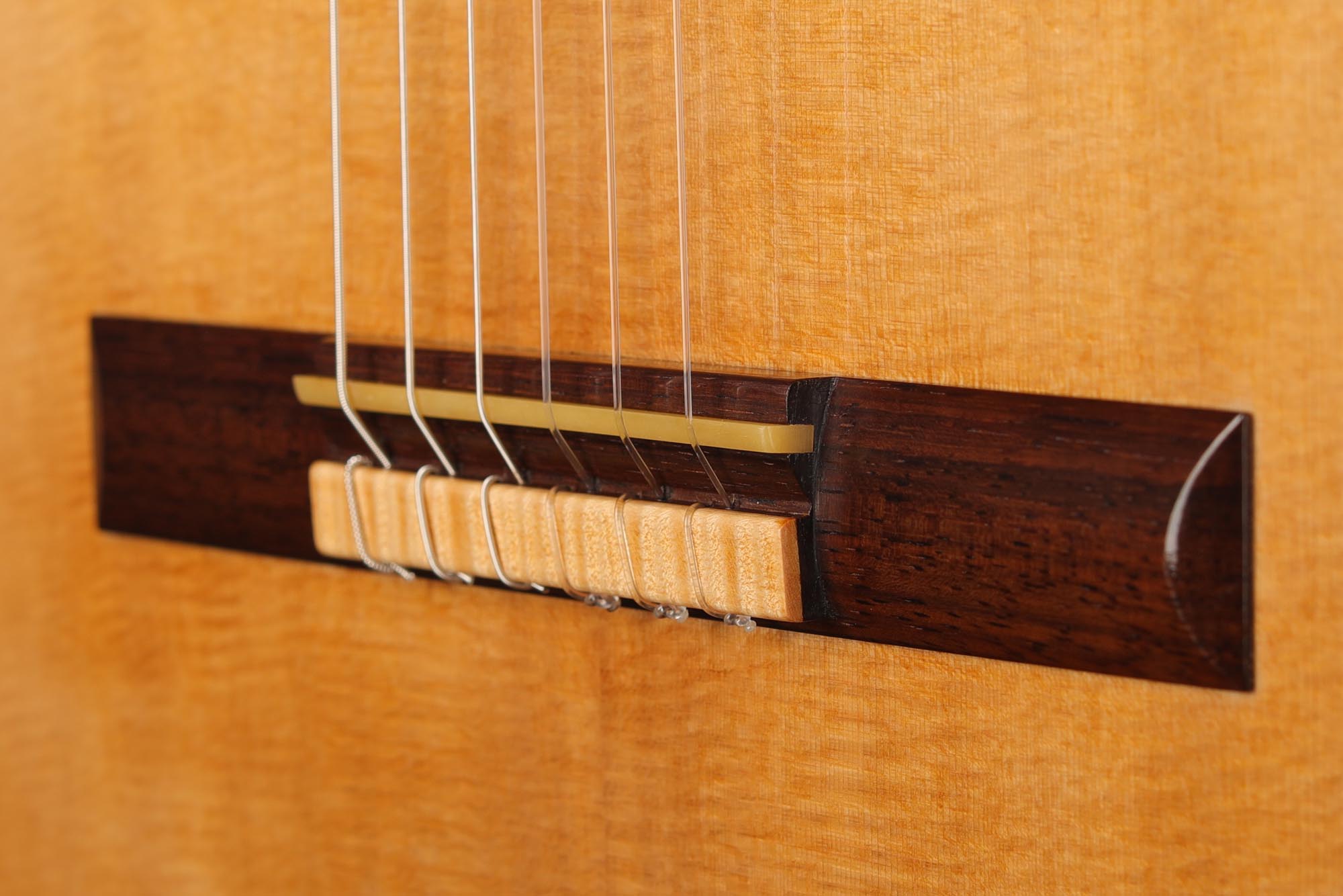This beautiful guitar built-in 2020 comes straight from Michael Brey's workshop. It has a very charming design with an alpine spruce top and a maple back and sides. This instrument shows abundant small marquetry details that make it a really charming guitar. The rosette, for example, is a subtle combination of wood fillets in contrasting colors and fine inlays. The guitar has a very appealing warm sound, with clear trebles and well-supporting basses. Thanks to the 64.4 cm scale length and the slightly narrower saddle, this instrument is very easy to play and is both dynamic and sensitive. It is surprisingly powerful in sound and the somewhat small shape of this guitar gives a real feeling of control over the instrument. Due to the easy to find voice colors this Michael Brey guitar offers a wide range of possibilities. Thus it is altogether a comfortable and very versatile classical guitar.