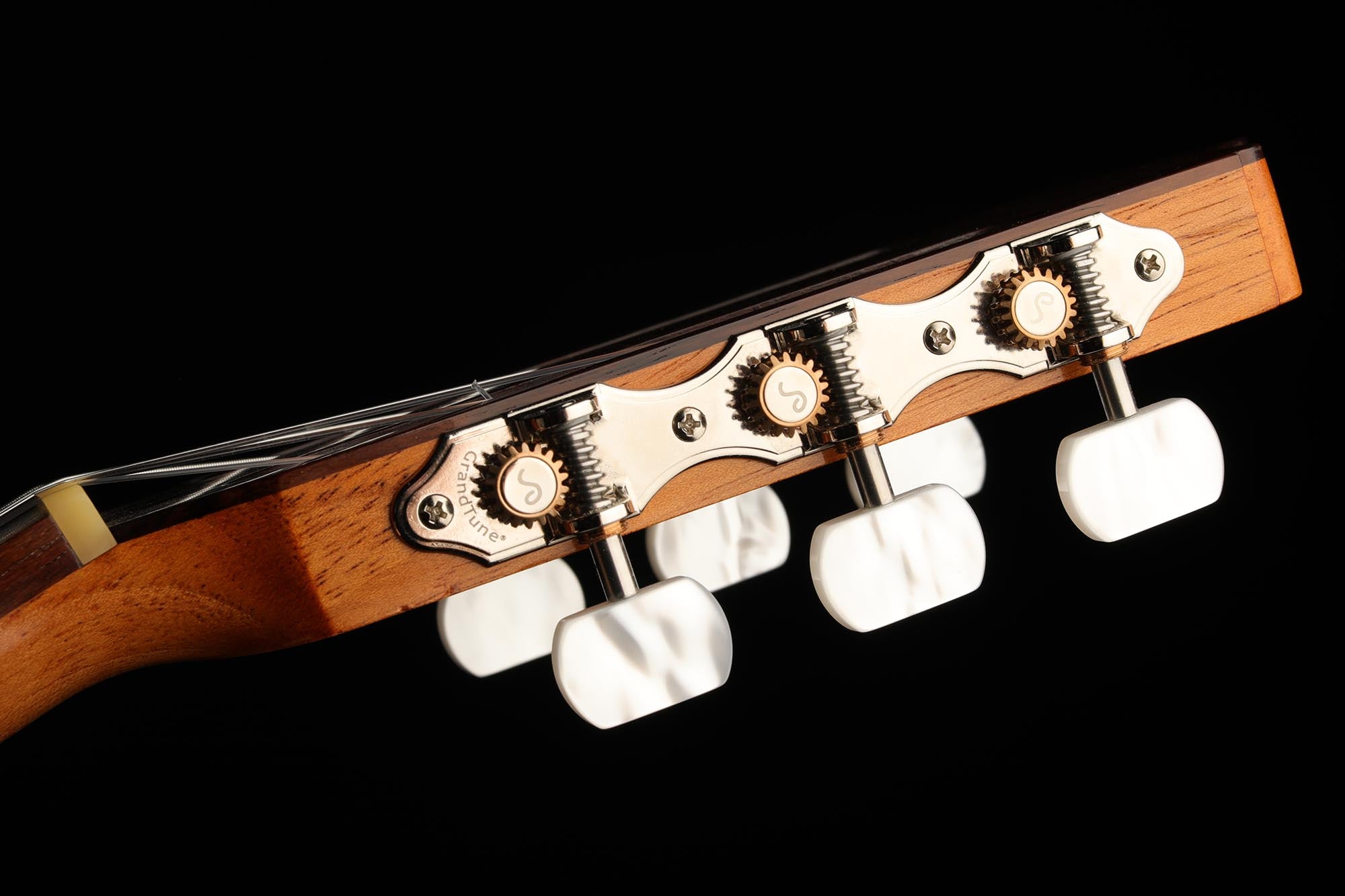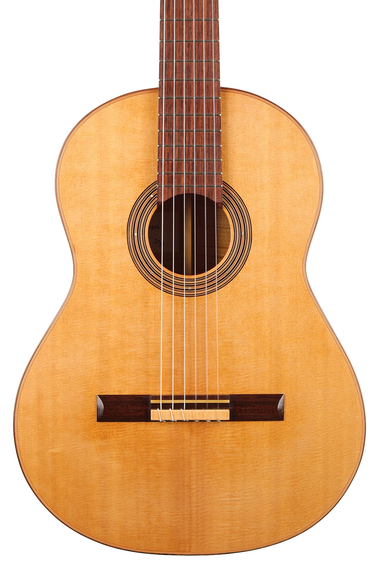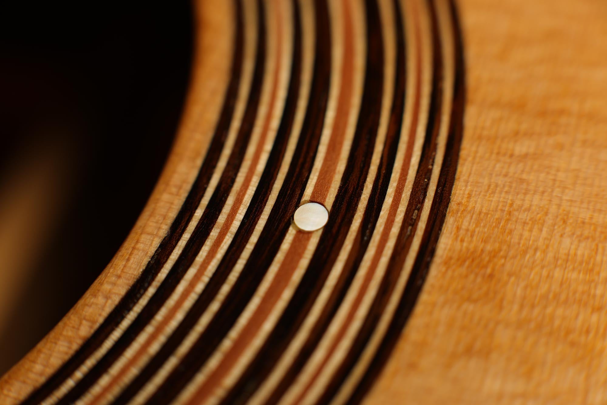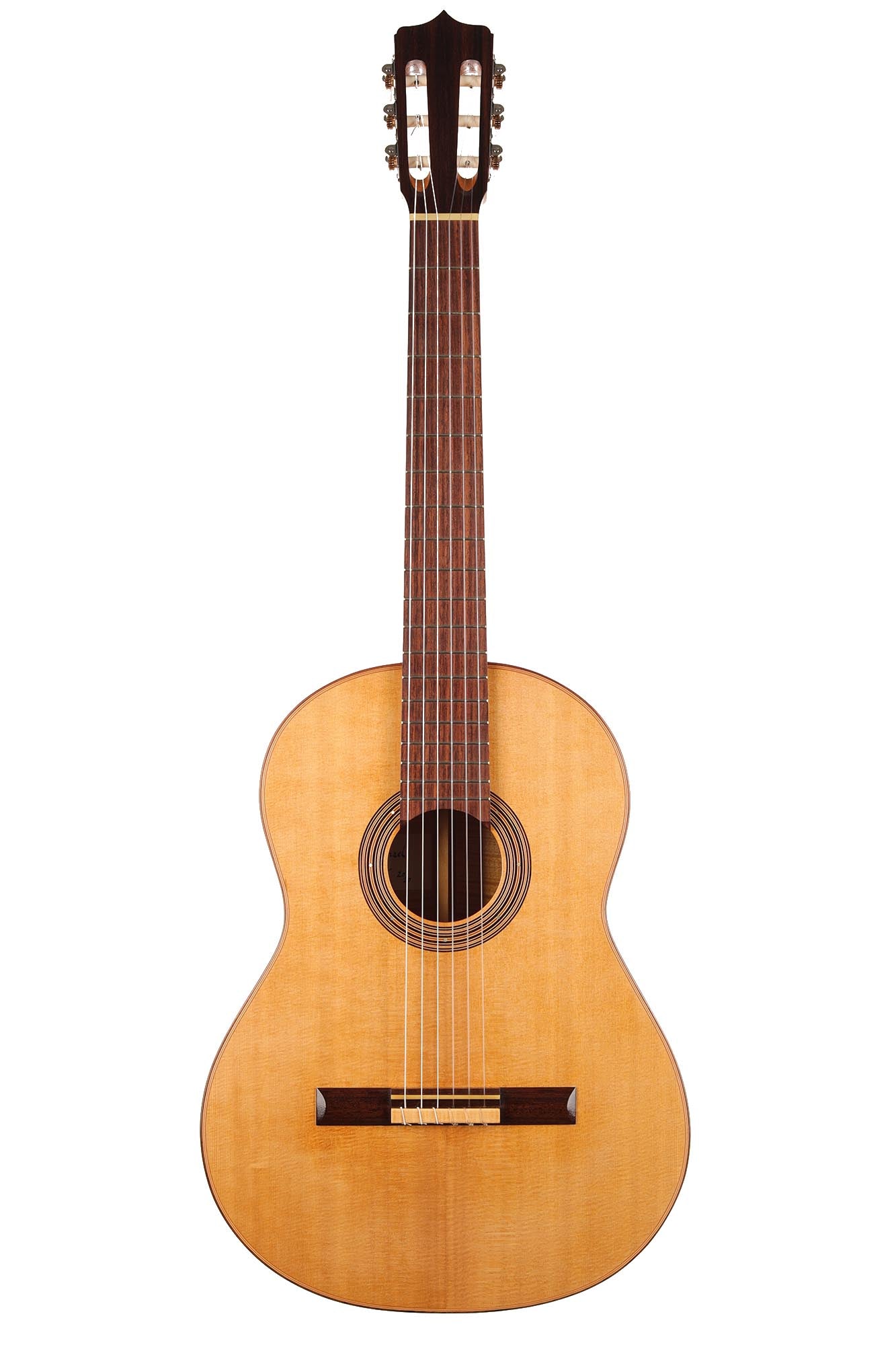 This beautiful guitar built-in 2020 comes straight from Michael Brey's workshop. It has a very charming design with an alpine spruce top and a maple back and sides. This instrument shows abundant small marquetry details that make it a really charming guitar. The rosette, for example, is a subtle combination of wood fillets in contrasting colors and fine inlays. The guitar has a very appealing warm sound, with clear trebles and well-supporting basses. Thanks to the 64.4 cm scale length and the slightly narrower saddle, this instrument is very easy to play and is both dynamic and sensitive. It is surprisingly powerful in sound and the somewhat small shape of this guitar gives a real feeling of control over the instrument. Due to the easy to find voice colors this Michael Brey guitar offers a wide range of possibilities. Thus it is altogether a comfortable and very versatile classical guitar.
