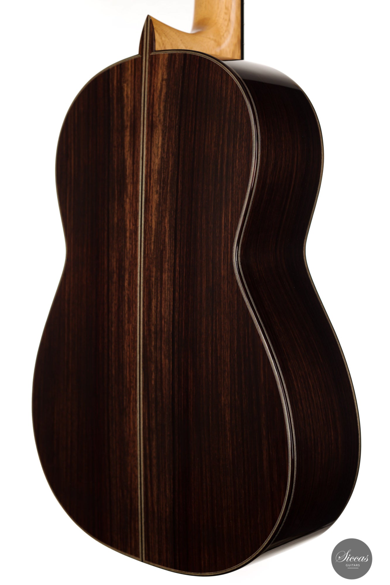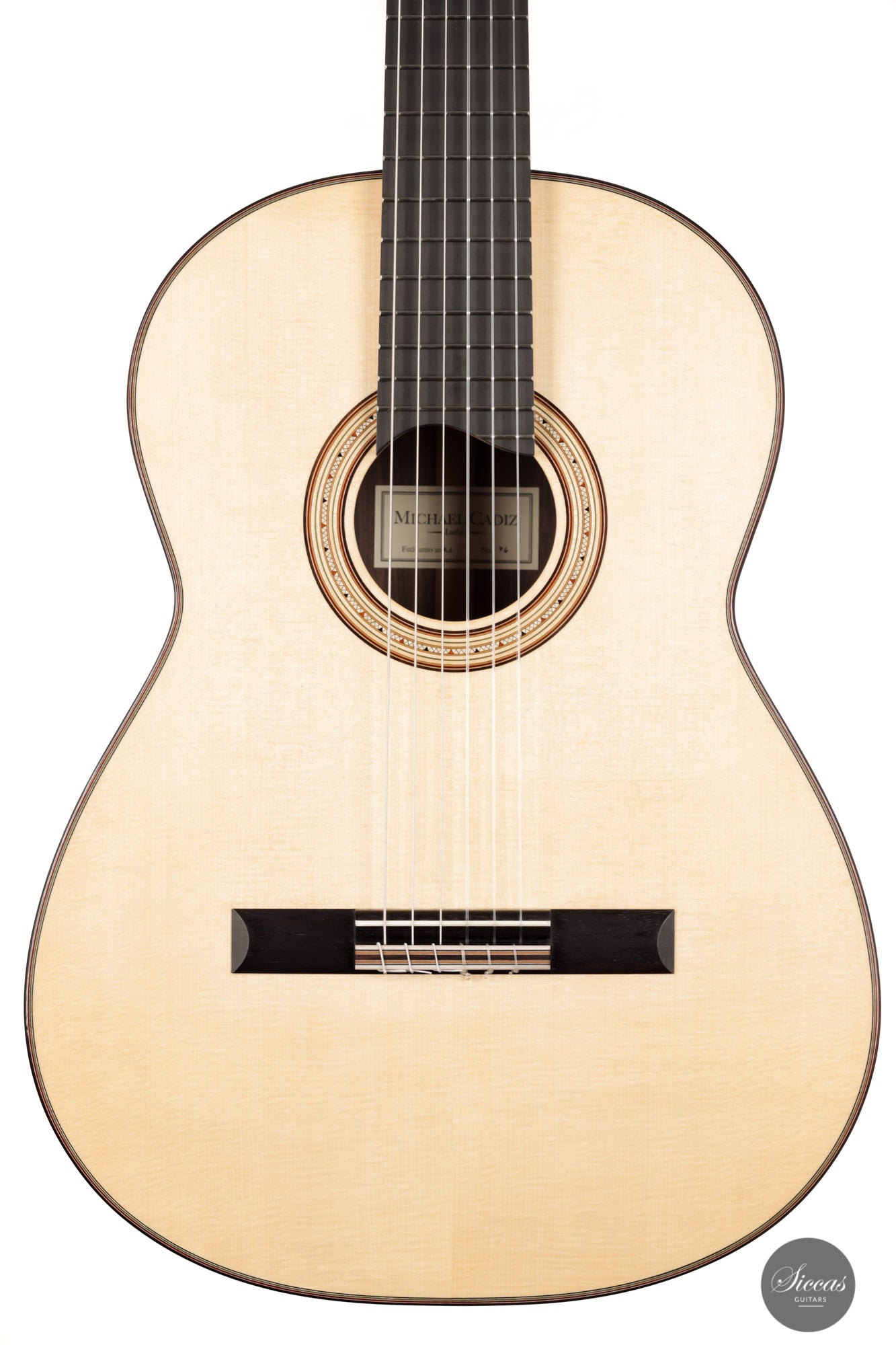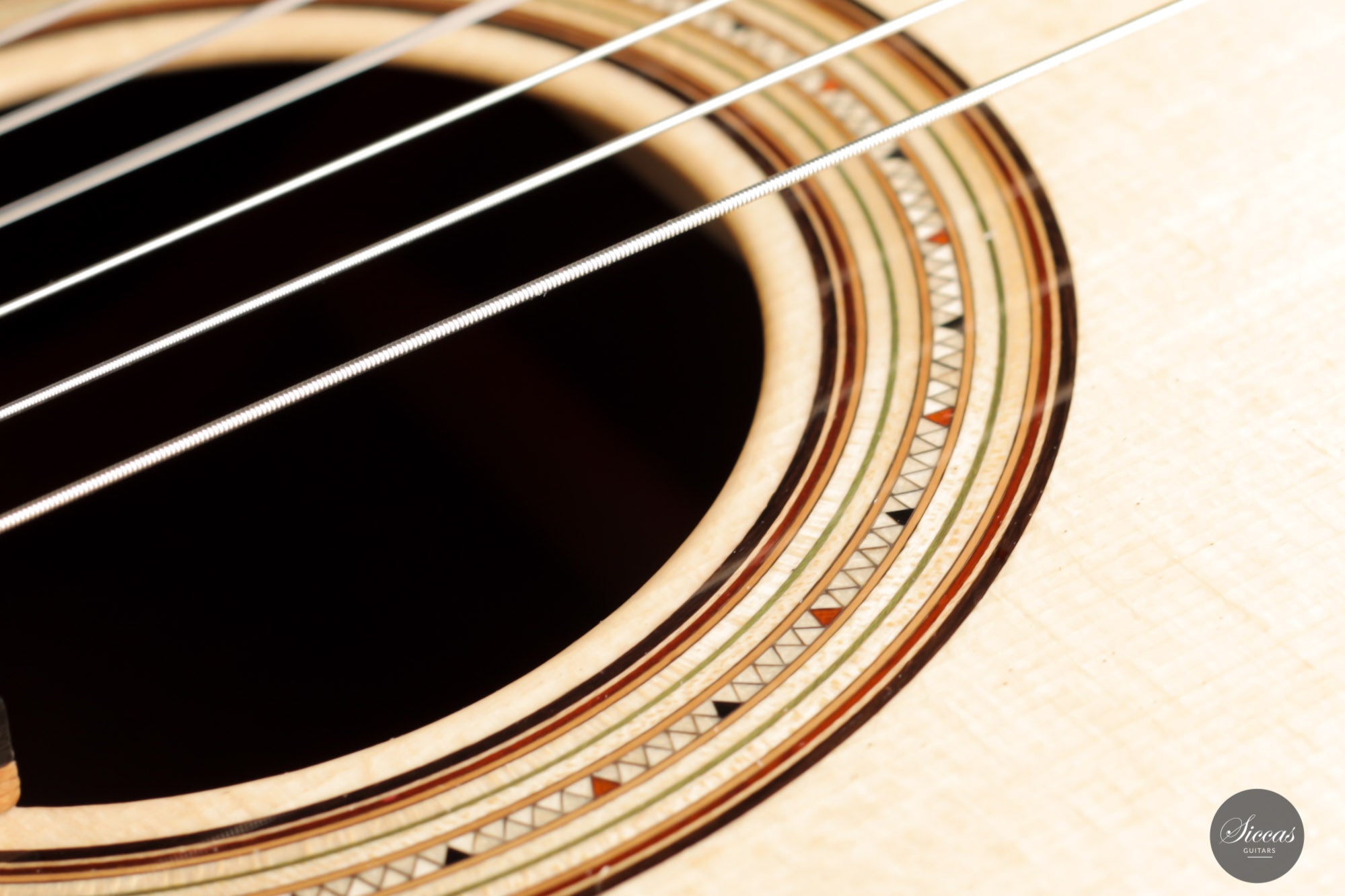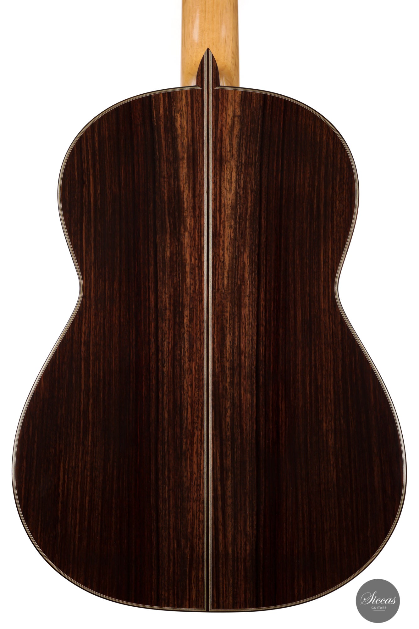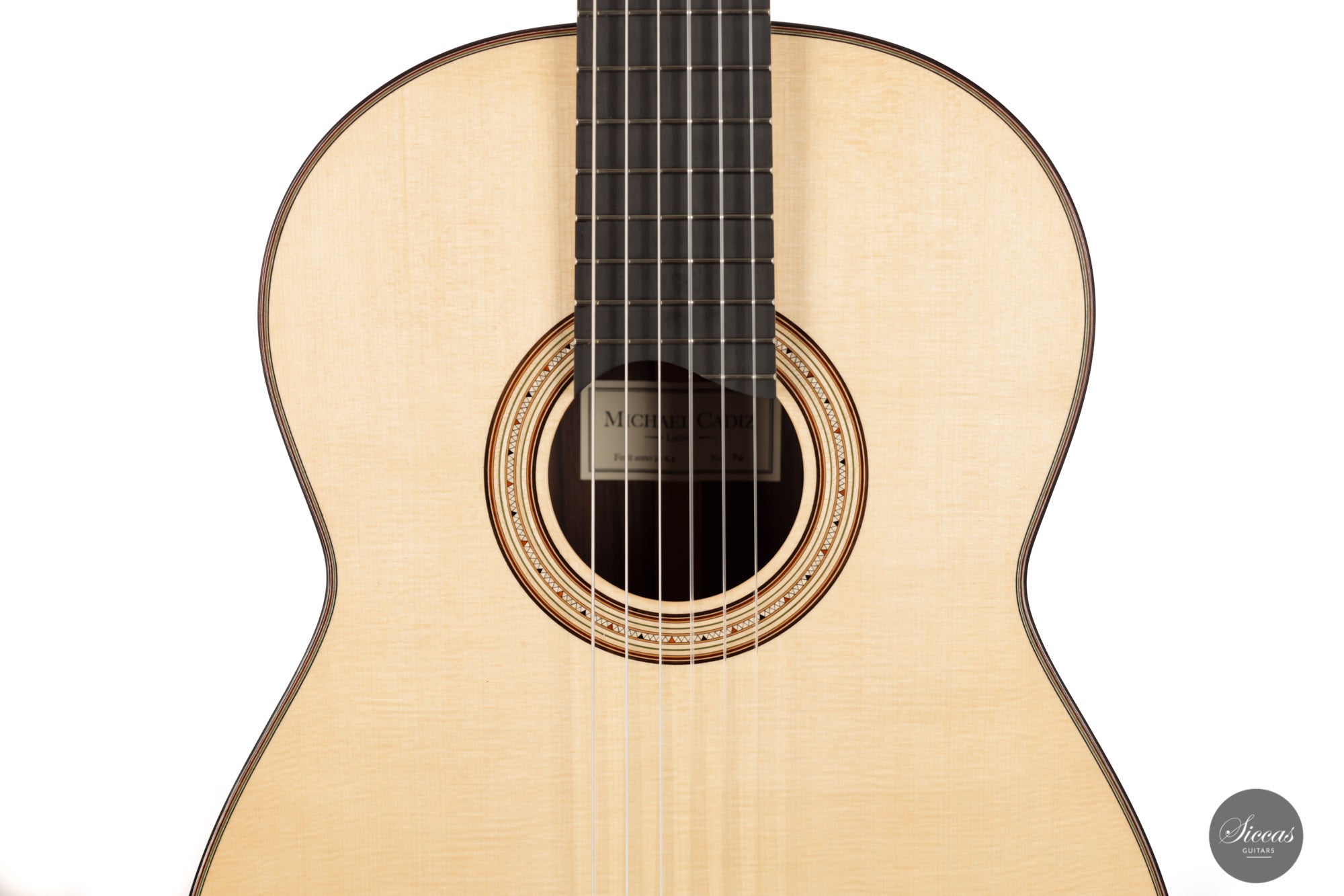 This guitar is simply beautiful. It displays a new variation of Michael's signature rosette, with thinly worked marquetry in a light-colored spectrum. Moreover, the Indian rosewood used for the back and sides stands out for its intense orange and red veins. With this instrument, Michael Cadiz achieves impressive timbres and a striking immediacy in tone production, making it an excellent traditional classical guitar. Additionally, the playability is superb, both due to the slightly shorter scale length of 64 cm and thanks to the raised fingerboard and perfect setup.