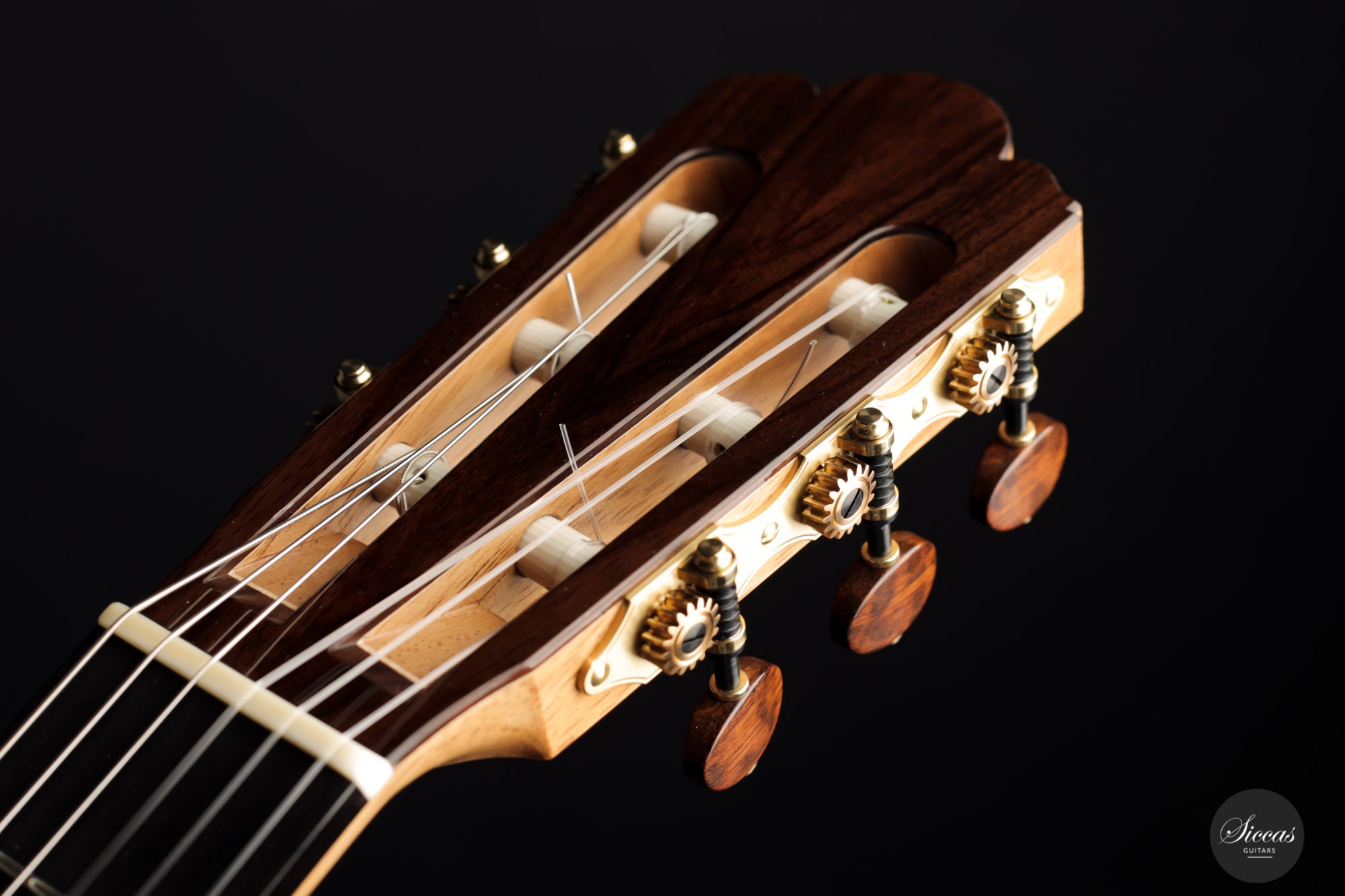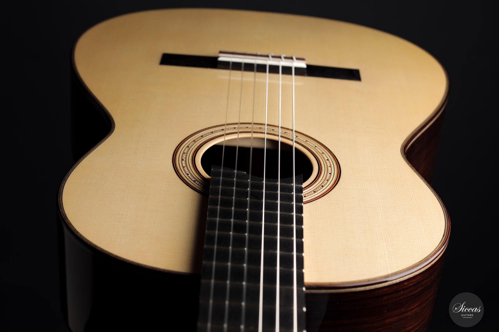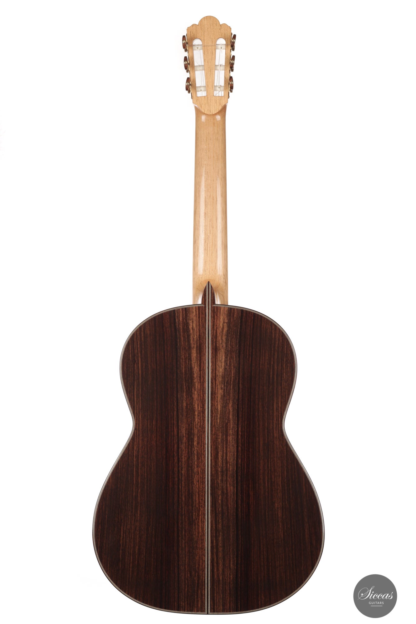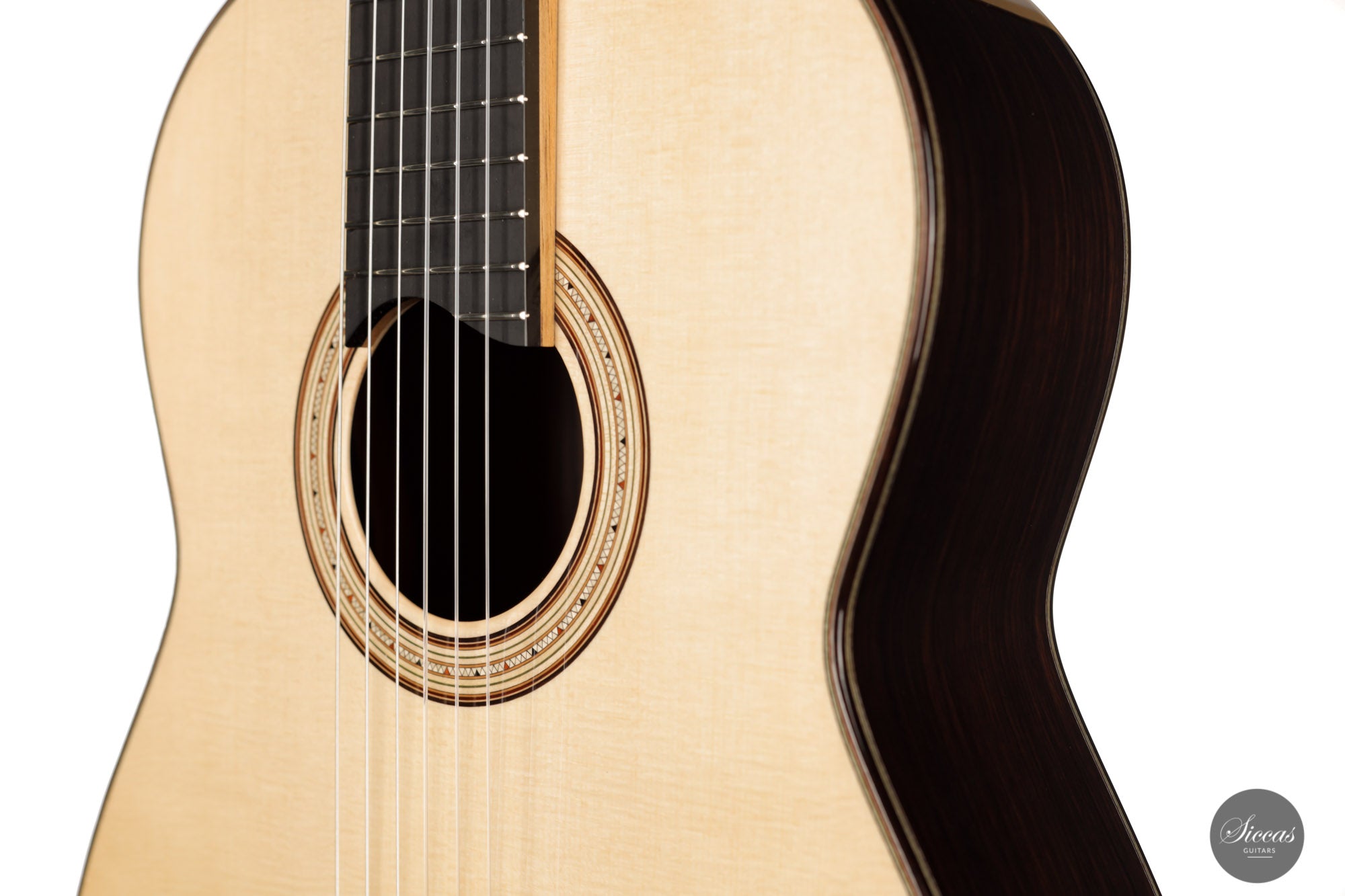 This guitar is simply beautiful. It displays a new variation of Michael's signature rosette, with thinly worked marquetry in a light-colored spectrum. Moreover, the Indian rosewood used for the back and sides stands out for its intense orange and red veins. With this instrument, Michael Cadiz achieves impressive timbres and a striking immediacy in tone production, making it an excellent traditional classical guitar. Additionally, the playability is superb, both due to the slightly shorter scale length of 64 cm and thanks to the raised fingerboard and perfect setup.