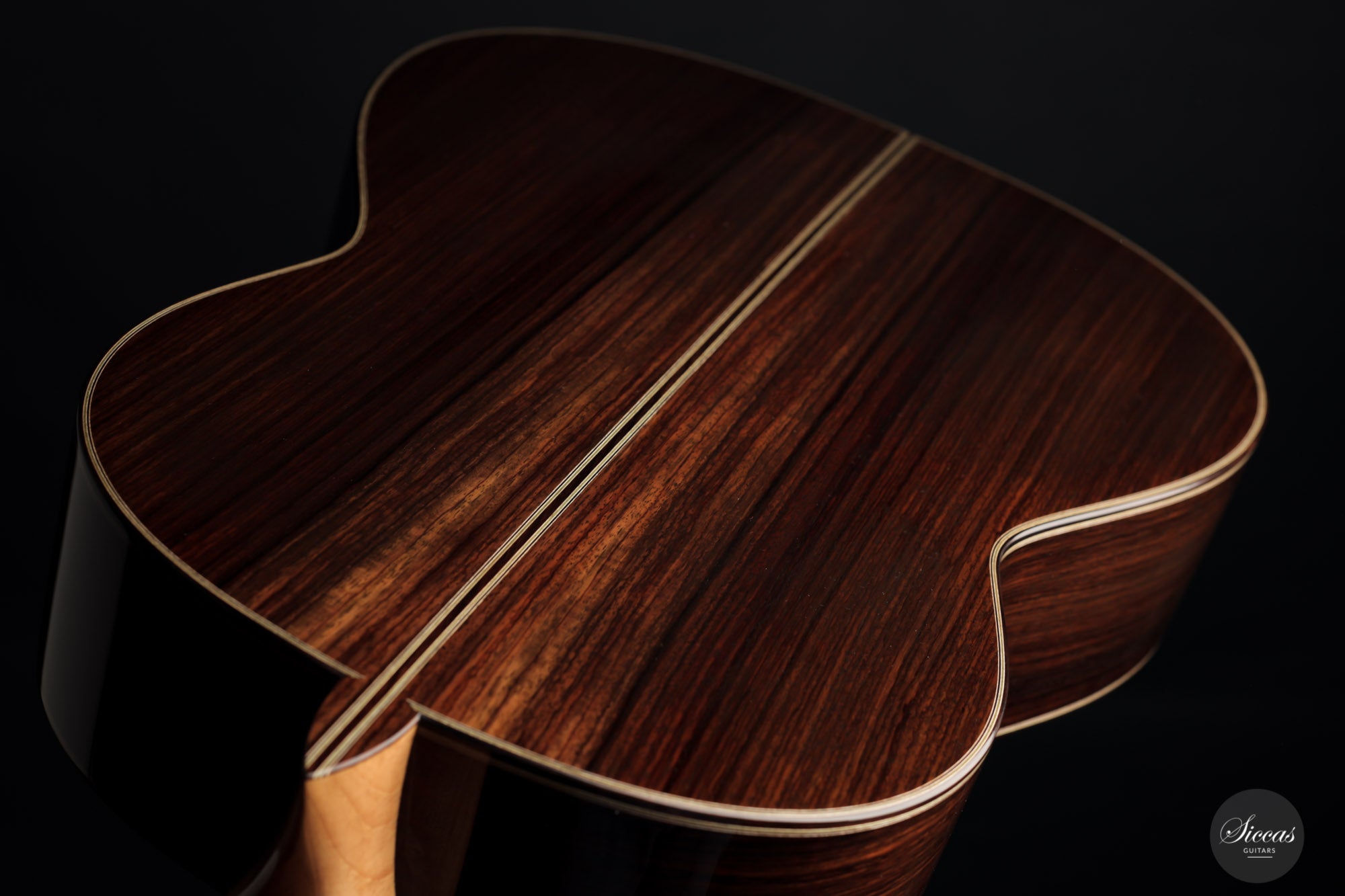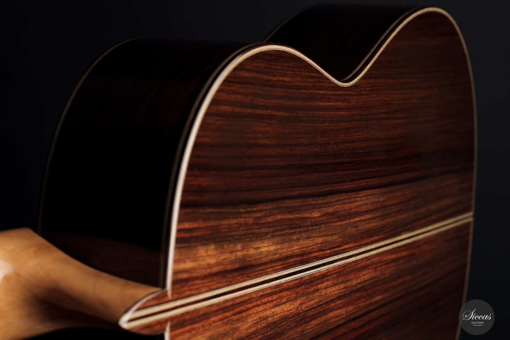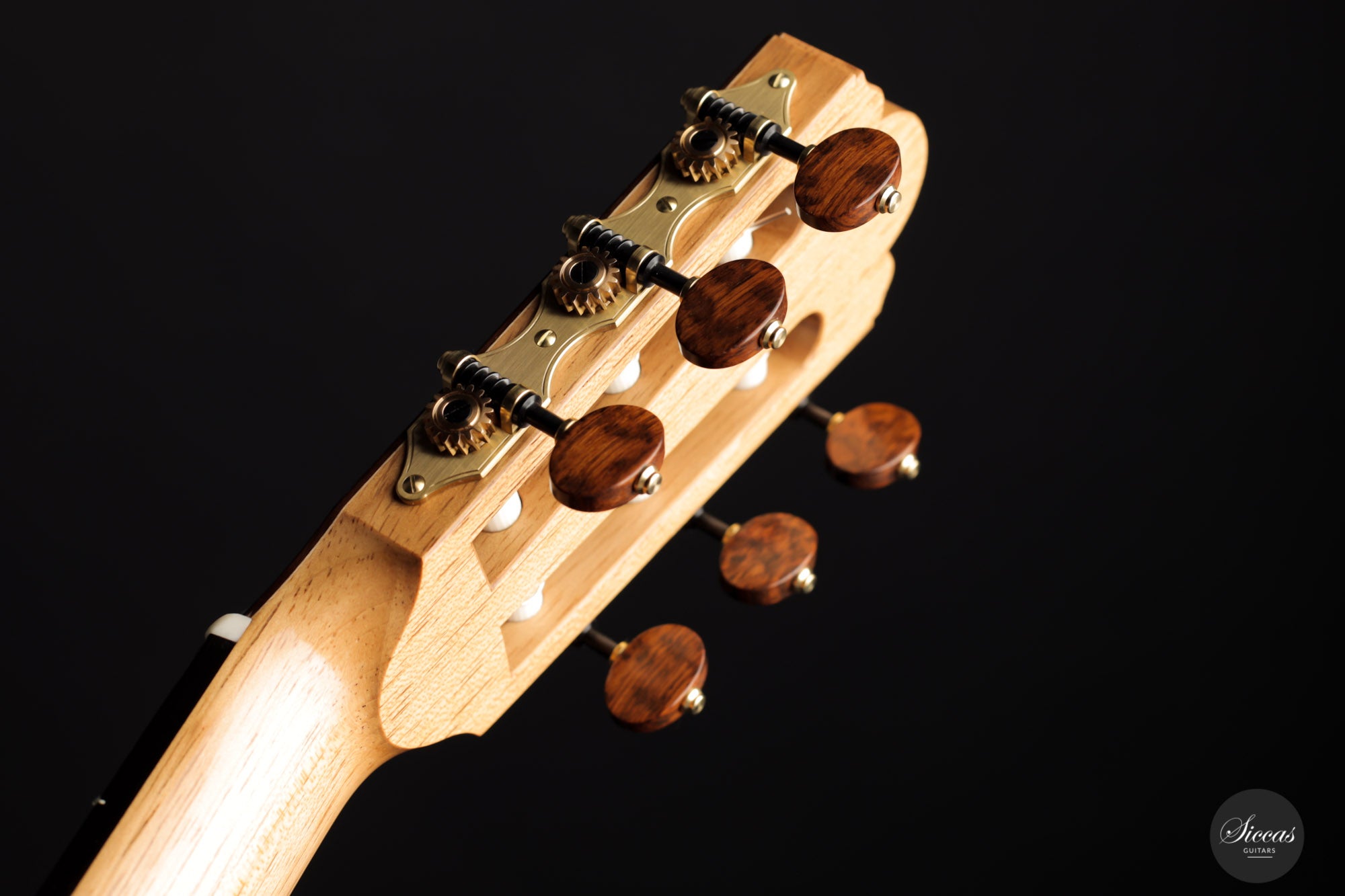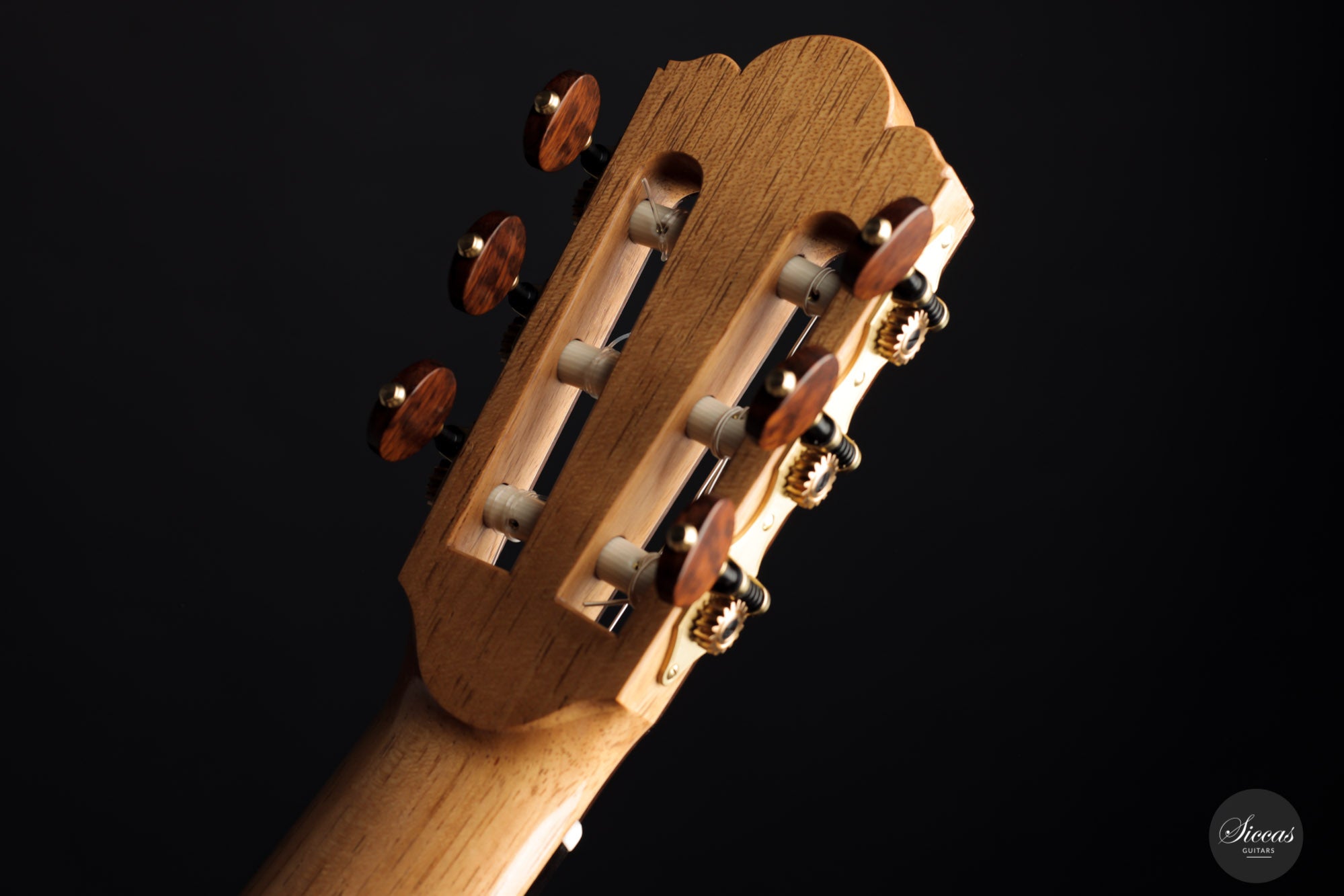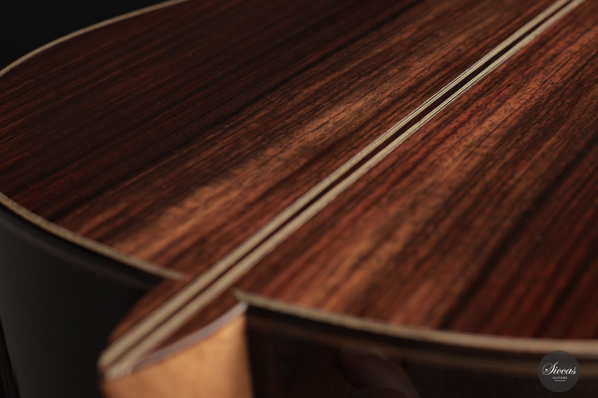 This guitar is simply beautiful. It displays a new variation of Michael's signature rosette, with thinly worked marquetry in a light-colored spectrum. Moreover, the Indian rosewood used for the back and sides stands out for its intense orange and red veins. With this instrument, Michael Cadiz achieves impressive timbres and a striking immediacy in tone production, making it an excellent traditional classical guitar. Additionally, the playability is superb, both due to the slightly shorter scale length of 64 cm and thanks to the raised fingerboard and perfect setup.