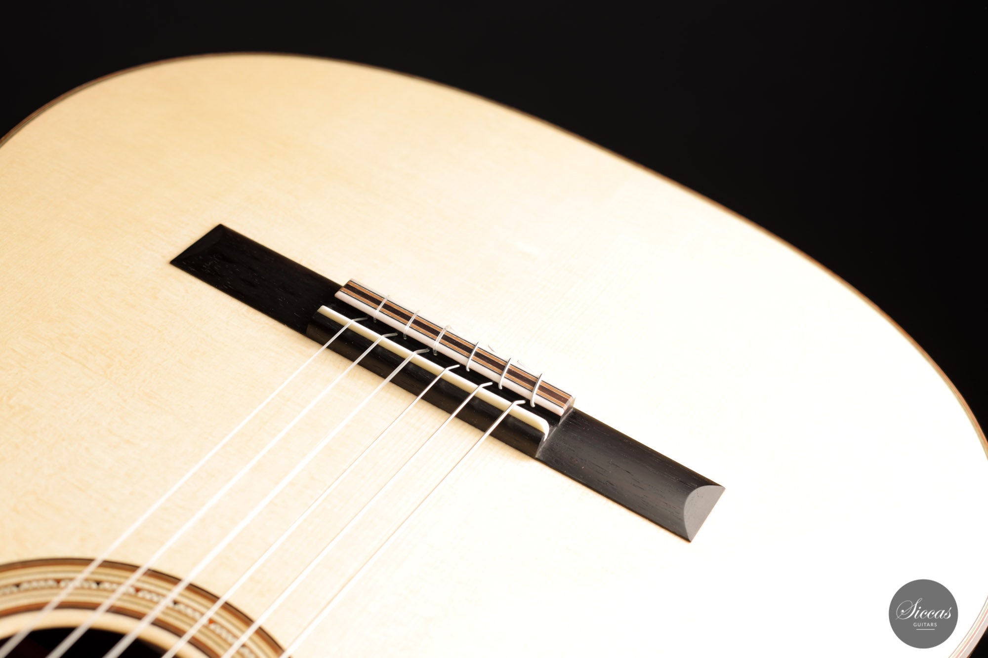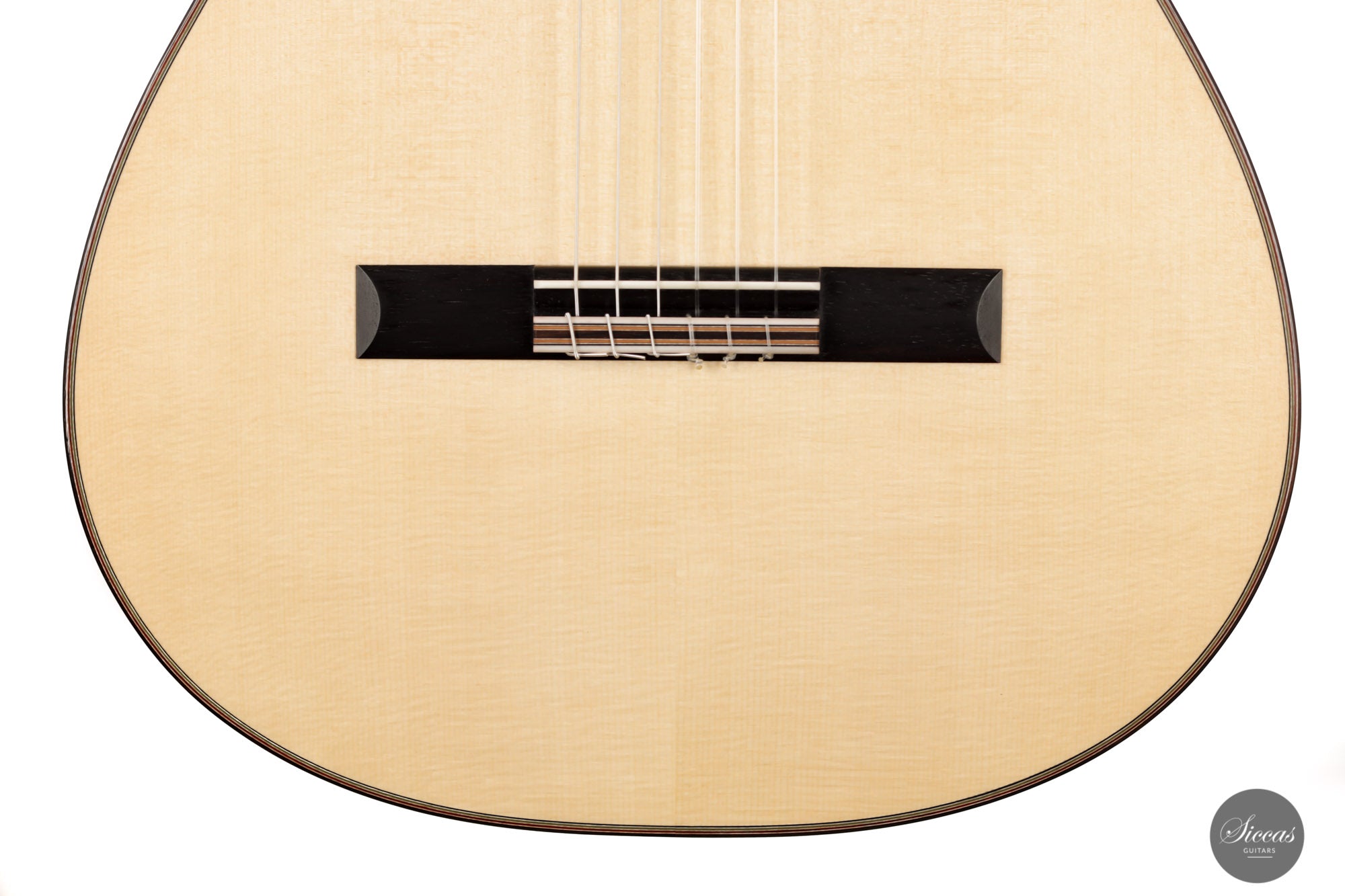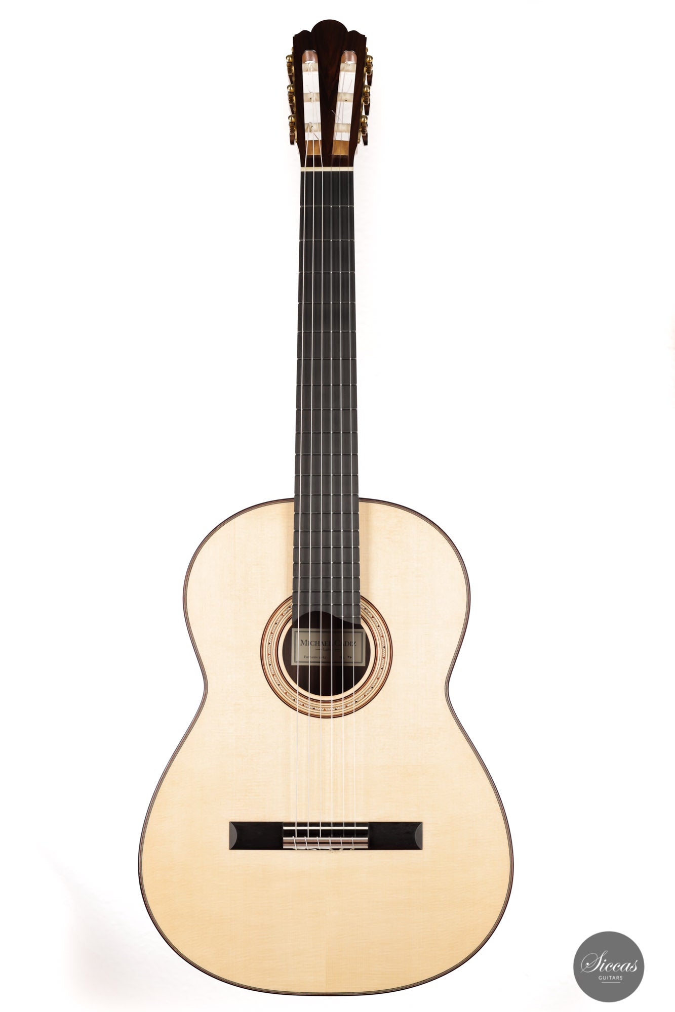 “My Modern Concert model is by most definitions these days. It is constructed using hide glue and a relatively conservative seven fan system and few cross struts. It is my attempt to reconcile the allure of late-nineteenth-century Spanish instruments with the higher tension, body, projection, and evenness that many modern guitarists are looking for. These guitars have a good dynamic range, variety of timbres, clarity, and balance. Like my other guitars, the voice is still quite traditional, though perhaps a bit more in the direction of the mid-twentieth-century. It is become more and more my aim to achieve a clear and even frequency response that can be heard well in hall without being encumbered by excessive mid frequencies. I like to maintain a low enough body resonance so that one feels the traditional bloom and support in the basses, but a slightly stiffer overall construction to bring a bit more evenness and headroom to the instrument overall.”