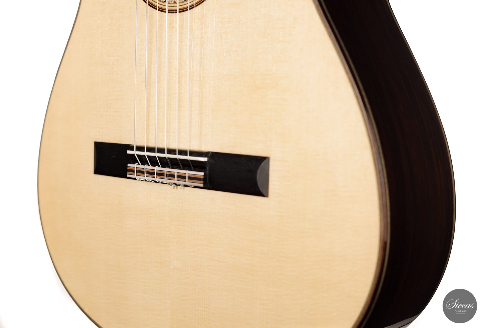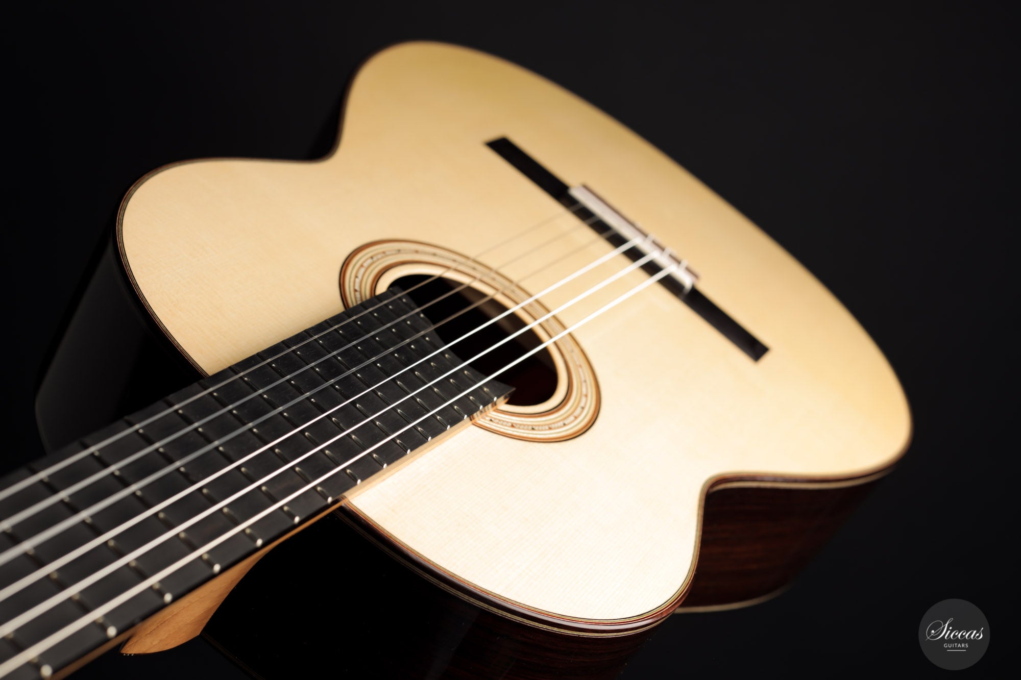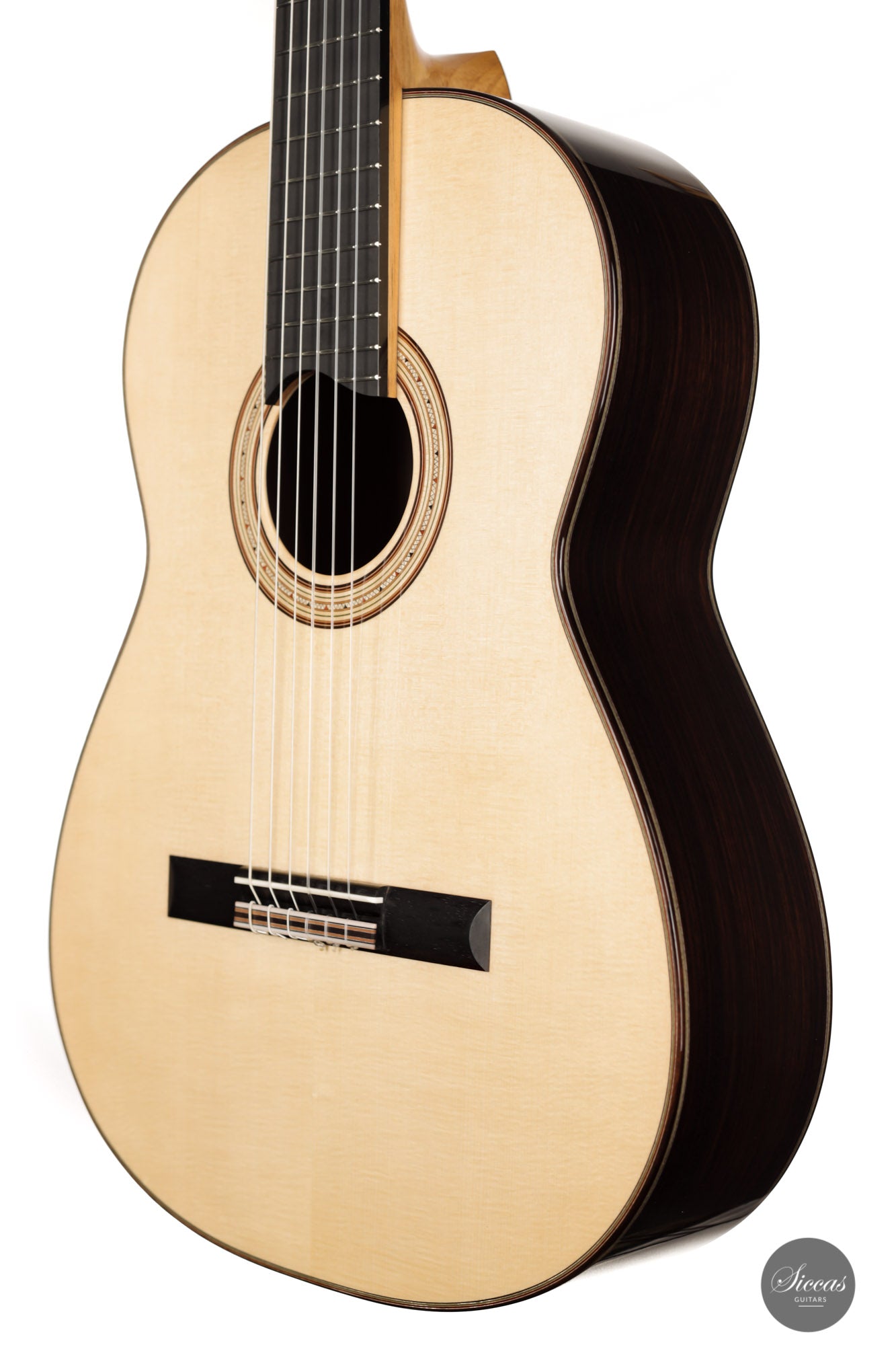 “My Modern Concert model is by most definitions these days. It is constructed using hide glue and a relatively conservative seven fan system and few cross struts. It is my attempt to reconcile the allure of late-nineteenth-century Spanish instruments with the higher tension, body, projection, and evenness that many modern guitarists are looking for. These guitars have a good dynamic range, variety of timbres, clarity, and balance. Like my other guitars, the voice is still quite traditional, though perhaps a bit more in the direction of the mid-twentieth-century. It is become more and more my aim to achieve a clear and even frequency response that can be heard well in hall without being encumbered by excessive mid frequencies. I like to maintain a low enough body resonance so that one feels the traditional bloom and support in the basses, but a slightly stiffer overall construction to bring a bit more evenness and headroom to the instrument overall.”