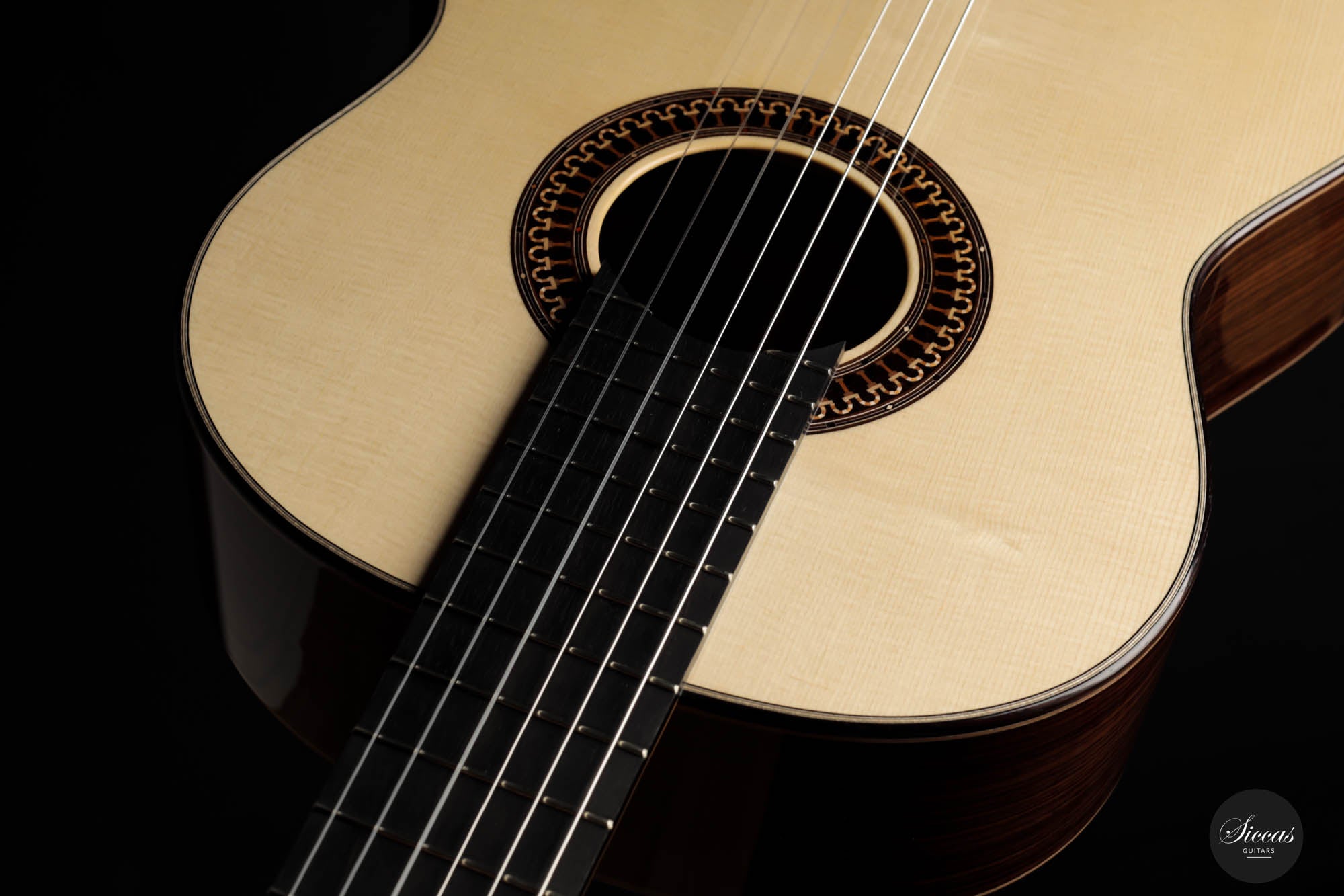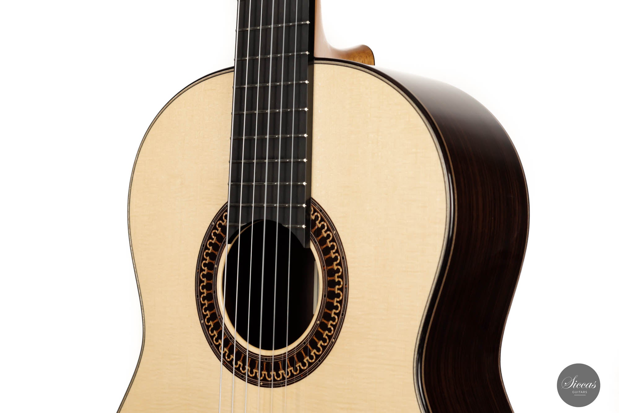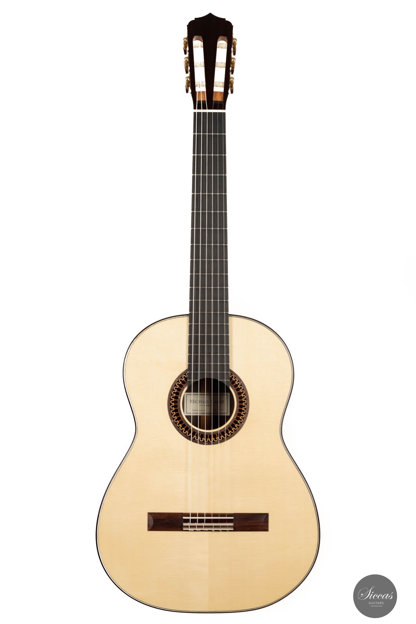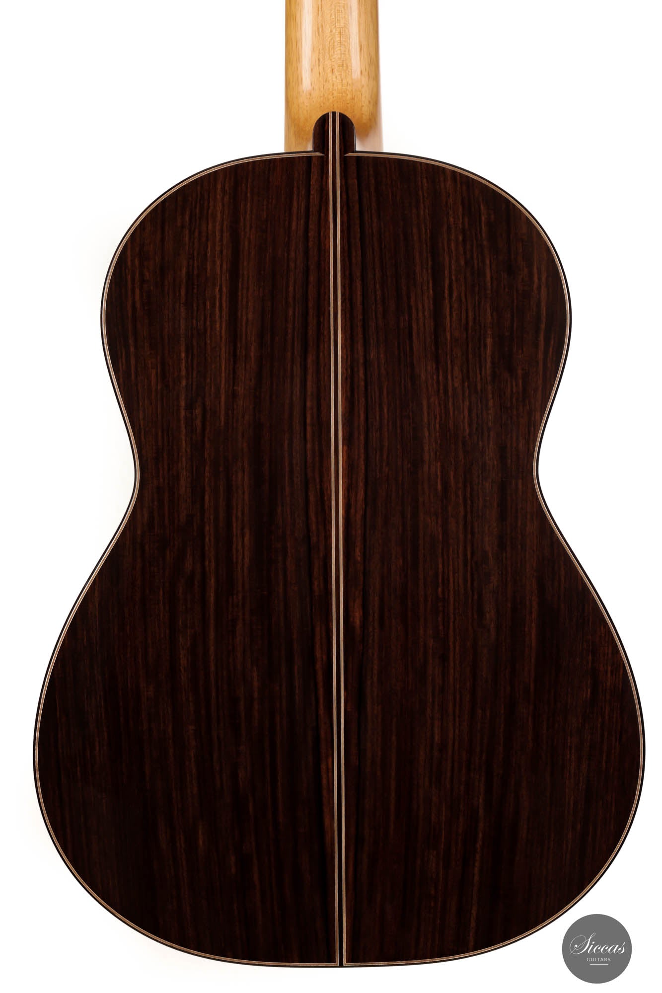 This traditionally built guitar has a highest-grade spruce soundboard and Indian rosewood back and sides, built to a very high level of craftsmanship. Moreover, the trebles of this guitar are breathtaking. Michael has successfully nailed the most challenging part of guitar-making: the trebles. Furthermore, as a result of its F# primary body resonance, the airy and direct basses complement the overall voicing of the instrument. The subtlety of the sound colors and the timelessness of its timbre places this guitar easily at the highest level of contemporary lutherie.