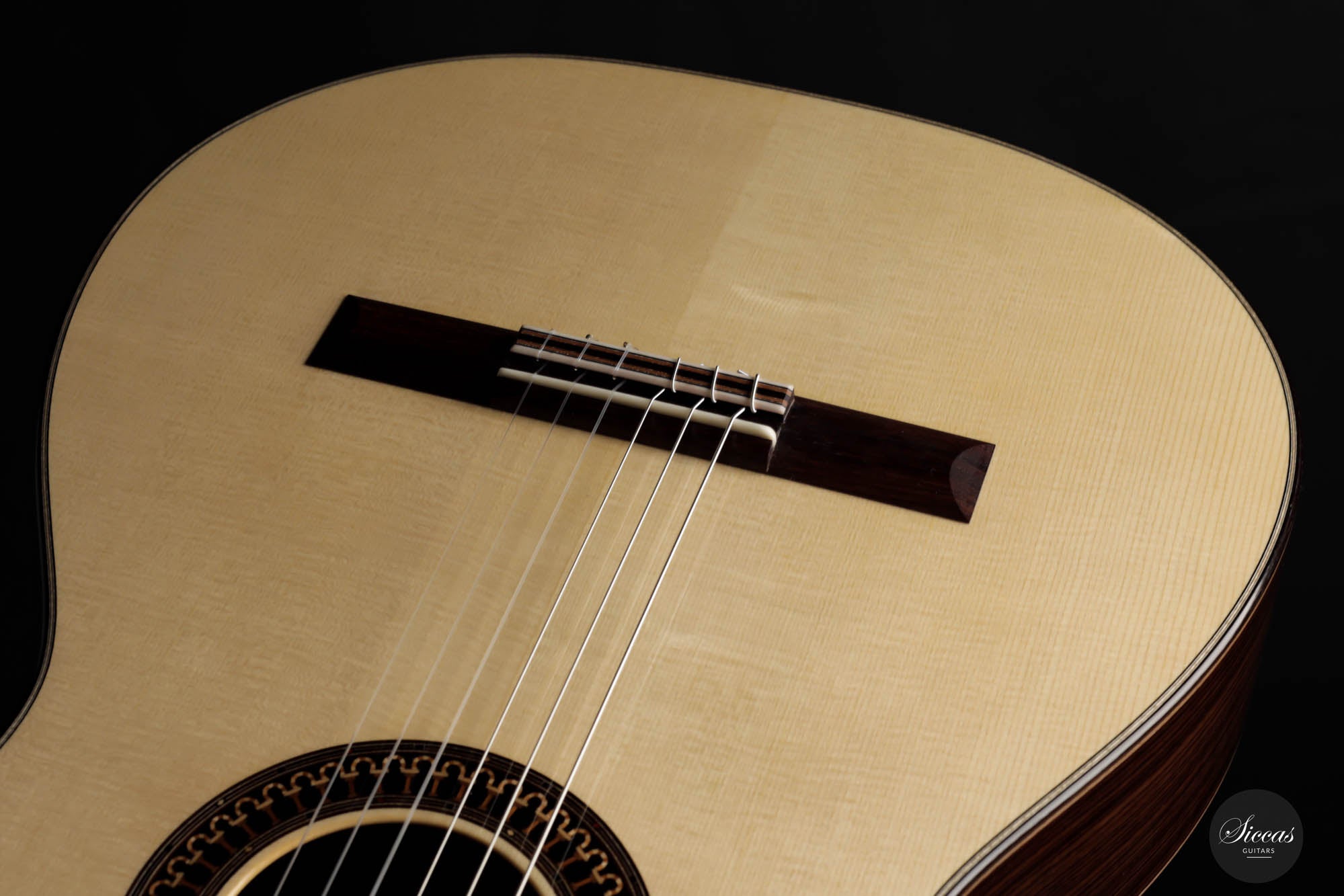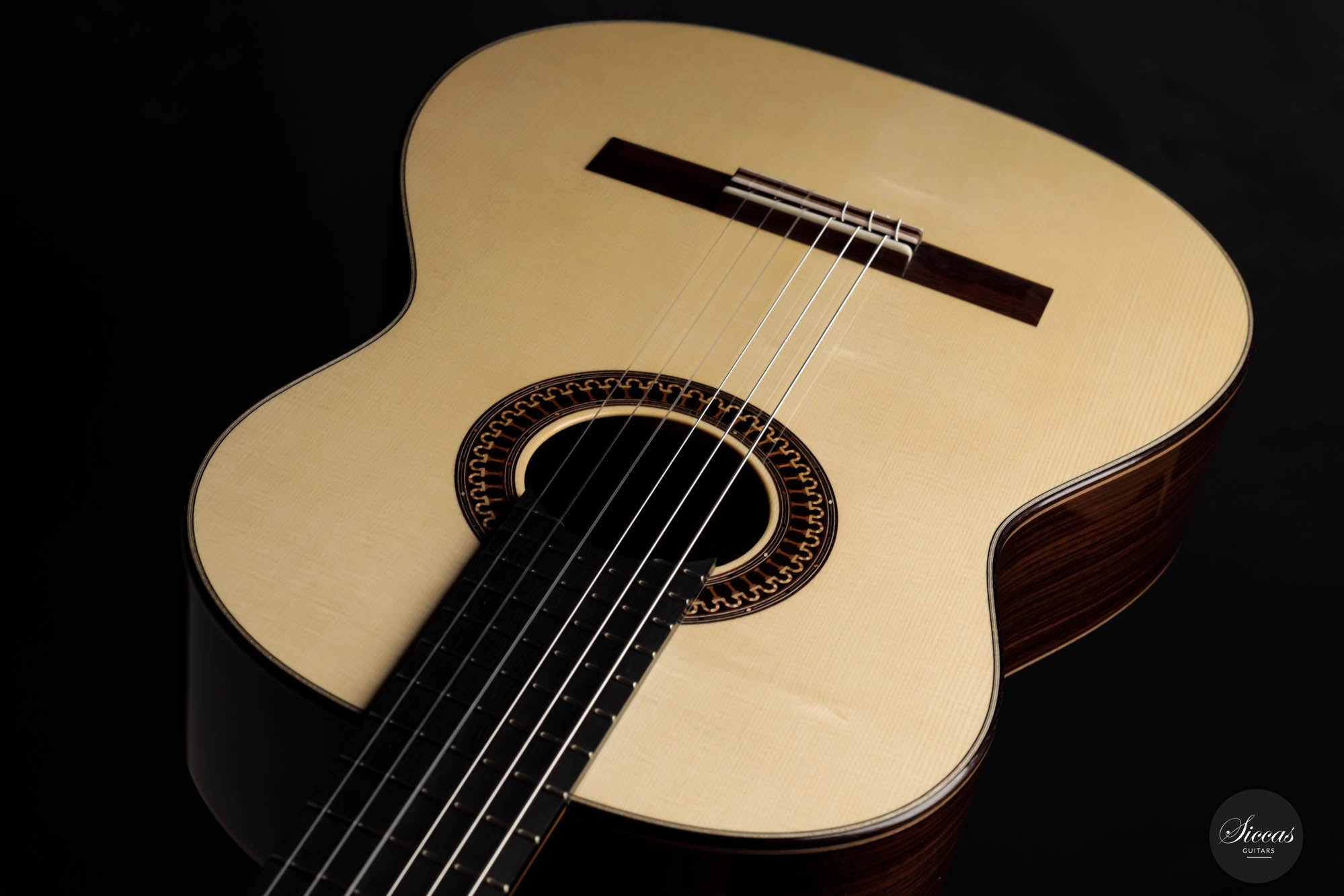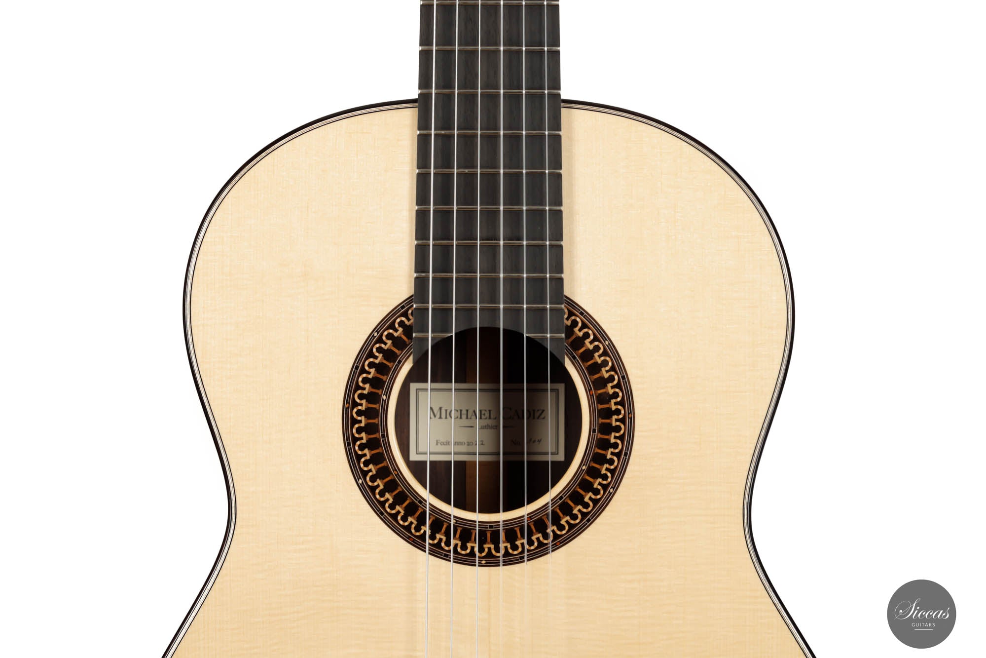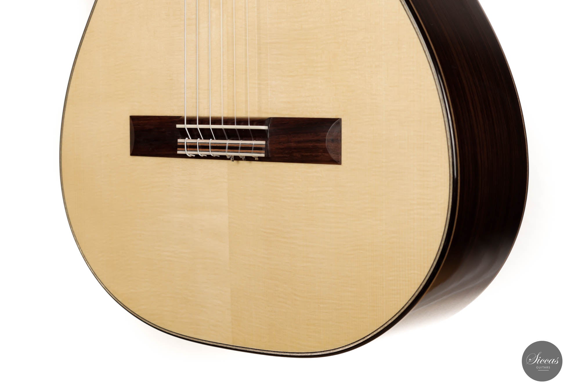 This traditionally built guitar has a highest-grade spruce soundboard and Indian rosewood back and sides, built to a very high level of craftsmanship. Moreover, the trebles of this guitar are breathtaking. Michael has successfully nailed the most challenging part of guitar-making: the trebles. Furthermore, as a result of its F# primary body resonance, the airy and direct basses complement the overall voicing of the instrument. The subtlety of the sound colors and the timelessness of its timbre places this guitar easily at the highest level of contemporary lutherie.