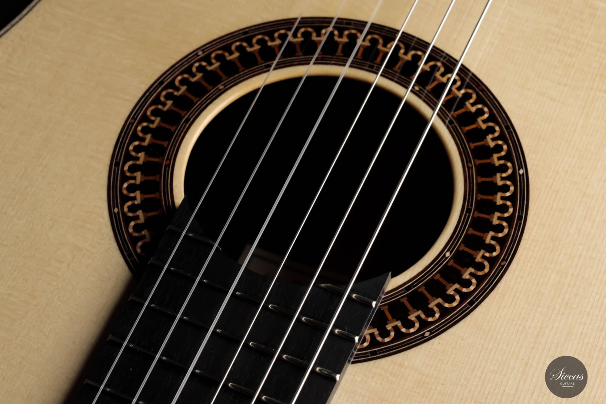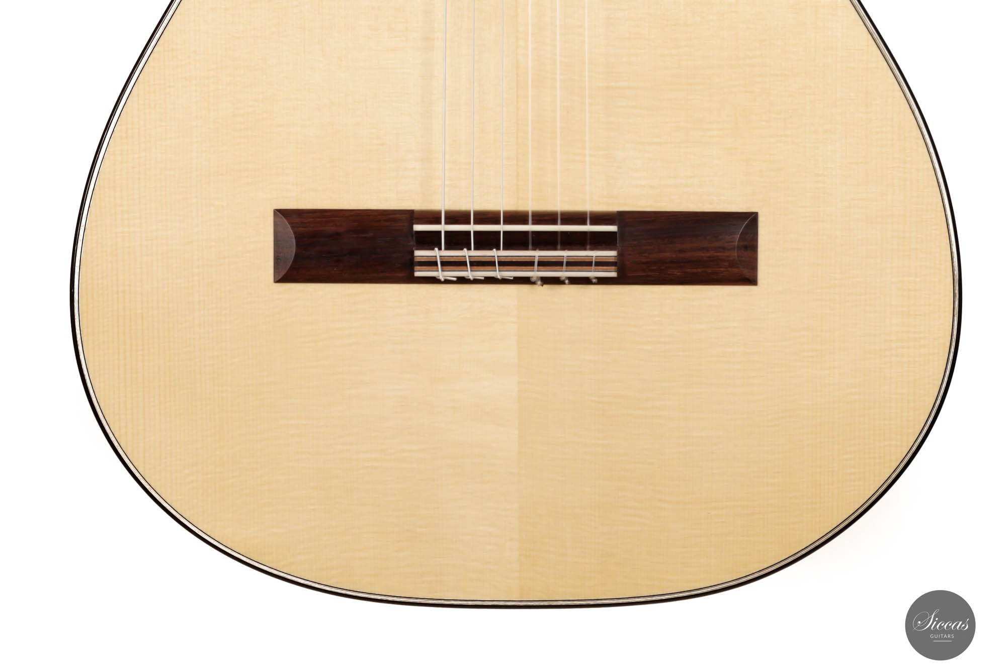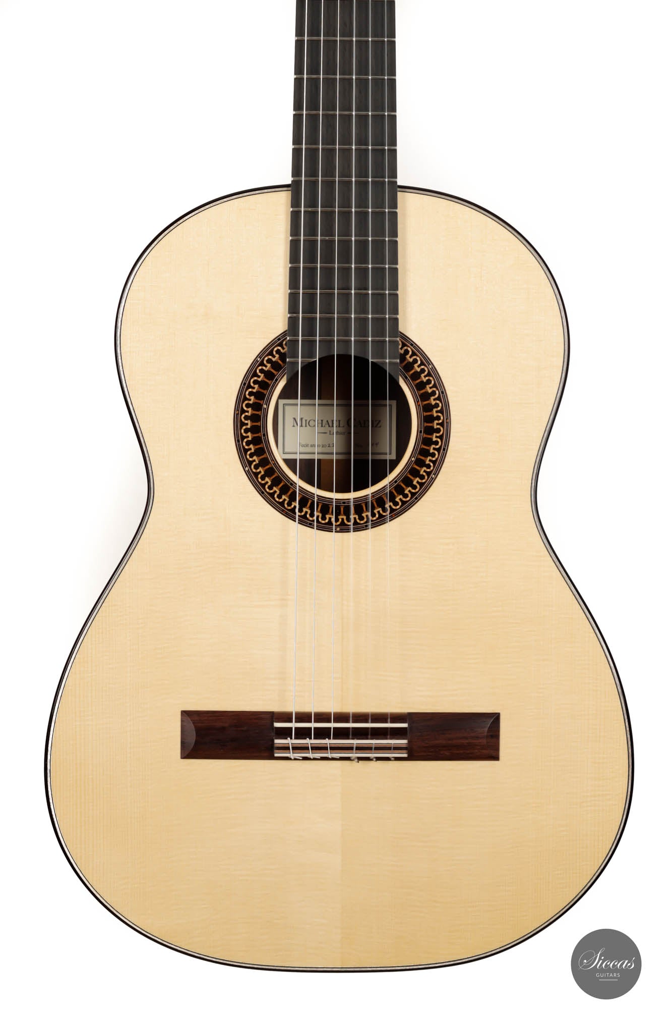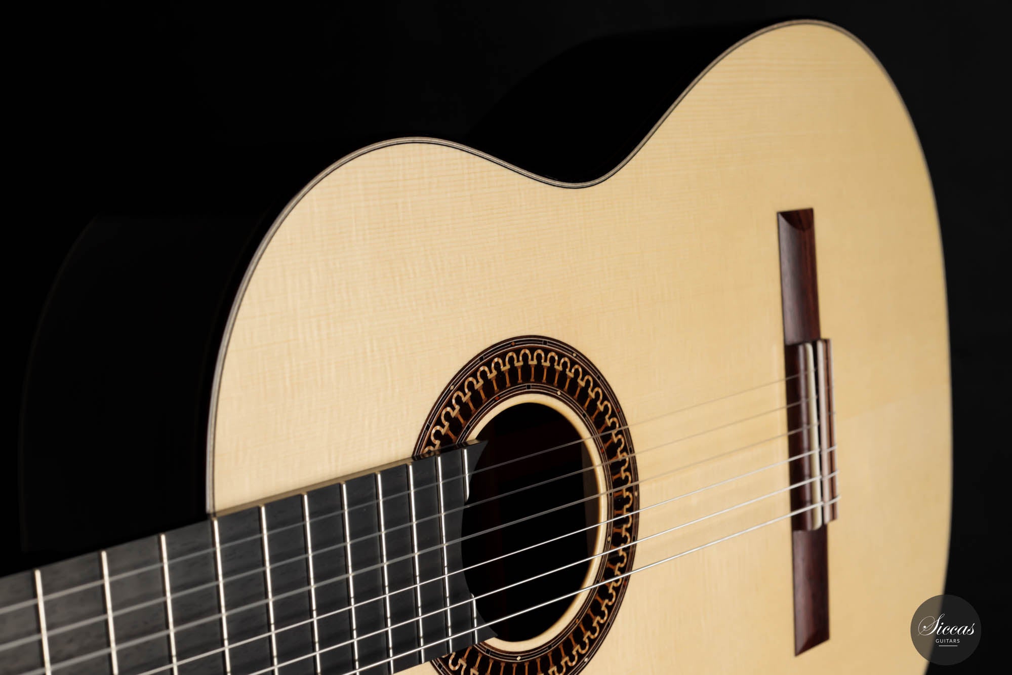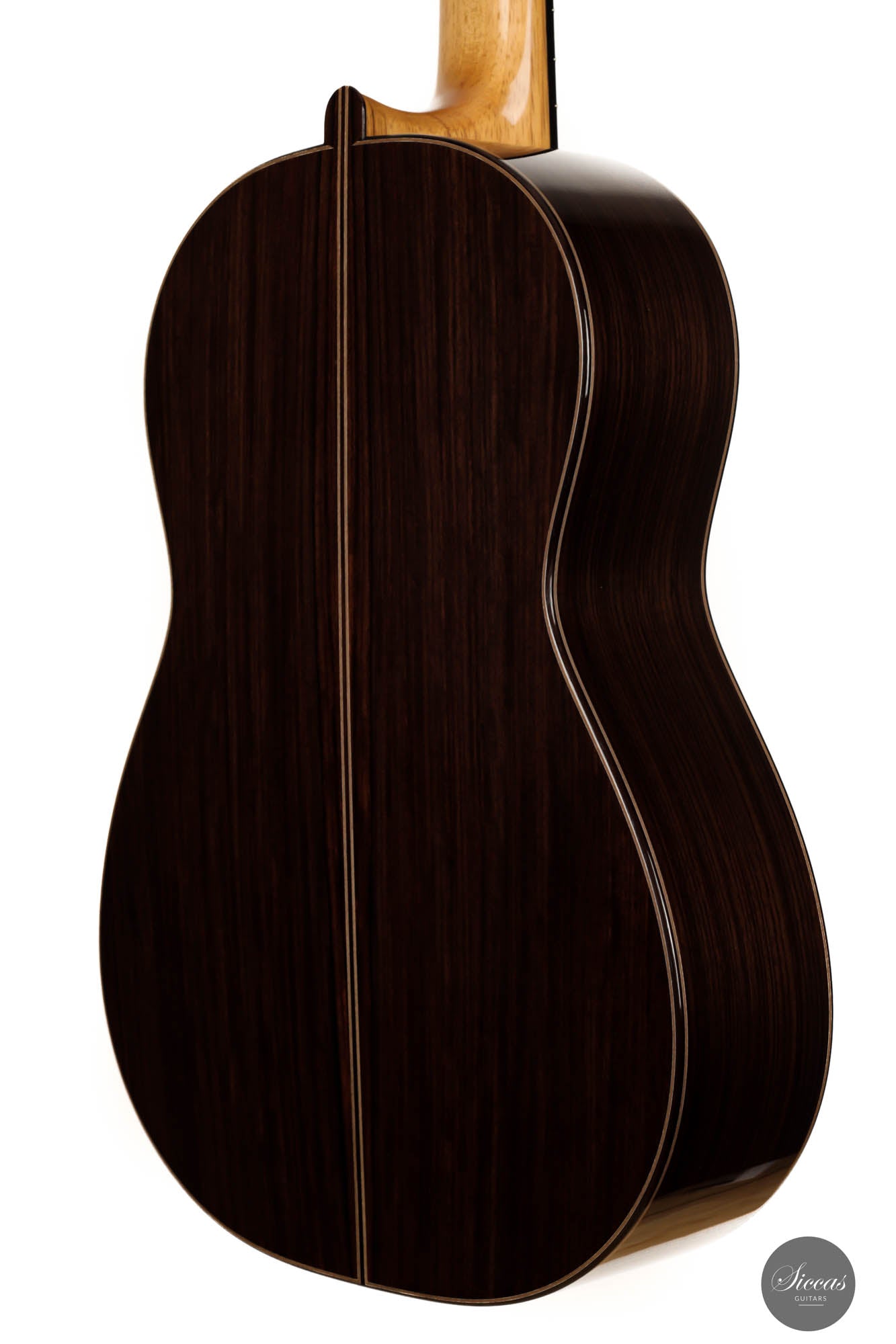 This traditionally built guitar has a highest-grade spruce soundboard and Indian rosewood back and sides, built to a very high level of craftsmanship. Moreover, the trebles of this guitar are breathtaking. Michael has successfully nailed the most challenging part of guitar-making: the trebles. Furthermore, as a result of its F# primary body resonance, the airy and direct basses complement the overall voicing of the instrument. The subtlety of the sound colors and the timelessness of its timbre places this guitar easily at the highest level of contemporary lutherie.