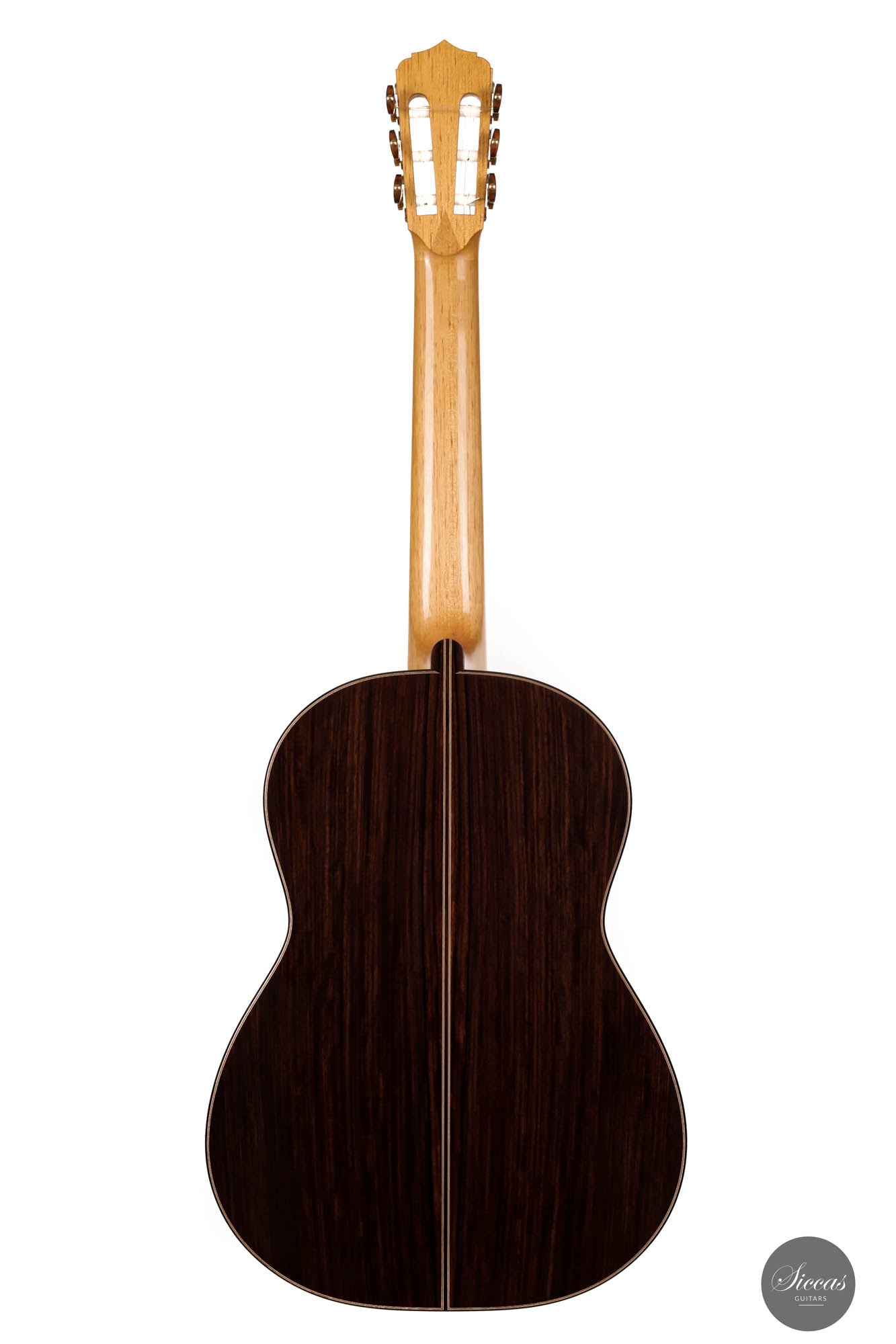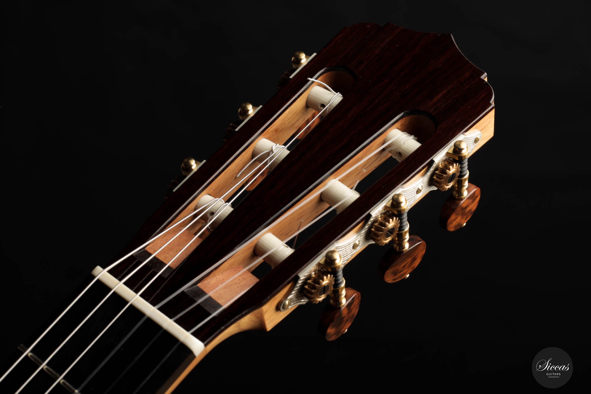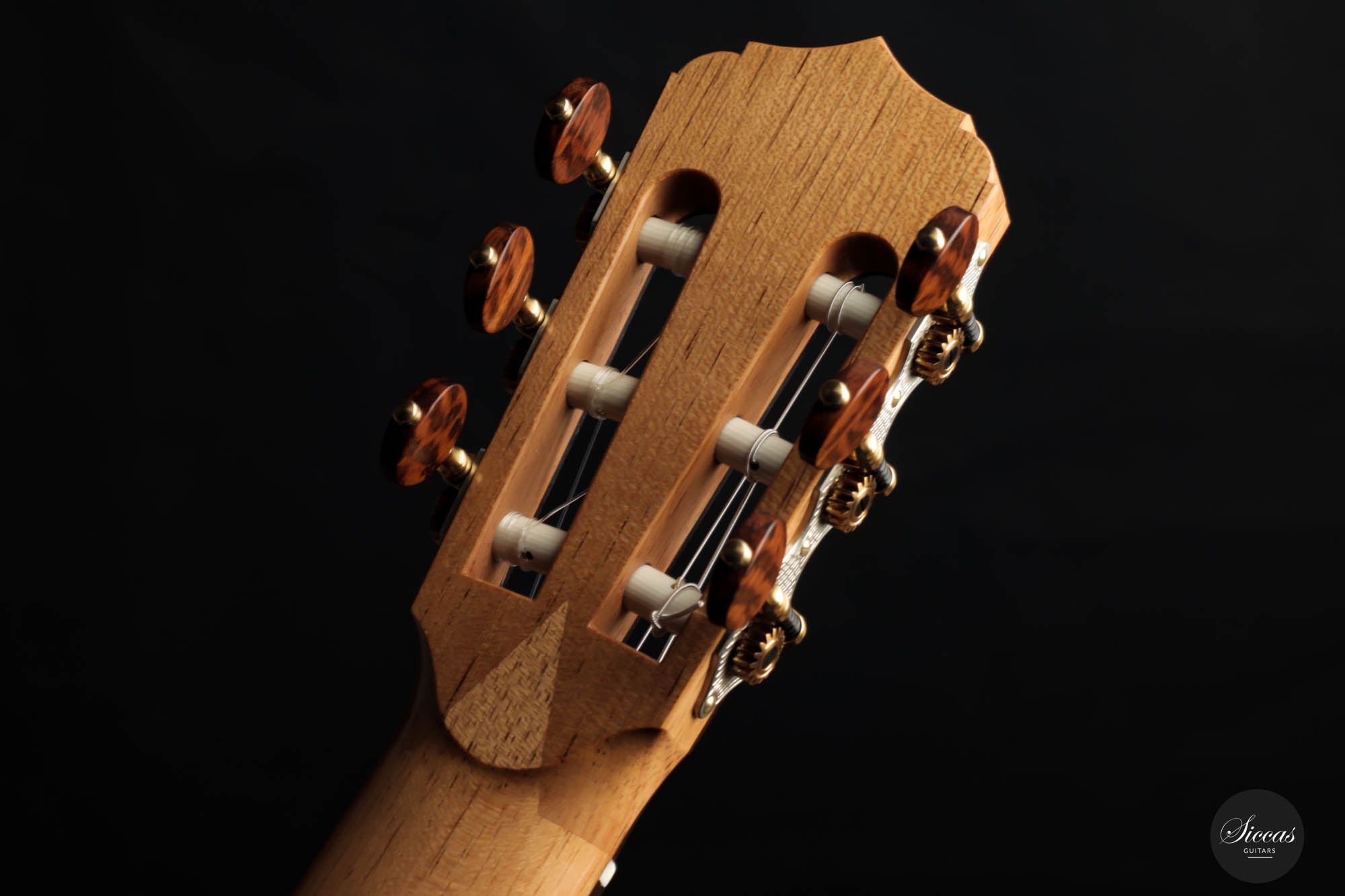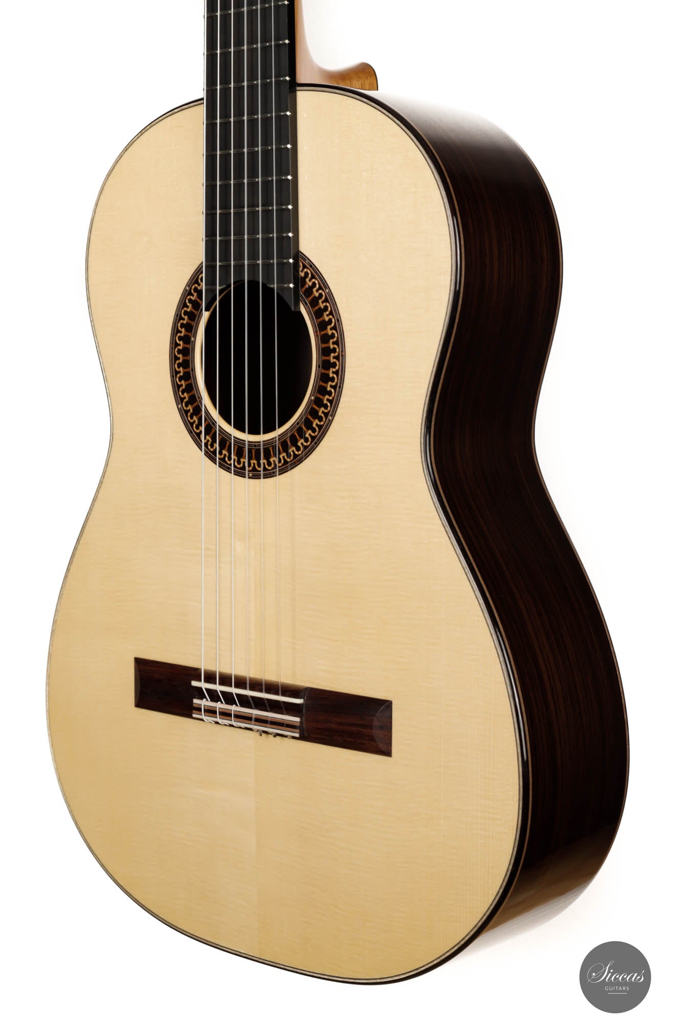 This traditionally built guitar has a highest-grade spruce soundboard and Indian rosewood back and sides, built to a very high level of craftsmanship. Moreover, the trebles of this guitar are breathtaking. Michael has successfully nailed the most challenging part of guitar-making: the trebles. Furthermore, as a result of its F# primary body resonance, the airy and direct basses complement the overall voicing of the instrument. The subtlety of the sound colors and the timelessness of its timbre places this guitar easily at the highest level of contemporary lutherie.
