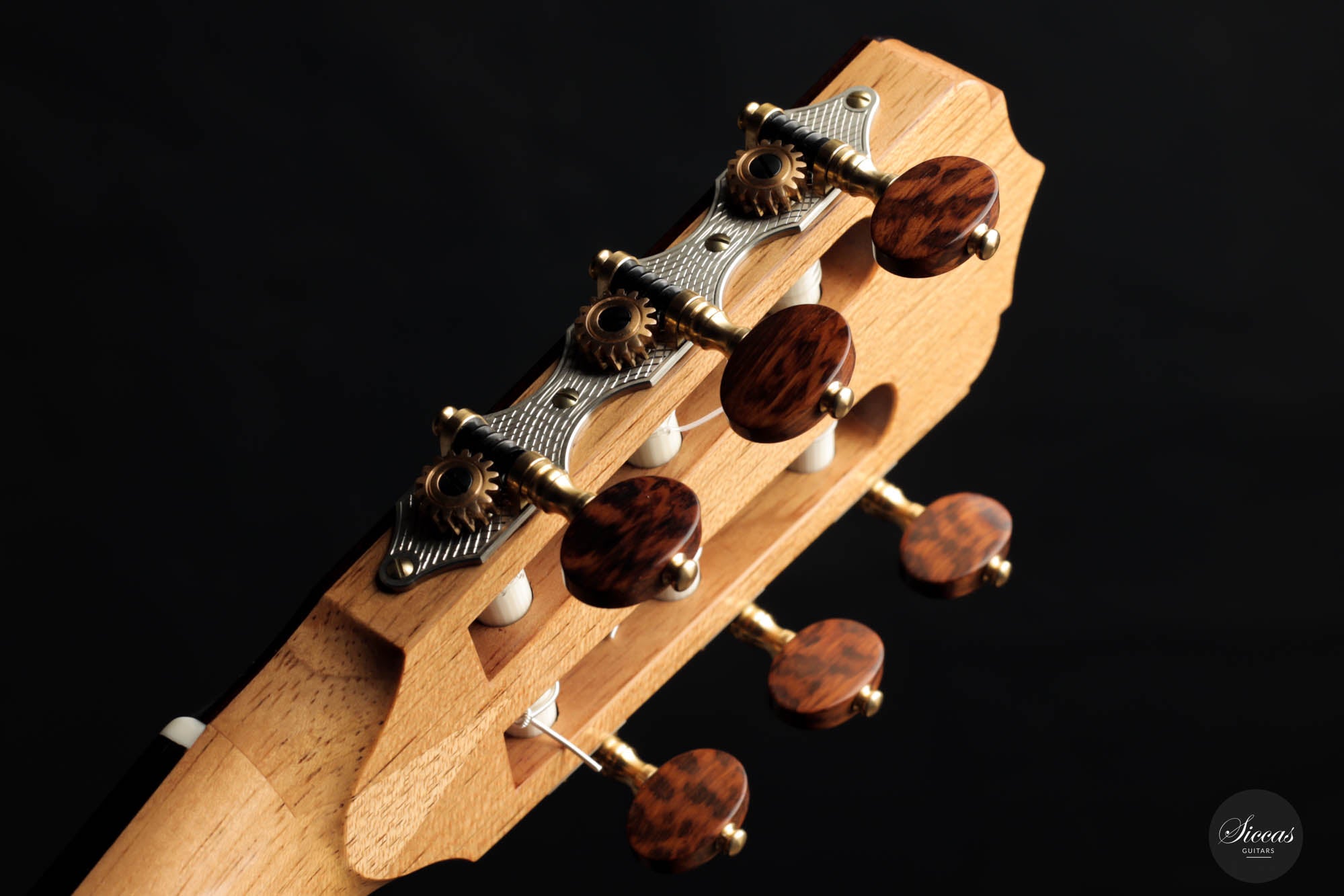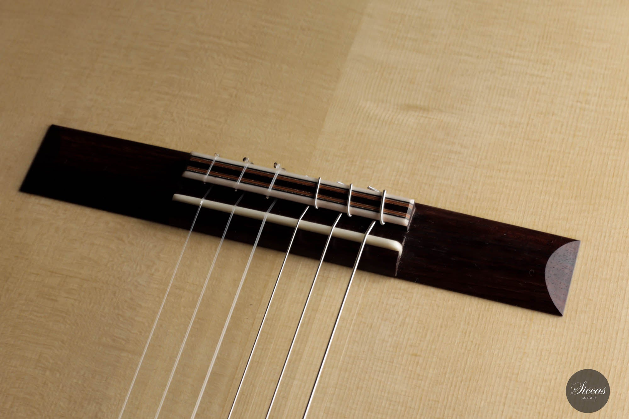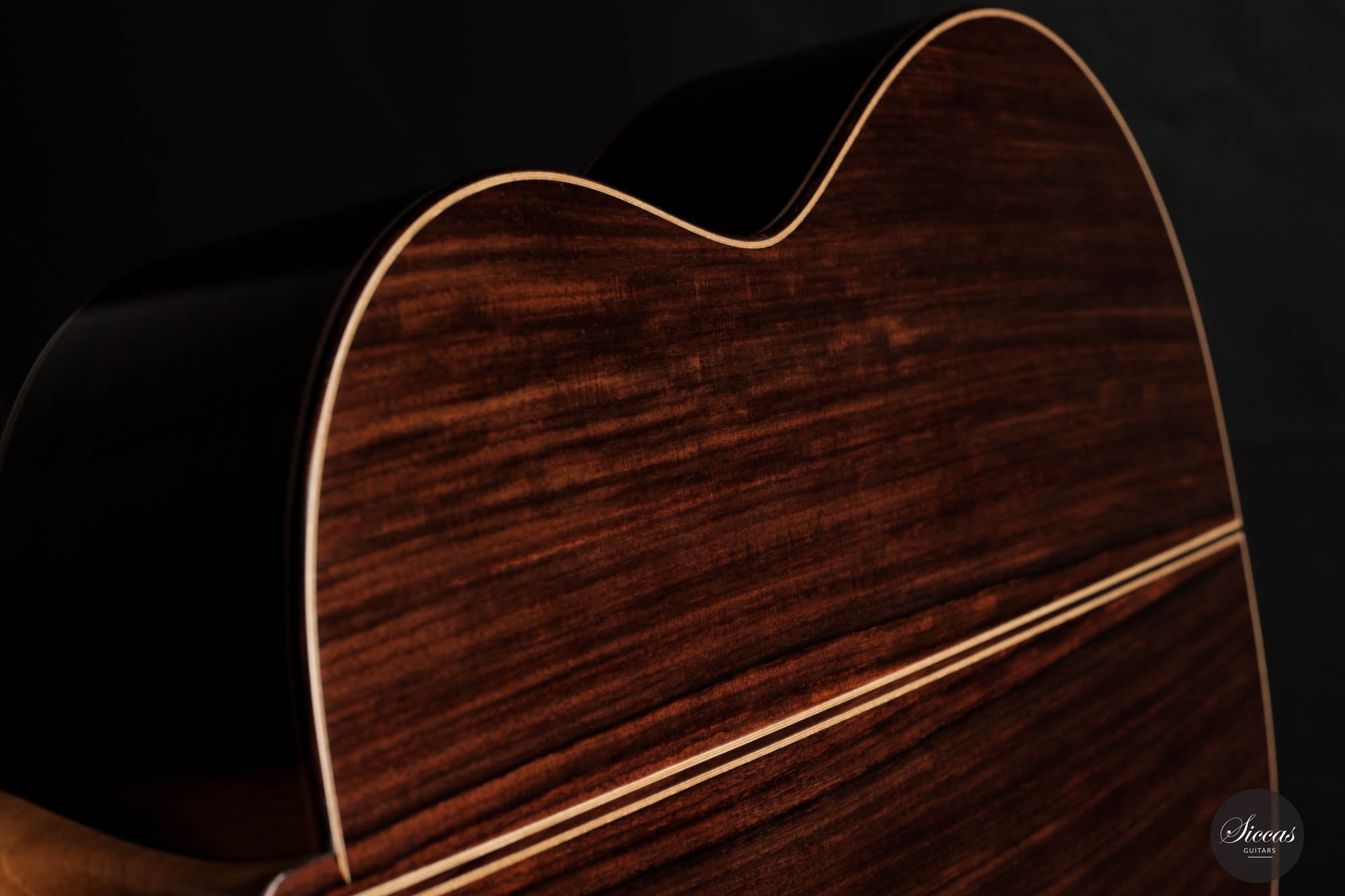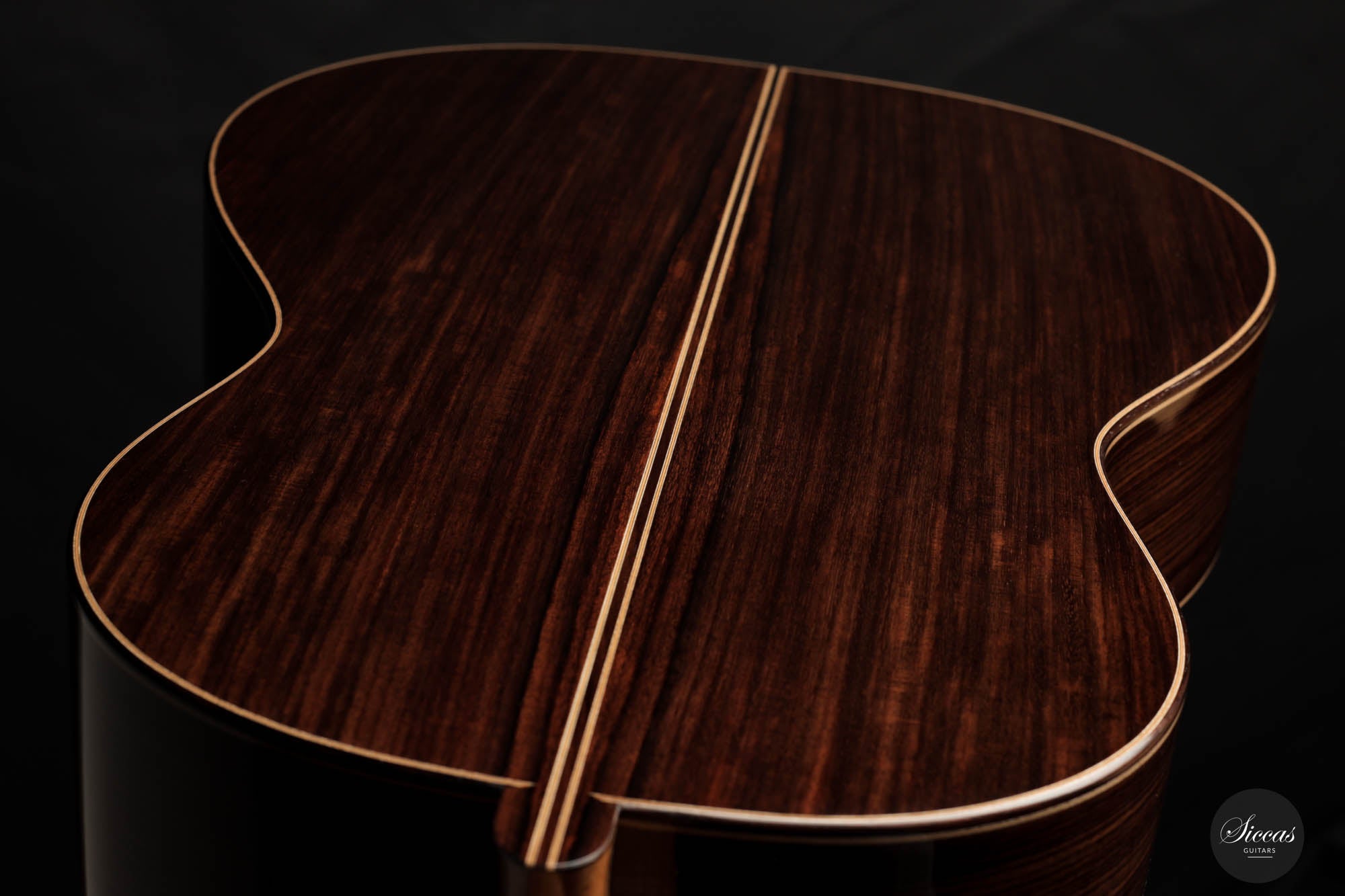 This traditionally built guitar has a highest-grade spruce soundboard and Indian rosewood back and sides, built to a very high level of craftsmanship. Moreover, the trebles of this guitar are breathtaking. Michael has successfully nailed the most challenging part of guitar-making: the trebles. Furthermore, as a result of its F# primary body resonance, the airy and direct basses complement the overall voicing of the instrument. The subtlety of the sound colors and the timelessness of its timbre places this guitar easily at the highest level of contemporary lutherie.
