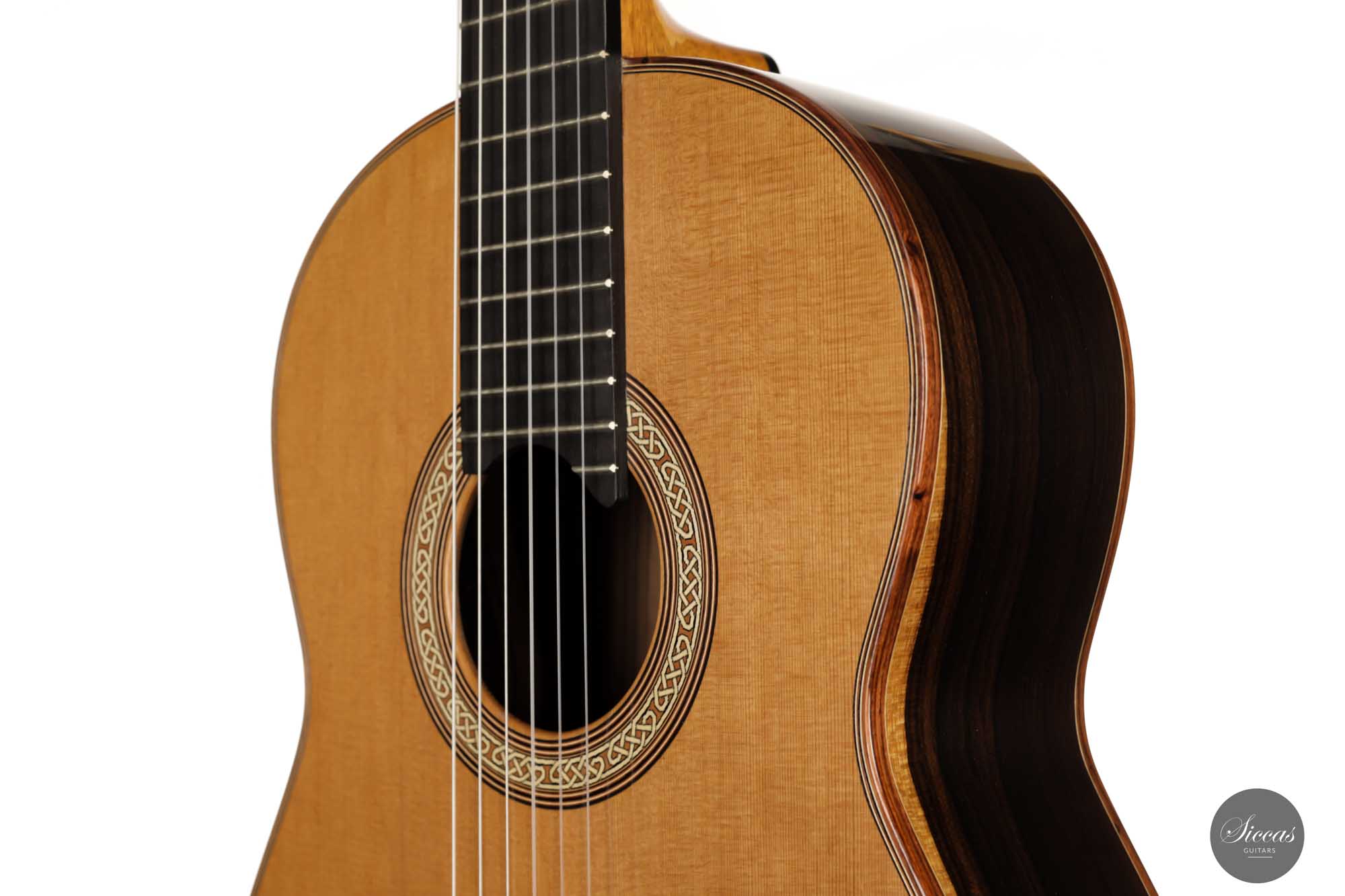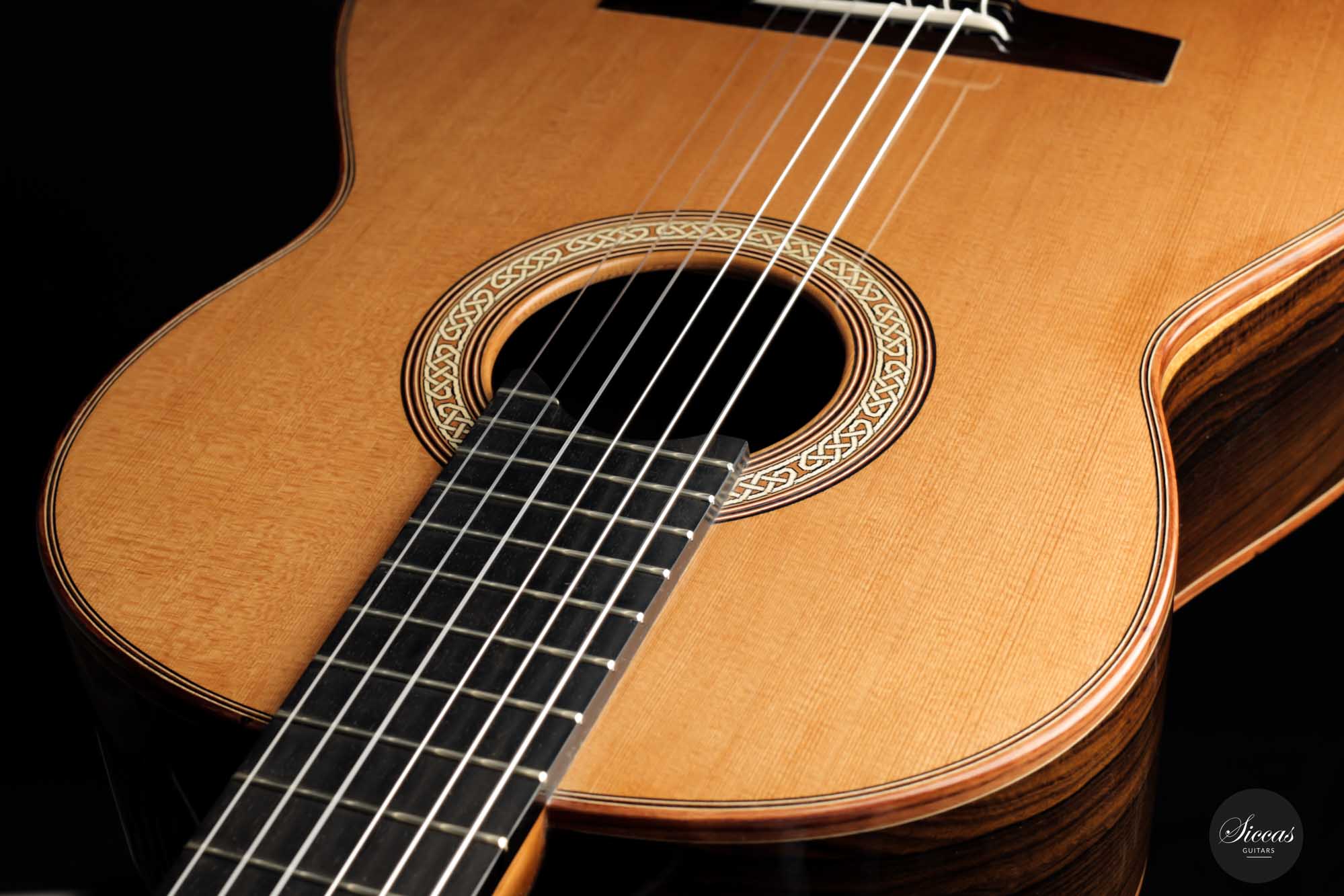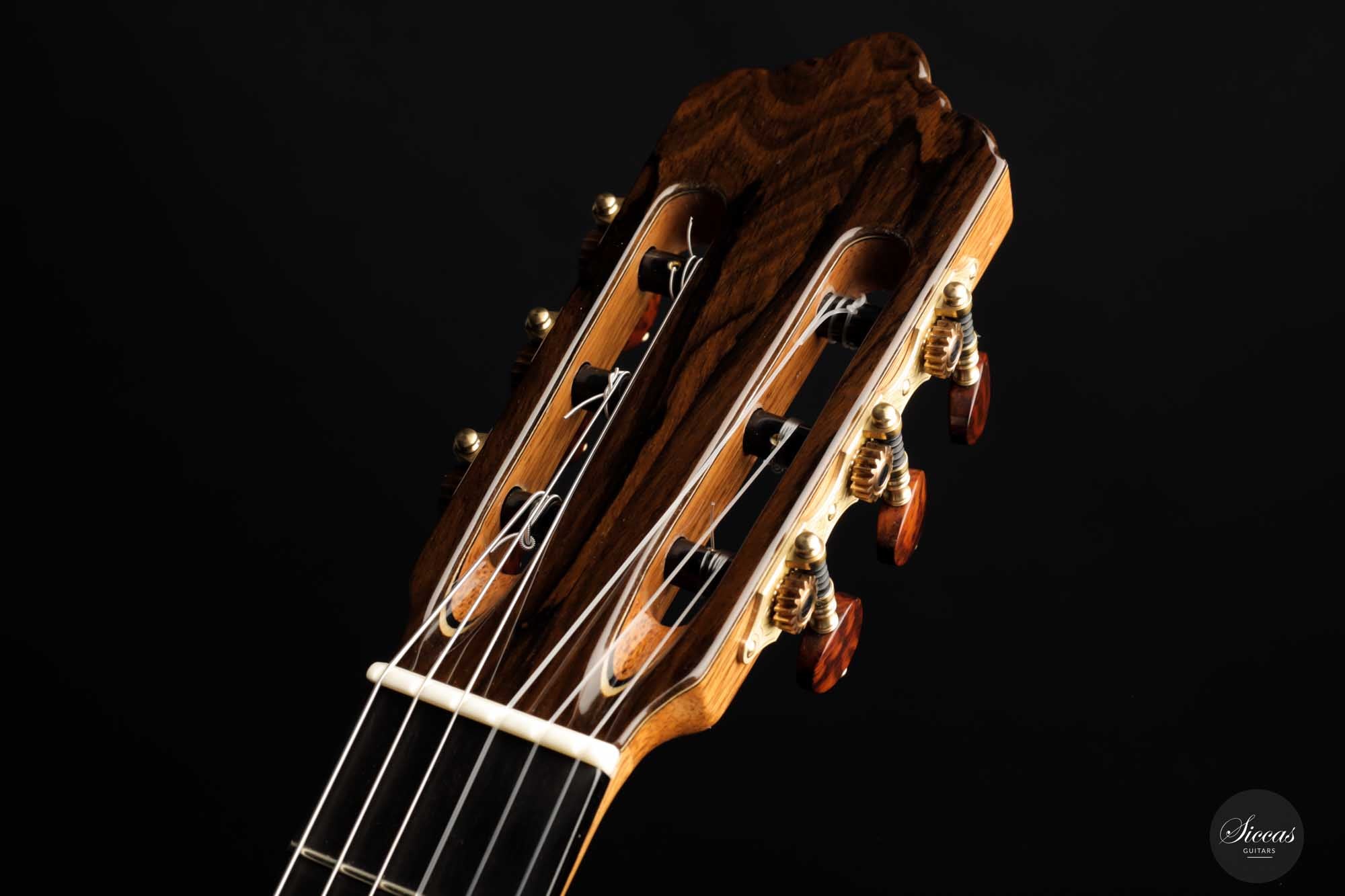 This incredible guitar from 2021 is the "Exclusive" model, the highest model built by Michael O'Leary in his Irish workshop. It has a cedar soundboard combined with a beautiful Ziricote back and sides. It features distinctive elements of O'Leary's guitars, such as the intertwined rosette, the elevated fingerboard, and the braceless back. Due to its construction, this guitar has a massive volume yet maintains its balanced beauty and subtlety of tone. Thanks to its incredible setup, this guitar is effortless to play. Despite being a second-hand instrument, this guitar is in excellent condition with minimal playing marks and is ready to make its way to any concert situation.