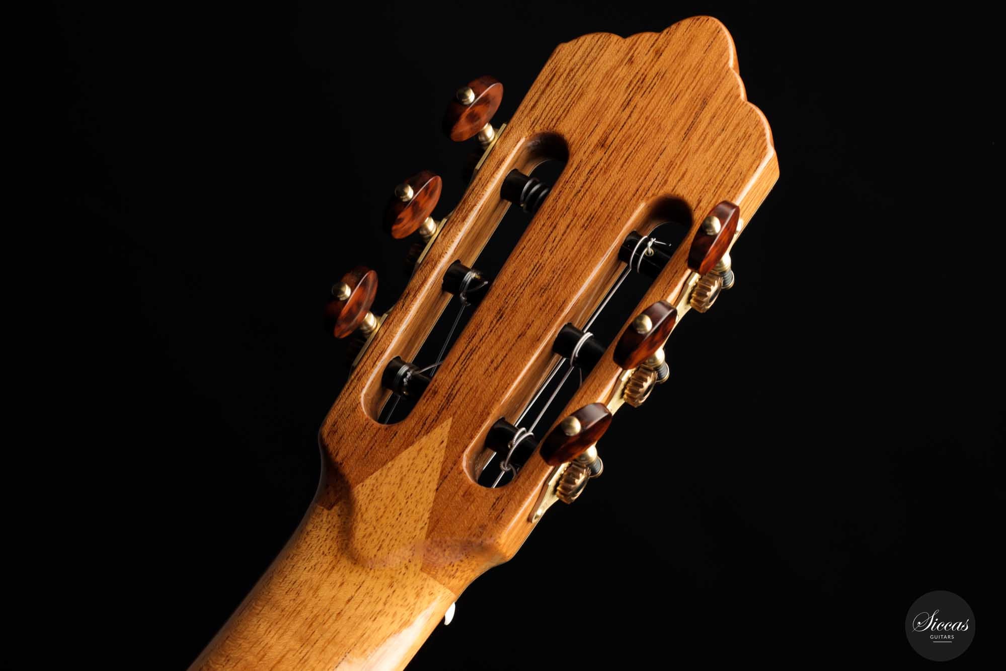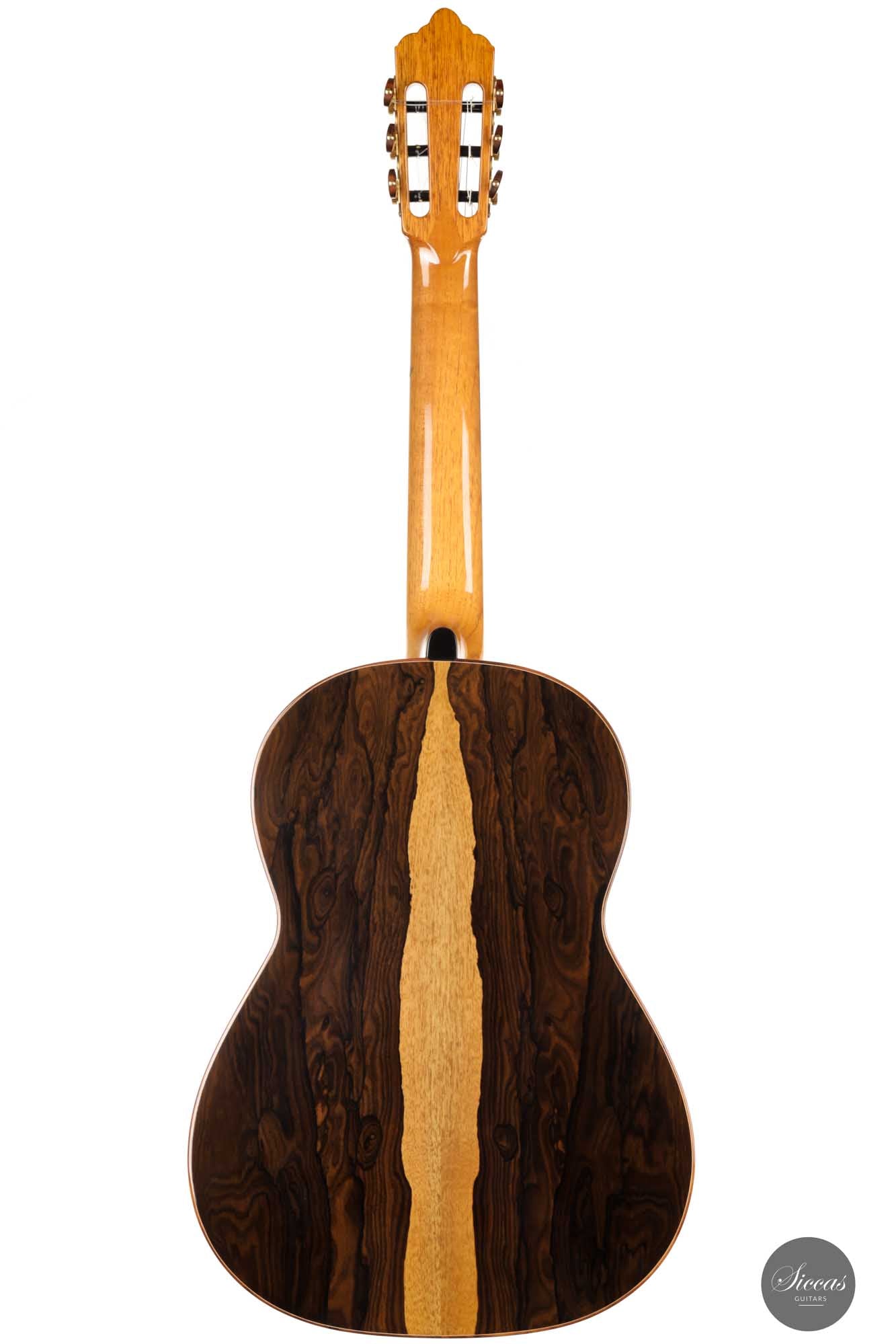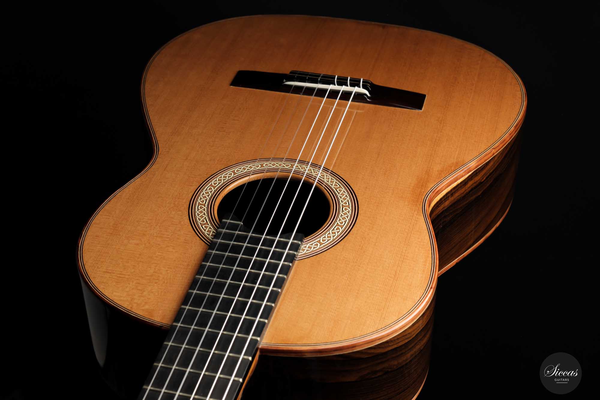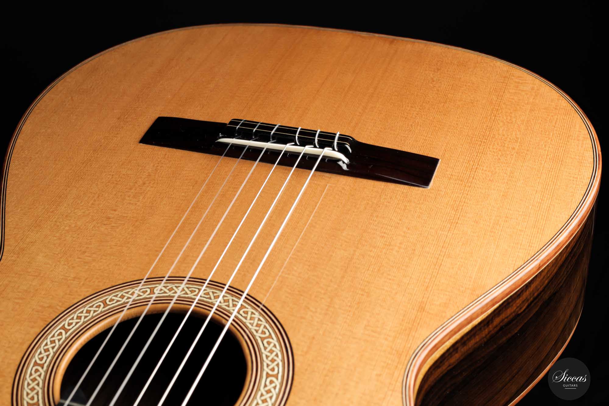 This incredible guitar from 2021 is the "Exclusive" model, the highest model built by Michael O'Leary in his Irish workshop. It has a cedar soundboard combined with a beautiful Ziricote back and sides. It features distinctive elements of O'Leary's guitars, such as the intertwined rosette, the elevated fingerboard, and the braceless back. Due to its construction, this guitar has a massive volume yet maintains its balanced beauty and subtlety of tone. Thanks to its incredible setup, this guitar is effortless to play. Despite being a second-hand instrument, this guitar is in excellent condition with minimal playing marks and is ready to make its way to any concert situation.