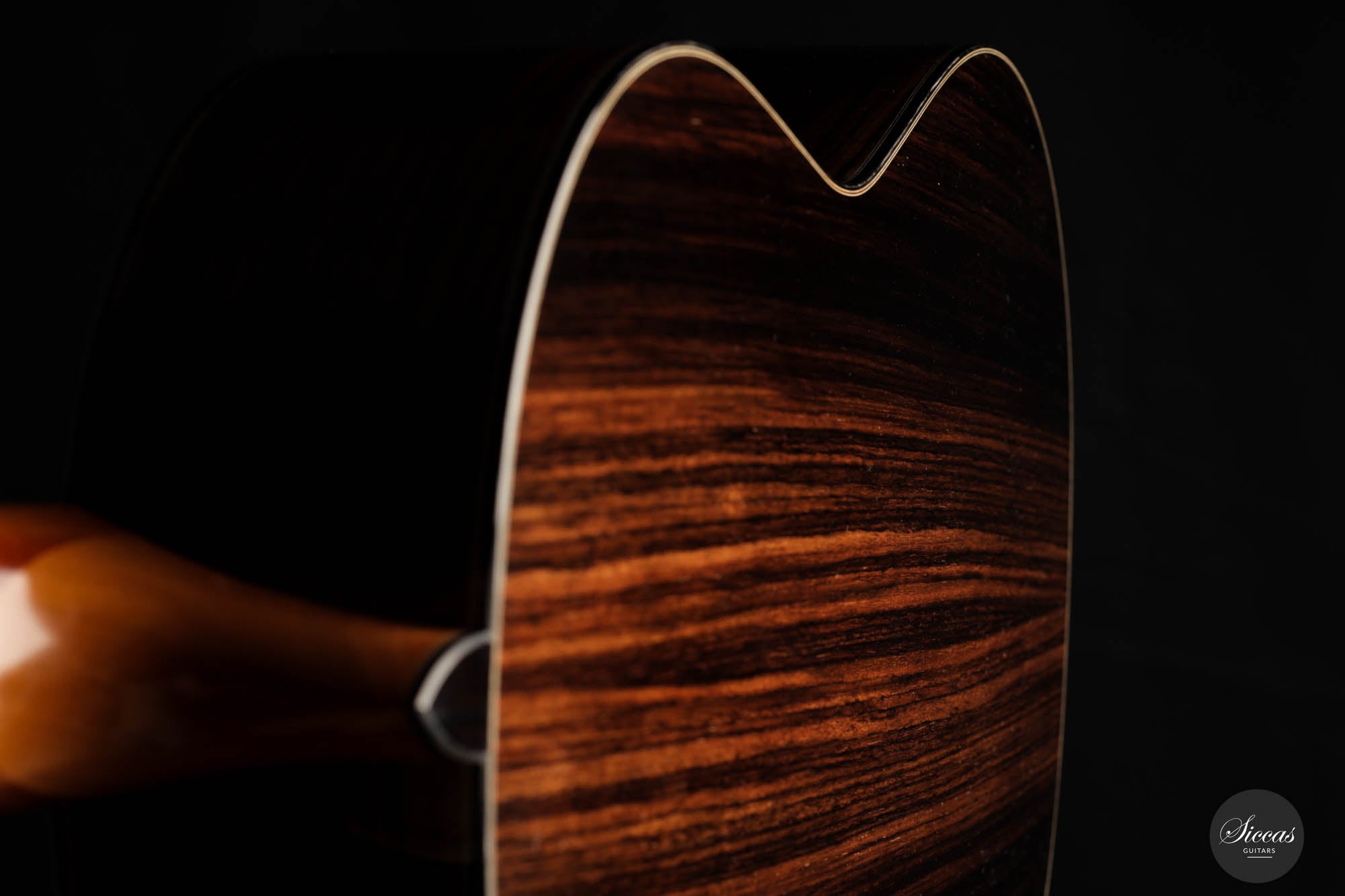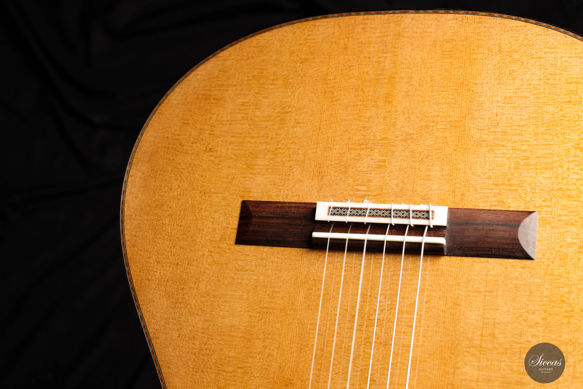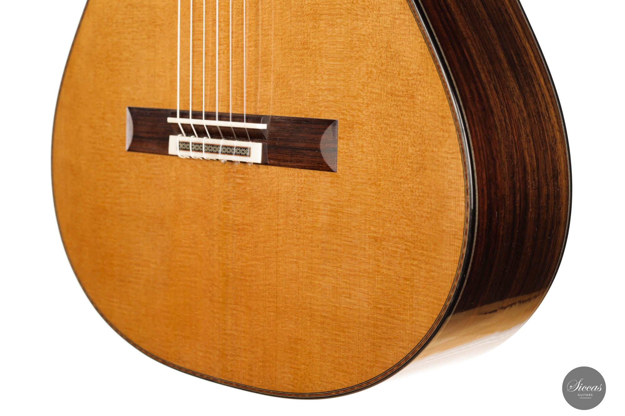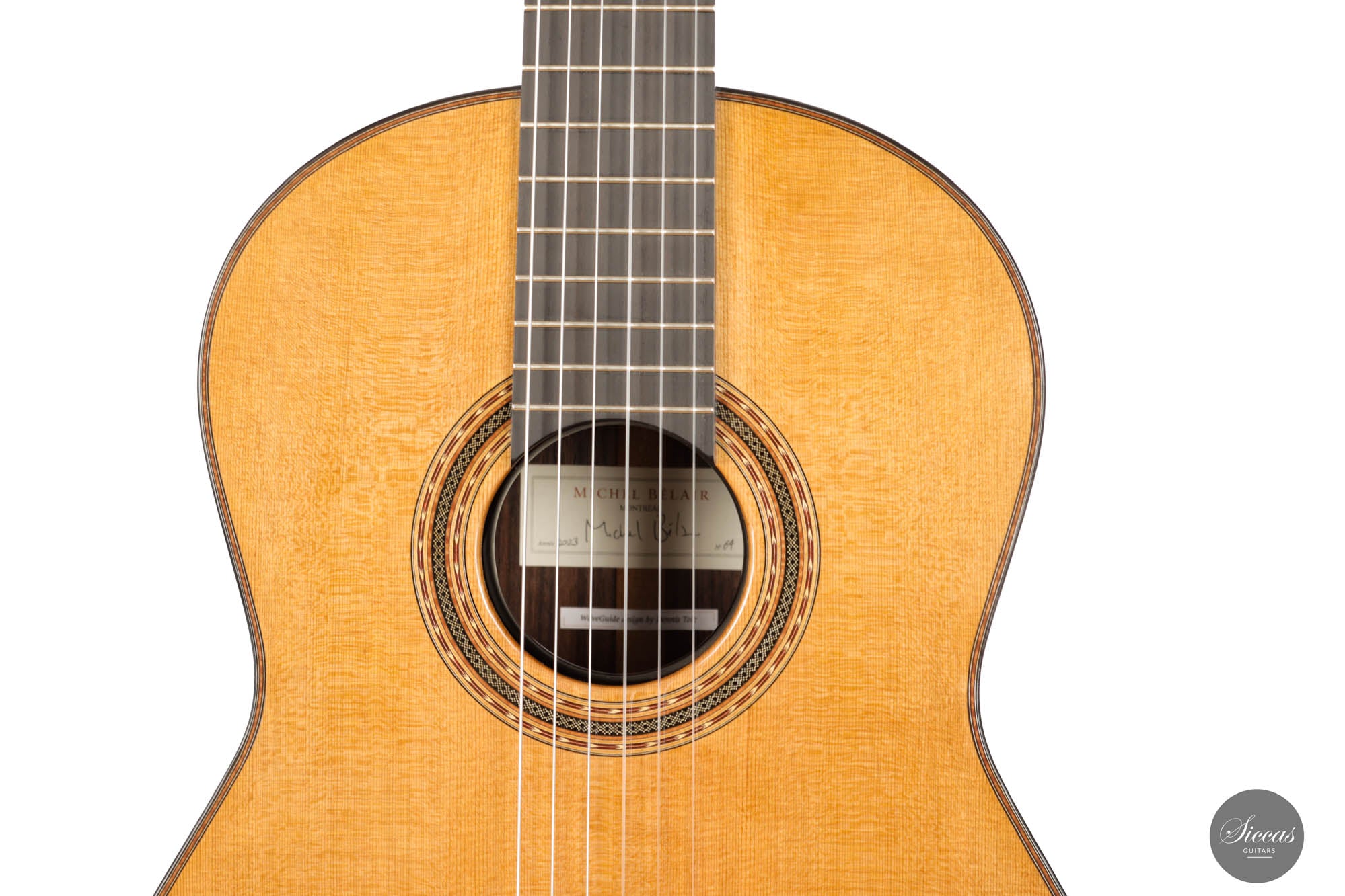 The 2023 Michel Belair double-top guitar represents a significant advancement in classical guitar. This latest creation showcases a meticulously crafted cedar/nomex/cedar double-top, contributing to its exceptional sound qualities. The instrument employs spruce fan bracing, reminiscent of the Bouchet technique, which, coupled with the double-top design, produces an intricate and sonorous sonic profile. The guitar's sides have been doubled in line with techniques employed by the renowned Daniel Friederich. However, despite this doubling, the sides remain remarkably thin, ensuring that they contribute to the guitar's overall vibrational quality. This construction amplifies the guitar's projection and volume. Additionally, the inclusion of the Wave system, pioneered by Dennis Tolz, further augments the instrument's acoustic properties. This system, reminiscent of the Tornavoz device, is strategically placed on the soundboard and yields a prominent lower main resonance centered around the D#/E note range.