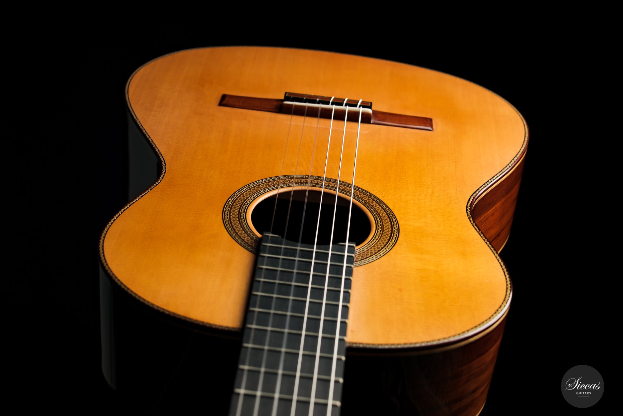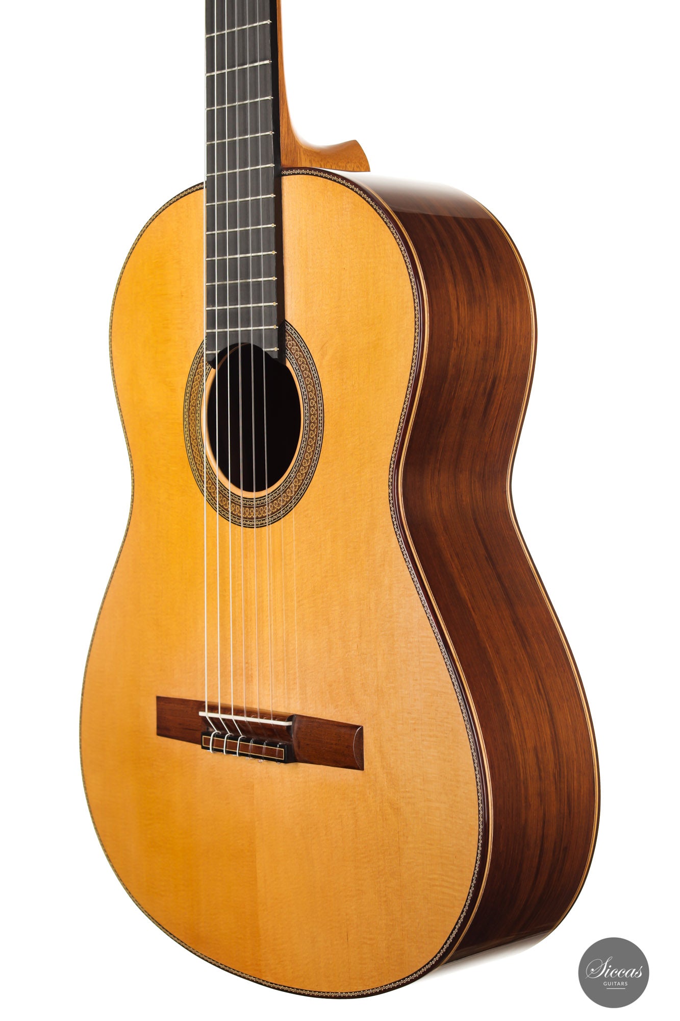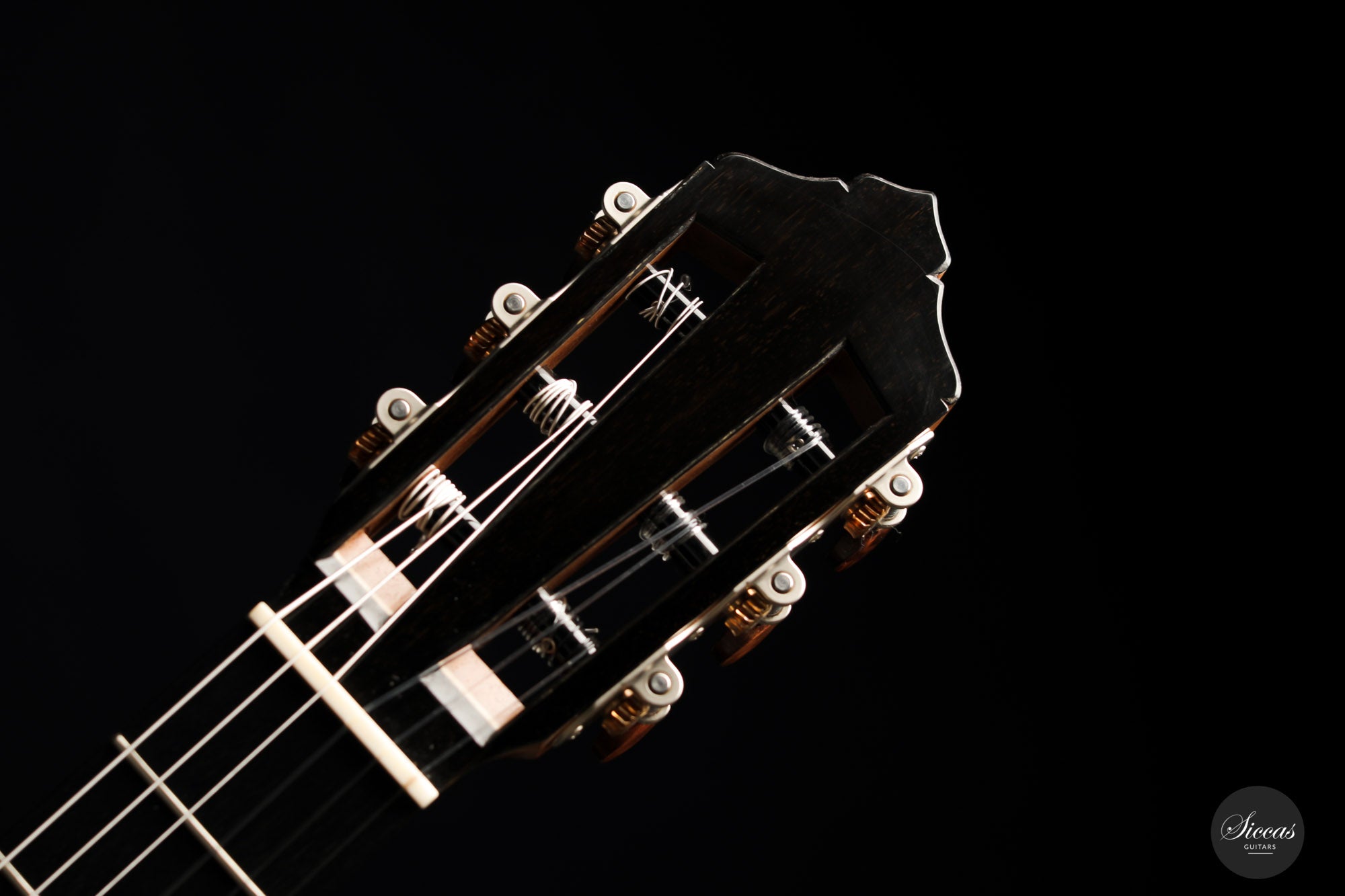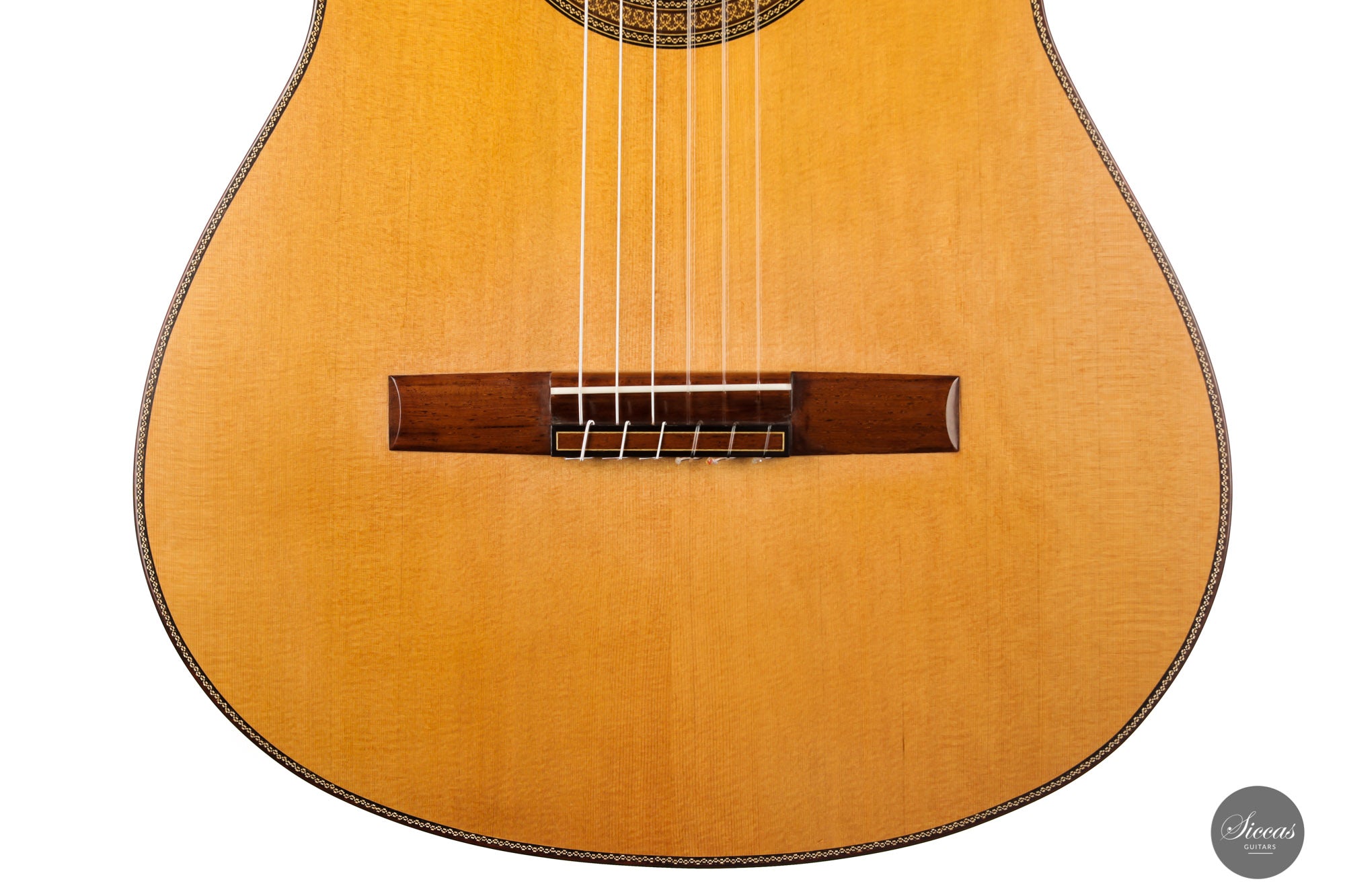 This brand new Mijail Kharash guitar is delightful to play. Its 64 cm scale length, low string action, beautifully shaped neck, and extremely responsive cedar top are the perfect mix for an effortless playing experience. The thin cedar top is strengthened by a spruce fan bracing, which adds both clarity and warmth to the tone. This results in not only a lightweight and very responsive classical guitar with authentic Spanish character, but overall an excellent handmade guitar at an attractive price.