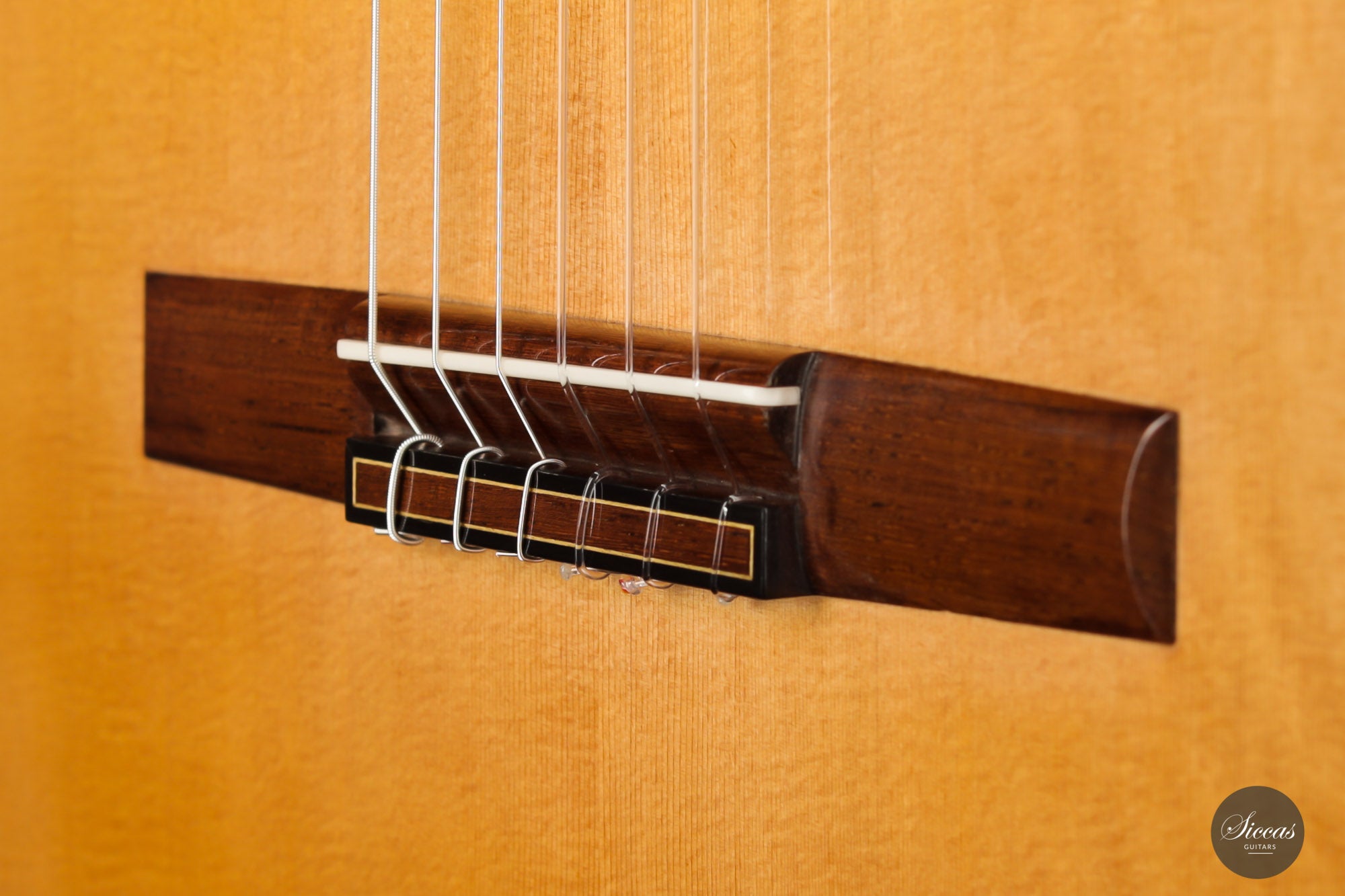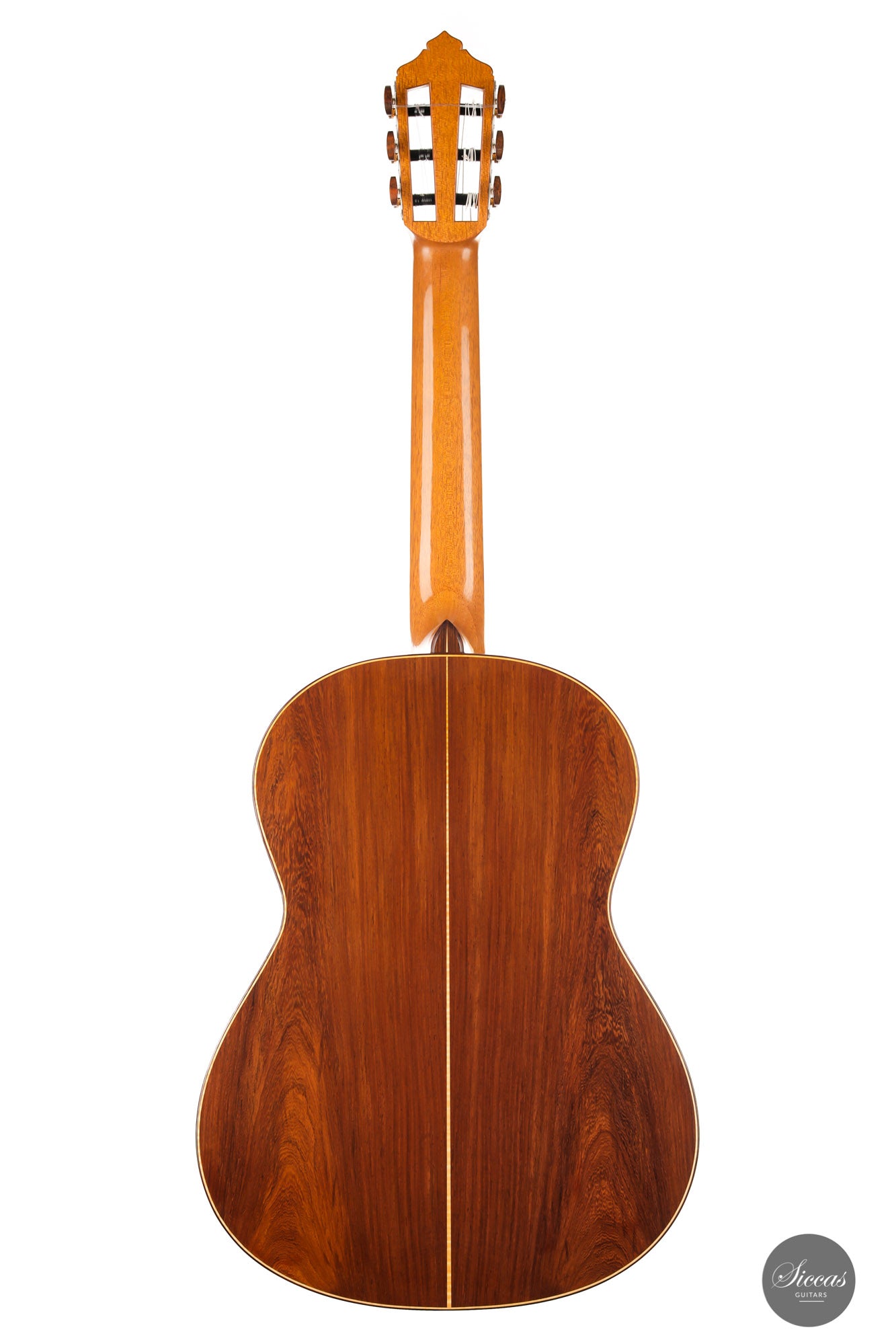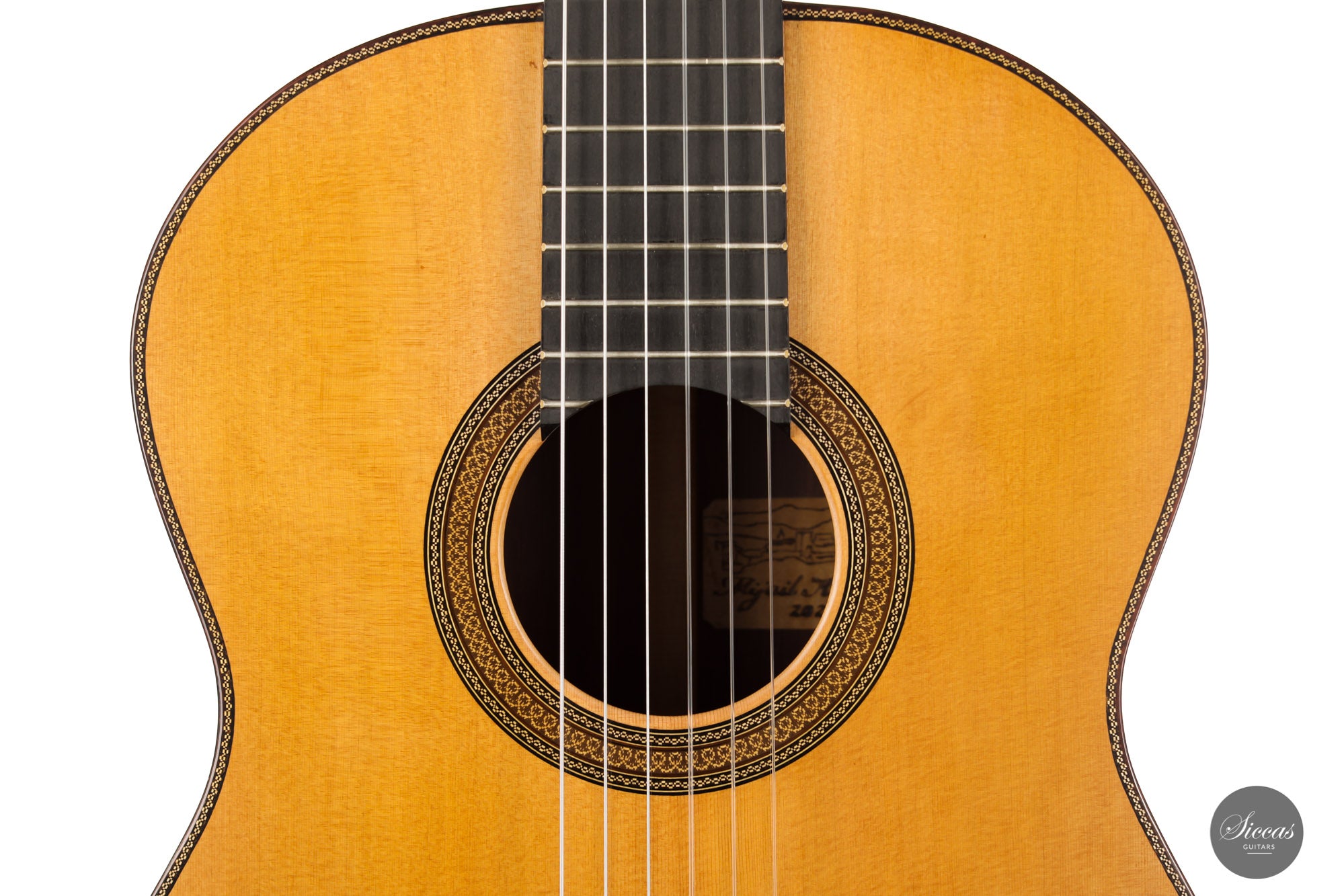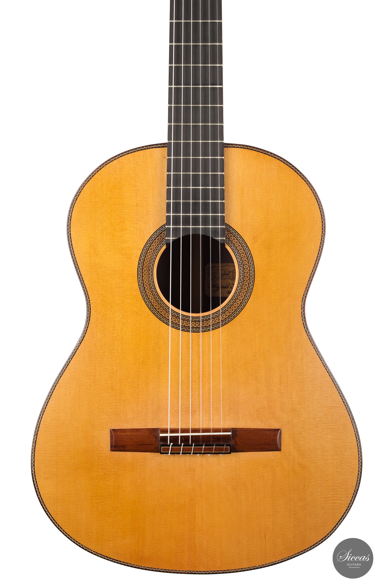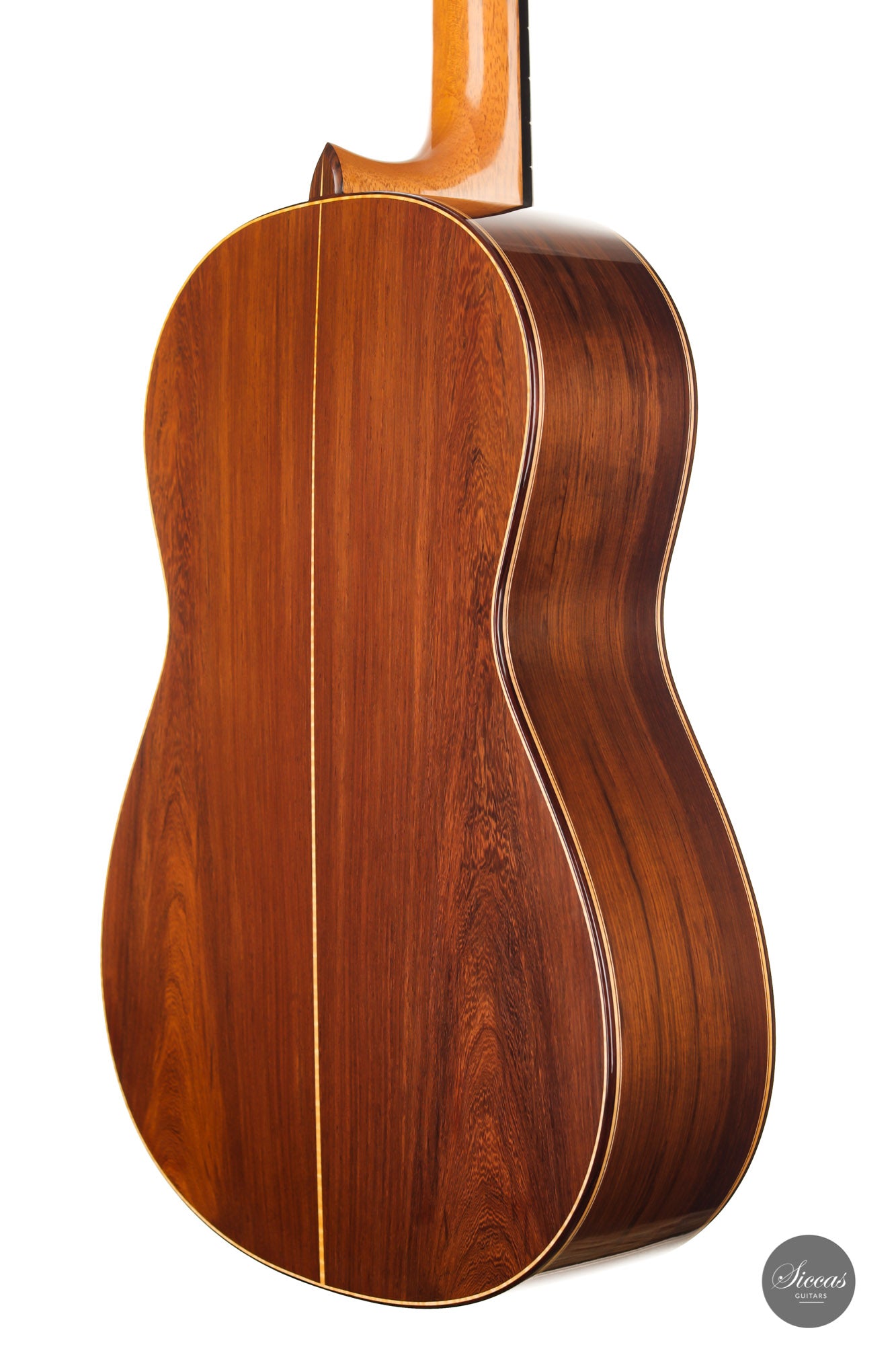 This brand new Mijail Kharash guitar is delightful to play. Its 64 cm scale length, low string action, beautifully shaped neck, and extremely responsive cedar top are the perfect mix for an effortless playing experience. The thin cedar top is strengthened by a spruce fan bracing, which adds both clarity and warmth to the tone. This results in not only a lightweight and very responsive classical guitar with authentic Spanish character, but overall an excellent handmade guitar at an attractive price.