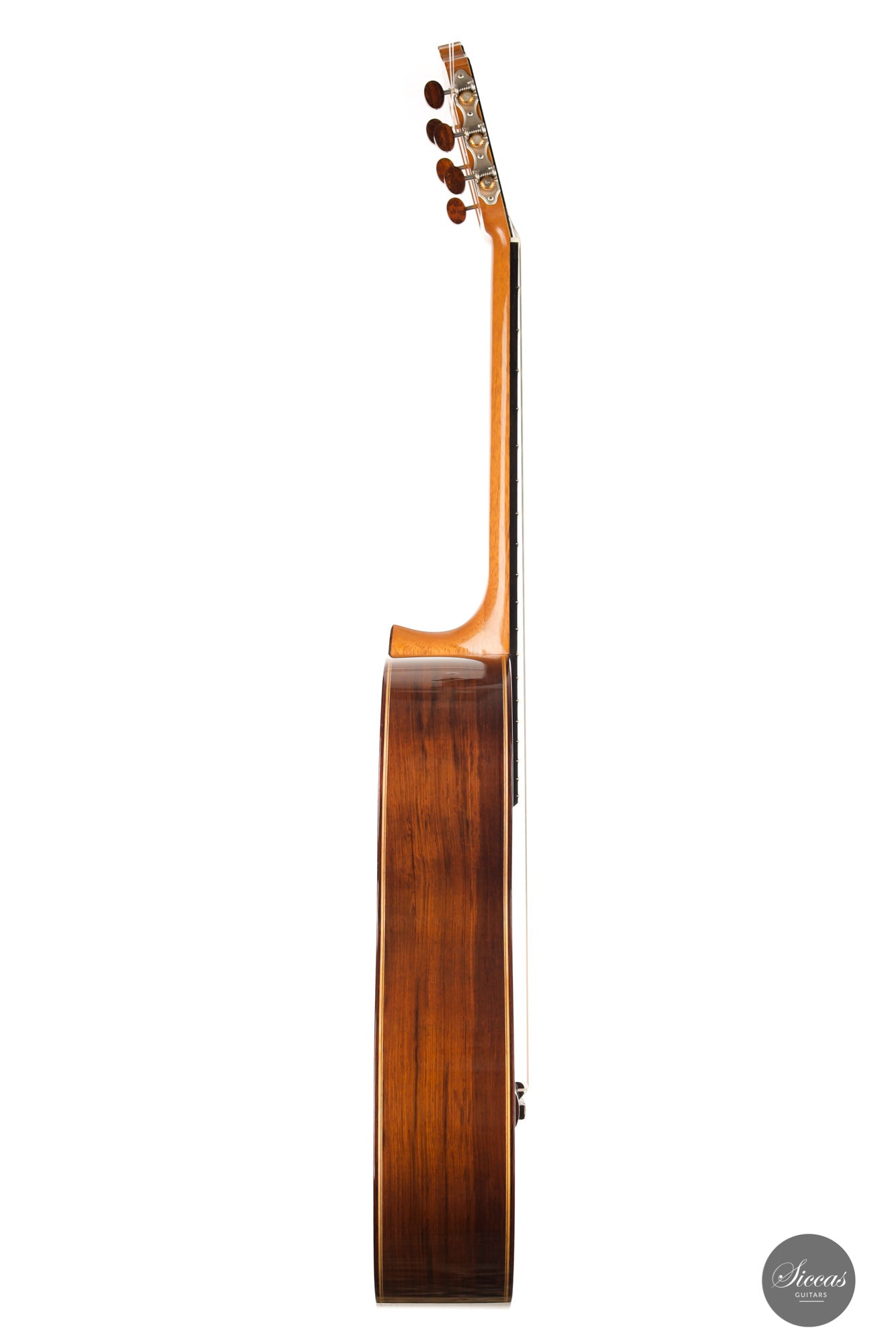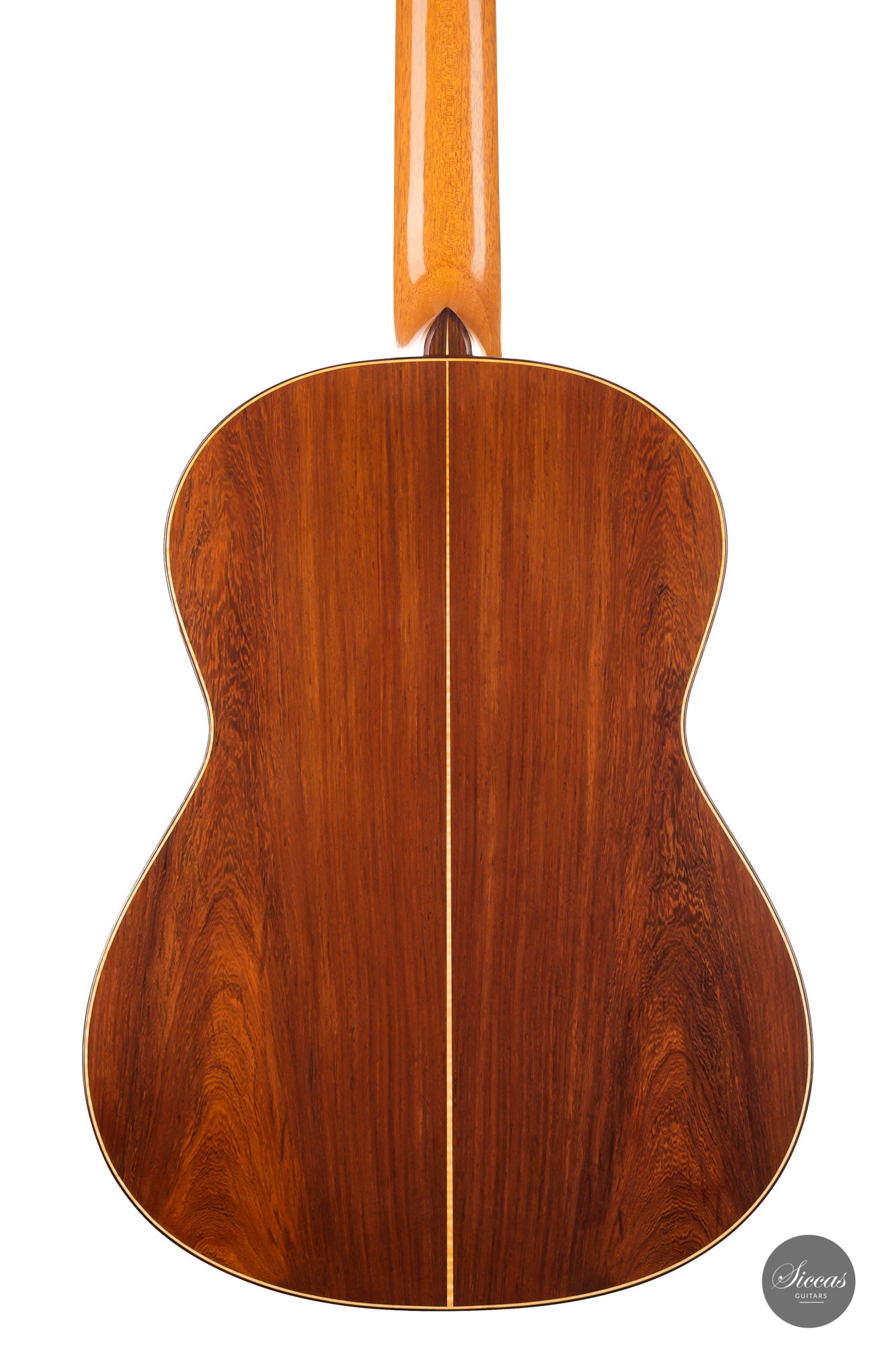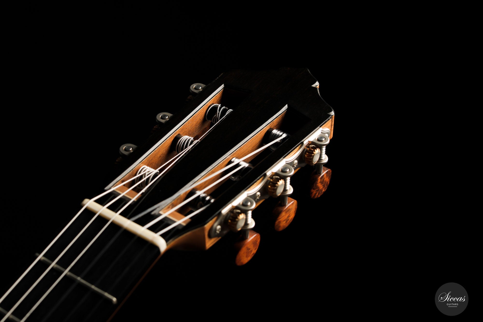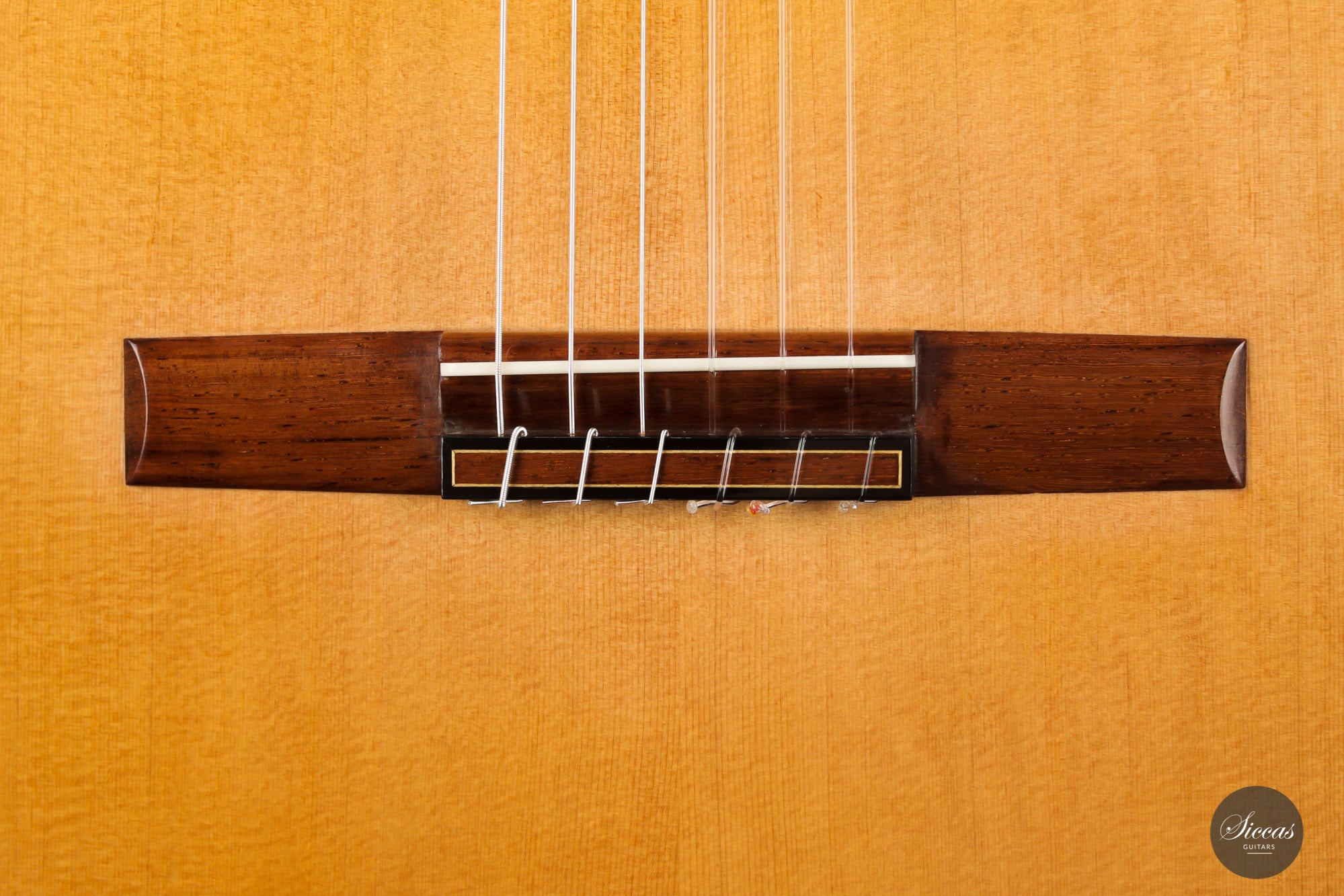 This brand new Mijail Kharash guitar is delightful to play. Its 64 cm scale length, low string action, beautifully shaped neck, and extremely responsive cedar top are the perfect mix for an effortless playing experience. The thin cedar top is strengthened by a spruce fan bracing, which adds both clarity and warmth to the tone. This results in not only a lightweight and very responsive classical guitar with authentic Spanish character, but overall an excellent handmade guitar at an attractive price.