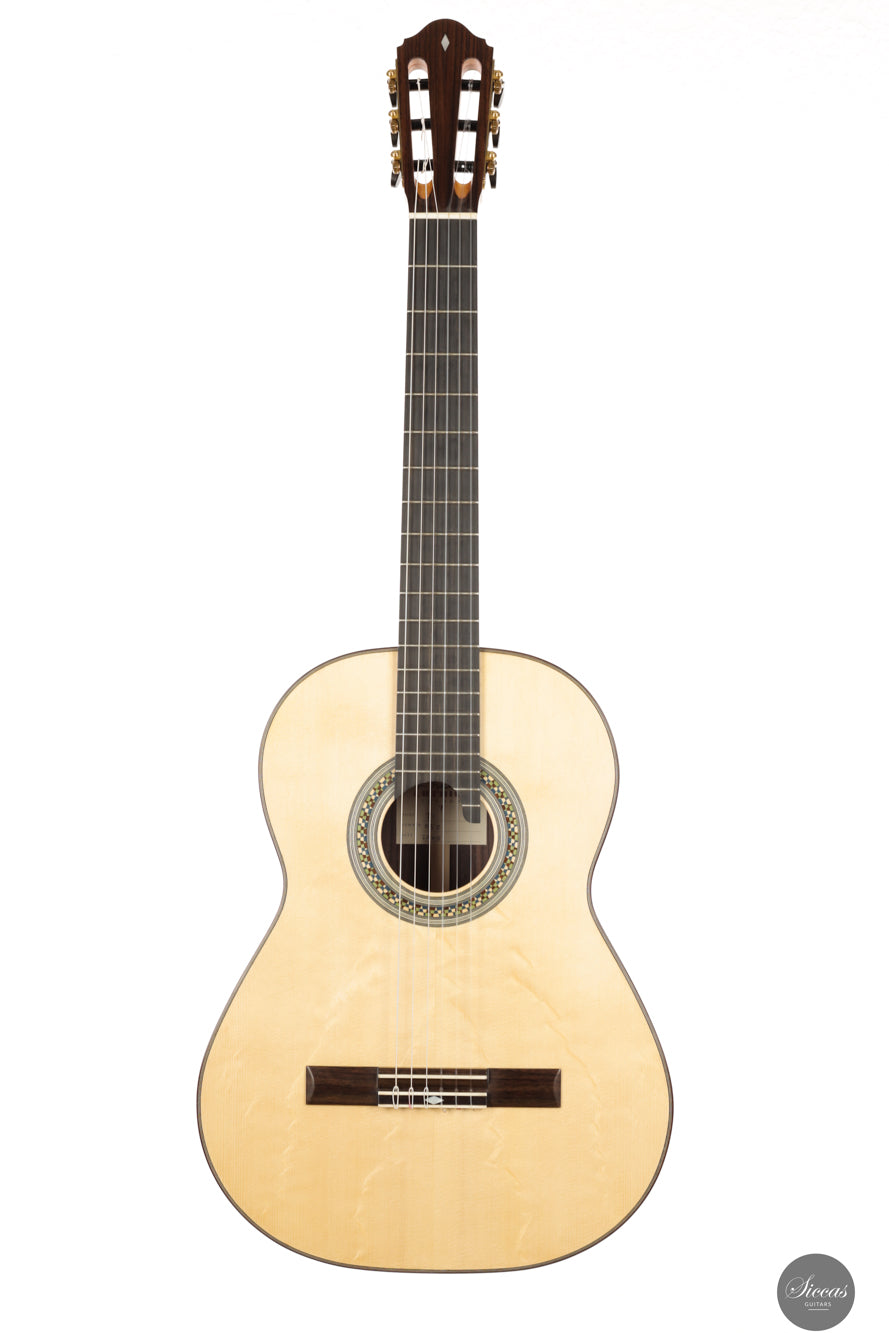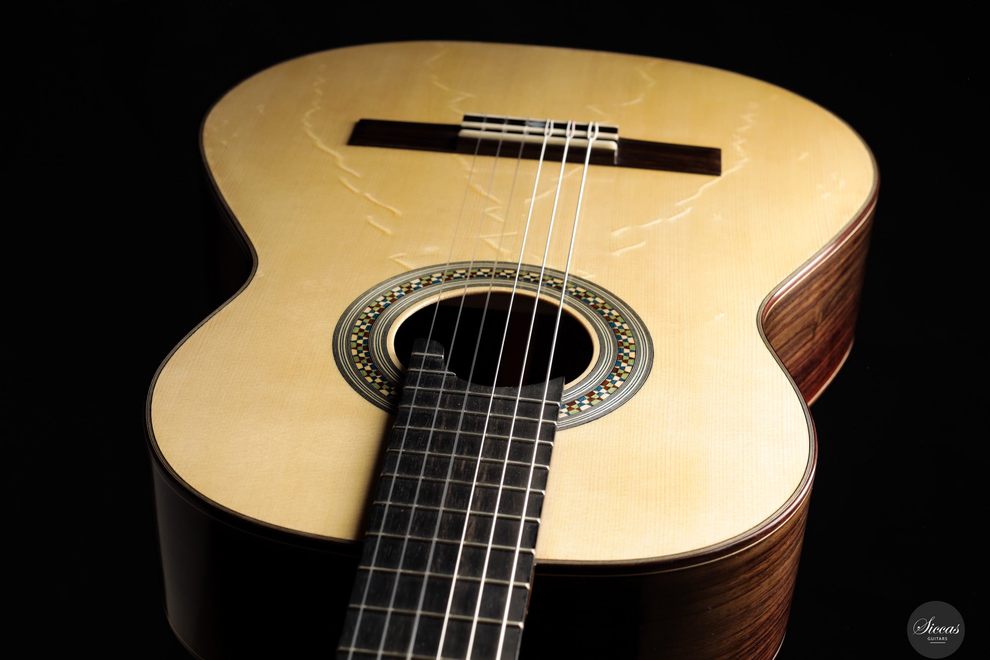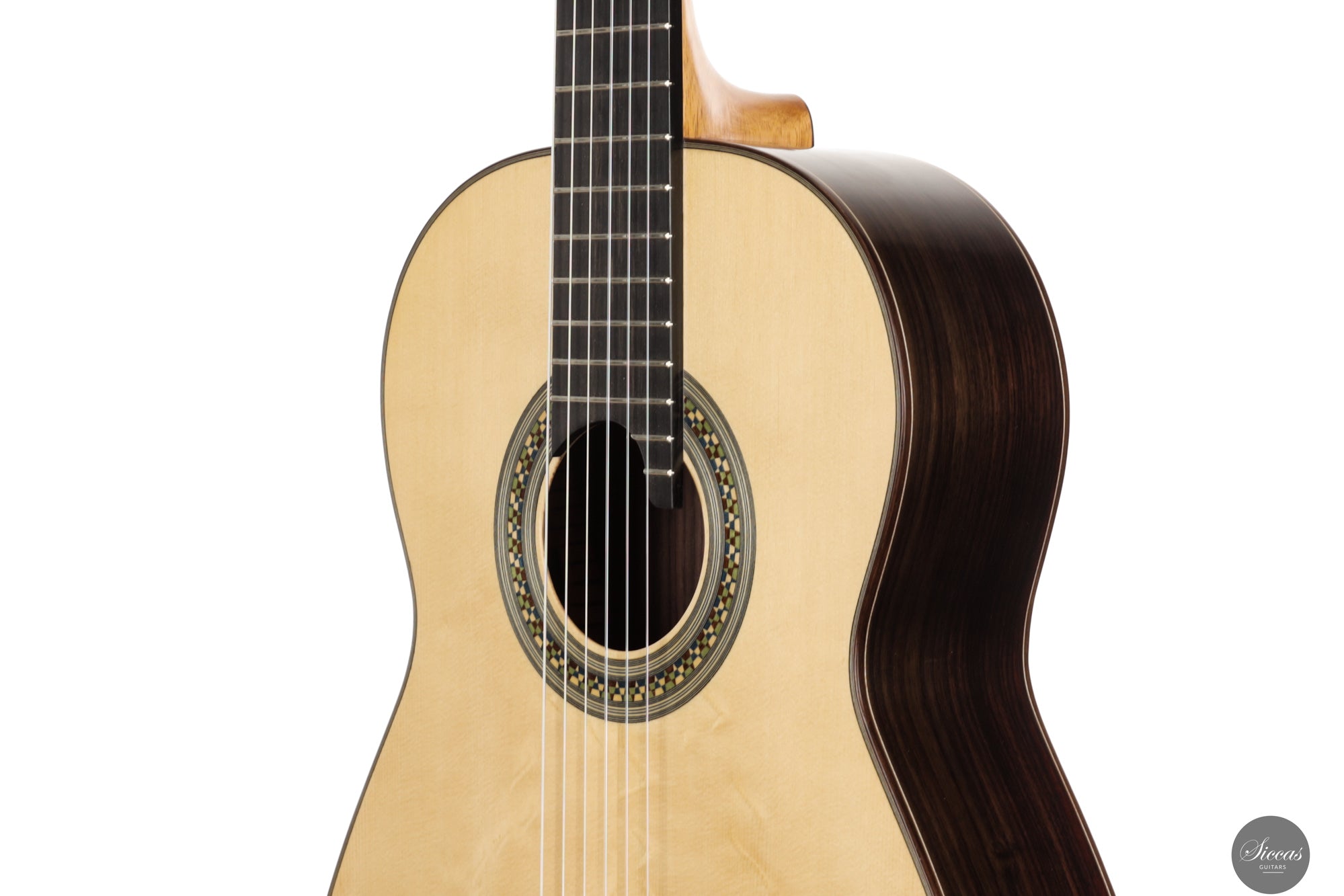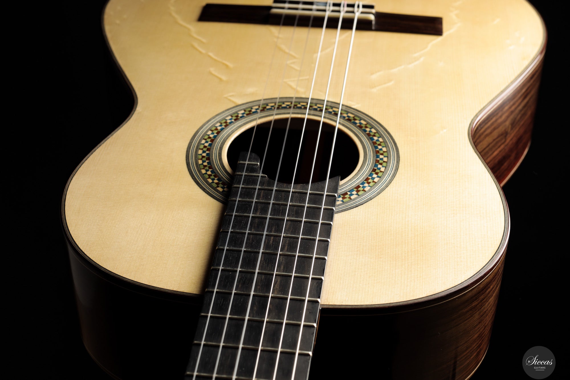 The No. 58 is a traditionally built concert guitar crafted in 2025, featuring a spruce top and Indian rosewood back and sides, finished in French polish. Weighing only 1435 grams, it is notably lightweight. The air body resonance lies between F♯ and G, supporting a warm, balanced core tone. A distinctive feature is its exceptionally comfortable neck, noted for its ease of play across all positions. Tonally, the guitar offers a soft attack and rounded timbre, with a gentle tonal character that leans toward warmth despite the spruce top. This guitar rewards nuanced phrasing and long practice sessions, making it a refined option for both students and professionals seeking an understated yet expressive instrument.
