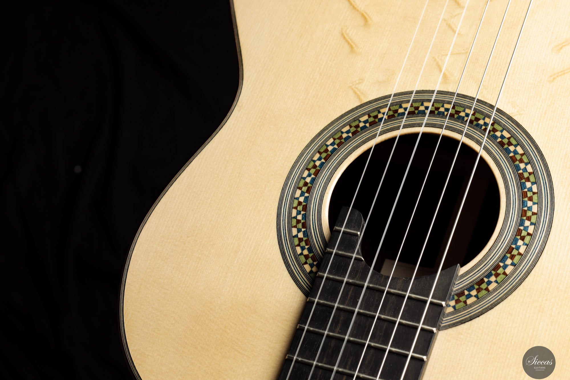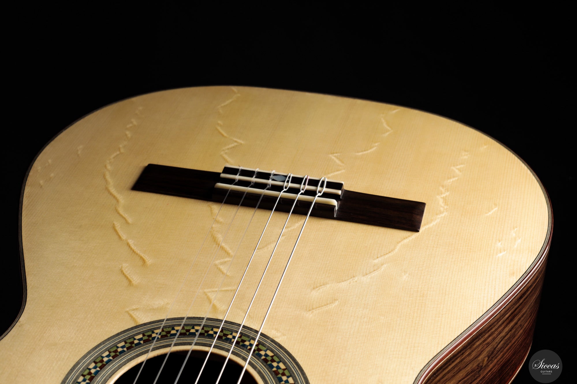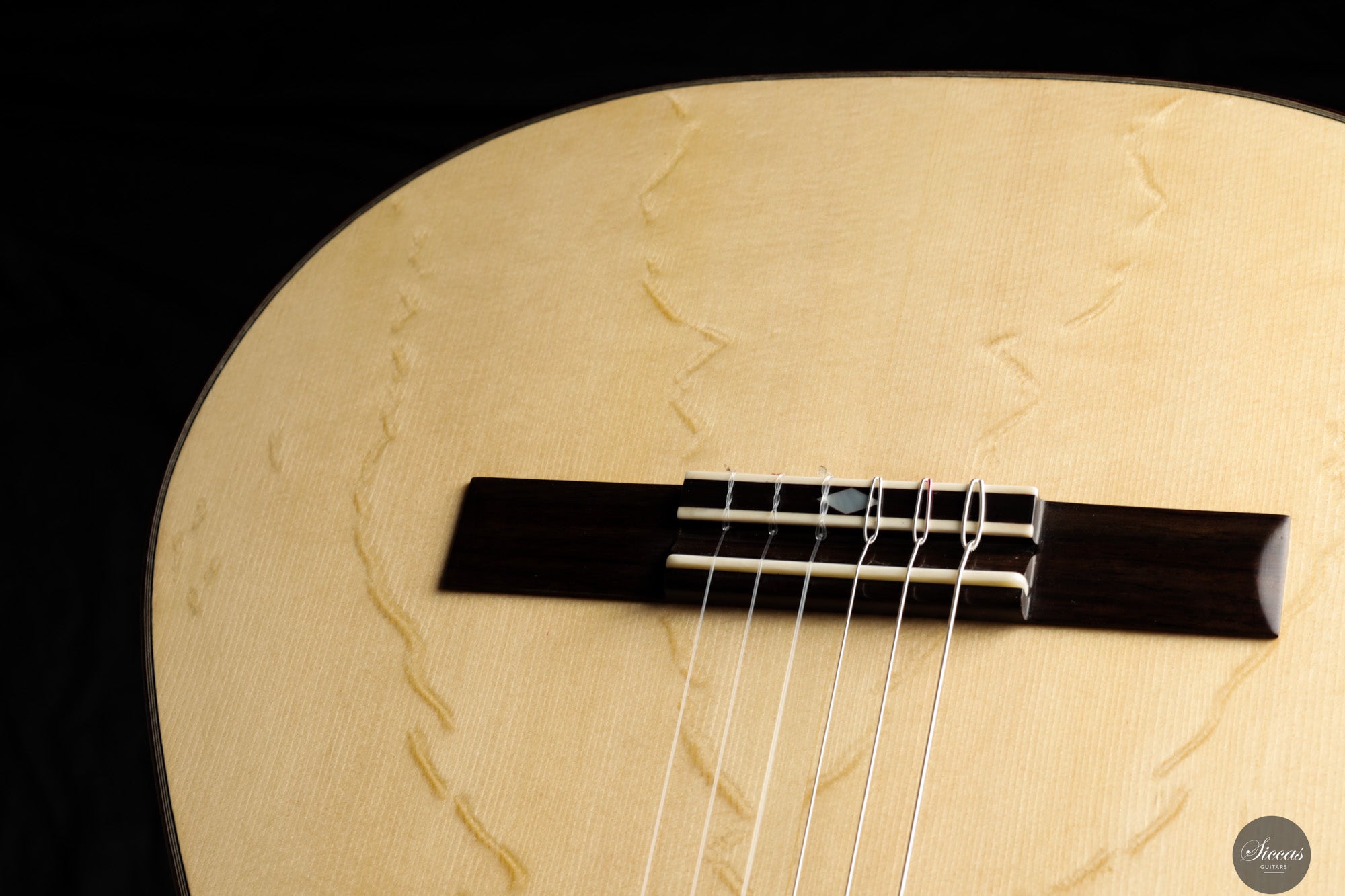 The No. 58 is a traditionally built concert guitar crafted in 2025, featuring a spruce top and Indian rosewood back and sides, finished in French polish. Weighing only 1435 grams, it is notably lightweight. The air body resonance lies between F♯ and G, supporting a warm, balanced core tone. A distinctive feature is its exceptionally comfortable neck, noted for its ease of play across all positions. Tonally, the guitar offers a soft attack and rounded timbre, with a gentle tonal character that leans toward warmth despite the spruce top. This guitar rewards nuanced phrasing and long practice sessions, making it a refined option for both students and professionals seeking an understated yet expressive instrument.