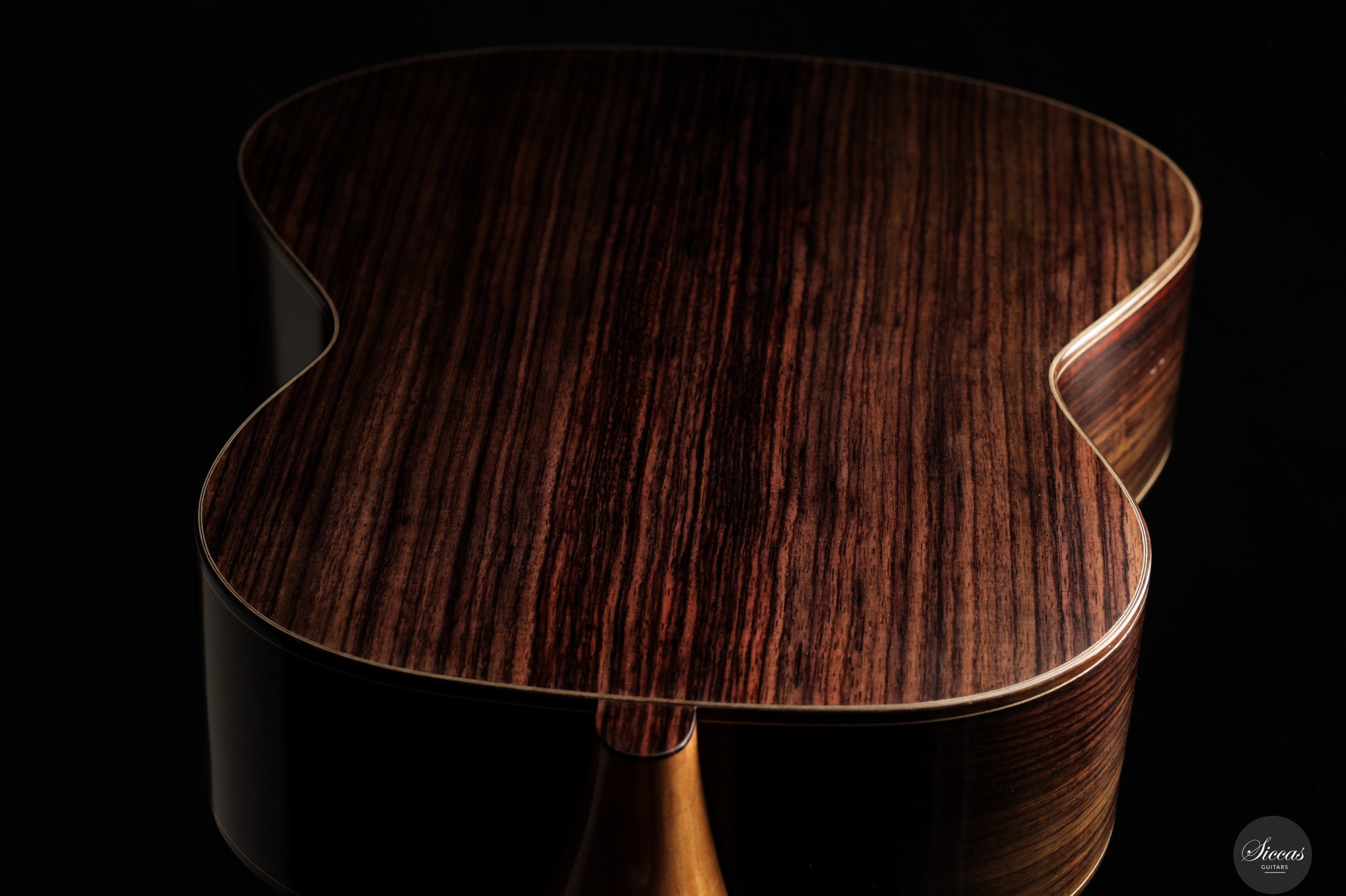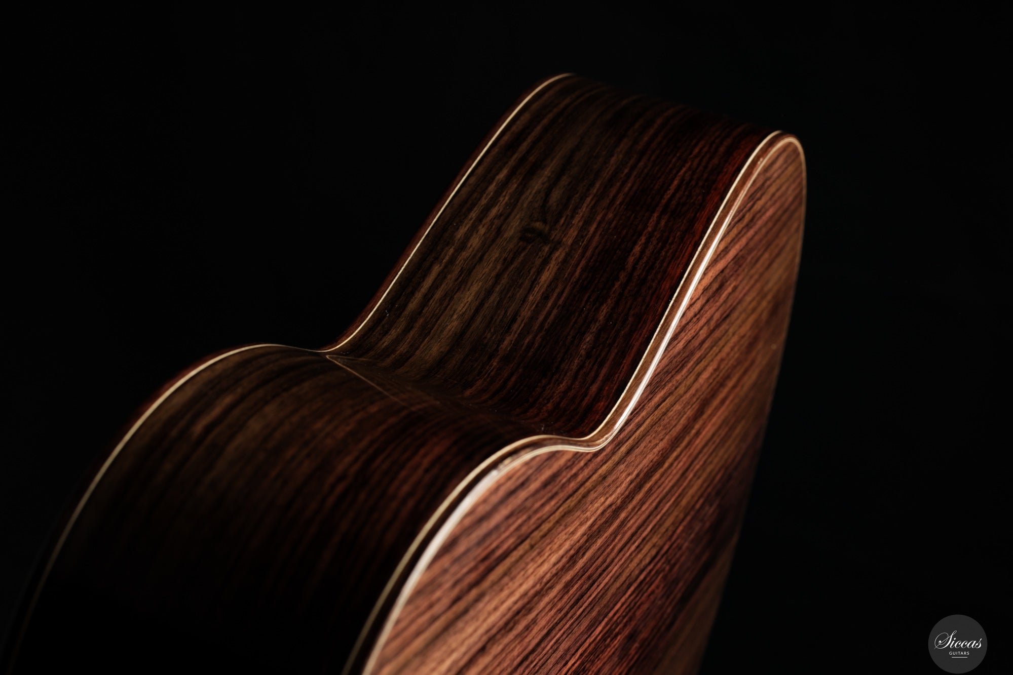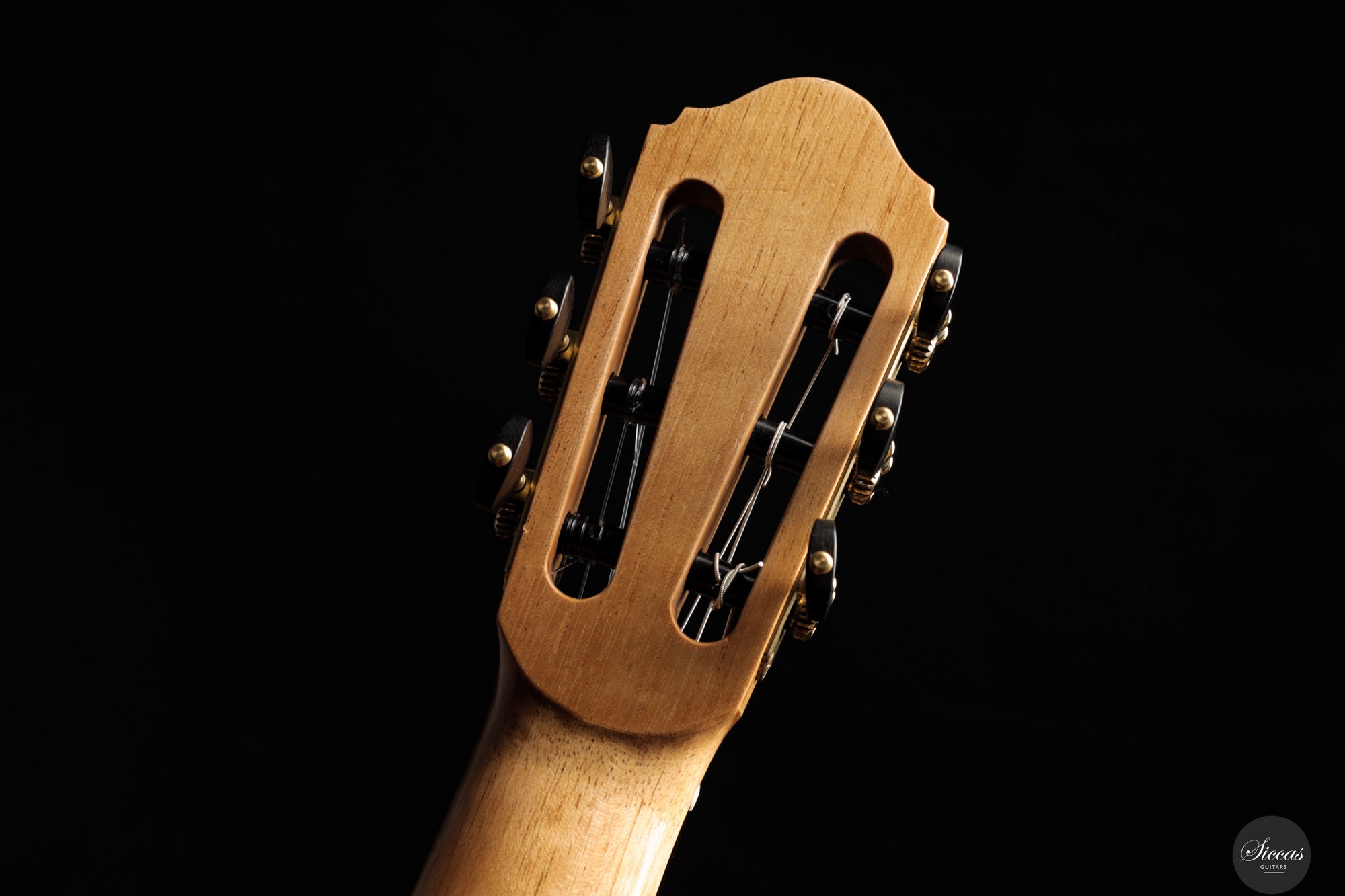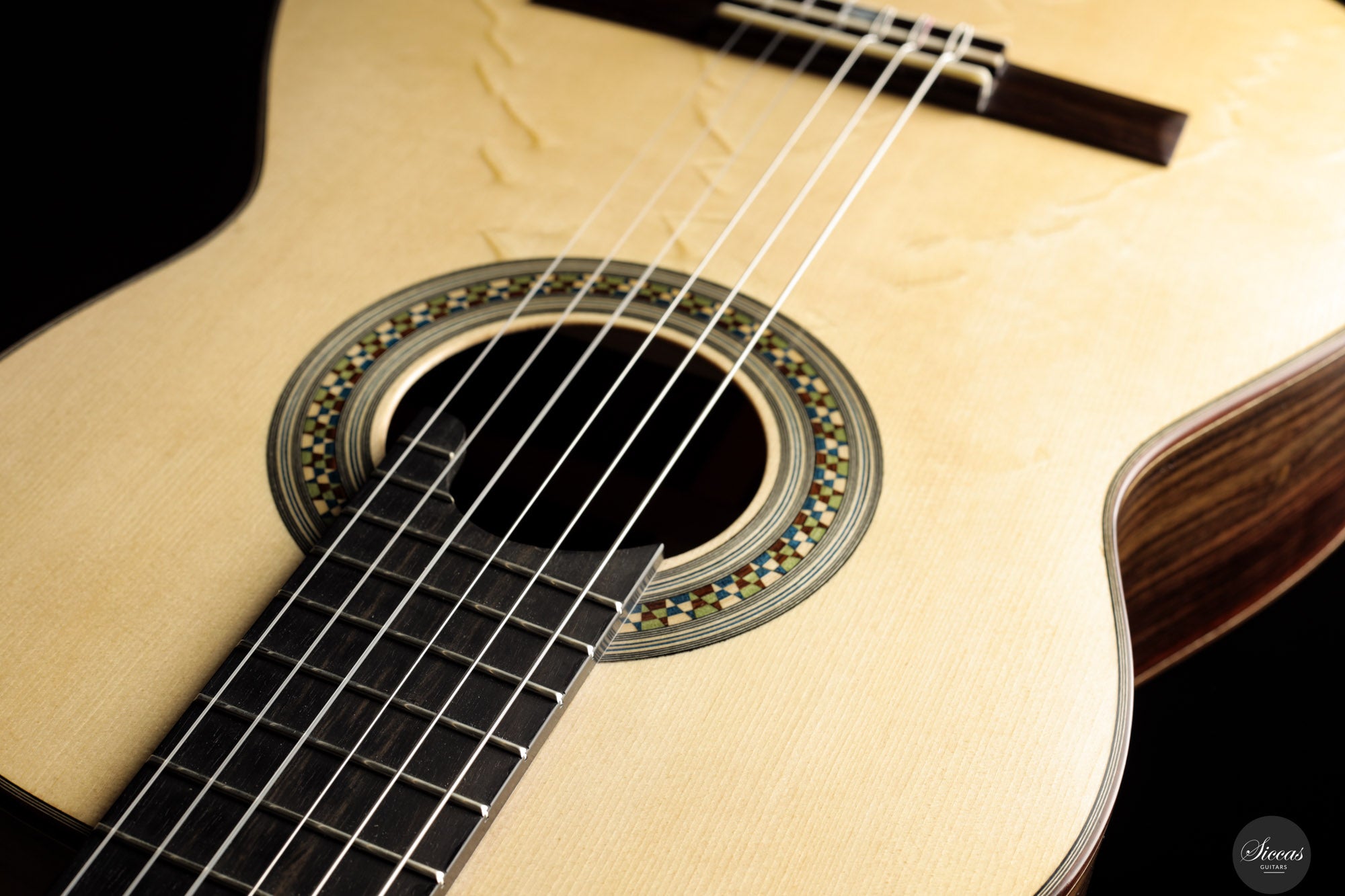 The No. 58 is a traditionally built concert guitar crafted in 2025, featuring a spruce top and Indian rosewood back and sides, finished in French polish. Weighing only 1435 grams, it is notably lightweight. The air body resonance lies between F♯ and G, supporting a warm, balanced core tone. A distinctive feature is its exceptionally comfortable neck, noted for its ease of play across all positions. Tonally, the guitar offers a soft attack and rounded timbre, with a gentle tonal character that leans toward warmth despite the spruce top. This guitar rewards nuanced phrasing and long practice sessions, making it a refined option for both students and professionals seeking an understated yet expressive instrument.