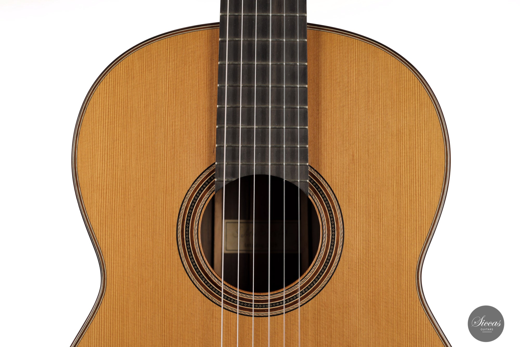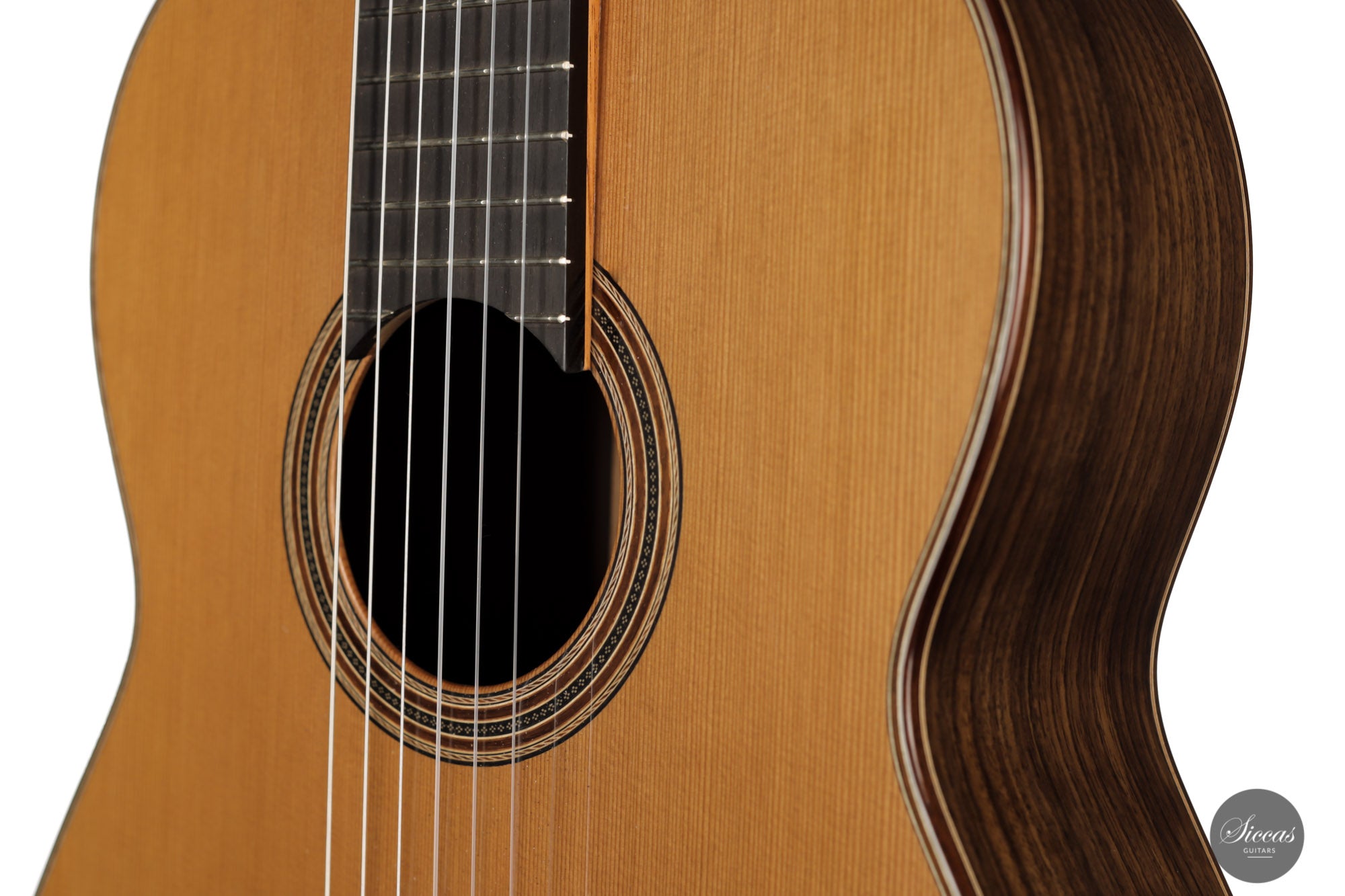 As typical of Nils Schebesta's guitars, this instrument is lightweight, responsive, colorful in sound, and distinctly comfortable to play. With this classic combination of cedar and Indian rosewood, Nils has built a guitar that excels in both sustain and projection while offering an interesting and multi-faceted warm tone. With its raised fingerboard, handmade narrow rosette, and excellent french polish, this modern guitar also has all the features of a great concert instrument.