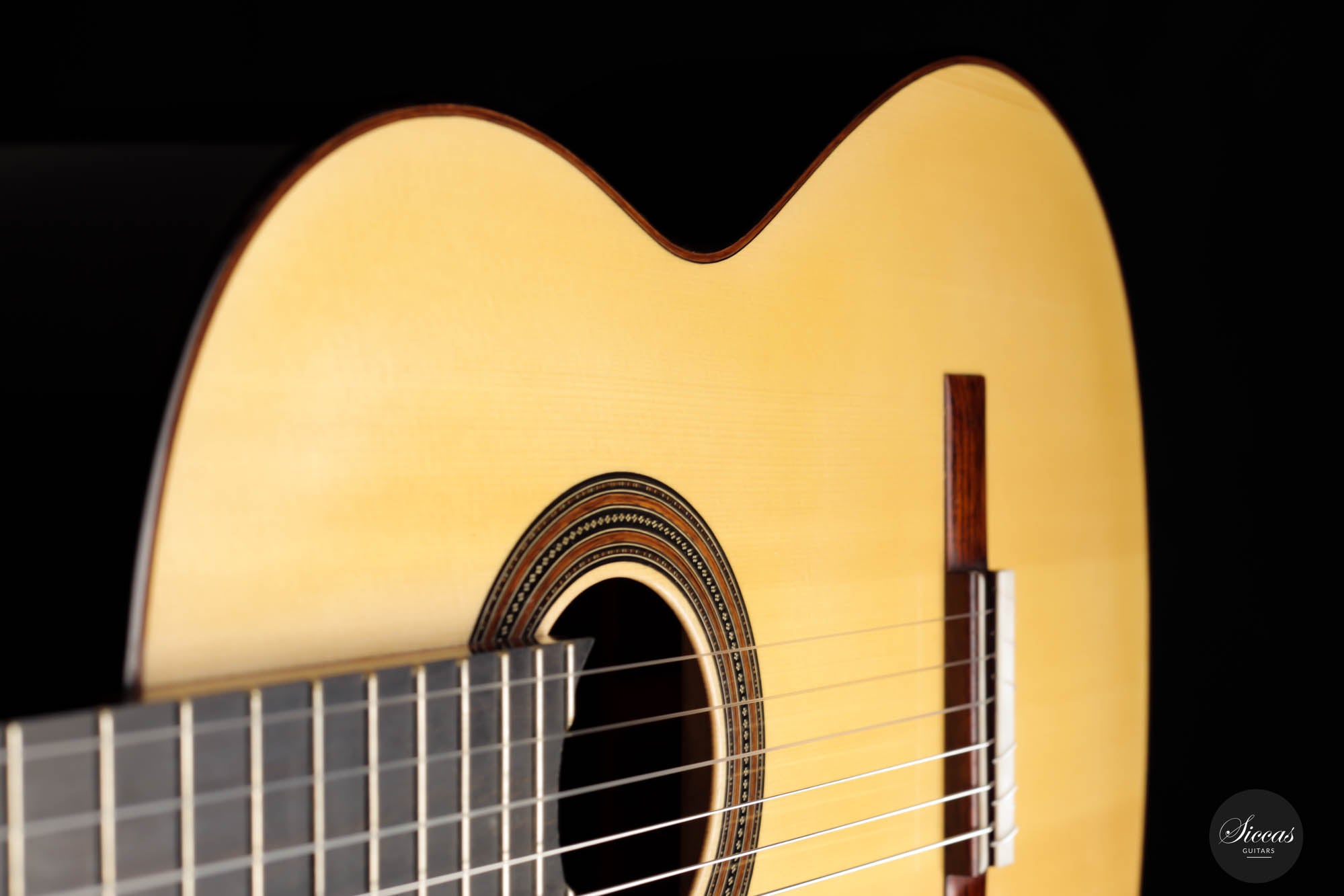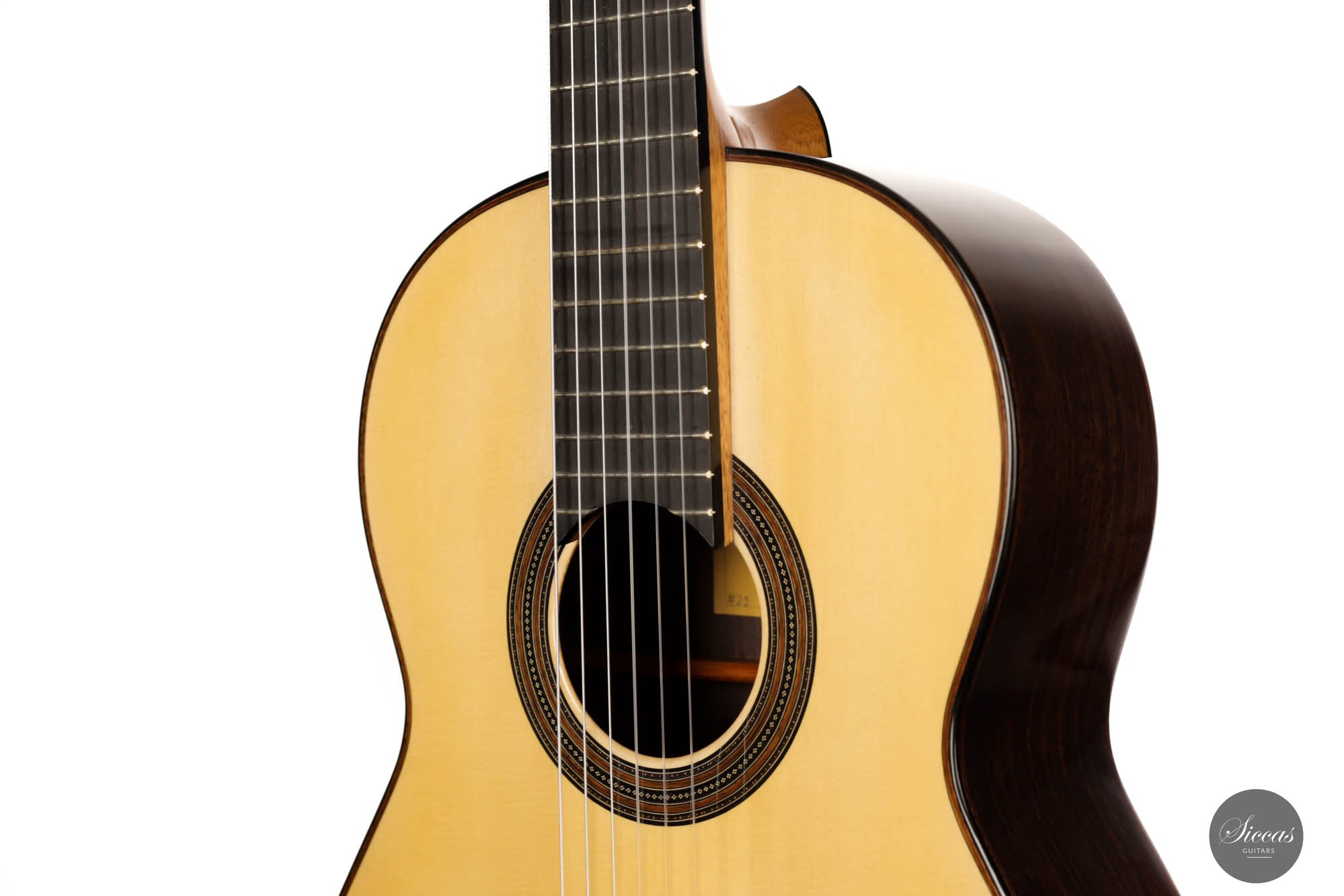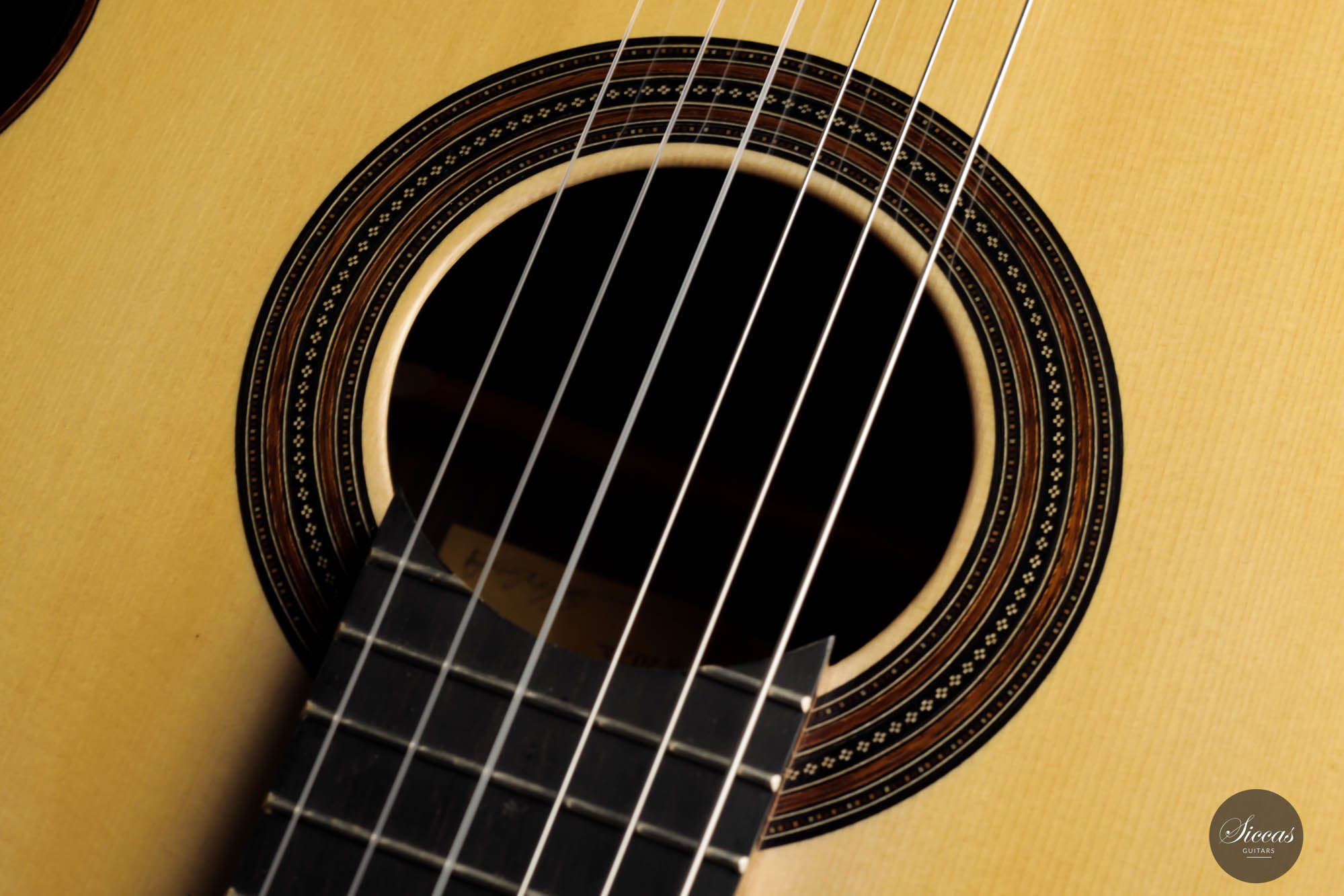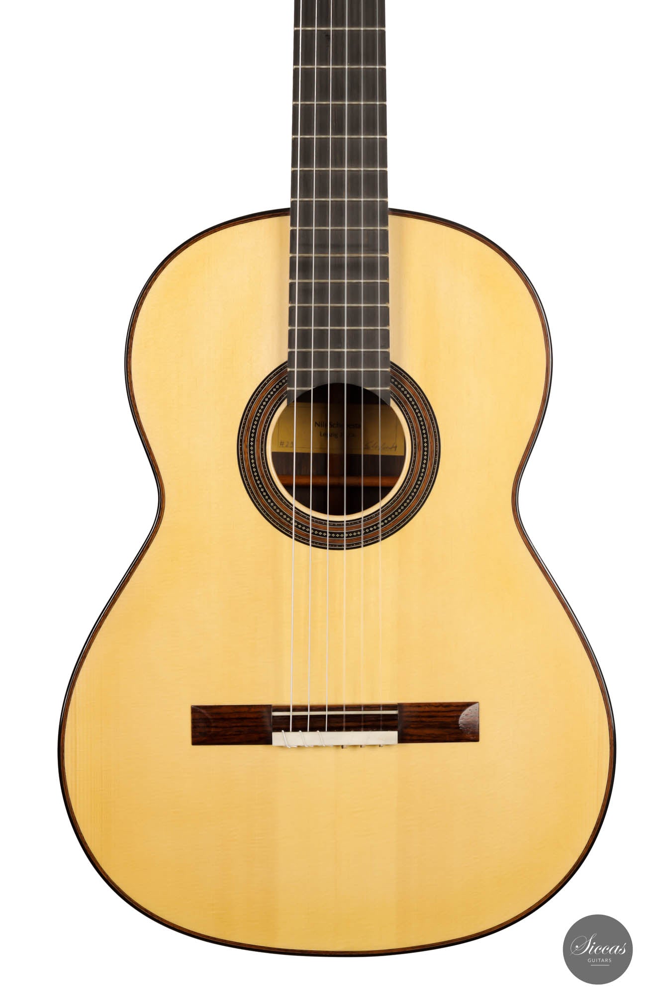 This Nils Schebesta guitar, No. 29, is an avant-garde concert instrument designed with a fresh and inventive approach. Created with a dedication to innovation and quality, this guitar is built for the modern performer seeking a unique musical experience. The guitar's body is constructed from spruce for the top and Indian rosewood for the back and sides, a traditional yet effective pairing of tonewoods. The spruce top delivers a vibrant, responsive tone, while the Indian rosewood back and sides add a warm, full-bodied resonance to the overall sound. This instrument bears the mark of masterful craftsmanship, with careful attention to detail visible in the beautifully crafted purfling and rosette. Each feature is meticulously designed and executed, adding a layer of visual sophistication complemented by the guitar's tonal excellence. The sound produced by this Schebesta is a testament to its exceptional construction. The guitar delivers crisp, resonant basses that effortlessly contrast with the sweet, airy treble notes, making every note a delight for the ears. This auditory experience and the guitar’ make it a genuine pleasure to play. The guitar's playability is further enhanced by a thoughtfully shaped neck designed for optimal comfort and ease of movement. This allows for smoother transitions and more precise articulation, satisfying the demands of the most discerning players. The guitar's soundboard is reinforced with five fan braces, each meticulously tuned to ensure a balanced tone and facilitate right-hand playability. This bracing system helps control the vibration of the soundboard, influencing the guitar's tone and response. These fan braces contribute to the instrument's exceptional balance and playability by harmonizing the guitar's structural stability and sonic properties.