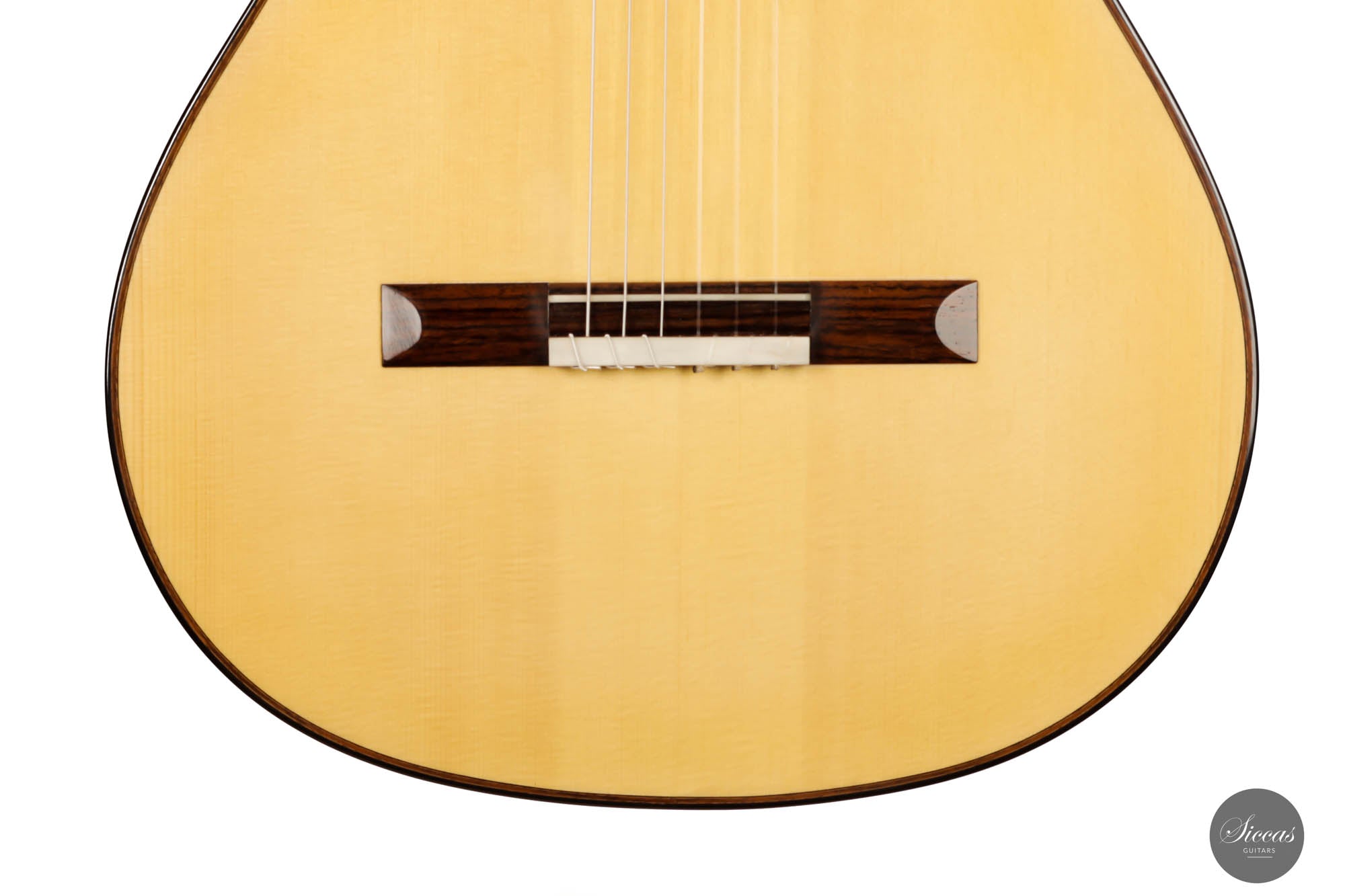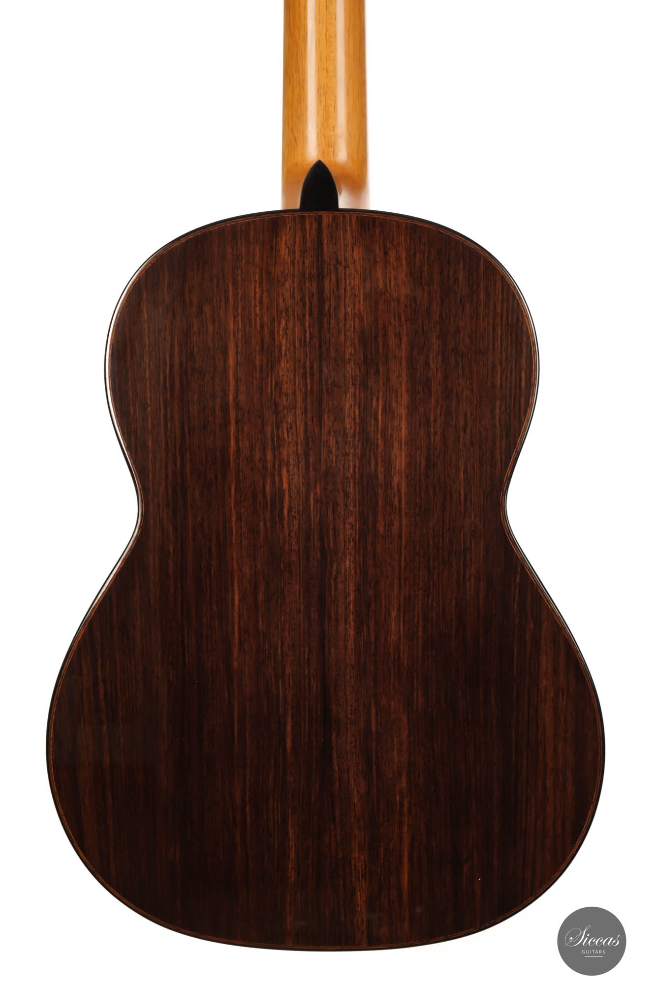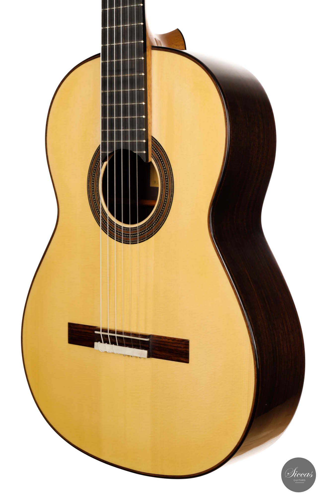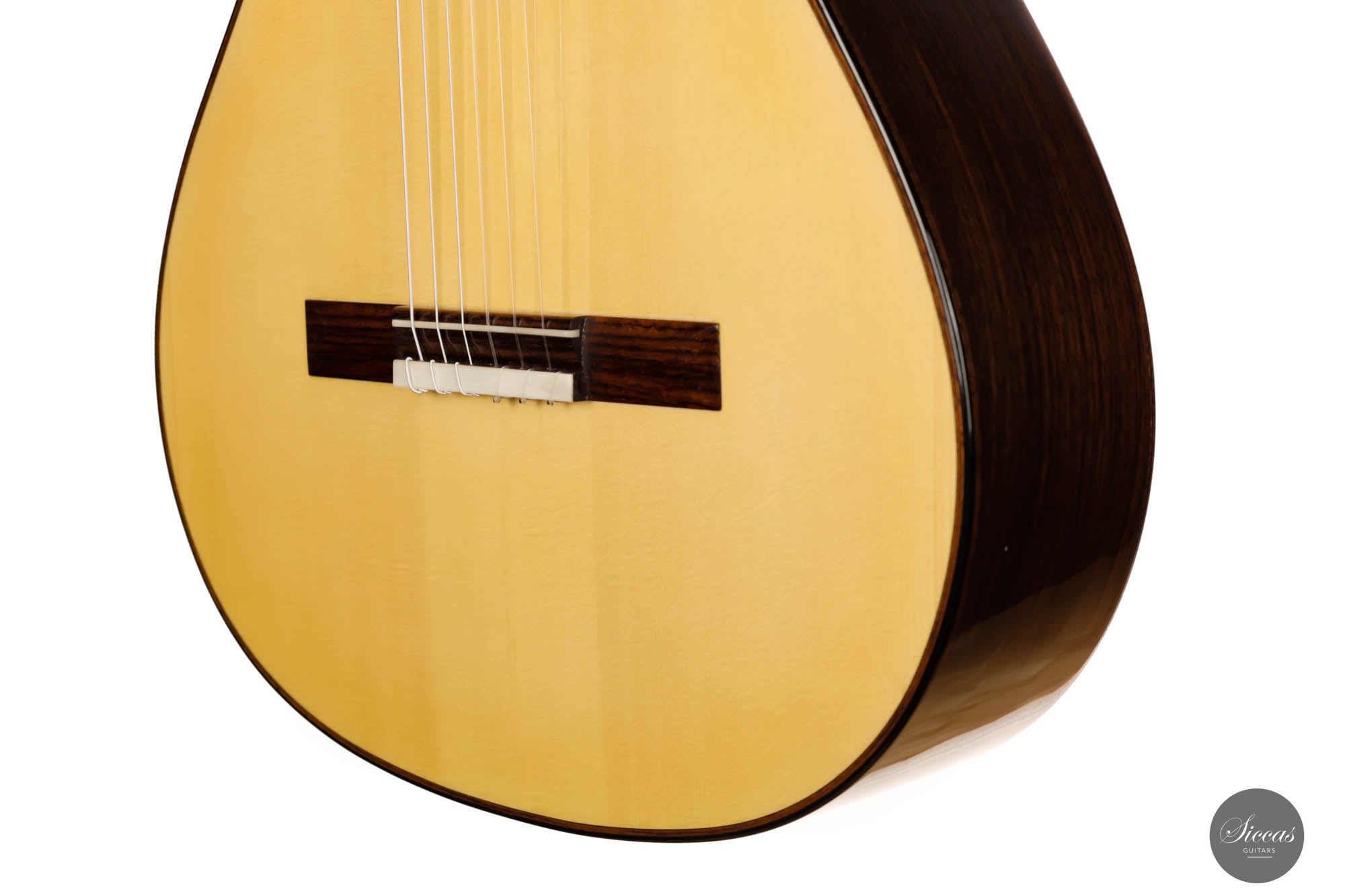 This Nils Schebesta guitar, No. 29, is an avant-garde concert instrument designed with a fresh and inventive approach. Created with a dedication to innovation and quality, this guitar is built for the modern performer seeking a unique musical experience. The guitar's body is constructed from spruce for the top and Indian rosewood for the back and sides, a traditional yet effective pairing of tonewoods. The spruce top delivers a vibrant, responsive tone, while the Indian rosewood back and sides add a warm, full-bodied resonance to the overall sound. This instrument bears the mark of masterful craftsmanship, with careful attention to detail visible in the beautifully crafted purfling and rosette. Each feature is meticulously designed and executed, adding a layer of visual sophistication complemented by the guitar's tonal excellence. The sound produced by this Schebesta is a testament to its exceptional construction. The guitar delivers crisp, resonant basses that effortlessly contrast with the sweet, airy treble notes, making every note a delight for the ears. This auditory experience and the guitar’ make it a genuine pleasure to play. The guitar's playability is further enhanced by a thoughtfully shaped neck designed for optimal comfort and ease of movement. This allows for smoother transitions and more precise articulation, satisfying the demands of the most discerning players. The guitar's soundboard is reinforced with five fan braces, each meticulously tuned to ensure a balanced tone and facilitate right-hand playability. This bracing system helps control the vibration of the soundboard, influencing the guitar's tone and response. These fan braces contribute to the instrument's exceptional balance and playability by harmonizing the guitar's structural stability and sonic properties.