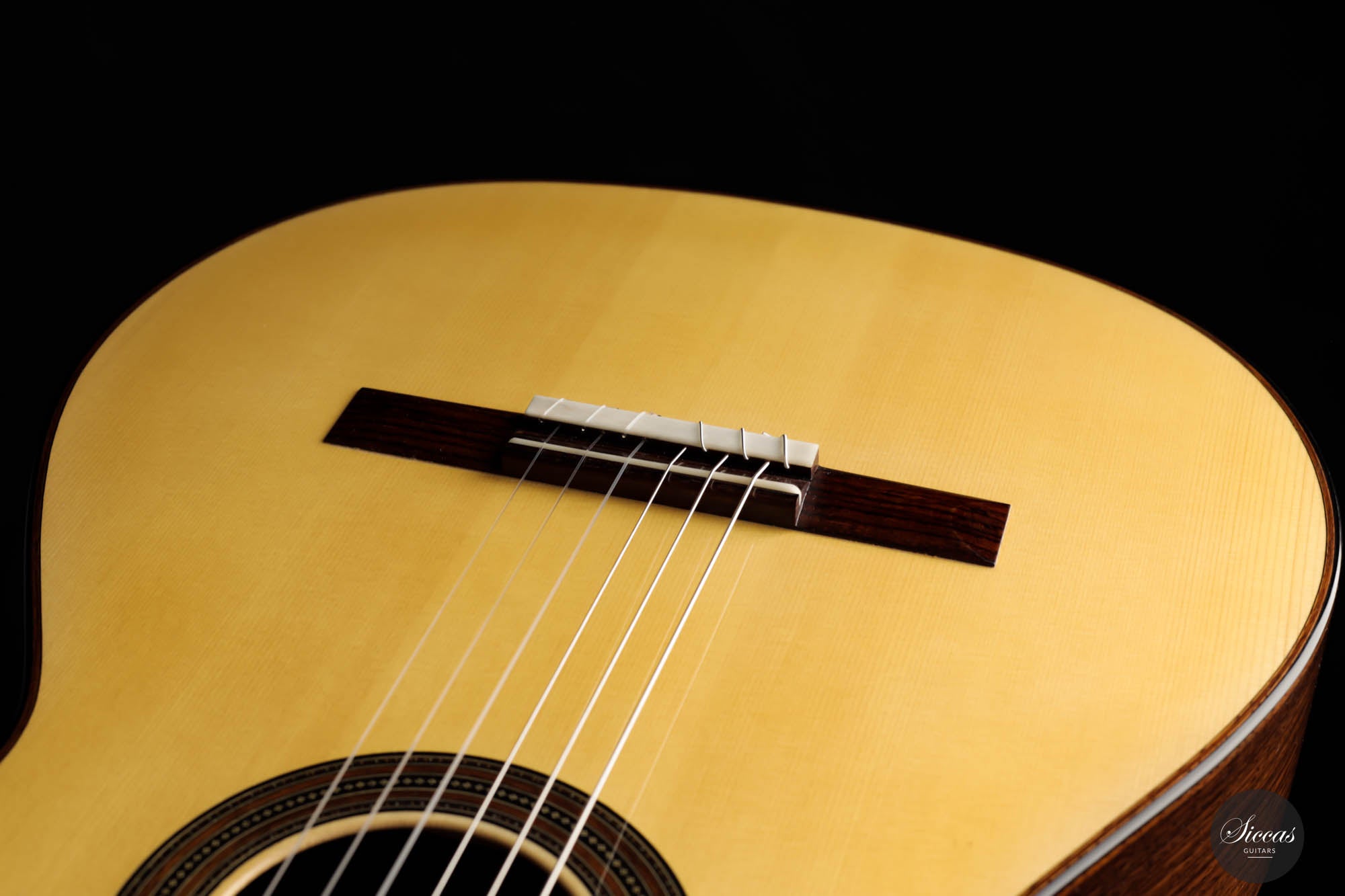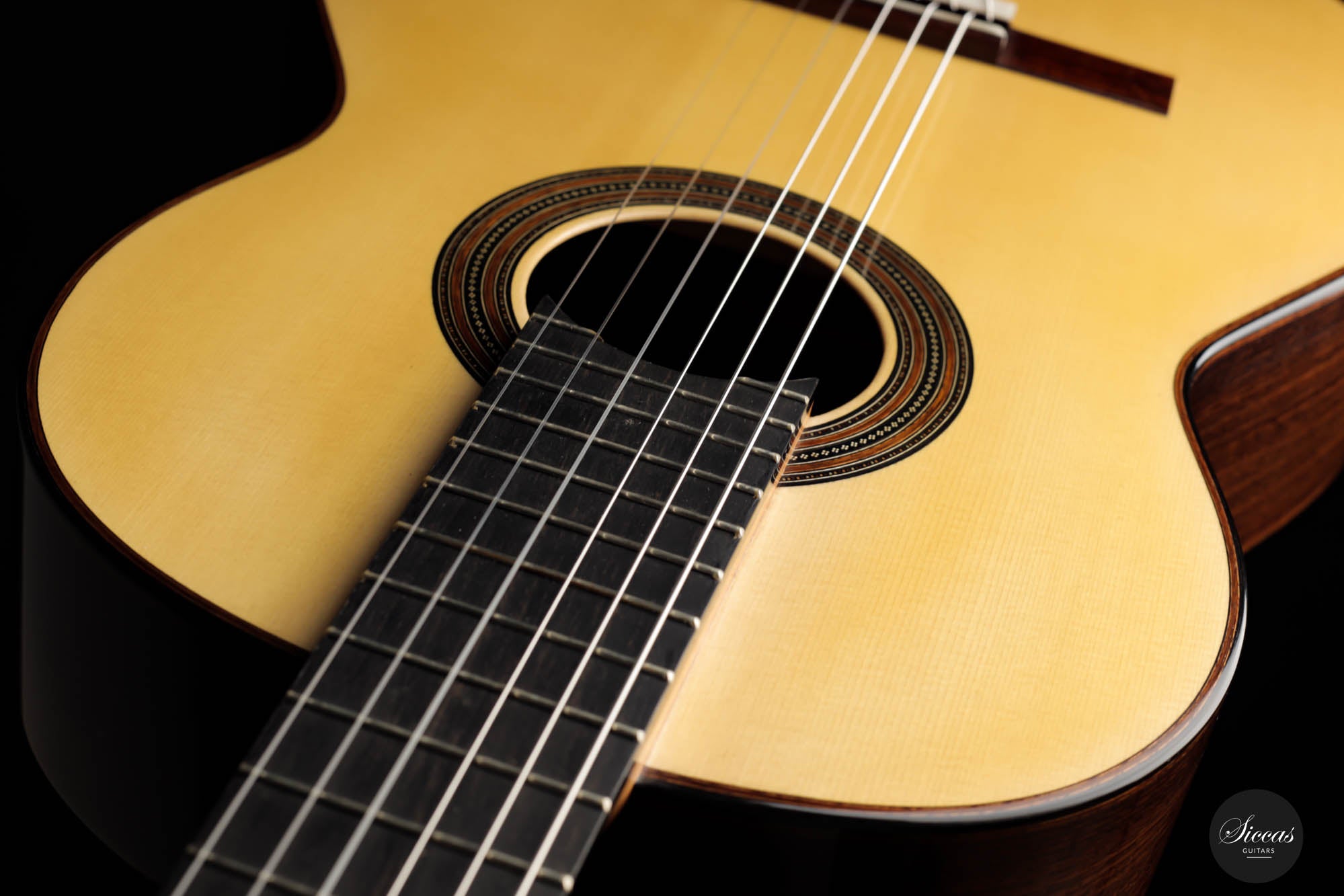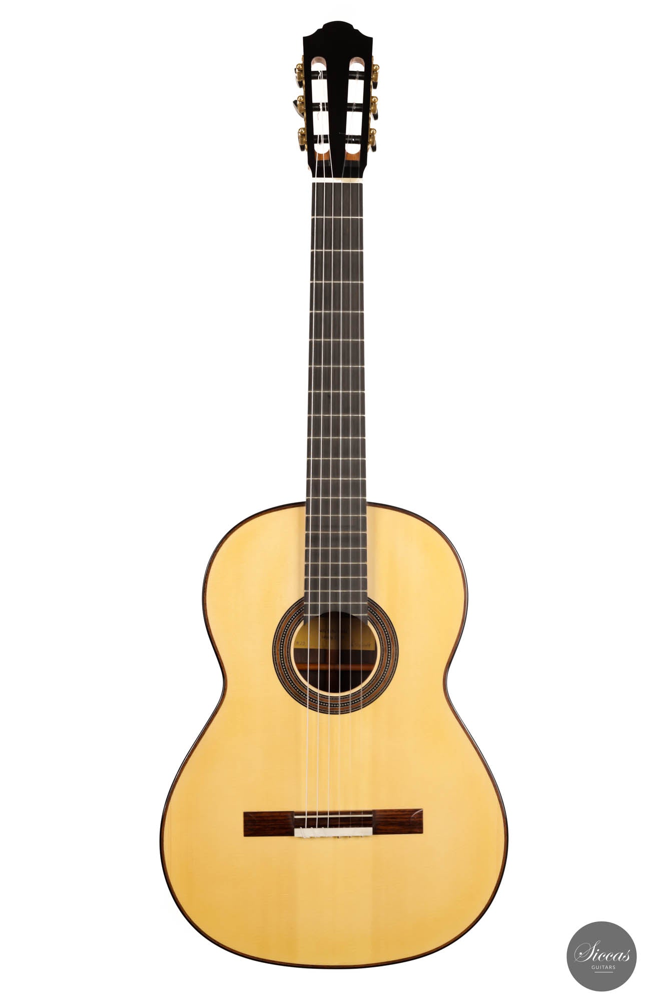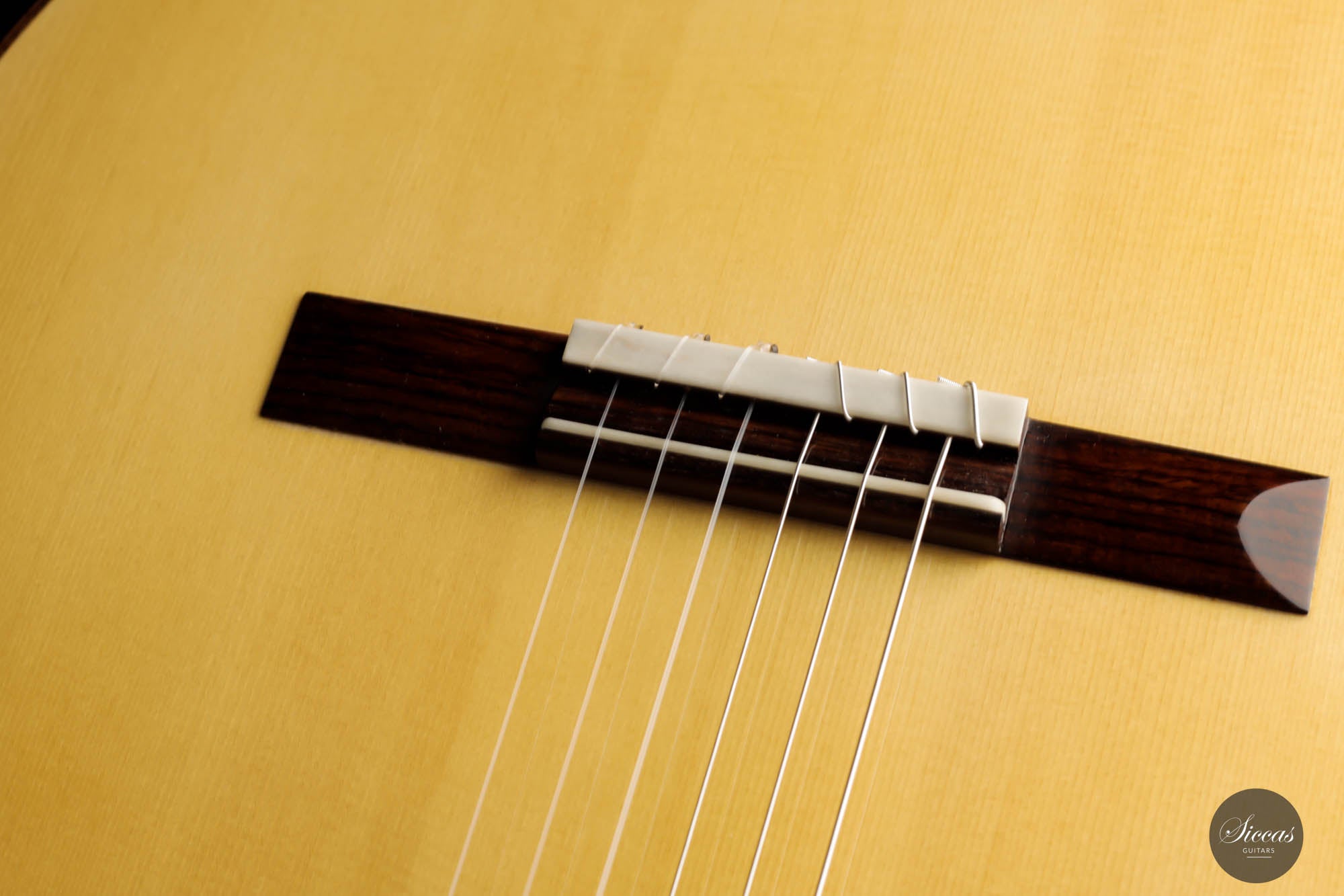 This Nils Schebesta guitar, No. 29, is an avant-garde concert instrument designed with a fresh and inventive approach. Created with a dedication to innovation and quality, this guitar is built for the modern performer seeking a unique musical experience. The guitar's body is constructed from spruce for the top and Indian rosewood for the back and sides, a traditional yet effective pairing of tonewoods. The spruce top delivers a vibrant, responsive tone, while the Indian rosewood back and sides add a warm, full-bodied resonance to the overall sound. This instrument bears the mark of masterful craftsmanship, with careful attention to detail visible in the beautifully crafted purfling and rosette. Each feature is meticulously designed and executed, adding a layer of visual sophistication complemented by the guitar's tonal excellence. The sound produced by this Schebesta is a testament to its exceptional construction. The guitar delivers crisp, resonant basses that effortlessly contrast with the sweet, airy treble notes, making every note a delight for the ears. This auditory experience and the guitar’ make it a genuine pleasure to play. The guitar's playability is further enhanced by a thoughtfully shaped neck designed for optimal comfort and ease of movement. This allows for smoother transitions and more precise articulation, satisfying the demands of the most discerning players. The guitar's soundboard is reinforced with five fan braces, each meticulously tuned to ensure a balanced tone and facilitate right-hand playability. This bracing system helps control the vibration of the soundboard, influencing the guitar's tone and response. These fan braces contribute to the instrument's exceptional balance and playability by harmonizing the guitar's structural stability and sonic properties.