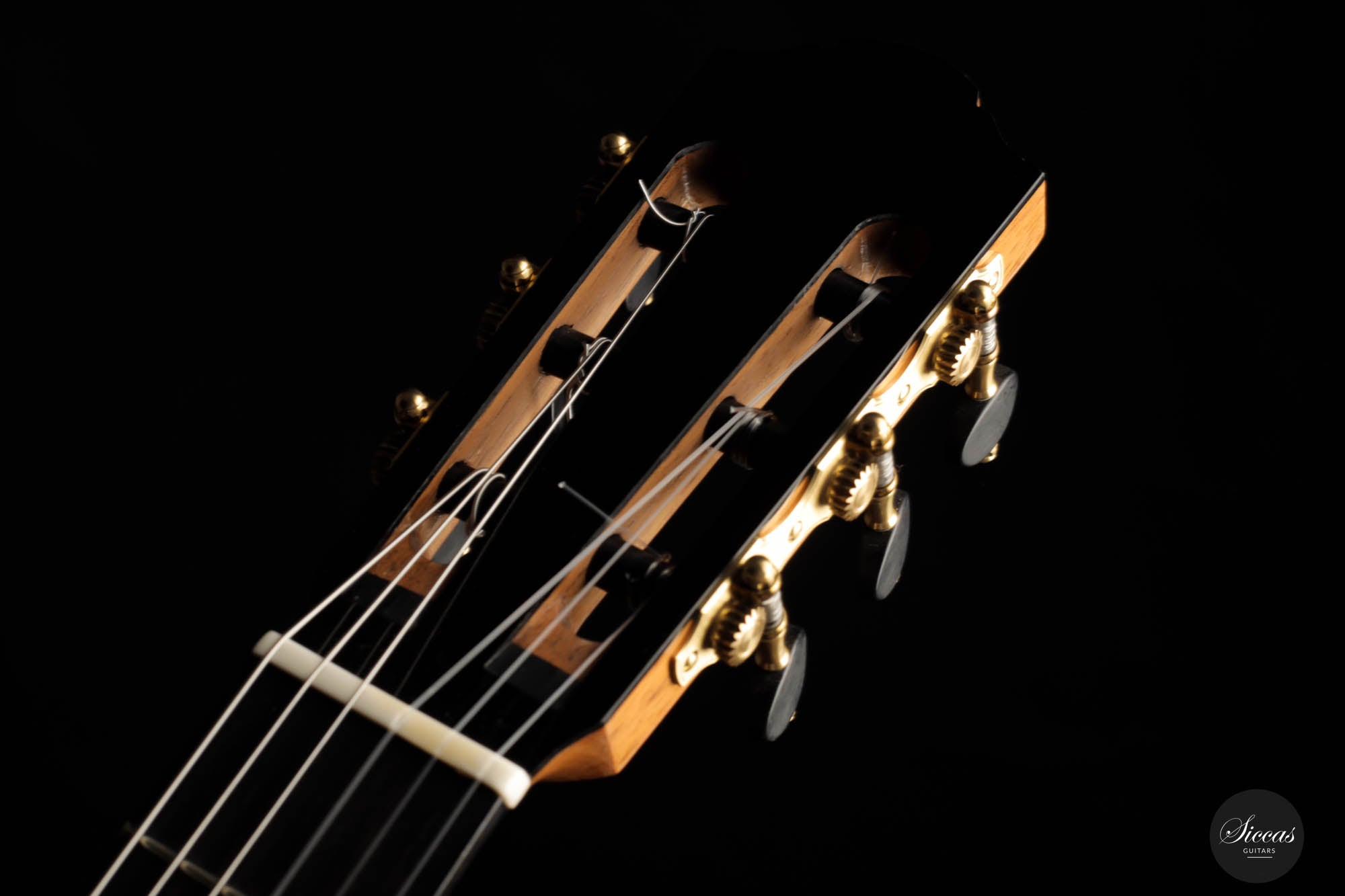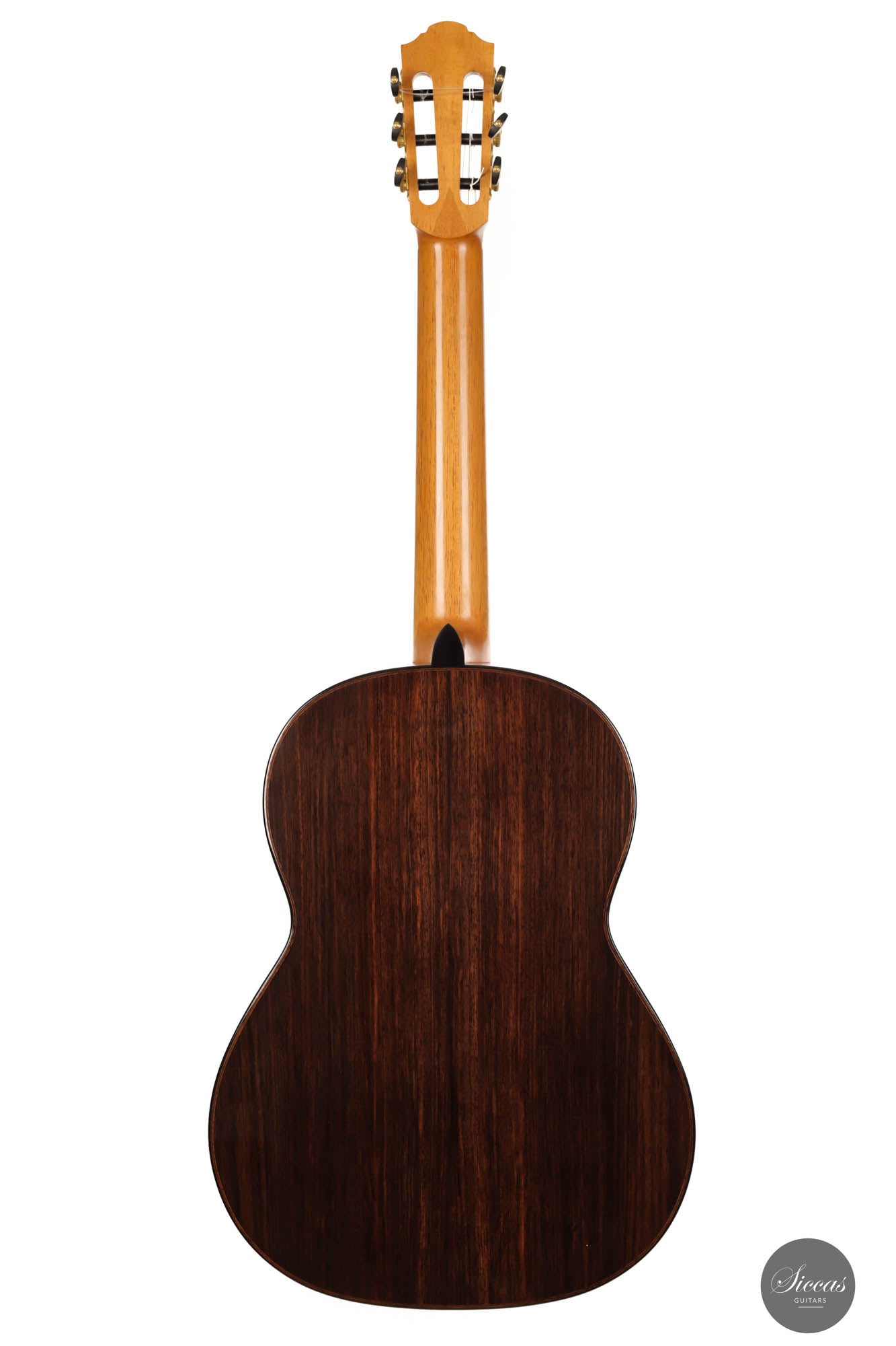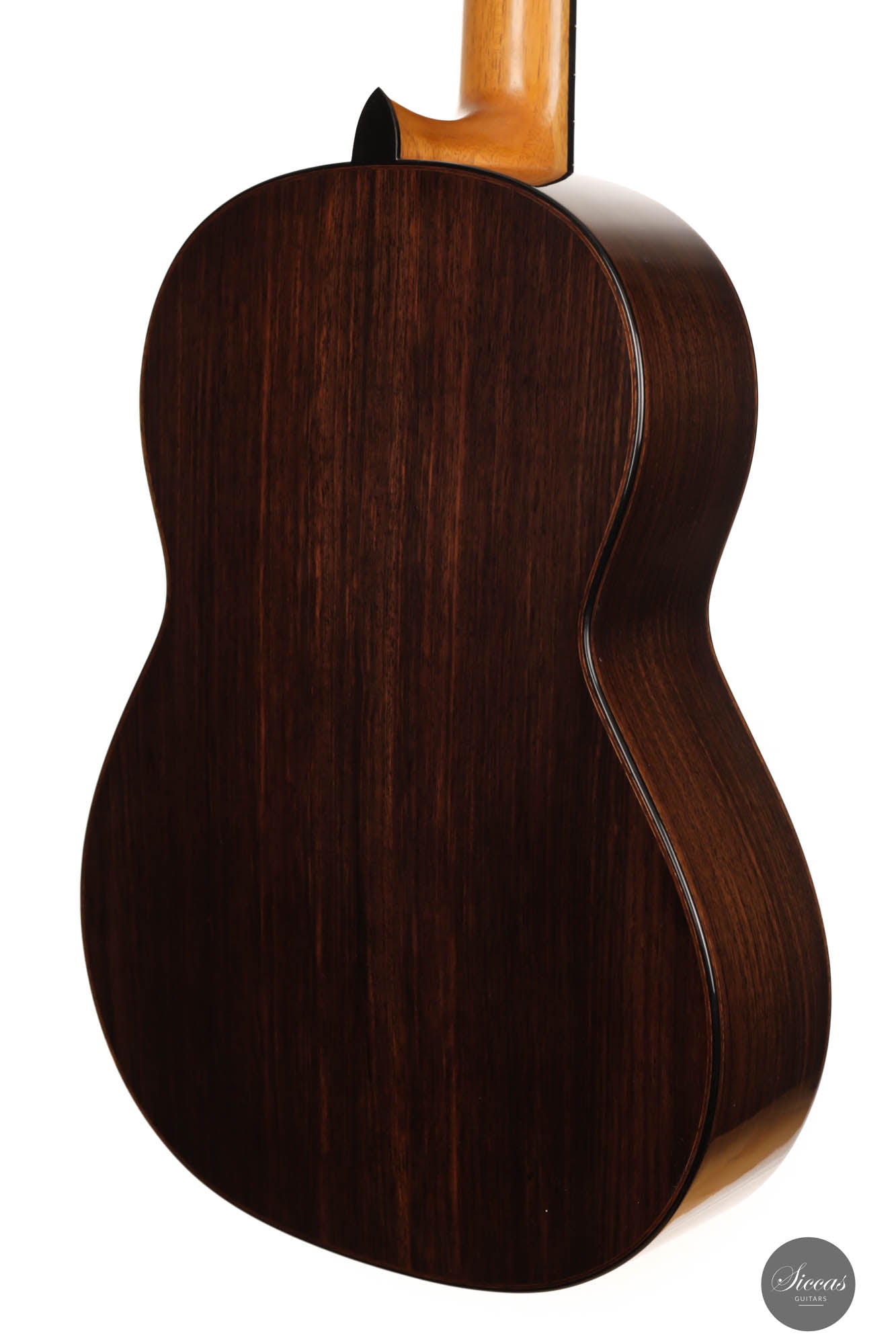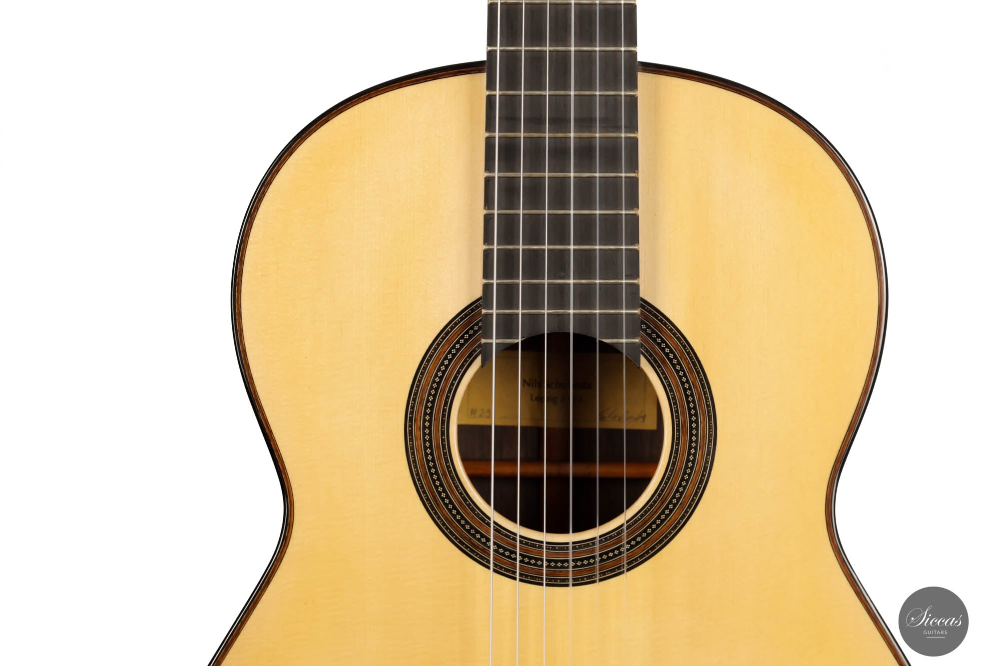 This Nils Schebesta guitar, No. 29, is an avant-garde concert instrument designed with a fresh and inventive approach. Created with a dedication to innovation and quality, this guitar is built for the modern performer seeking a unique musical experience. The guitar's body is constructed from spruce for the top and Indian rosewood for the back and sides, a traditional yet effective pairing of tonewoods. The spruce top delivers a vibrant, responsive tone, while the Indian rosewood back and sides add a warm, full-bodied resonance to the overall sound. This instrument bears the mark of masterful craftsmanship, with careful attention to detail visible in the beautifully crafted purfling and rosette. Each feature is meticulously designed and executed, adding a layer of visual sophistication complemented by the guitar's tonal excellence. The sound produced by this Schebesta is a testament to its exceptional construction. The guitar delivers crisp, resonant basses that effortlessly contrast with the sweet, airy treble notes, making every note a delight for the ears. This auditory experience and the guitar’ make it a genuine pleasure to play. The guitar's playability is further enhanced by a thoughtfully shaped neck designed for optimal comfort and ease of movement. This allows for smoother transitions and more precise articulation, satisfying the demands of the most discerning players. The guitar's soundboard is reinforced with five fan braces, each meticulously tuned to ensure a balanced tone and facilitate right-hand playability. This bracing system helps control the vibration of the soundboard, influencing the guitar's tone and response. These fan braces contribute to the instrument's exceptional balance and playability by harmonizing the guitar's structural stability and sonic properties.
