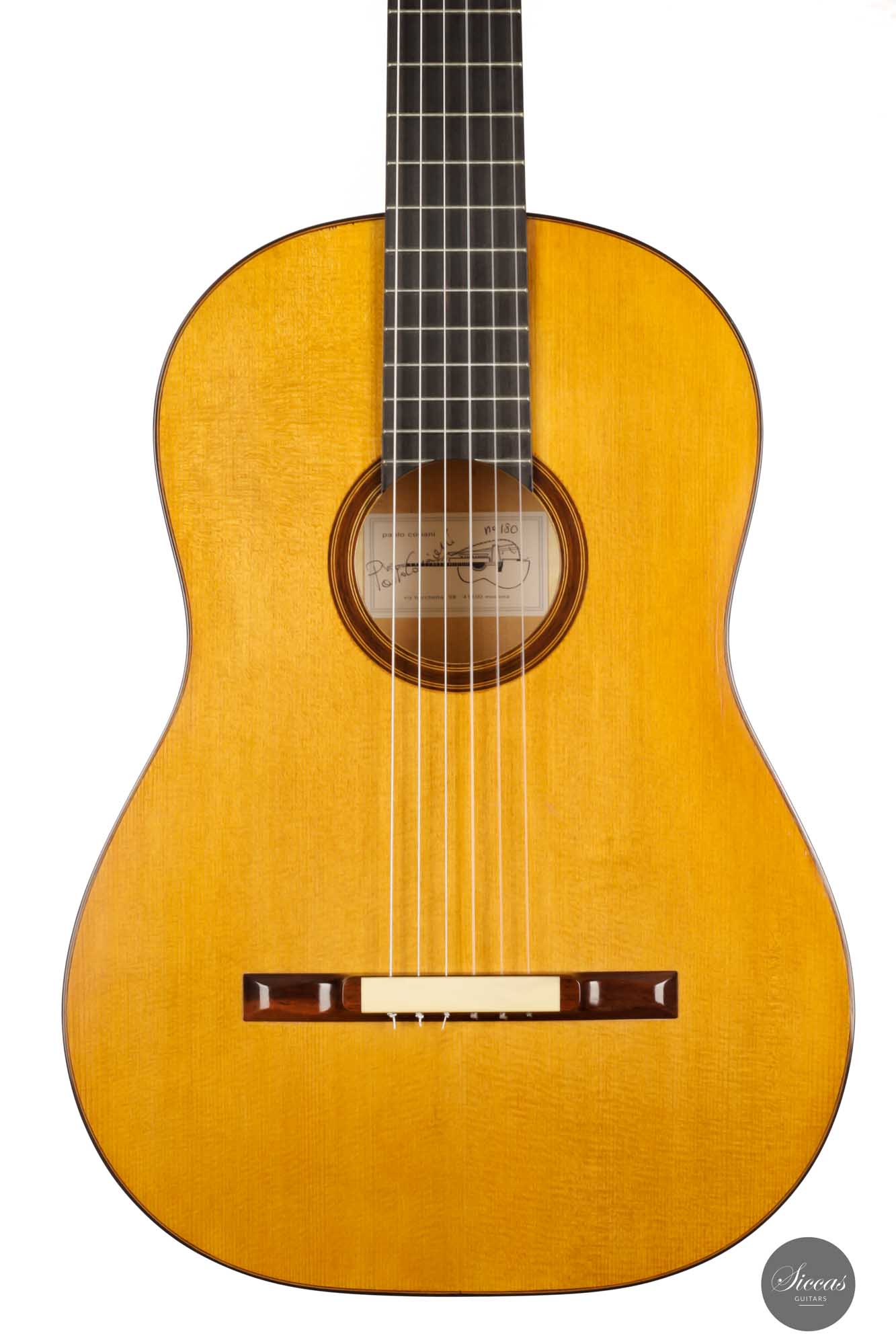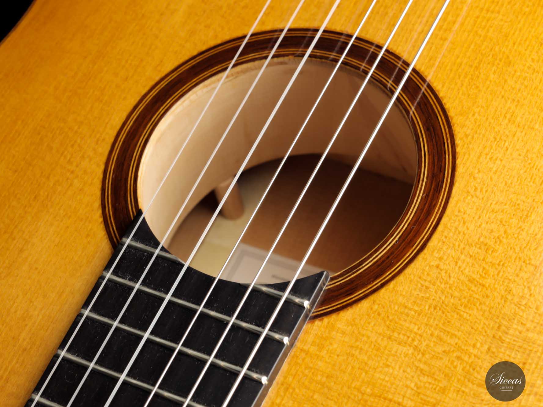 This wonderful La Leona model instrument was built in 2010, using a cypress back (three parts) and sides like the original instrument. The original 'La Leona' (FE 04) is the 4th guitar made by Antonio de Torres and is considered one of the best guitars he ever made. It was commissioned by the famous guitarist Julián Arcas in 1850 and finished by Torres in 1856. Paolo also reproduced the shape of the original bridge. Instead of using brass Tornavoz, this beautiful guitar has a wooden Tornavoz, bringing the instrument's weight to only 1150 grams. With the primary resonance between D and D#, this instrument produces remarkably deep and resonant basses. The mids and trebles have an ample sound and harmonize beautifully with the basses, making for a genuinely old-world sound character. This outstanding guitar is in excellent condition with very light playing marks. This exceptional replica is an instrument that will bring joy and satisfaction to any modern guitarist.
