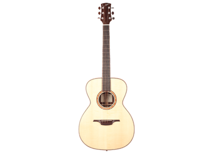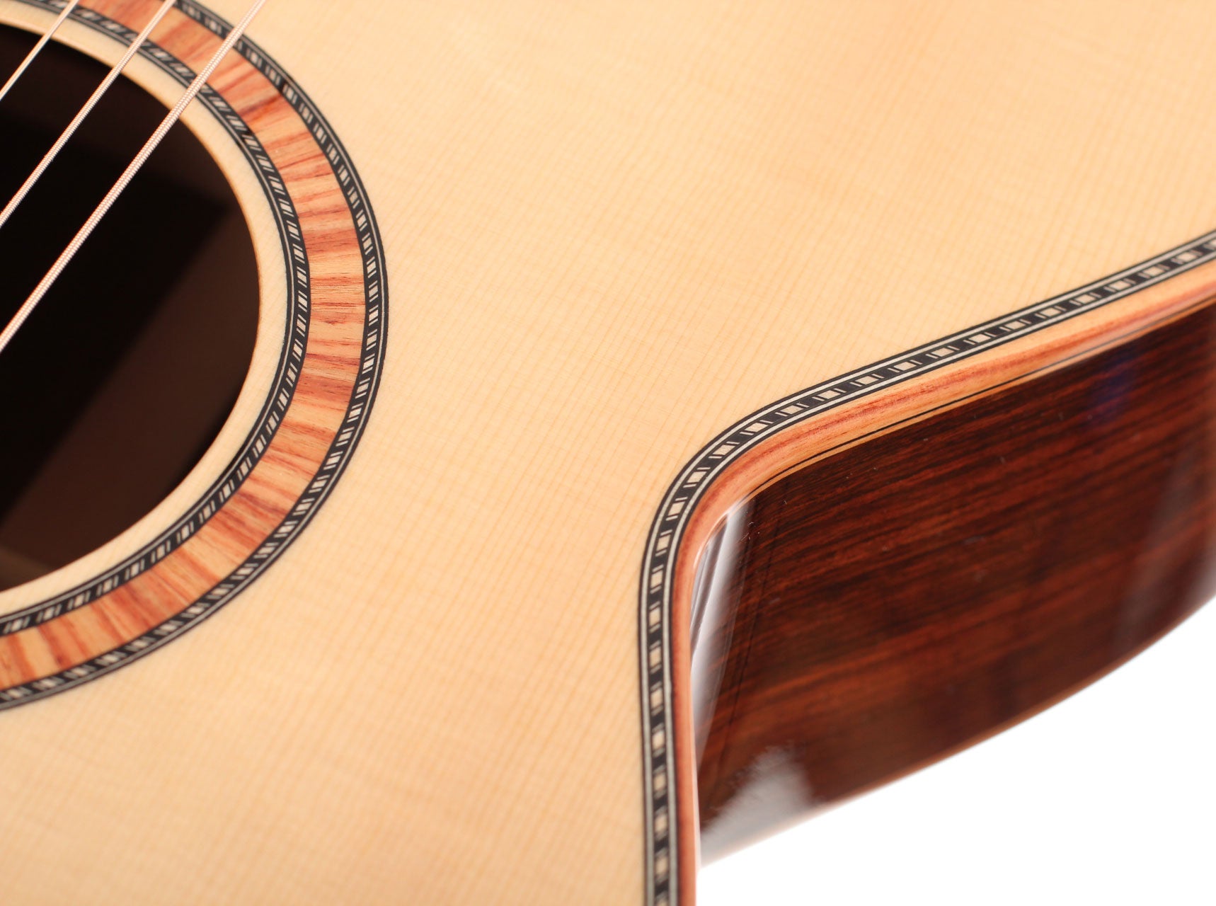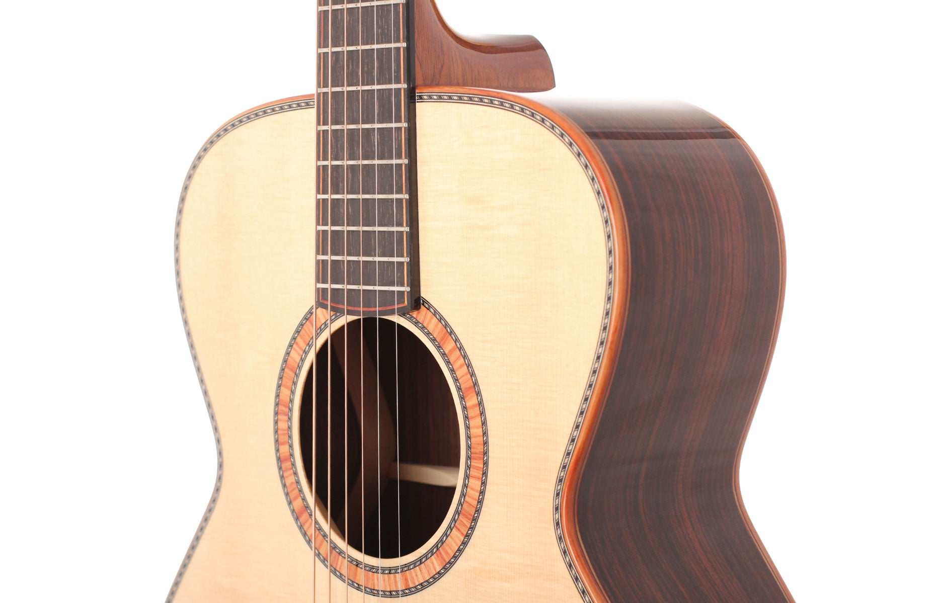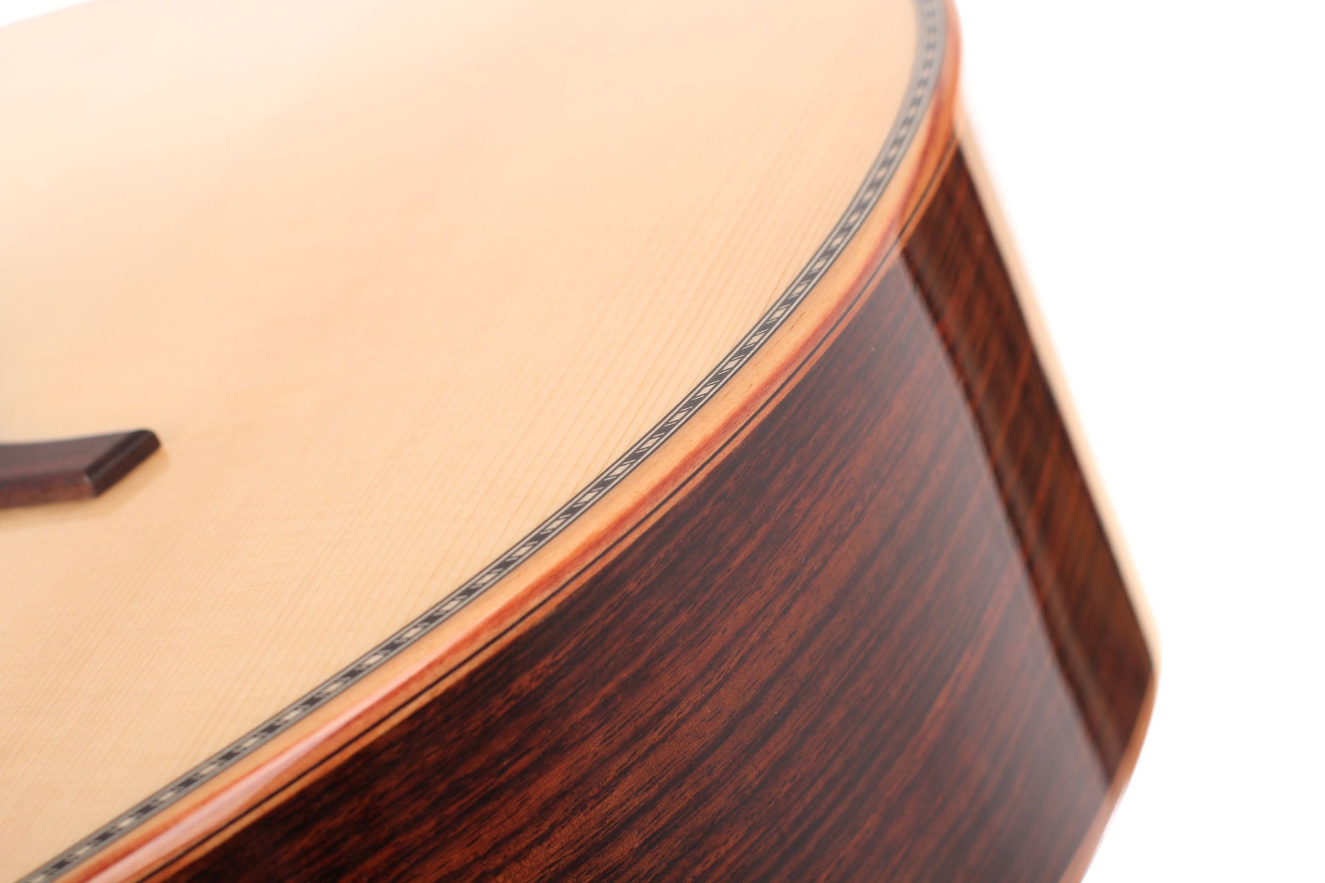 This OM-model has a very differentiated sound, caused by the shape and the wood selection. The Indian Rosewood gives a classical modest look and a very balanced color of sound. The top is made of fine Alpine Spruce and provided with a scalloped x-bracing. Though relatively small and handy, this guitar still has a powerful sound due to the fastidious elaboration of the top. The mahogany neck is very comfortable to play.