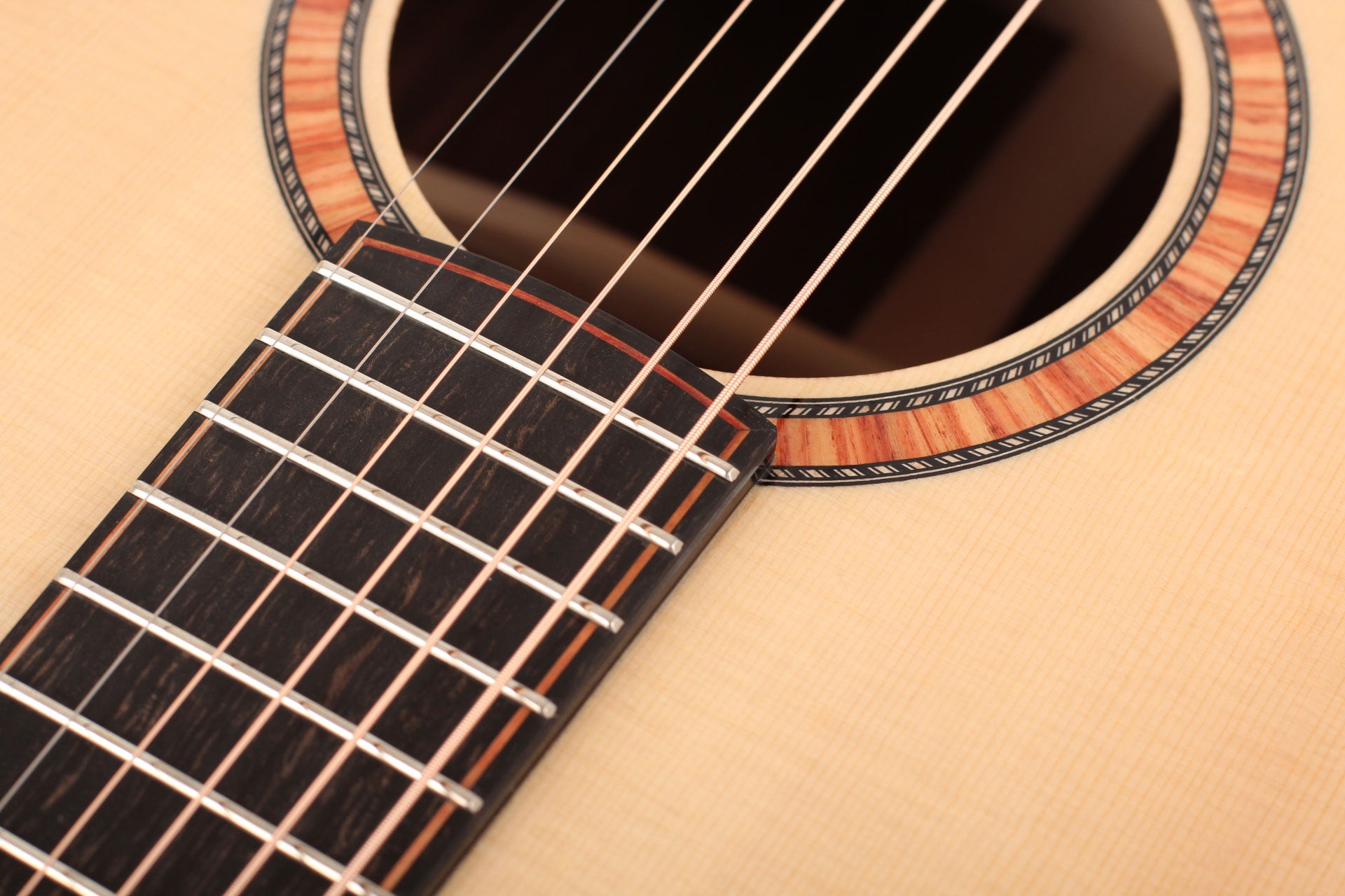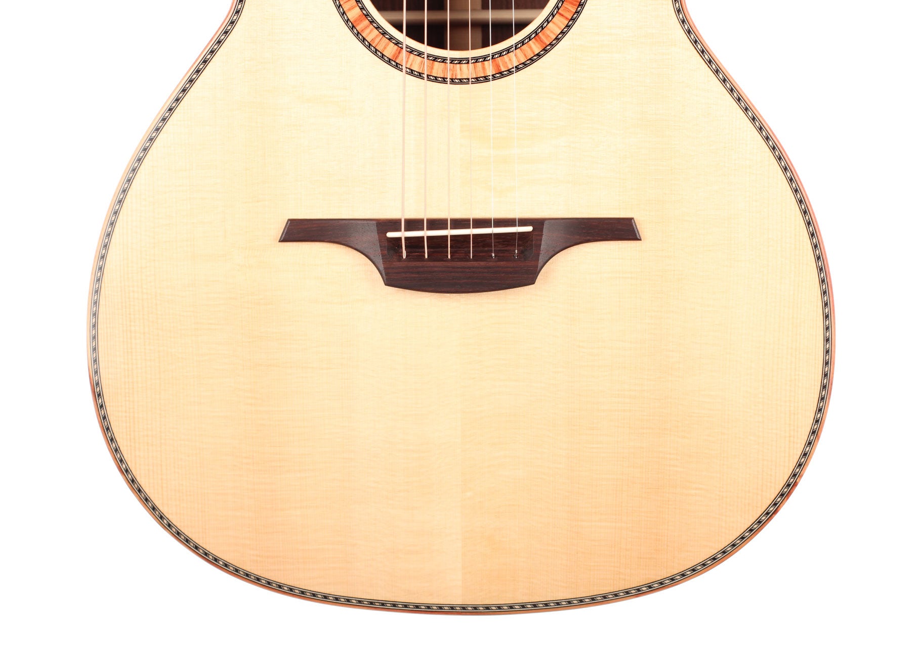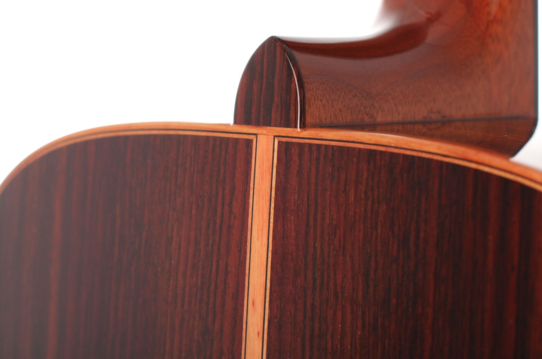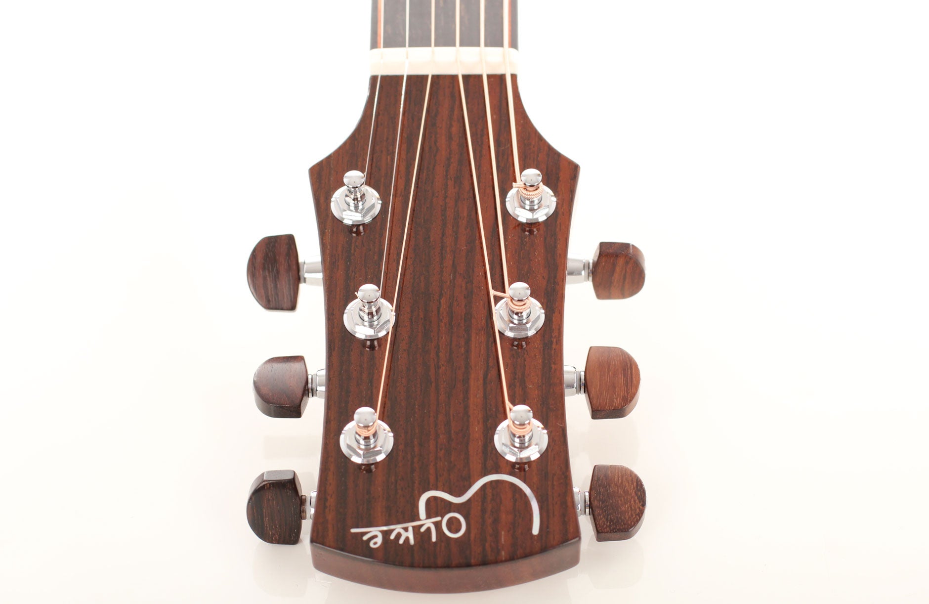 This OM-model has a very differentiated sound, caused by the shape and the wood selection. The Indian Rosewood gives a classical modest look and a very balanced color of sound. The top is made of fine Alpine Spruce and provided with a scalloped x-bracing. Though relatively small and handy, this guitar still has a powerful sound due to the fastidious elaboration of the top. The mahogany neck is very comfortable to play.