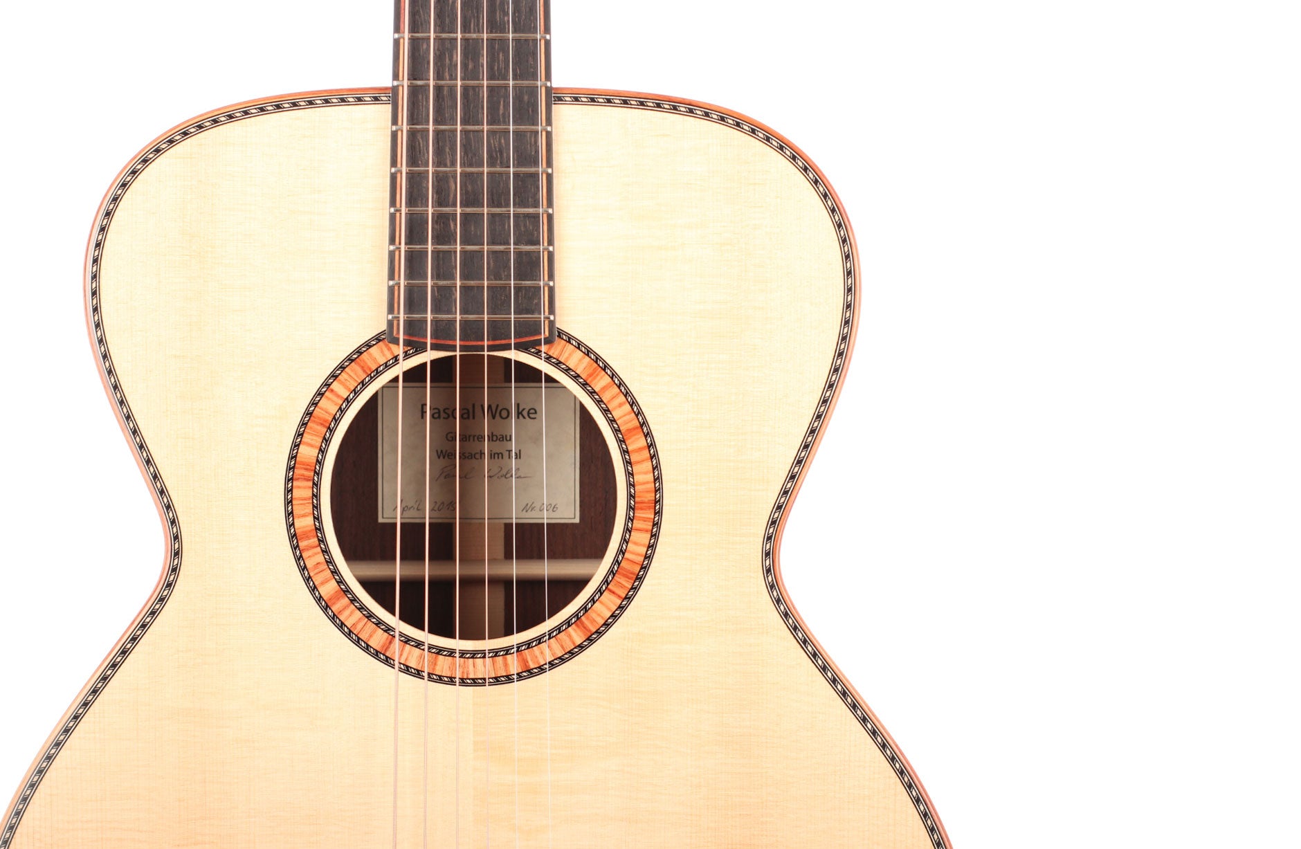 A beautiful hand-made guitar by the young guitar maker Pascal Wolke. He learned the craft at the Mittenwald School of instrument making and has been self-employed since 2014.