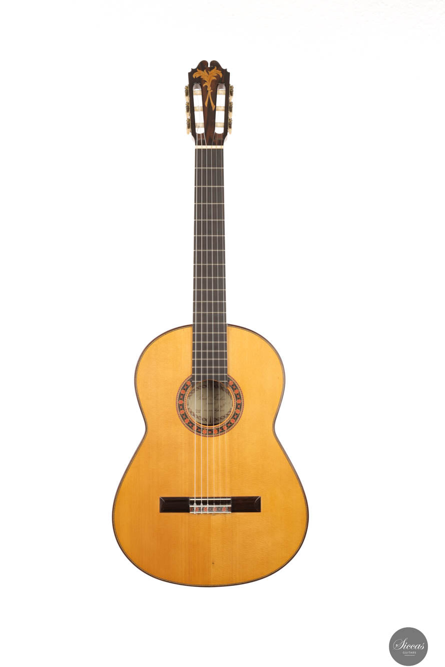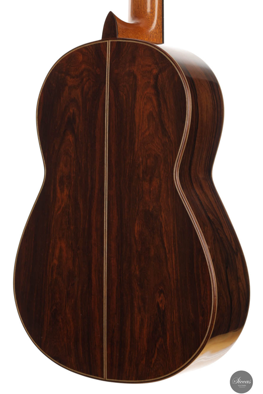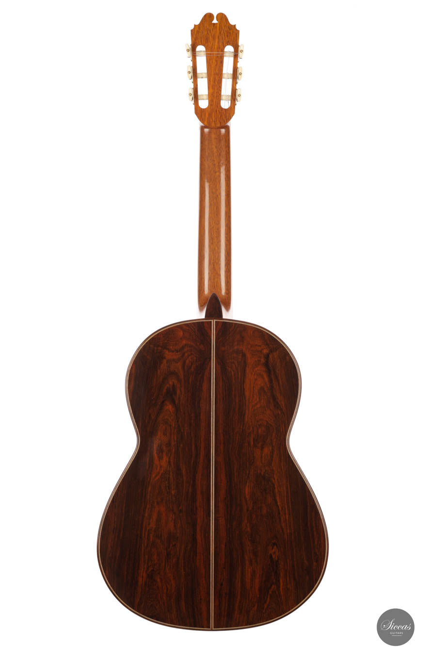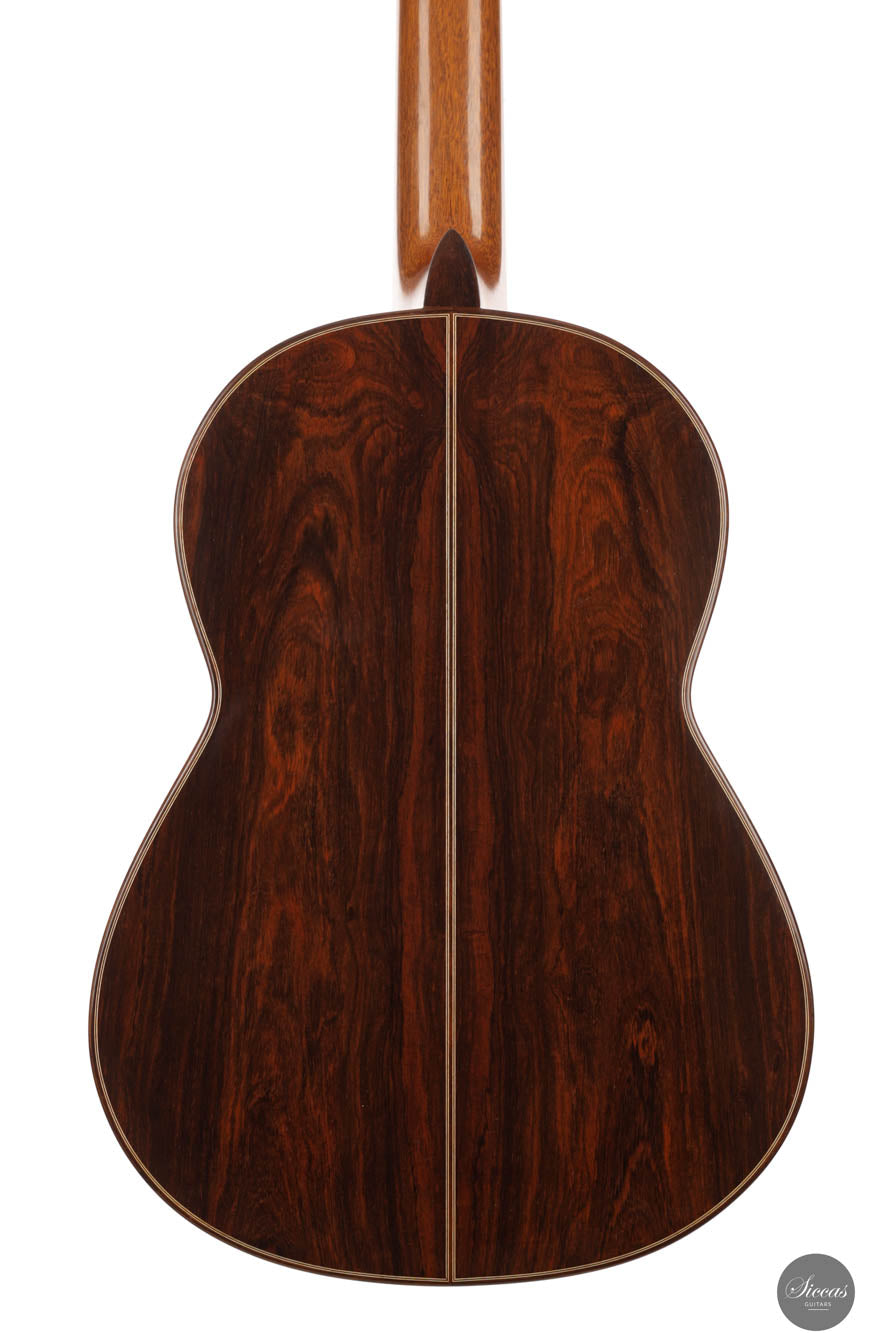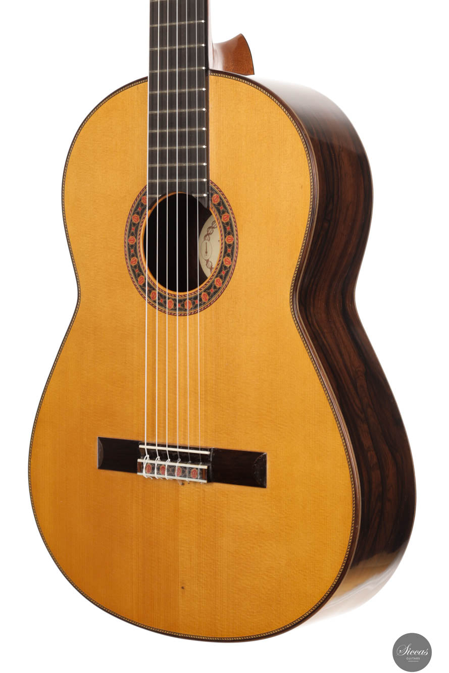 This guitar, crafted by one of the best British guitar makers, stands out as a spectacular instrument with modern acoustic properties for its time. Traditionally built, it features an exceptional evenness on the first string, a quality rarely seen even in contemporary guitars. Its sound has a piano-like timbre, yet it remains brilliant enough to fill any concert hall. This guitar offers comfortable playability and responds quickly to right-hand dynamics. As a pre-loved instrument, it is in remarkable condition, displaying almost no signs of wear, with only some nearly invisible thin scratches. The Brazilian rosewood used for the back and sides is particularly rare and adds to the instrument's value, making it a true jewel among classical guitars. This guitar not only captures the essence of superior craftsmanship but also showcases the rarity of such quality woods today.