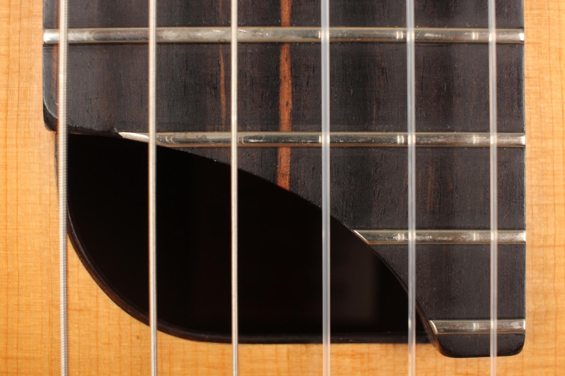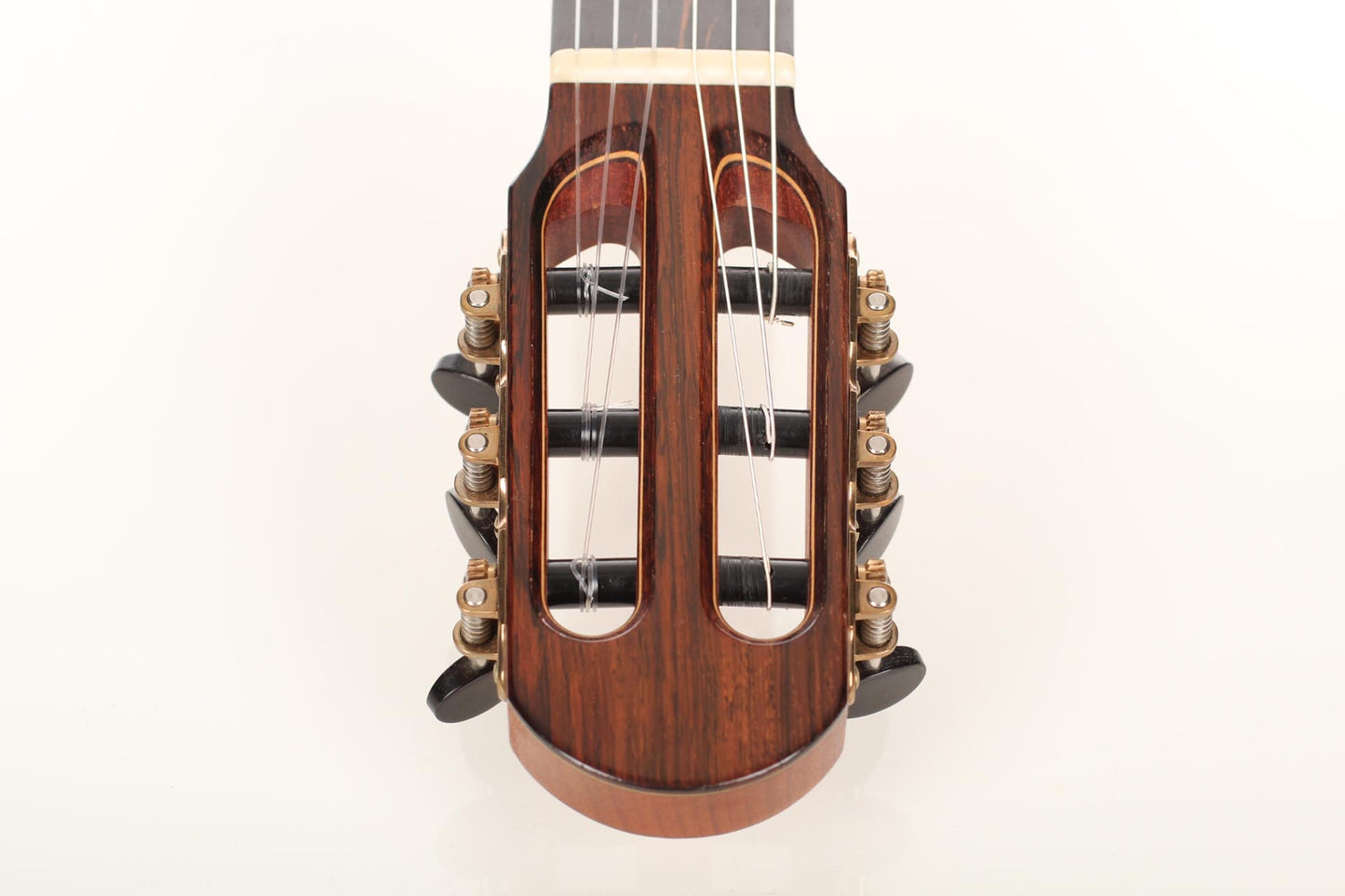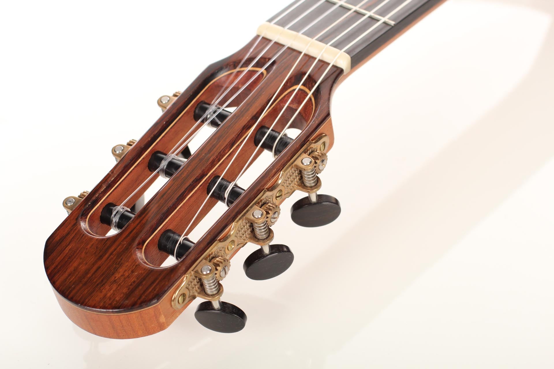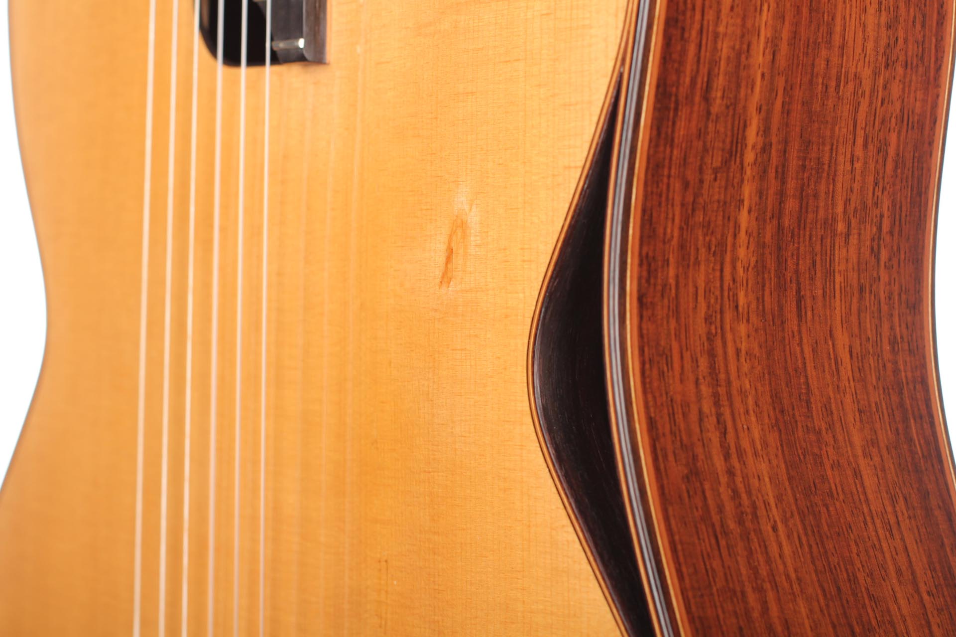 Every single one of Philipp's guitars is the product of a long, intensive process. All his knowledge and experience are integrated in the production of his high-quality instruments. This is why he never builds more than two guitars at the same time, so that he can concentrate on every detail. Since the sound of the instrument depends greatly on the type of material that is used, he uses only the best quality tone woods and no prefabricated parts at all. A guitar is not finished until it completely satisfies his demands for a clear and open sound with full, round basses, velvety facials, clear brilliant trebles, moduled timbre, a singing, sustained tone and responsiveness. Only when all these criteria have been met in the finished guitar he is satisfied. The results are melodious, unique pieces and professional instruments for guitarists. His work is based on the Spanish Granada tradition of guitar making using time-tested techniques. The methods incorporate an analysis of historic guitars and modern insights into acoustic processes and the wishes of today's musicians. Whilst he's very traditional, he is also open to experiments. He tries to combine traditional instrument building skills with modern methods in order to develop the sound of the guitar for the future. This guitar has three sound holes, two near the sides on the soundboard and one at the end of the fretboard. It has a double-soundboard that is made of cedar. Back and sides are made of Indian Rosewood. The tuning machines are made by Sloane. The pickup system (piezo and microphone) in made by AER. You can see light signs of repair on the top. A hard-shell case is included.