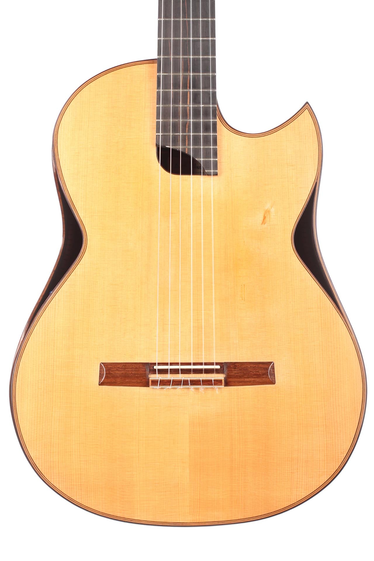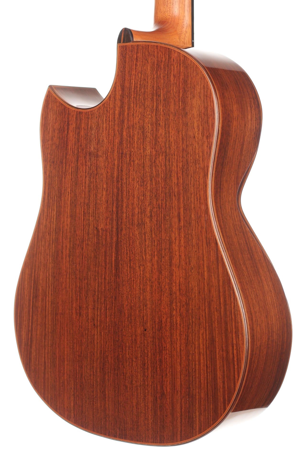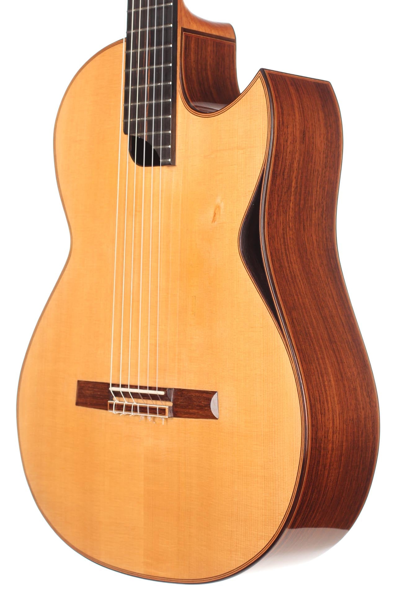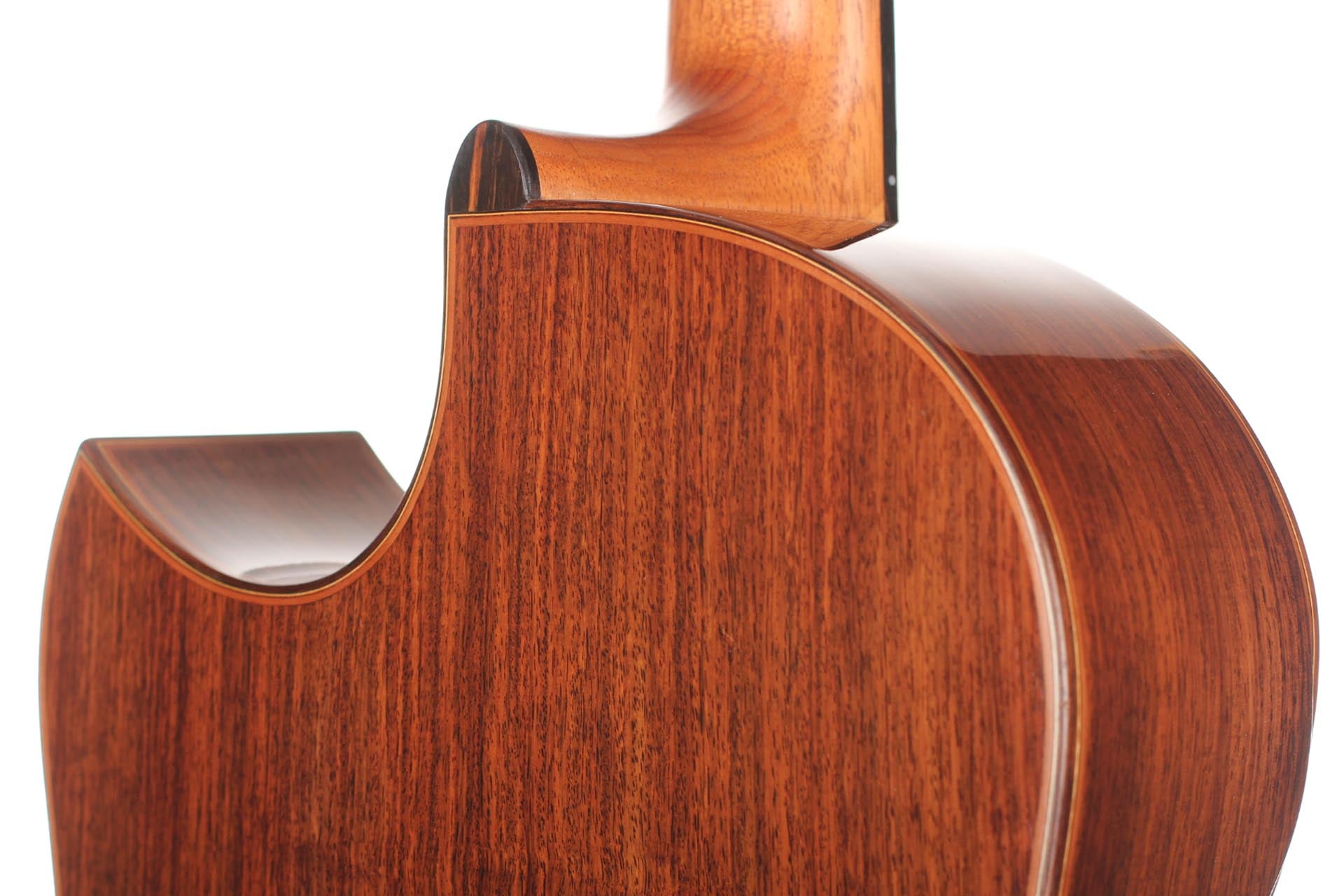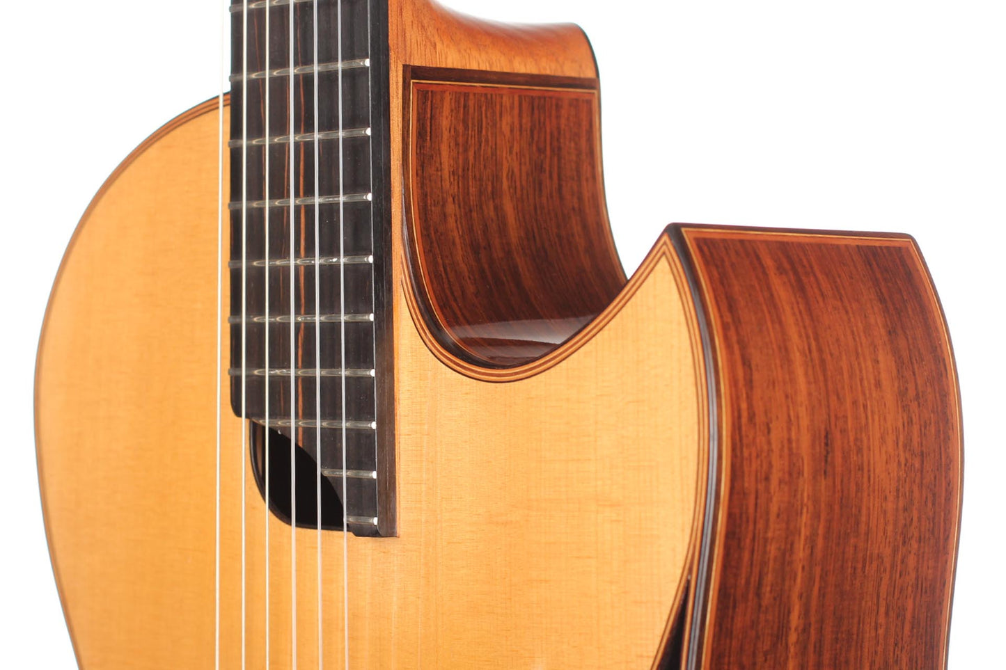 Every single one of Philipp's guitars is the product of a long, intensive process. All his knowledge and experience are integrated in the production of his high-quality instruments. This is why he never builds more than two guitars at the same time, so that he can concentrate on every detail. Since the sound of the instrument depends greatly on the type of material that is used, he uses only the best quality tone woods and no prefabricated parts at all. A guitar is not finished until it completely satisfies his demands for a clear and open sound with full, round basses, velvety facials, clear brilliant trebles, moduled timbre, a singing, sustained tone and responsiveness. Only when all these criteria have been met in the finished guitar he is satisfied. The results are melodious, unique pieces and professional instruments for guitarists. His work is based on the Spanish Granada tradition of guitar making using time-tested techniques. The methods incorporate an analysis of historic guitars and modern insights into acoustic processes and the wishes of today's musicians. Whilst he's very traditional, he is also open to experiments. He tries to combine traditional instrument building skills with modern methods in order to develop the sound of the guitar for the future. This guitar has three sound holes, two near the sides on the soundboard and one at the end of the fretboard. It has a double-soundboard that is made of cedar. Back and sides are made of Indian Rosewood. The tuning machines are made by Sloane. The pickup system (piezo and microphone) in made by AER. You can see light signs of repair on the top. A hard-shell case is included.