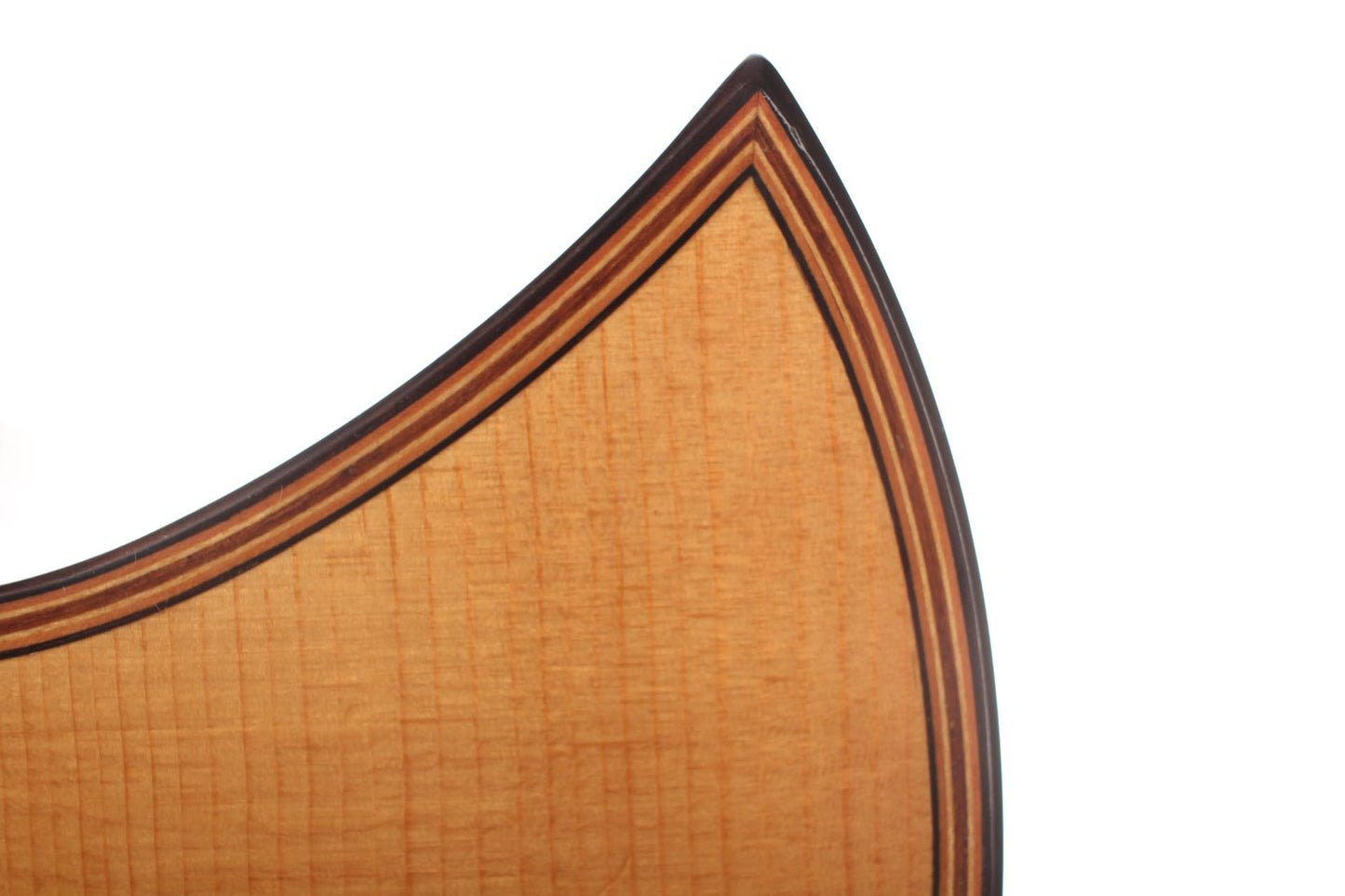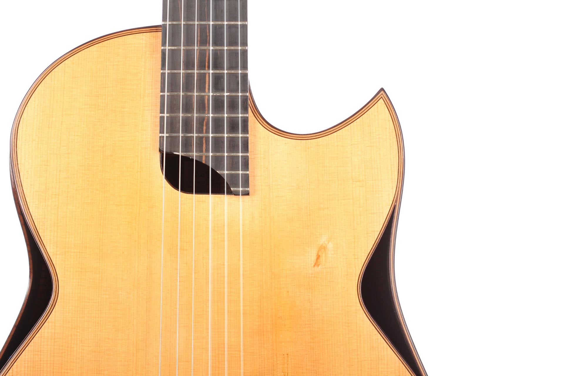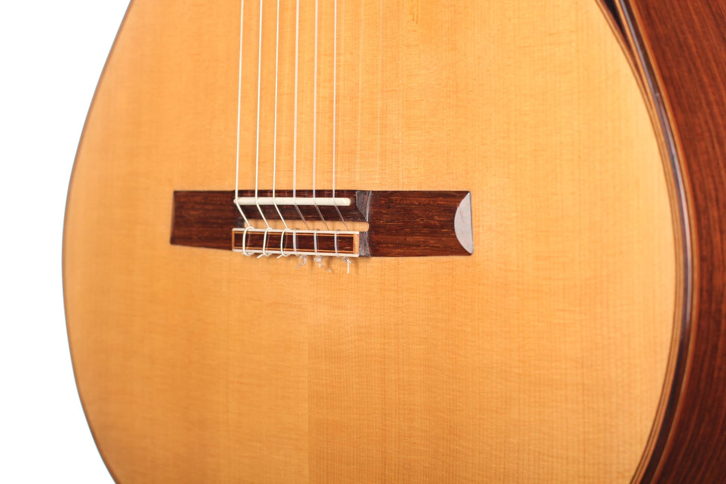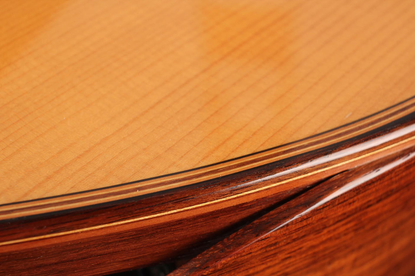 Every single one of Philipp's guitars is the product of a long, intensive process. All his knowledge and experience are integrated in the production of his high-quality instruments. This is why he never builds more than two guitars at the same time, so that he can concentrate on every detail. Since the sound of the instrument depends greatly on the type of material that is used, he uses only the best quality tone woods and no prefabricated parts at all. A guitar is not finished until it completely satisfies his demands for a clear and open sound with full, round basses, velvety facials, clear brilliant trebles, moduled timbre, a singing, sustained tone and responsiveness. Only when all these criteria have been met in the finished guitar he is satisfied. The results are melodious, unique pieces and professional instruments for guitarists. His work is based on the Spanish Granada tradition of guitar making using time-tested techniques. The methods incorporate an analysis of historic guitars and modern insights into acoustic processes and the wishes of today's musicians. Whilst he's very traditional, he is also open to experiments. He tries to combine traditional instrument building skills with modern methods in order to develop the sound of the guitar for the future. This guitar has three sound holes, two near the sides on the soundboard and one at the end of the fretboard. It has a double-soundboard that is made of cedar. Back and sides are made of Indian Rosewood. The tuning machines are made by Sloane. The pickup system (piezo and microphone) in made by AER. You can see light signs of repair on the top. A hard-shell case is included.