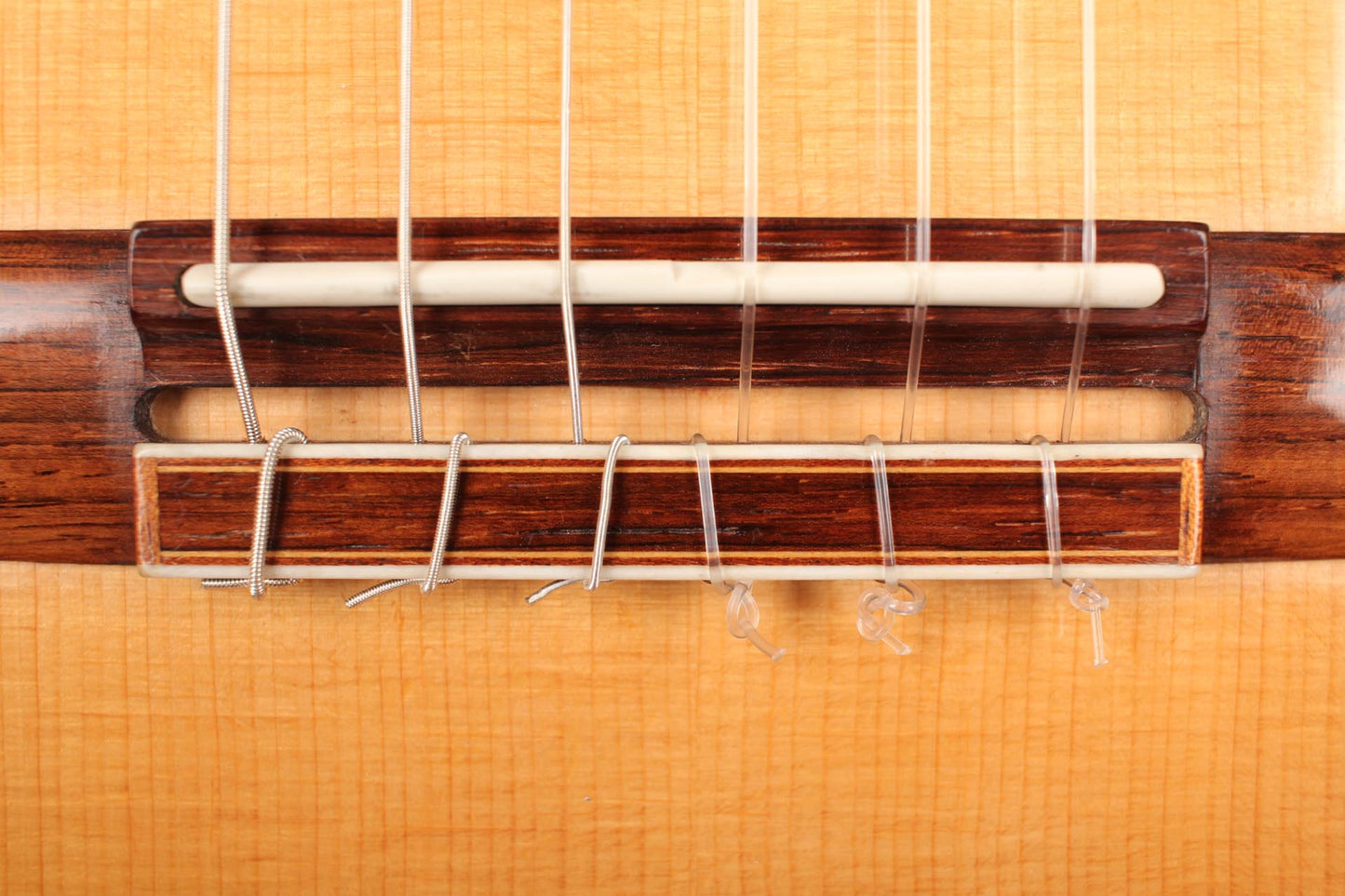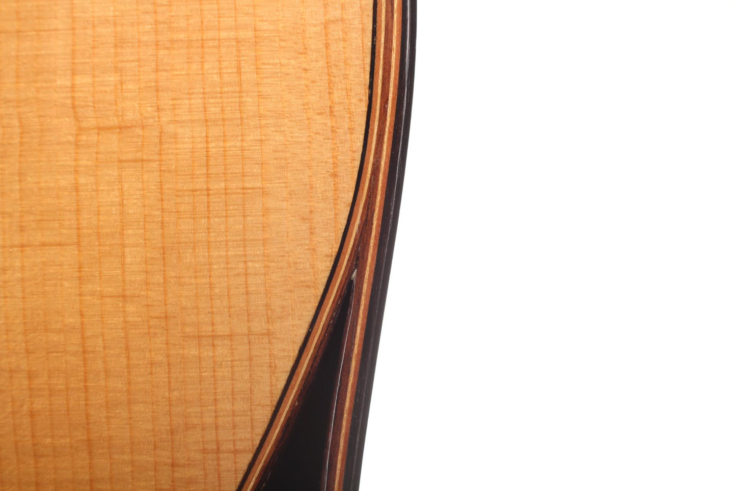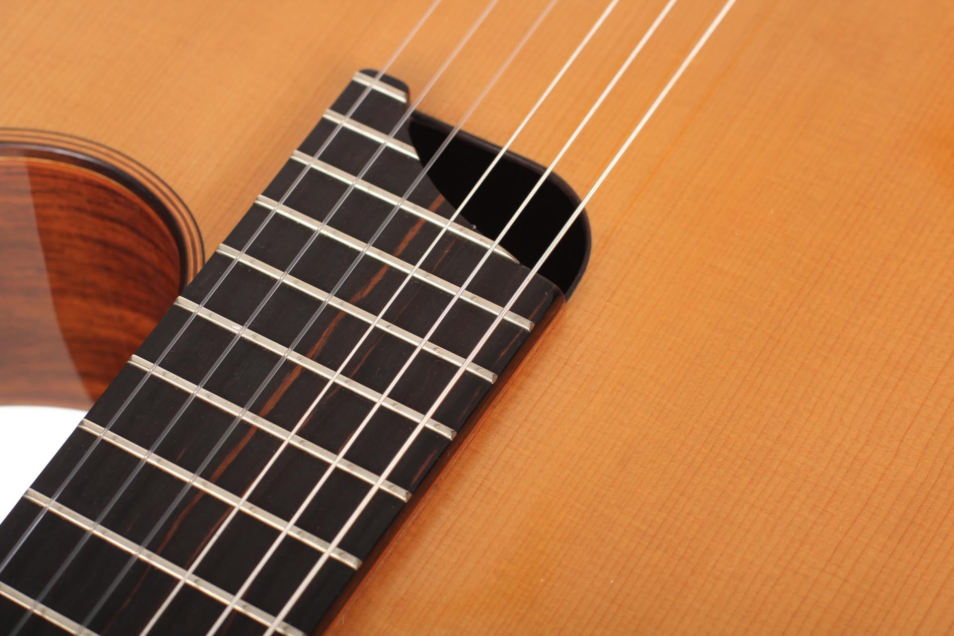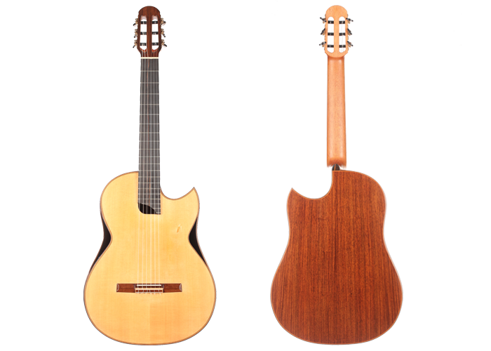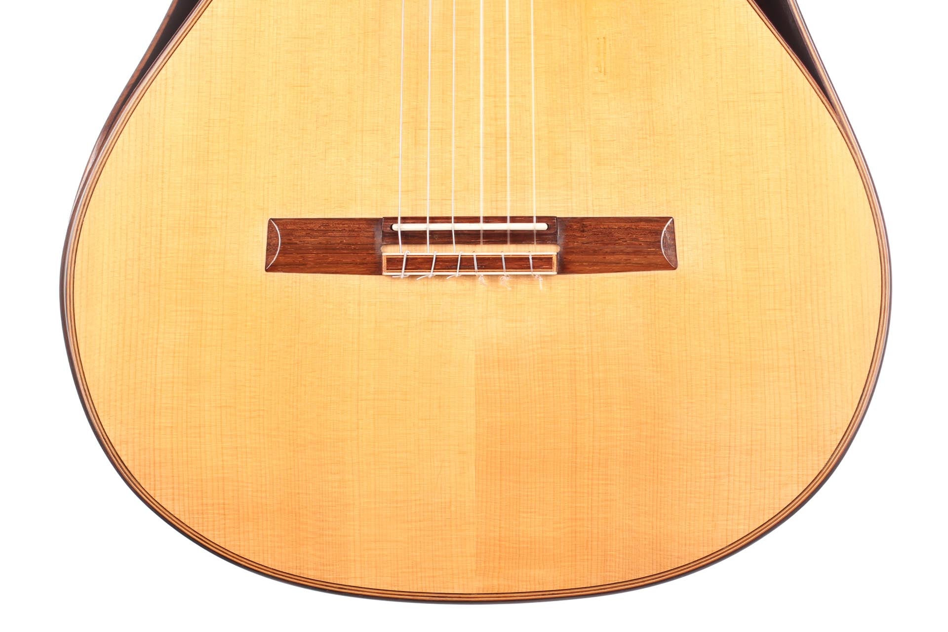 Every single one of Philipp's guitars is the product of a long, intensive process. All his knowledge and experience are integrated in the production of his high-quality instruments. This is why he never builds more than two guitars at the same time, so that he can concentrate on every detail. Since the sound of the instrument depends greatly on the type of material that is used, he uses only the best quality tone woods and no prefabricated parts at all. A guitar is not finished until it completely satisfies his demands for a clear and open sound with full, round basses, velvety facials, clear brilliant trebles, moduled timbre, a singing, sustained tone and responsiveness. Only when all these criteria have been met in the finished guitar he is satisfied. The results are melodious, unique pieces and professional instruments for guitarists. His work is based on the Spanish Granada tradition of guitar making using time-tested techniques. The methods incorporate an analysis of historic guitars and modern insights into acoustic processes and the wishes of today's musicians. Whilst he's very traditional, he is also open to experiments. He tries to combine traditional instrument building skills with modern methods in order to develop the sound of the guitar for the future. This guitar has three sound holes, two near the sides on the soundboard and one at the end of the fretboard. It has a double-soundboard that is made of cedar. Back and sides are made of Indian Rosewood. The tuning machines are made by Sloane. The pickup system (piezo and microphone) in made by AER. You can see light signs of repair on the top. A hard-shell case is included.