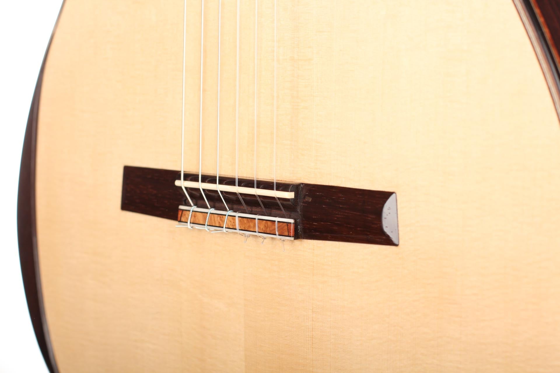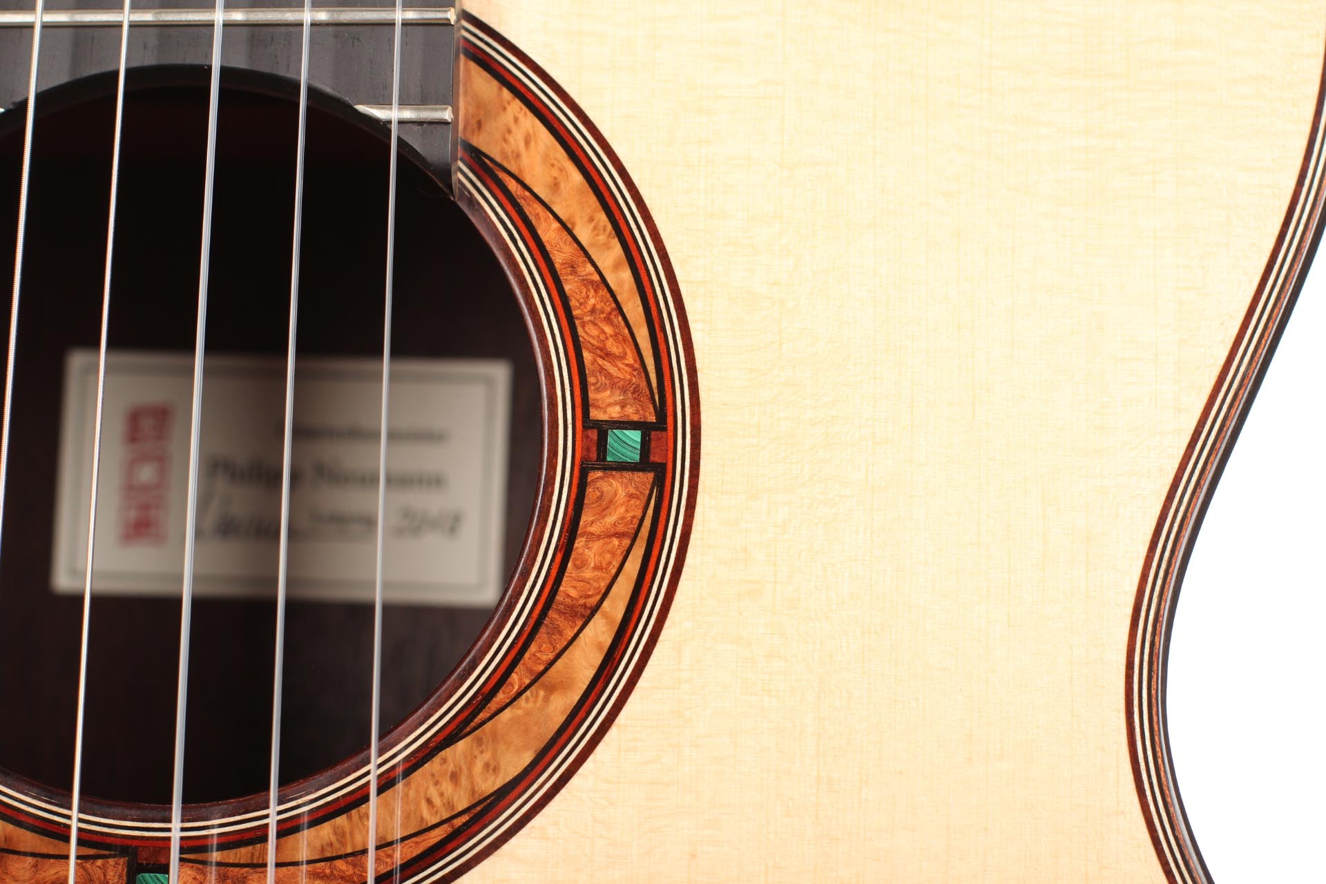 This new 2018 Philipp Neumann guitar already has an incredible openness. Its sound is enveloping the guitarist to give an immediate playing satisfaction and projecting clearly giving to this guitar all the attributes of a great concert instrument. The very fine wooden and precious stones inlays on the rosette and head-plate enhances the attractiveness of the instrument and highlight the delicate spruce top and Indian rosewood back and sides. It is great concert guitar combining a striking craftmanship and an admirable playability and tone quality. The tuners are made by Sloane. Delivered with a Artonus case.
