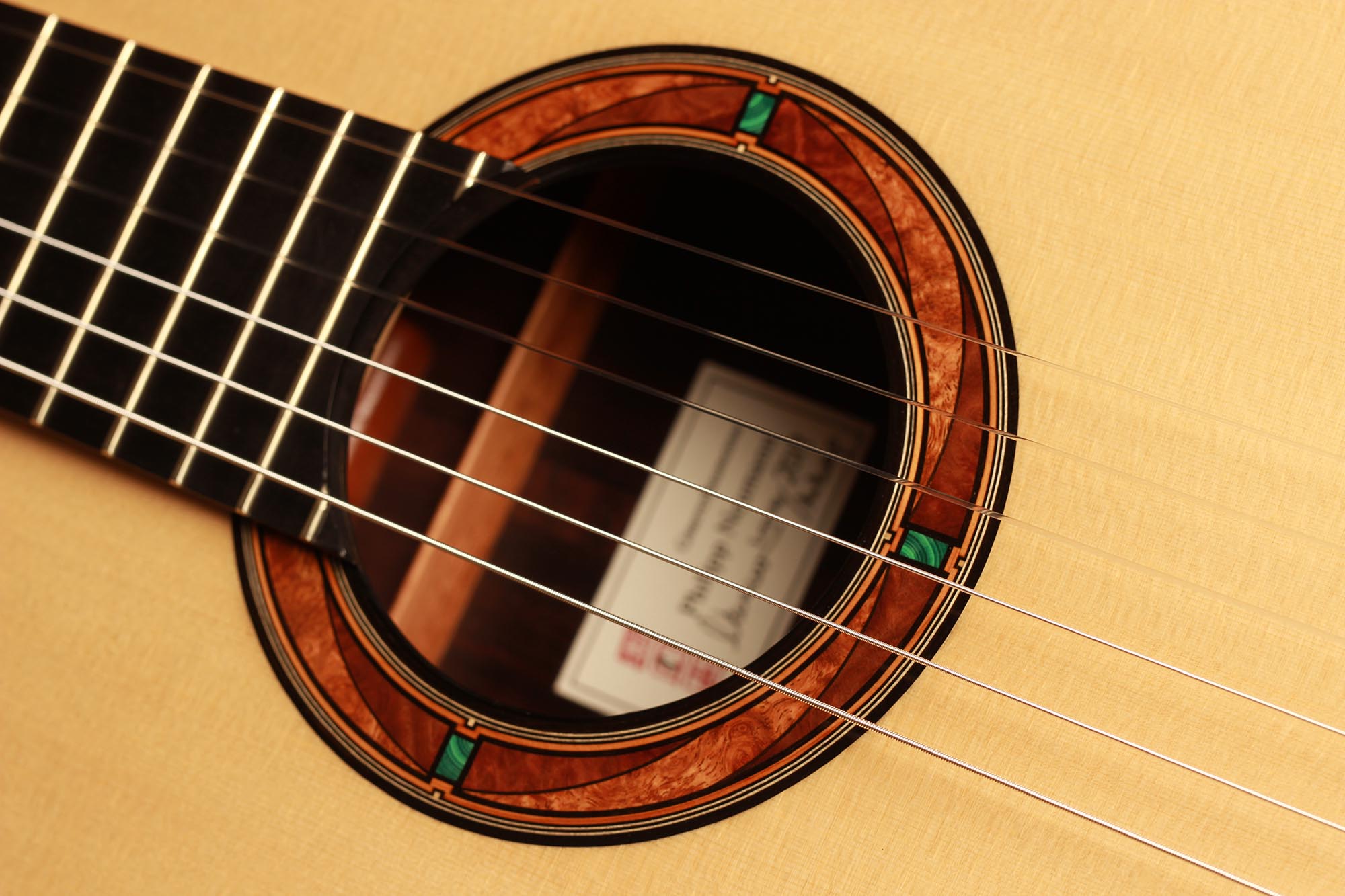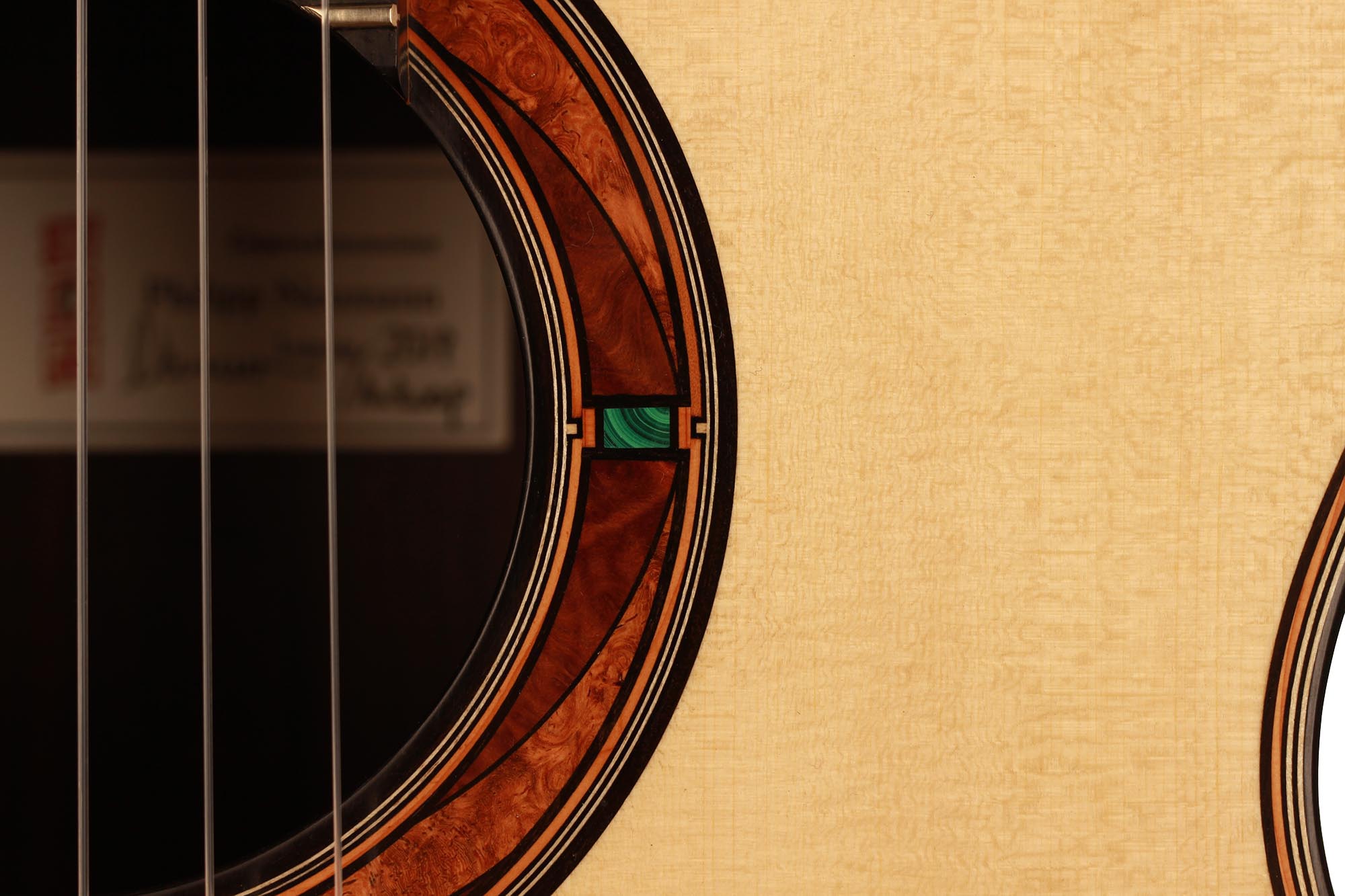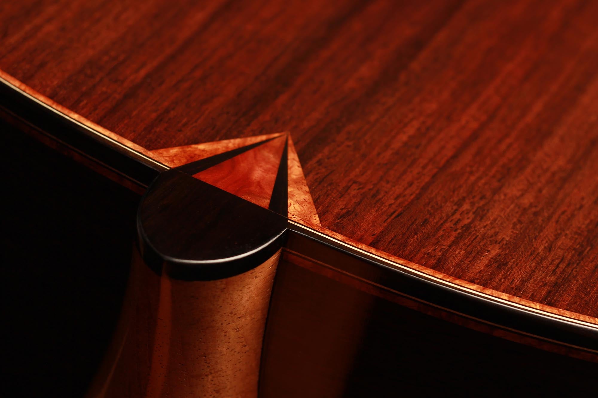 This beautiful guitar features new and absolutely unique innovations. The spruce top is reinforced by inlayed cedar struts which insure a very homogeneous dome to the top. By the structural reinforcement, being perfectly assumed by these cedar inlays, the bracing can be worked in a very thin way which gives this guitar a fantastic volume and openness, preserving a full and rich quality of sound. As always with P. Neumann’s guitars, this instrument is strikingly easy to play, displaying an incredibly colourful tone and just as colourful woods and stones inlays.