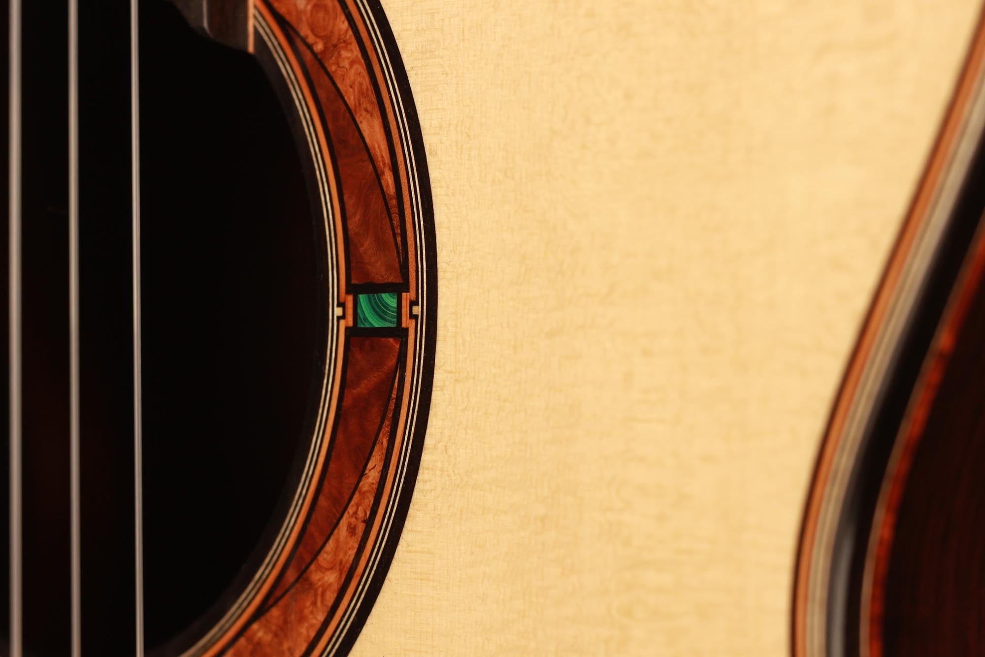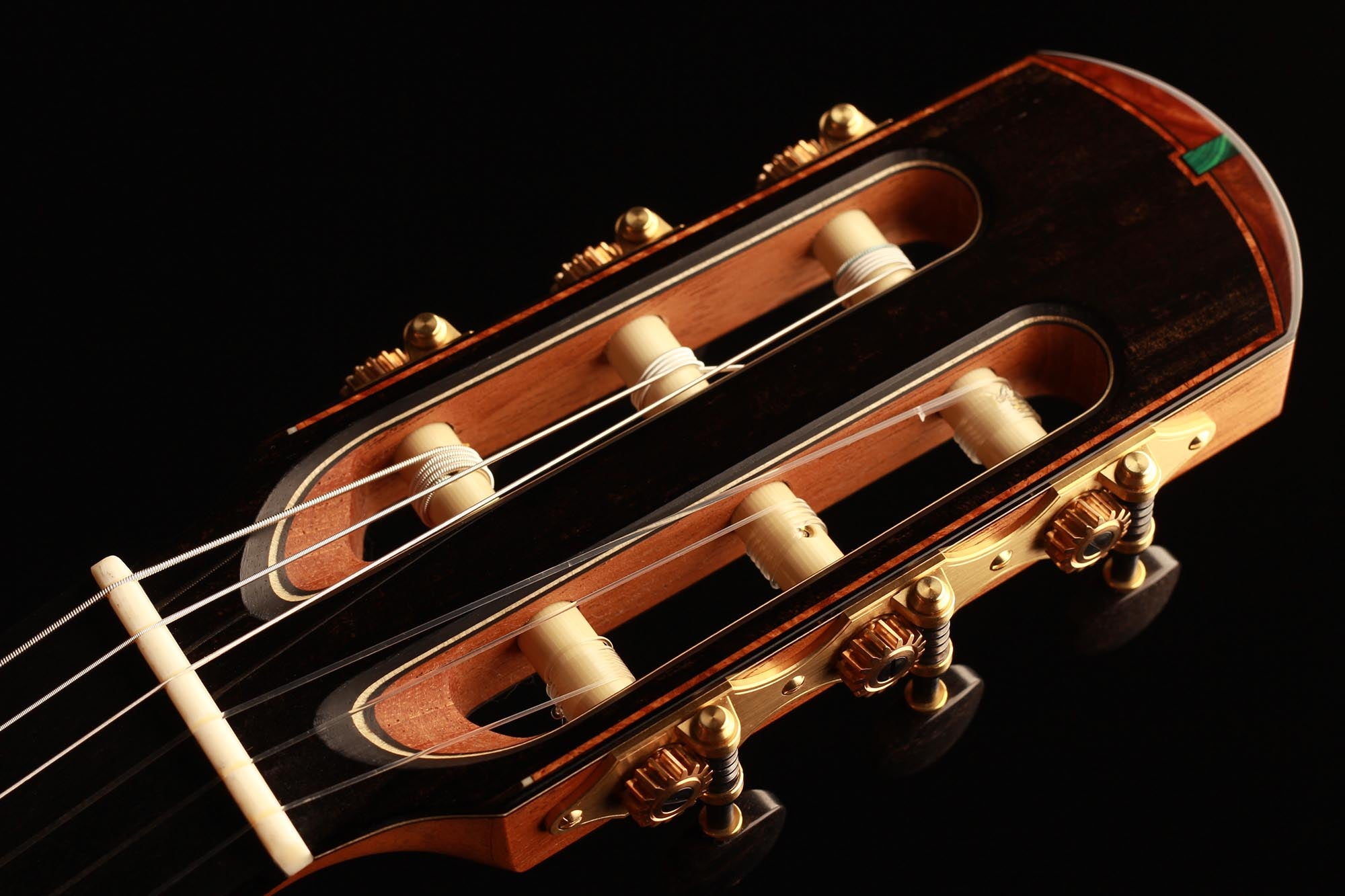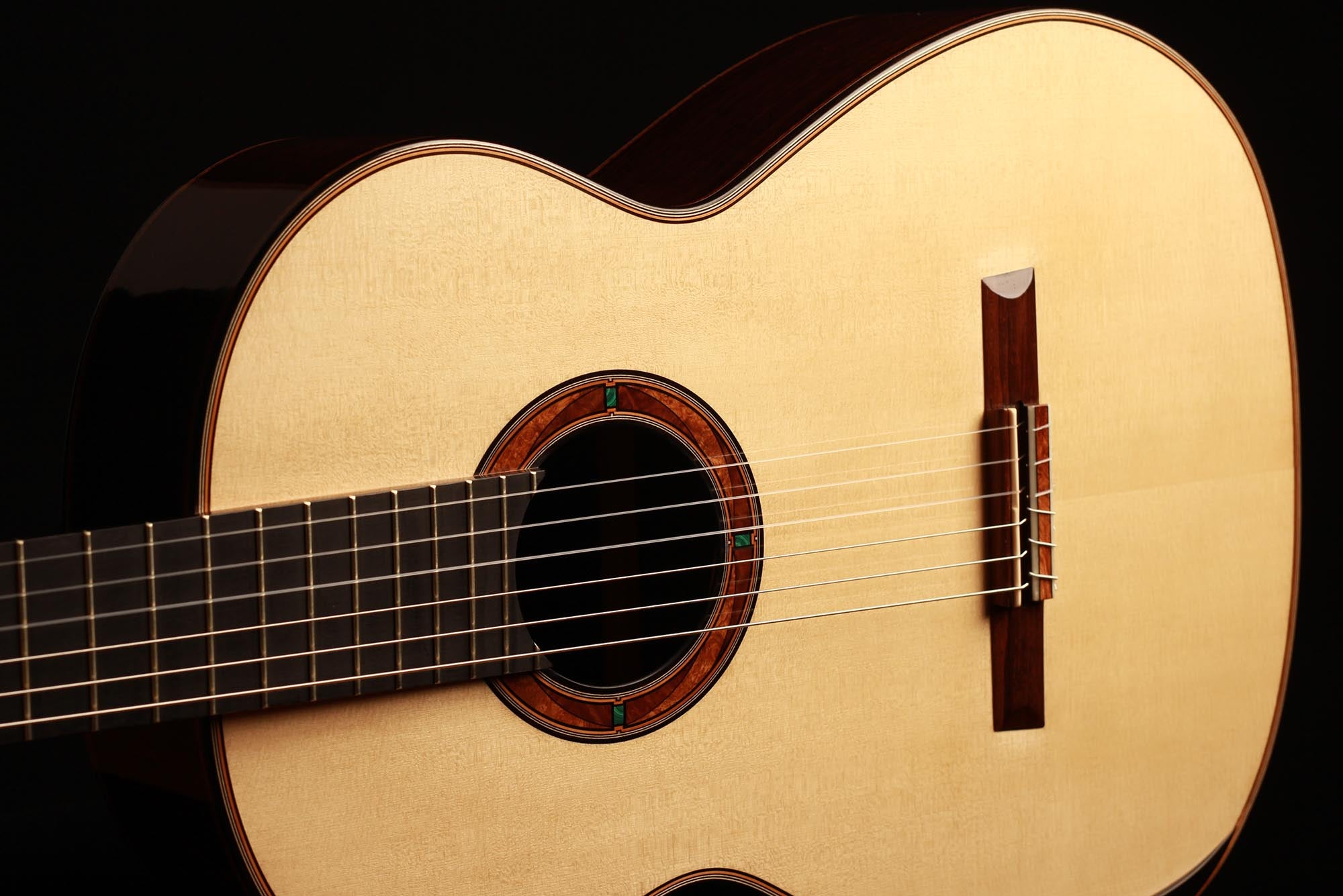 This beautiful guitar features new and absolutely unique innovations. The spruce top is reinforced by inlayed cedar struts which insure a very homogeneous dome to the top. By the structural reinforcement, being perfectly assumed by these cedar inlays, the bracing can be worked in a very thin way which gives this guitar a fantastic volume and openness, preserving a full and rich quality of sound. As always with P. Neumann’s guitars, this instrument is strikingly easy to play, displaying an incredibly colourful tone and just as colourful woods and stones inlays.